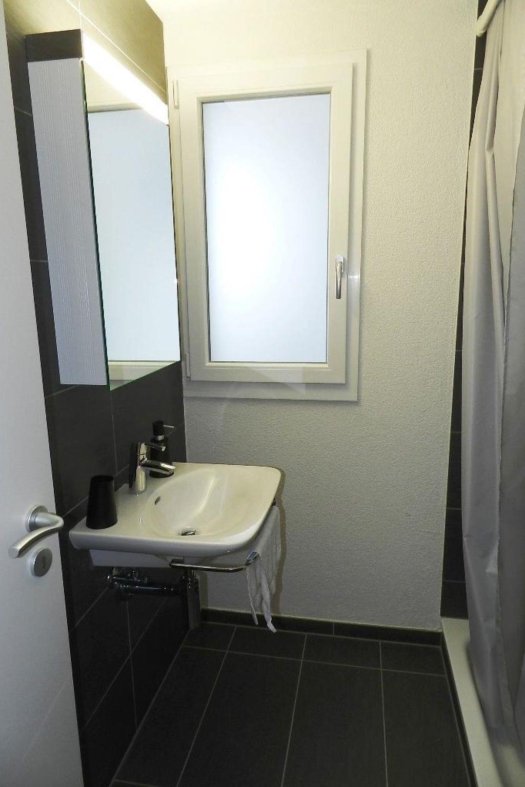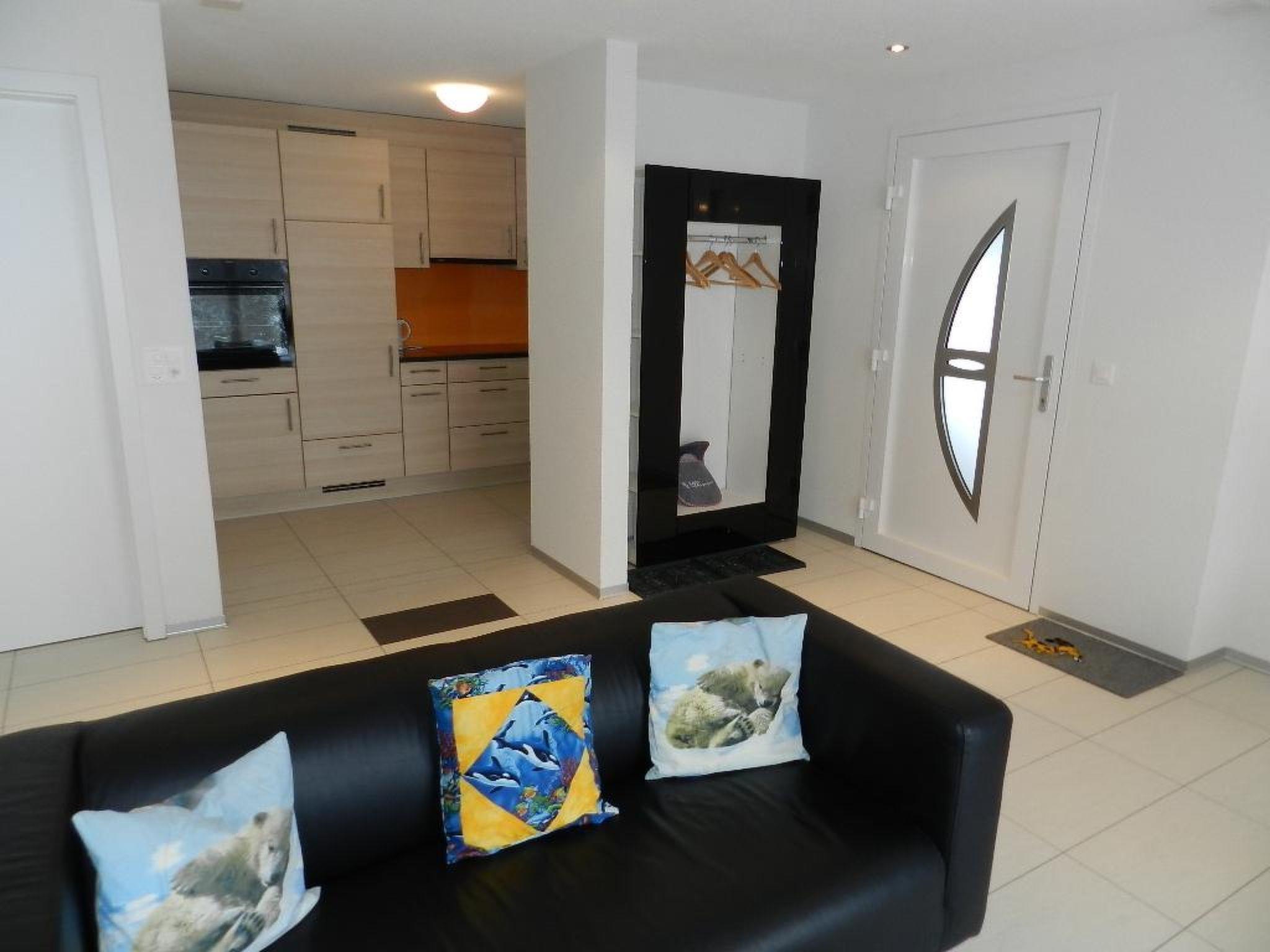 Living-/dining room with open-plan kitchen (furnished with ceramic hob, oven, microwave oven, dishwasher, coffee machine with capsules (Nespresso), fondue-raclette set), dining table, sofa and TV. 1 bedroom (without door) with grand-lit (160x200cm). 1 bathroom with shower and toilet. Storage room with washing machine and tumble dryer. The apartment disposes of an individual adjustable floor heating. WiFi.