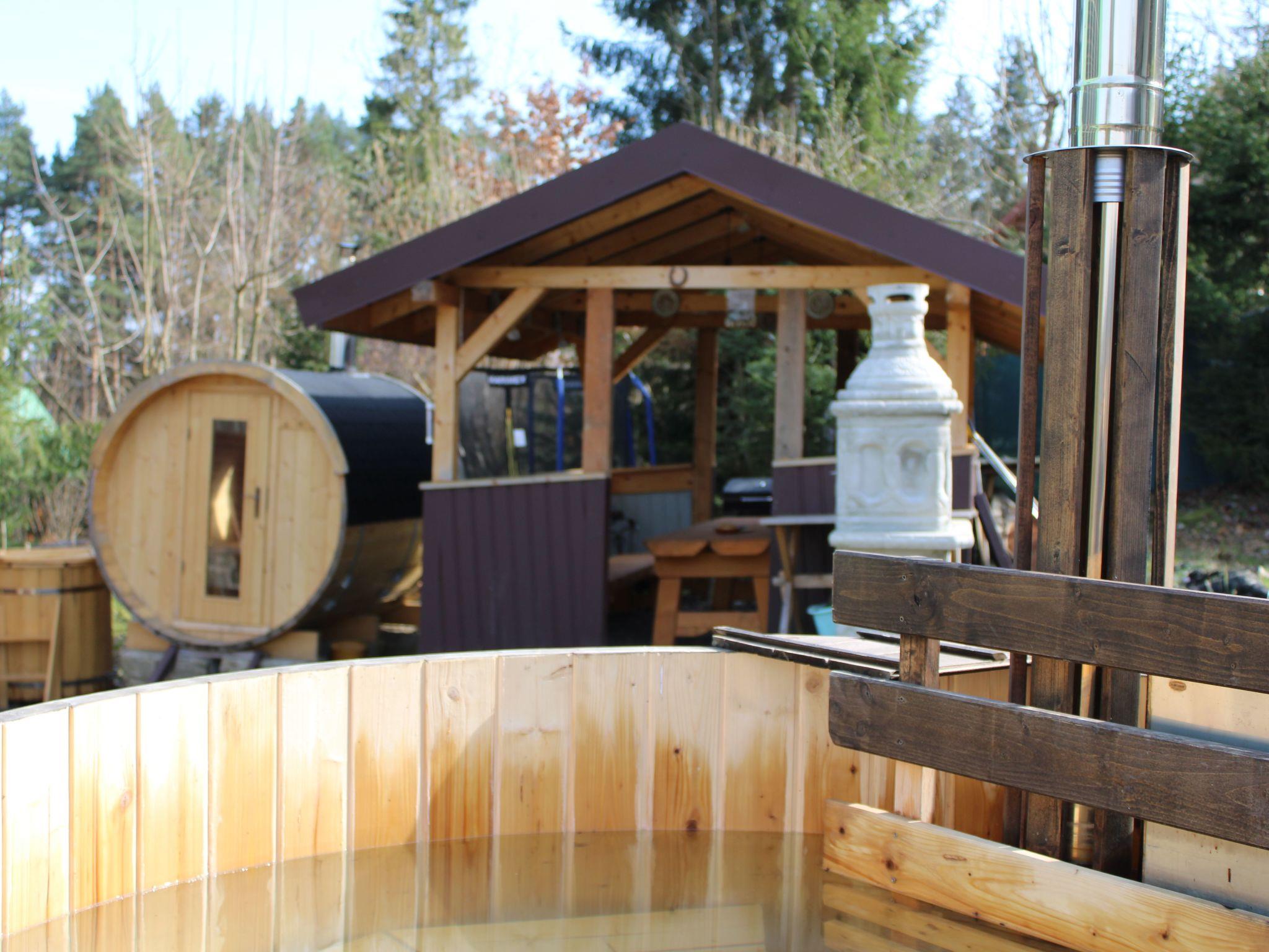 The outdoor area of the holiday home is a little paradise in itself. The fully fenced garden ensures safety for children and pets. A covered terrace with a cosy seating area, a barbecue and fire pit as well as a charming garden shed invite you to spend relaxing hours in the countryside. Four private parking spaces are available for vehicles. The highlight of the garden is the private sauna and the wood-fired hot tub, which promise pure relaxation after an active day in the great outdoors or romantic evenings under the stars.