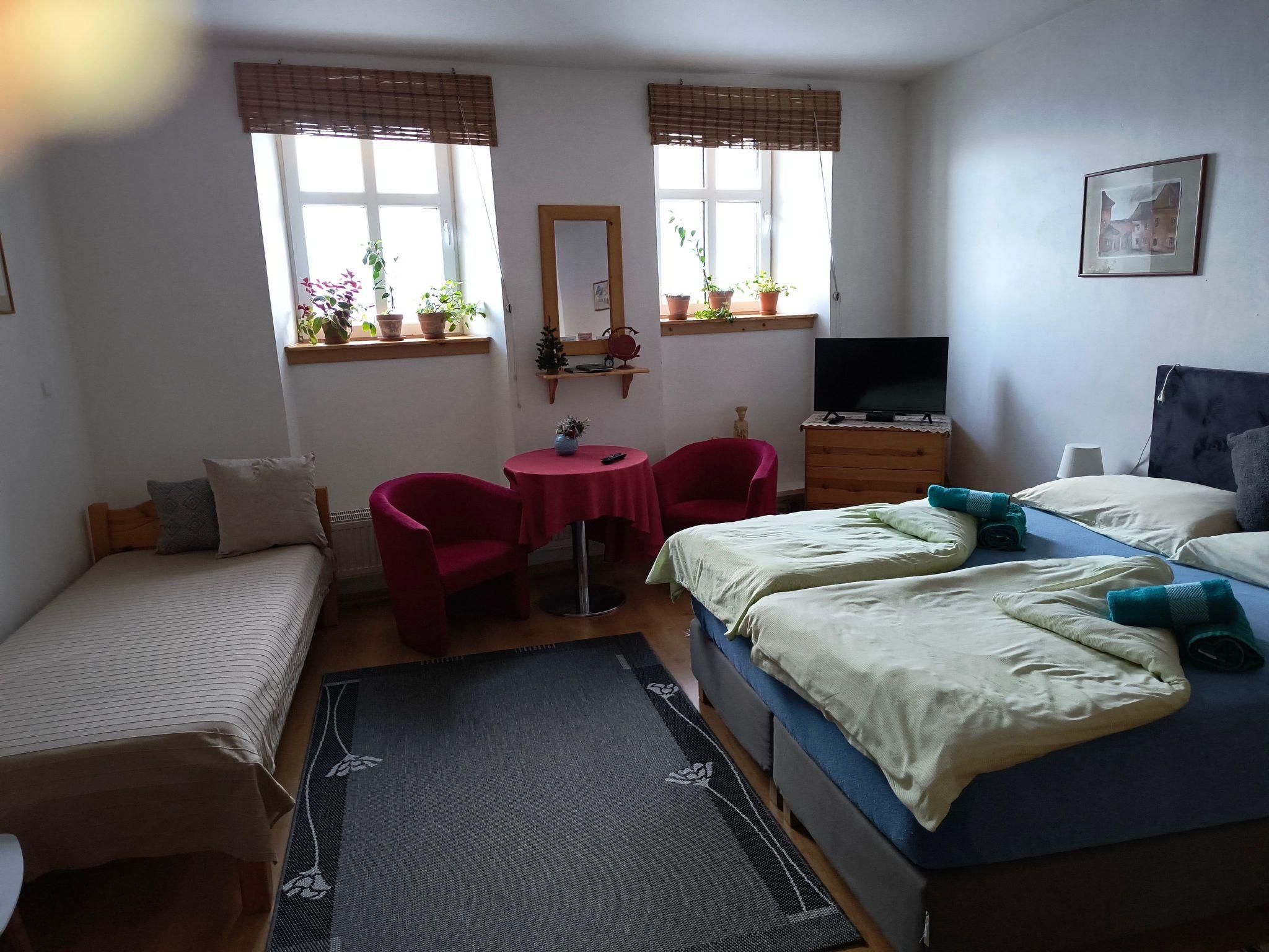The 42 m² holiday flat is located on the 1st floor and has a separate entrance. The accommodation is modernly furnished: 2 TVs with satellite TV, CD player, DVD player, radio, German channels. Two bedrooms (1 double bed in each). Kitchen with dining area, electric hob, dining area, coffee machine, fridge with freezer, microwave, toaster, kettle. Shower, toilet. Tiled cooker, central heating.