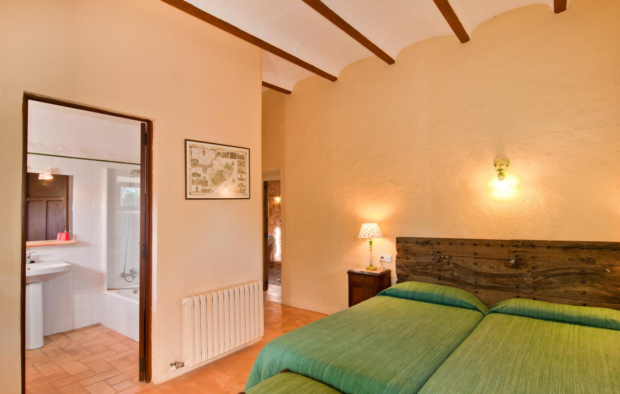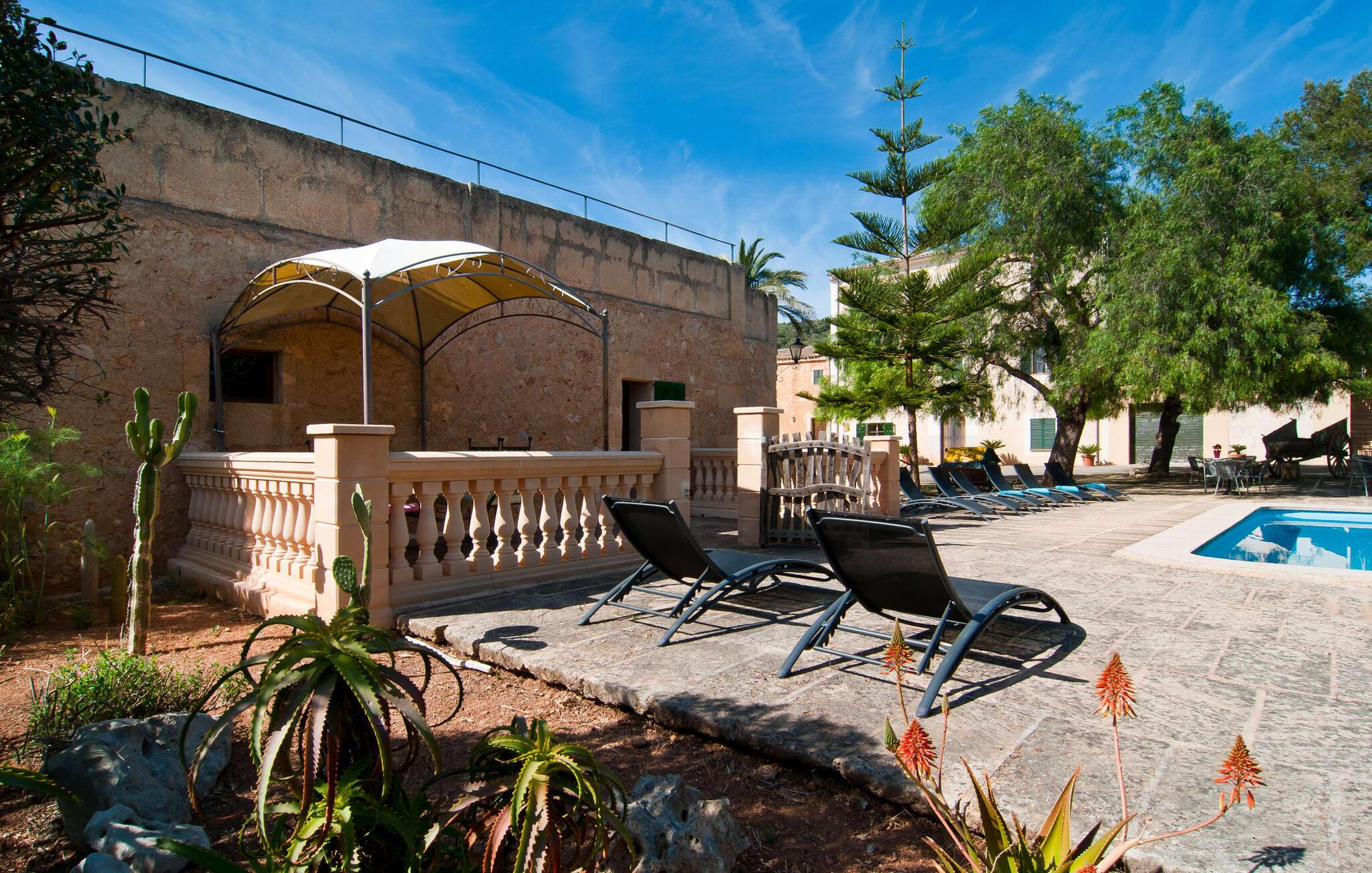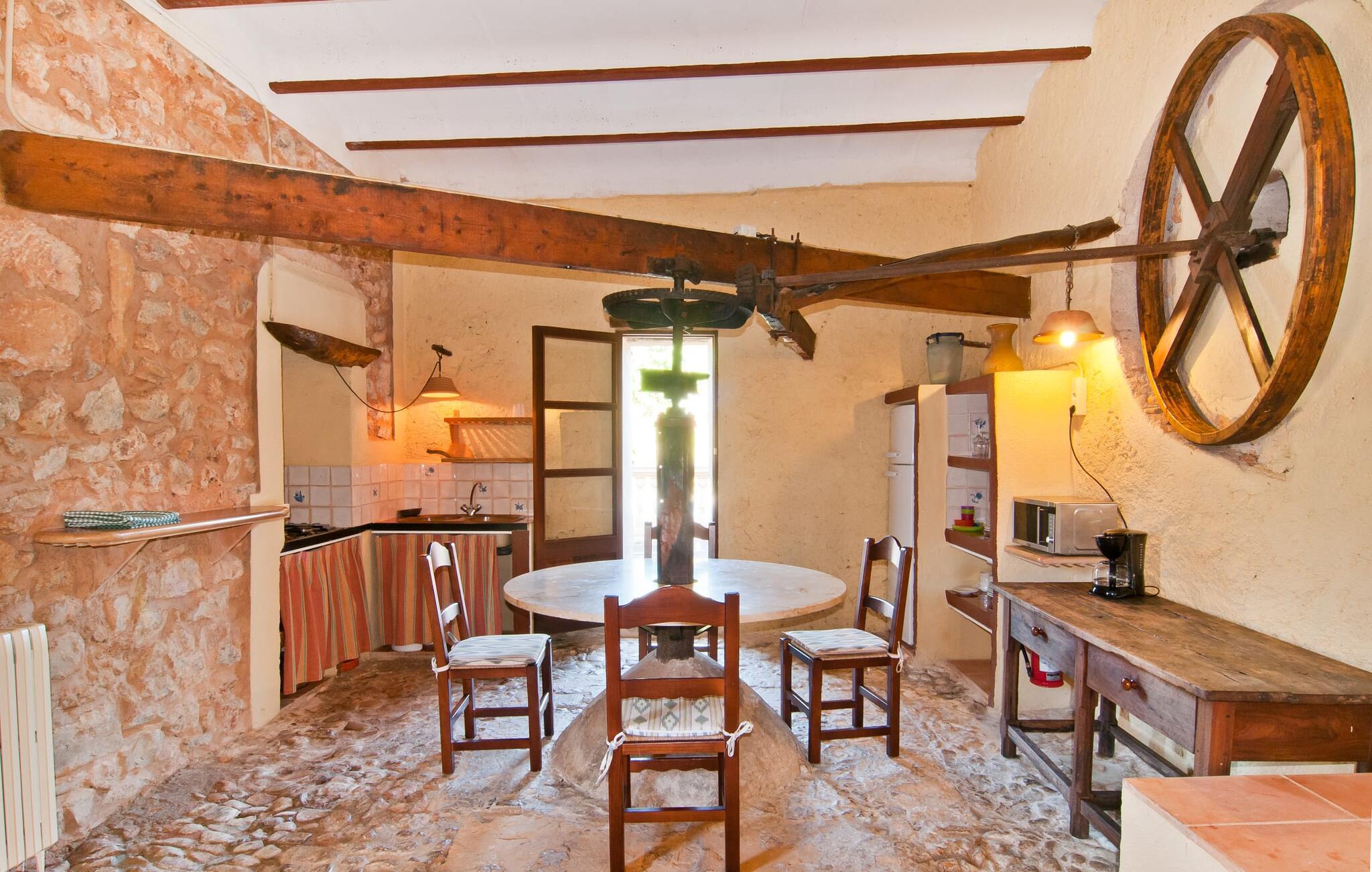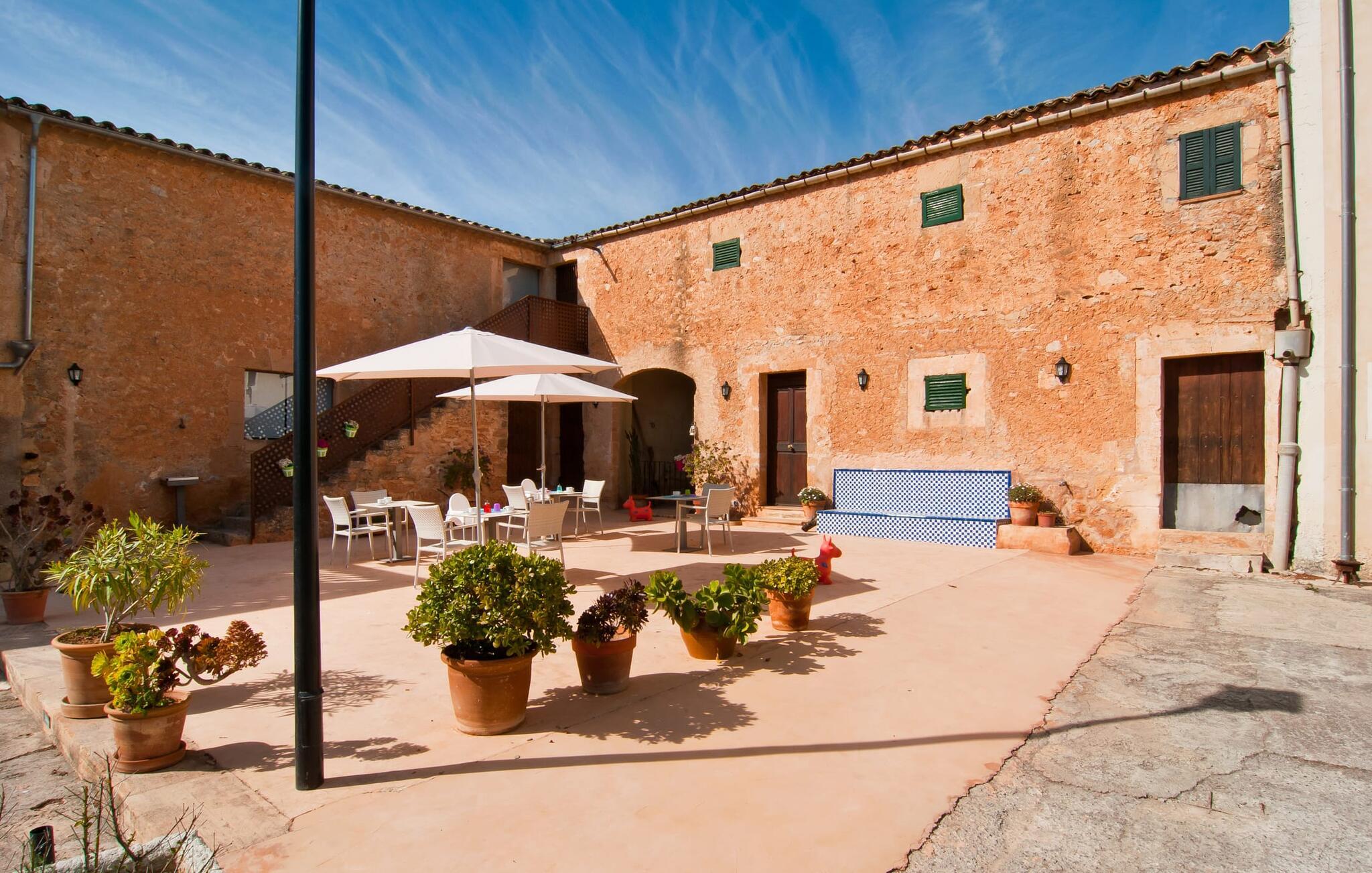 Den imponerende "Son Sureda" ejendom med sine 1.500.000 m² er blevet tilpasset til feriegæster, unge og gamle efter 500 års landbrug, vindyrkning og husdyravl. Navnene på de elleve ferielejligheder, som er fordelt rundt om hovedhuset, borgmesterhuset og udhusene med et eller to dobbeltværelser, indikerer stadig deres tidligere anvendelse. På jeres ture rundt om de gamle mure vil I opdage mange gamle hestevogne og spændende landbrugsudstyr. På jeres egne små terrasser i stueetagen eller med udsigt kan I nyde jeres privatliv og få mulighed for at lære andre feriegæster at kende ved de mange borde og stole eller ved den fælles grill i den store indre gårdhave. I kan starte jeres Mallorca-morgen i den imponerende hvælving (de tidligere hestestalde) eller udenfor på det åbne område med en overdådig, ø-typisk morgenmad, som I kan bestille. To pools med liggestole og udendørs bruser, et soppebassin, en legeplads med gynger, sandkasse, klatrestativ, fodboldbane og hønsegårde sikrer afslapning for enlige rejsende og par samt for familier på bondegårdsferie. Vi er sikre på, at der er en lejlighed, der passer lige til jer. Måske er det denne lejlighed med sin unikke historie. “Es Moli”, “kornmøllen”, er fuldstændig bevaret i dagens stue og fungerer som et unikt bord. Et æsel eller et muldyr løb her i cirkler og vendte møllestenene. Kornet blev opbevaret i soveværelserne. Begge dobbeltværelser har eget badeværelse med bruseniche. Den hyggelige stue er udstyret med sofa, fjernsyn og rustik pejs, som giver en særlig atmosfære og varme, når der er behov for det. På dage, hvor I ønsker at blive på ejendommen hele dagen, kan I tilberede snacks, salater og små måltider i tekøkkenet med køleskab, to keramiske kogeplader, mikroovn og kaffemaskine. Udover bord, stole og parasol har terrassen en lille dør, så I har fuldstændig privatliv. Samtidig kan I se poolen og jeres børn plaske rundt i den. Forkæl jer selv med en pause med en god bog i ny og næ. Og der er en række værdifulde destinationer: byliv eller havbrise? Fra jeres villa kan I nemt udforske de forskellige sider af øen. Godt 15 km væk venter strandene på soltilbedere, surfere og familier. Den rummelige Son Serra de Marina og den næsten to kilometer lange sandstrand mod Colònia de Sant Pere tilbyder plads nok til at sprede mere end blot et håndklæde. Hvis I vil nyde de blå nuancer fra oven, så tag til Betlem og klatre de 5 km til den lille Ermita. Naturligvis er mere krævende ruter til vandrestøvler og mountainbikes også mulige. Ma-3322, som er delvist hørbar afhængig af vindretningen, tager jer til byen Manacor for en spontan tur til den historiske bymidte eller for at shoppe på vitaminmarkedet. Hvis I vil besøge katedralen i Palma, skal I blot efterlade jeres bil på togstationen og tage bussen eller toget. Sommerhus på landet med masser af natur til villagæsterne. Føl jer hjemme på agroturismoen "Son Sureda", der ligger mellem fåregræsgange og vinmarker, som har elleve lejligheder og studiolejligheder med egen forplejning, en stor U-formet gårdhave og flere pools. Manacor, en af øens metropoler, ligger kun 9 km væk. Det er ideelt til shopping på det daglige frugt- og grøntmarked, til udflugter og til en afslappet middag på en restaurant. Og på Badia d'Alcúdia, i retning mod Son Serra de Marina og Colònia de Sant Pere, kan I stadig finde et par strande, der endnu ikke er overfyldte.