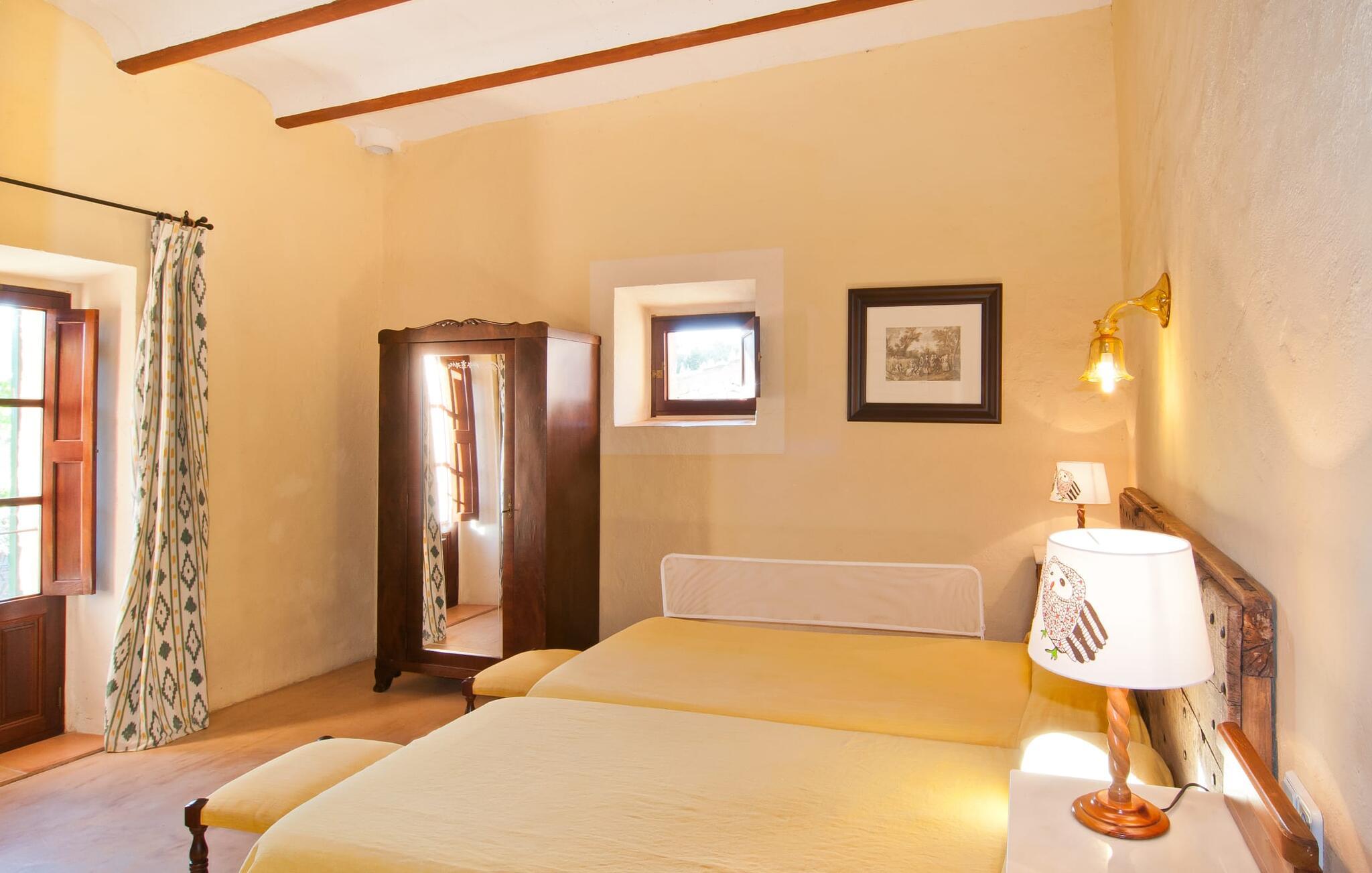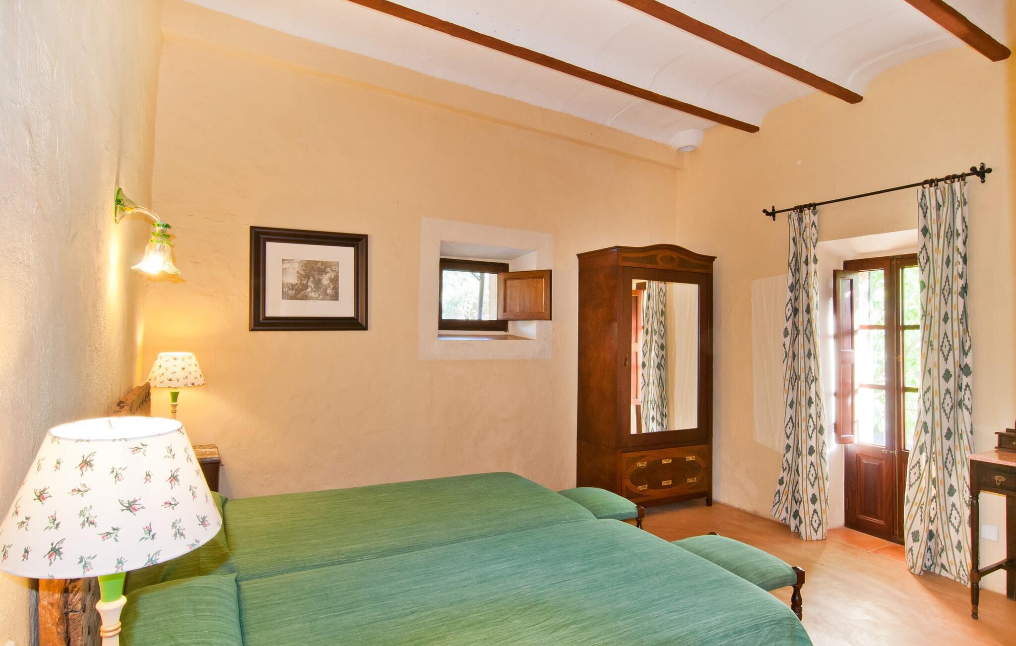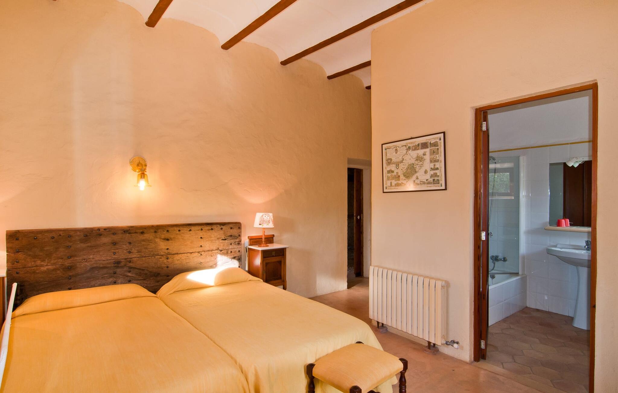 Den imponerende "Son Sureda" ejendom med sine 1.500.000 m² er blevet tilpasset til feriegæster, unge og gamle efter 500 års landbrug, vindyrkning og husdyravl. Navnene på de elleve ferielejligheder, som er fordelt rundt om hovedhuset, borgmesterhuset og udhusene med et eller to dobbeltværelser, indikerer stadig deres tidligere anvendelse. På jeres ture rundt om de gamle mure vil I opdage mange gamle hestevogne og spændende landbrugsudstyr. På jeres egne små terrasser i stueetagen eller med udsigt kan I nyde jeres privatliv og få mulighed for at lære andre feriegæster at kende ved de mange borde og stole eller ved den fælles grill i den store indre gårdhave. I kan starte jeres Mallorca-morgen i den imponerende hvælving (de tidligere hestestalde) eller udenfor på det åbne område med en overdådig, ø-typisk morgenmad, som I kan bestille. To pools med liggestole og udendørs bruser, et soppebassin, en legeplads med gynger, sandkasse, klatrestativ, fodboldbane og hønsegårde sikrer afslapning for enlige rejsende og par samt for familier på bondegårdsferie. Vi er sikre på, at der er en lejlighed, der passer lige til jer. Måske er det denne lejlighed med sin unikke historie. “Es Moli”, “kornmøllen”, er fuldstændig bevaret i dagens stue og fungerer som et unikt bord. Et æsel eller et muldyr løb her i cirkler og vendte møllestenene. Kornet blev opbevaret i soveværelserne. Begge dobbeltværelser har eget badeværelse med bruseniche. Den hyggelige stue er udstyret med sofa, fjernsyn og rustik pejs, som giver en særlig atmosfære og varme, når der er behov for det. På dage, hvor I ønsker at blive på ejendommen hele dagen, kan I tilberede snacks, salater og små måltider i tekøkkenet med køleskab, to keramiske kogeplader, mikroovn og kaffemaskine. Udover bord, stole og parasol har terrassen en lille dør, så I har fuldstændig privatliv. Samtidig kan I se poolen og jeres børn plaske rundt i den. Forkæl jer selv med en pause med en god bog i ny og næ. Og der er en række værdifulde destinationer: byliv eller havbrise? Fra jeres villa kan I nemt udforske de forskellige sider af øen. Godt 15 km væk venter strandene på soltilbedere, surfere og familier. Den rummelige Son Serra de Marina og den næsten to kilometer lange sandstrand mod Colònia de Sant Pere tilbyder plads nok til at sprede mere end blot et håndklæde. Hvis I vil nyde de blå nuancer fra oven, så tag til Betlem og klatre de 5 km til den lille Ermita. Naturligvis er mere krævende ruter til vandrestøvler og mountainbikes også mulige. Ma-3322, som er delvist hørbar afhængig af vindretningen, tager jer til byen Manacor for en spontan tur til den historiske bymidte eller for at shoppe på vitaminmarkedet. Hvis I vil besøge katedralen i Palma, skal I blot efterlade jeres bil på togstationen og tage bussen eller toget. Sommerhus på landet med masser af natur til villagæsterne. Føl jer hjemme på agroturismoen "Son Sureda", der ligger mellem fåregræsgange og vinmarker, som har elleve lejligheder og studiolejligheder med egen forplejning, en stor U-formet gårdhave og flere pools. Manacor, en af øens metropoler, ligger kun 9 km væk. Det er ideelt til shopping på det daglige frugt- og grøntmarked, til udflugter og til en afslappet middag på en restaurant. Og på Badia d'Alcúdia, i retning mod Son Serra de Marina og Colònia de Sant Pere, kan I stadig finde et par strande, der endnu ikke er overfyldte.