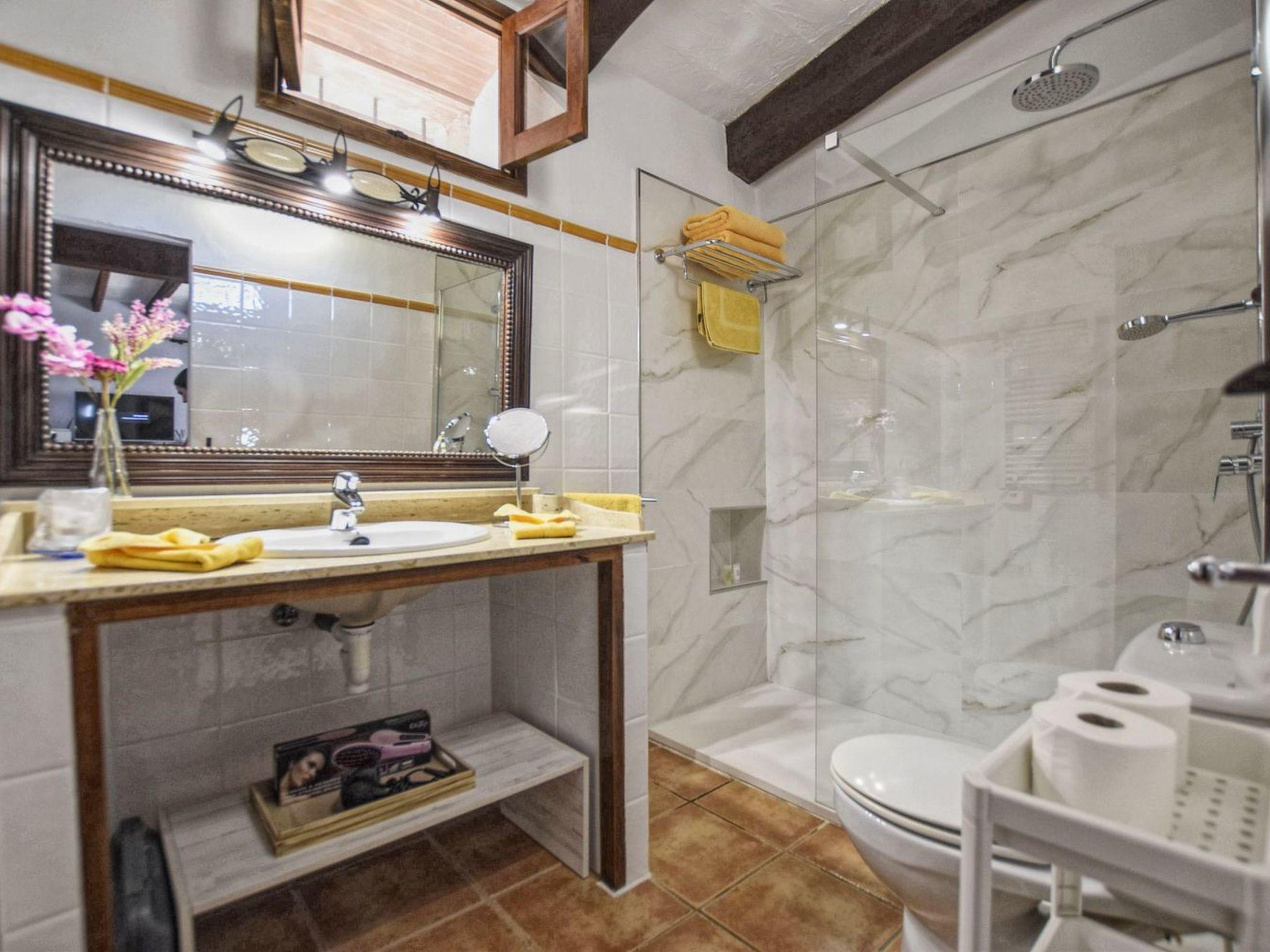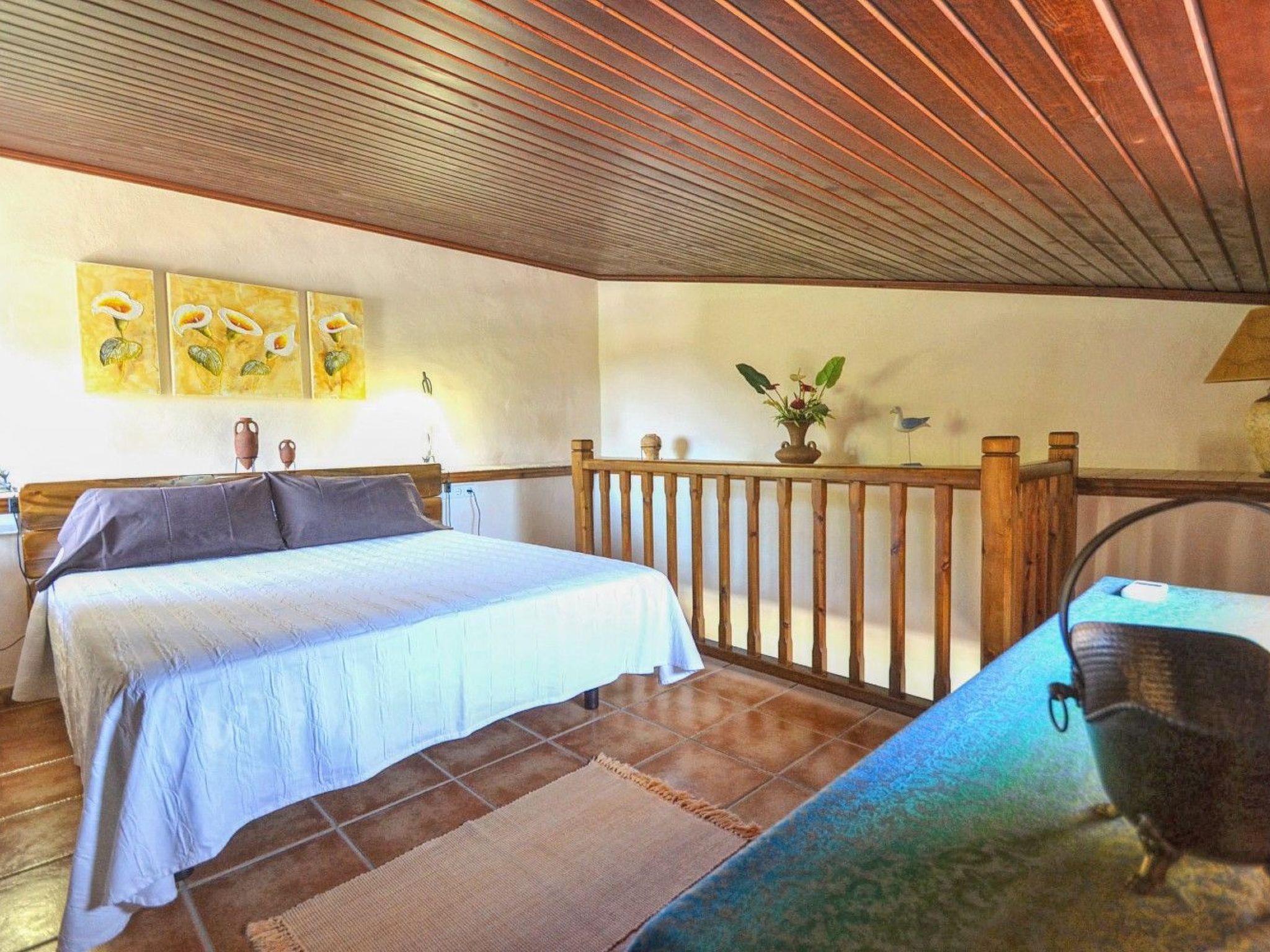 With around 70 m² of living space, the house offers space for up to three guests, i.e. a couple or a small family with a child. Inside, the finca has a living room with satellite TV, internet and dining area and the rustic kitchen that extends here, also with a dining table. There is also a sofa in the living room which can be converted into a sofa bed for the third person (or child). The bathroom is also on this level.