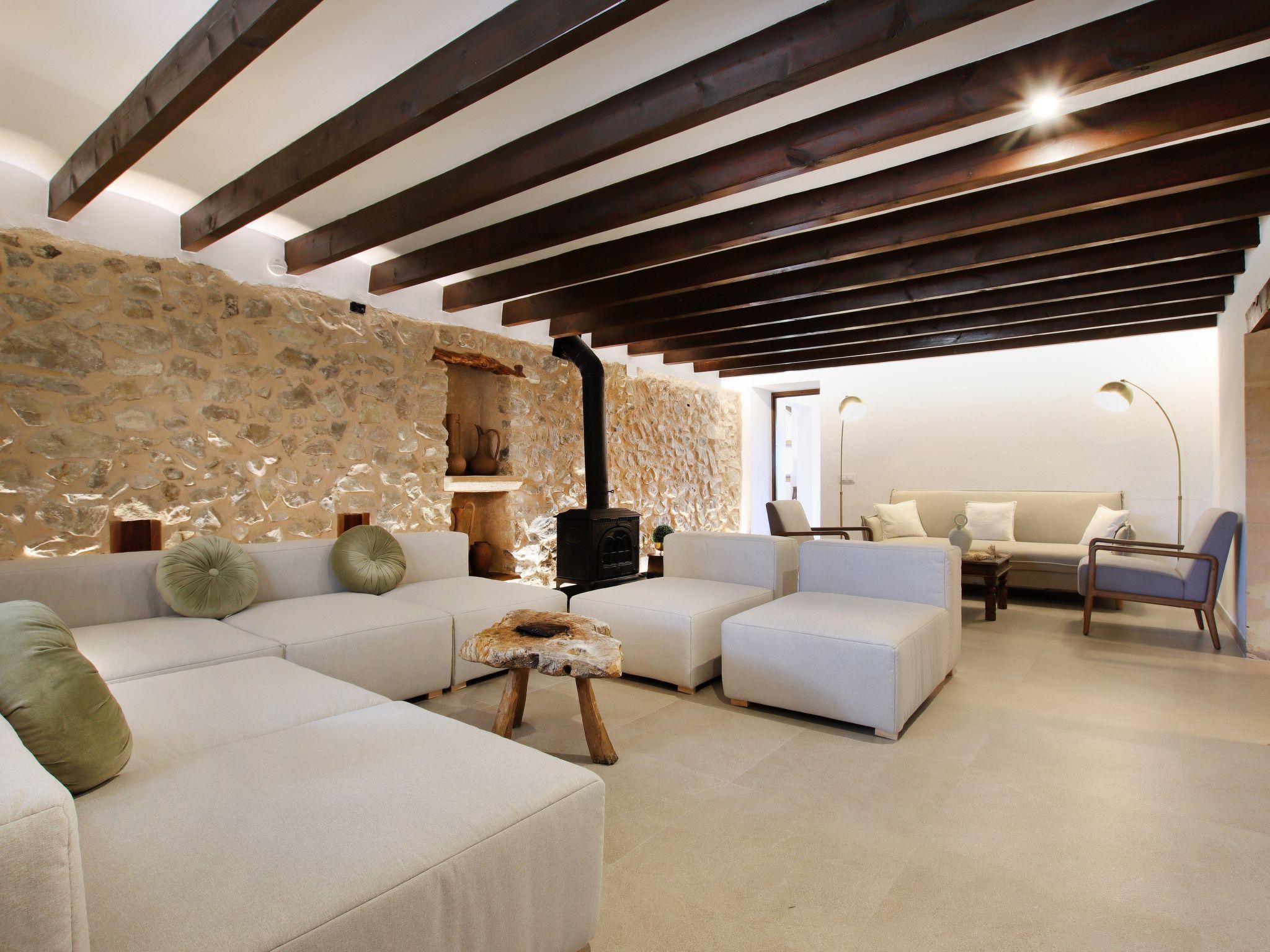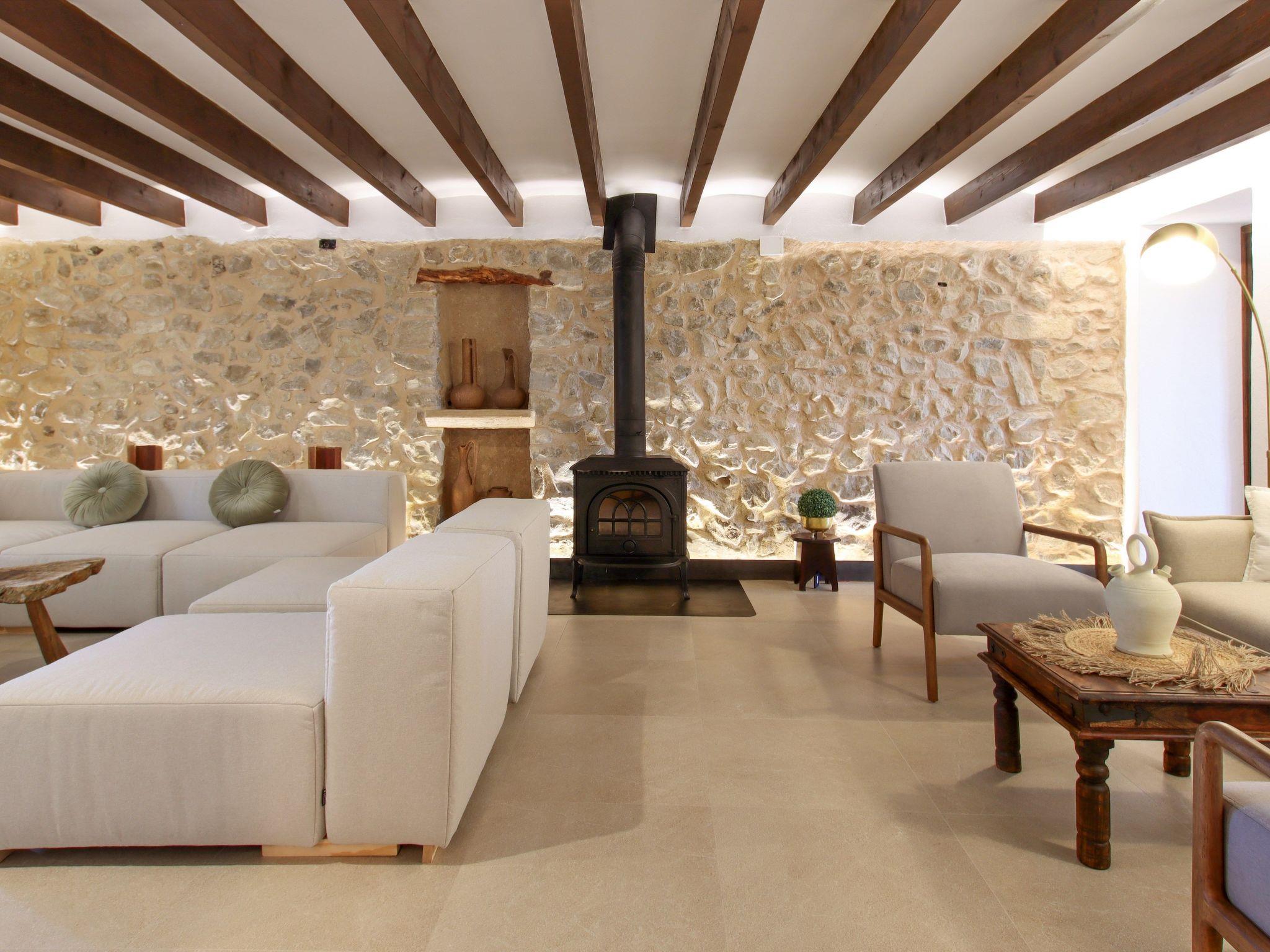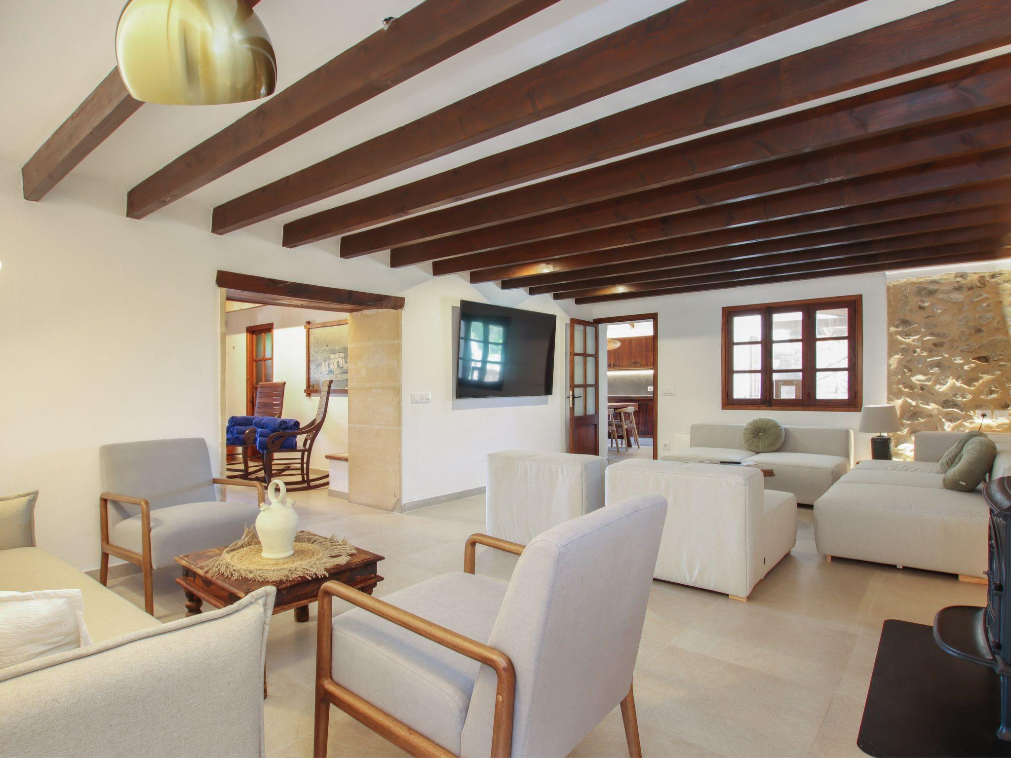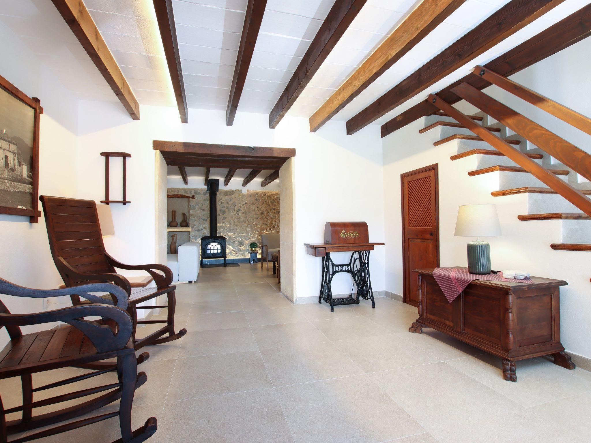 The interior of the villa has a welcoming hall and stairs leading to the upper floor. The interior is well equipped and perfectly combines modern comforts with traditional Mallorcan charm. There is a spacious living room equipped with a large sofa and plasma TV and a separate cosy reading area for your peace and quiet. In this part of the house there is also a spacious traditional kitchen equipped with modern appliances and a charming fireplace. A dining table offers ample space for family meals.