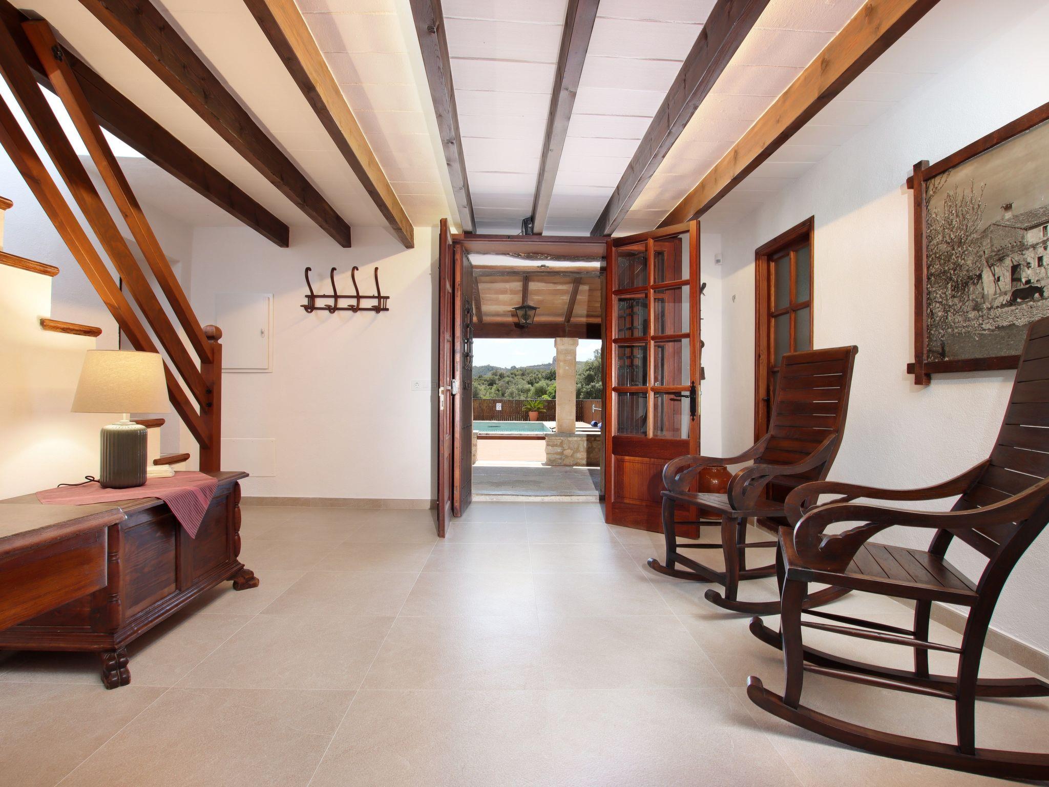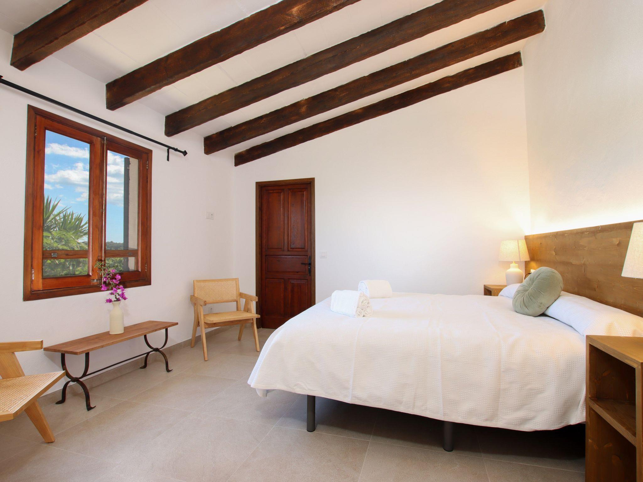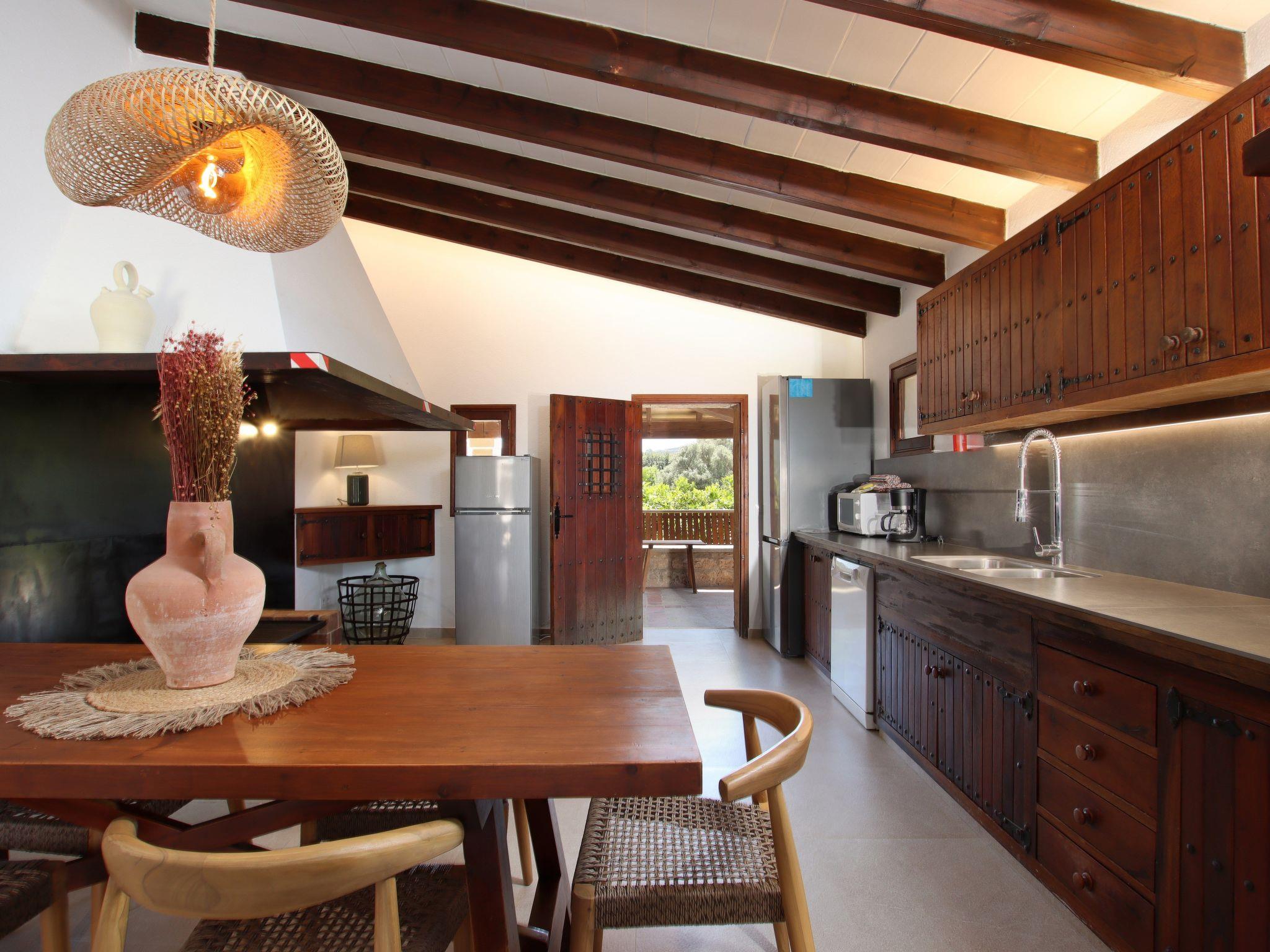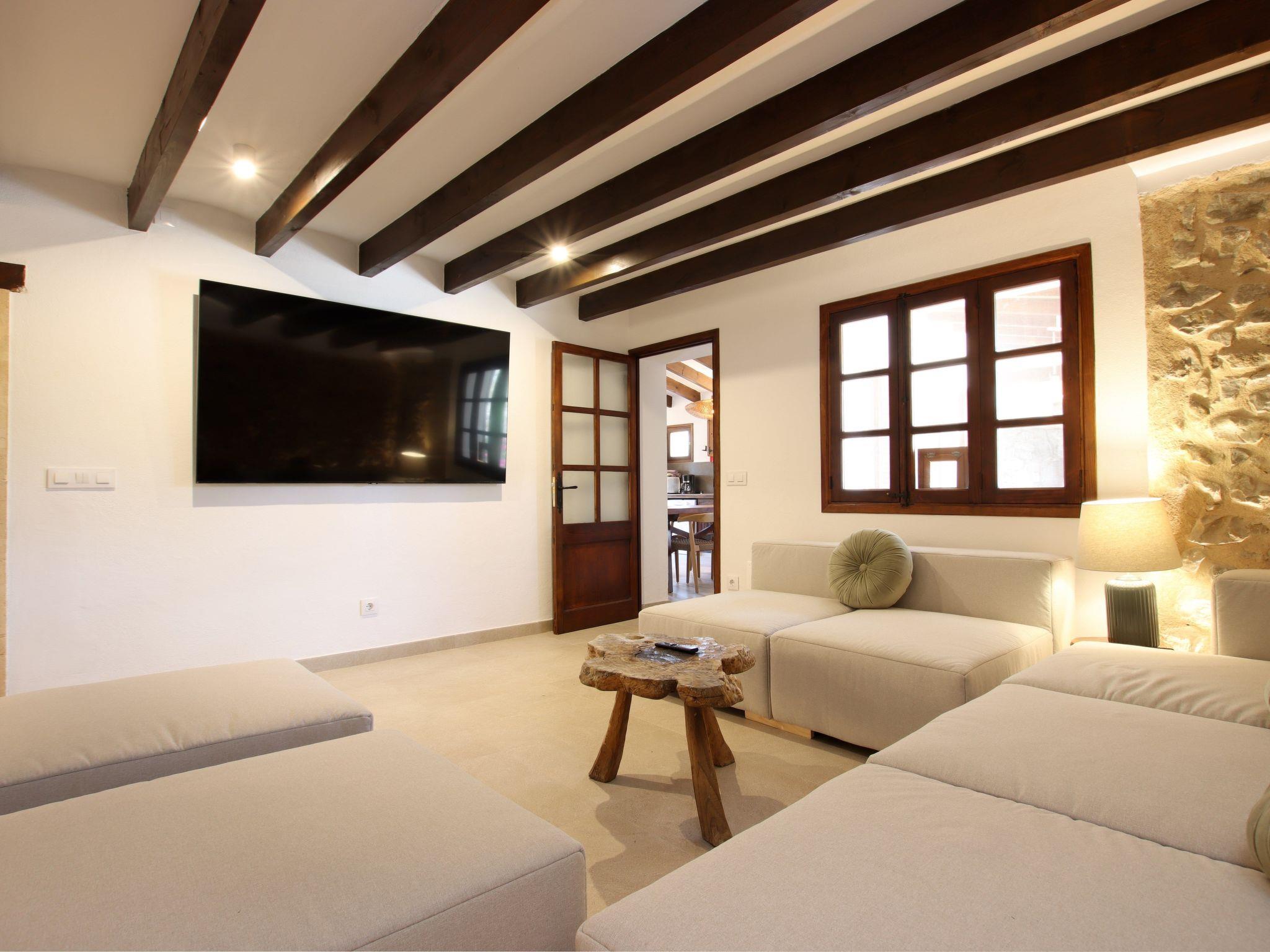 The interior of the villa has a welcoming hall and stairs leading to the upper floor. The interior is well equipped and perfectly combines modern comforts with traditional Mallorcan charm. There is a spacious living room equipped with a large sofa and plasma TV and a separate cosy reading area for your peace and quiet. In this part of the house there is also a spacious traditional kitchen equipped with modern appliances and a charming fireplace. A dining table offers ample space for family meals.