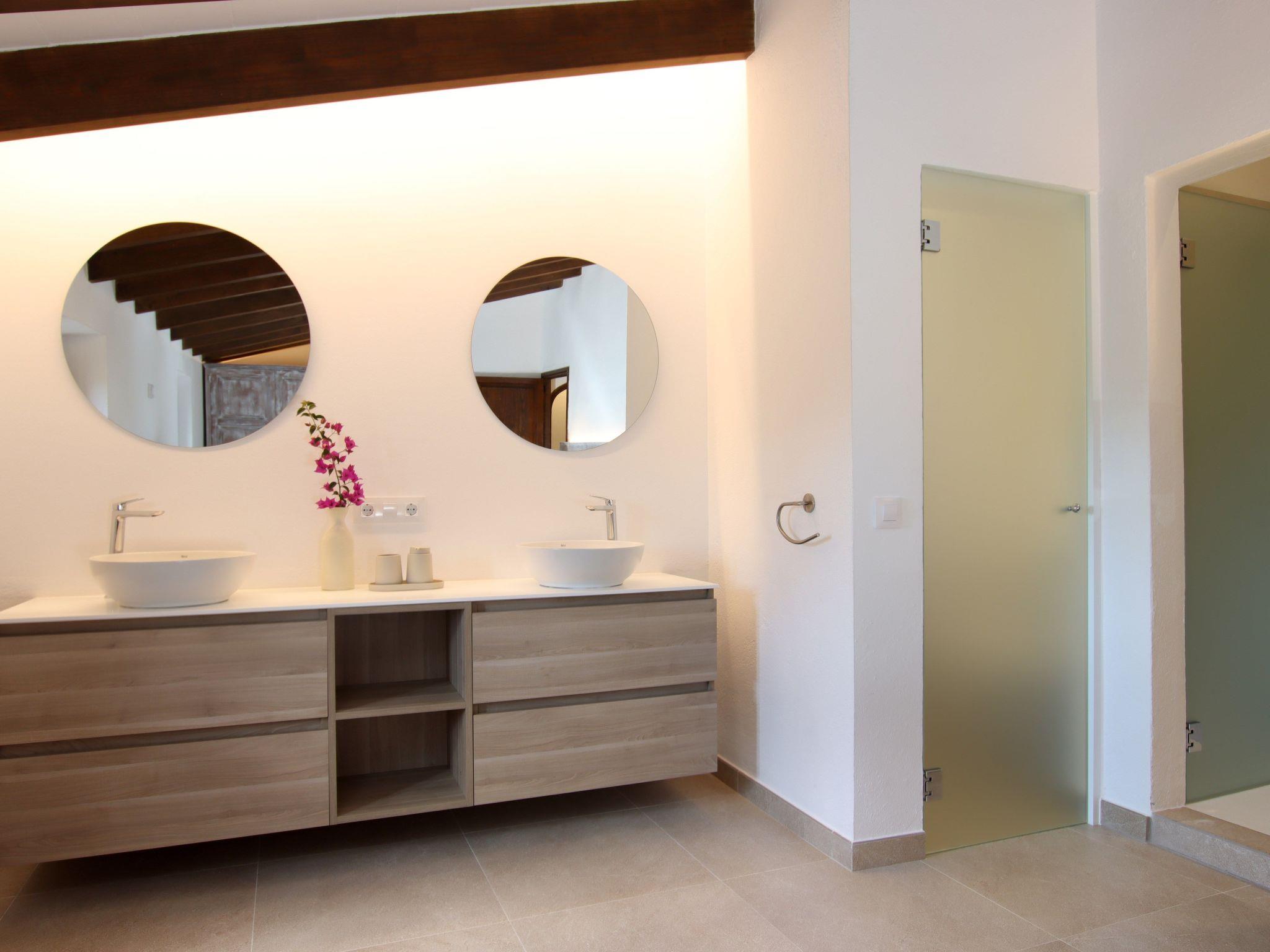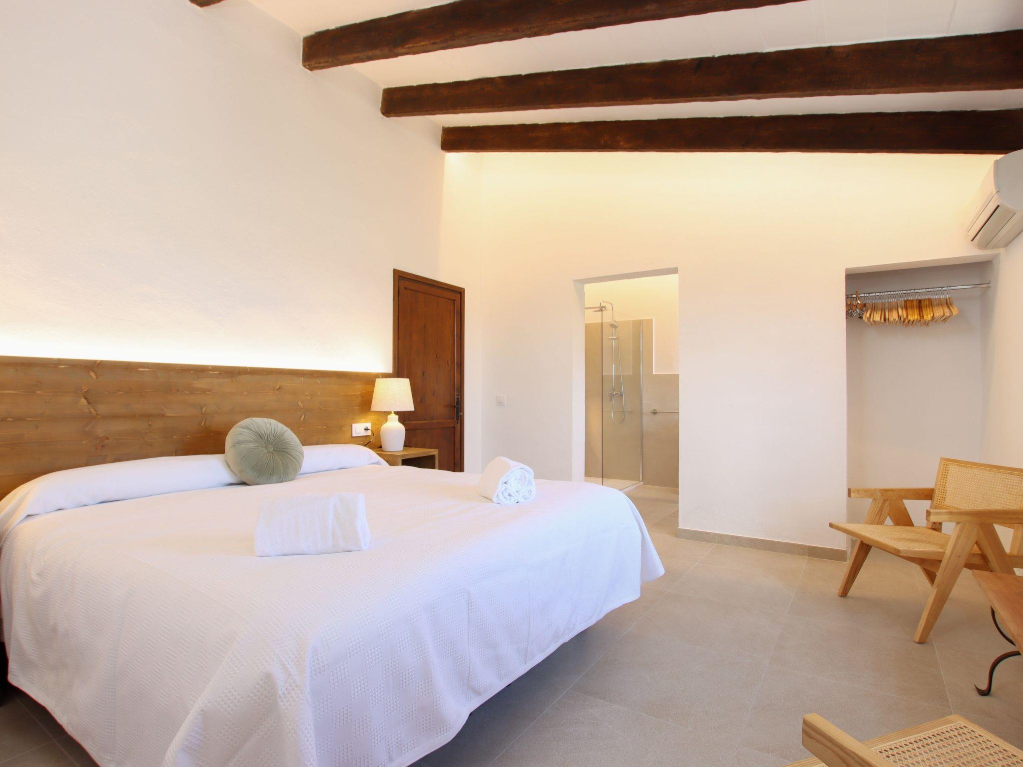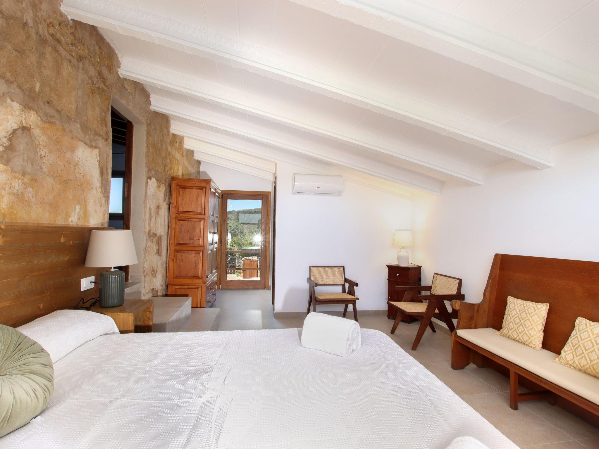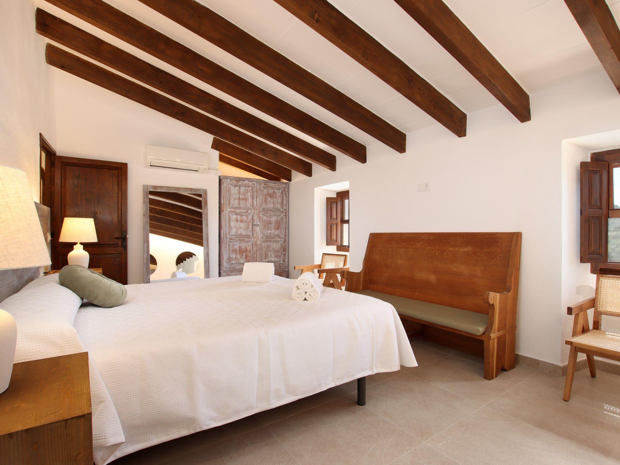 The interior of the villa has a welcoming hall and stairs leading to the upper floor. The interior is well equipped and perfectly combines modern comforts with traditional Mallorcan charm. There is a spacious living room equipped with a large sofa and plasma TV and a separate cosy reading area for your peace and quiet. In this part of the house there is also a spacious traditional kitchen equipped with modern appliances and a charming fireplace. A dining table offers ample space for family meals.