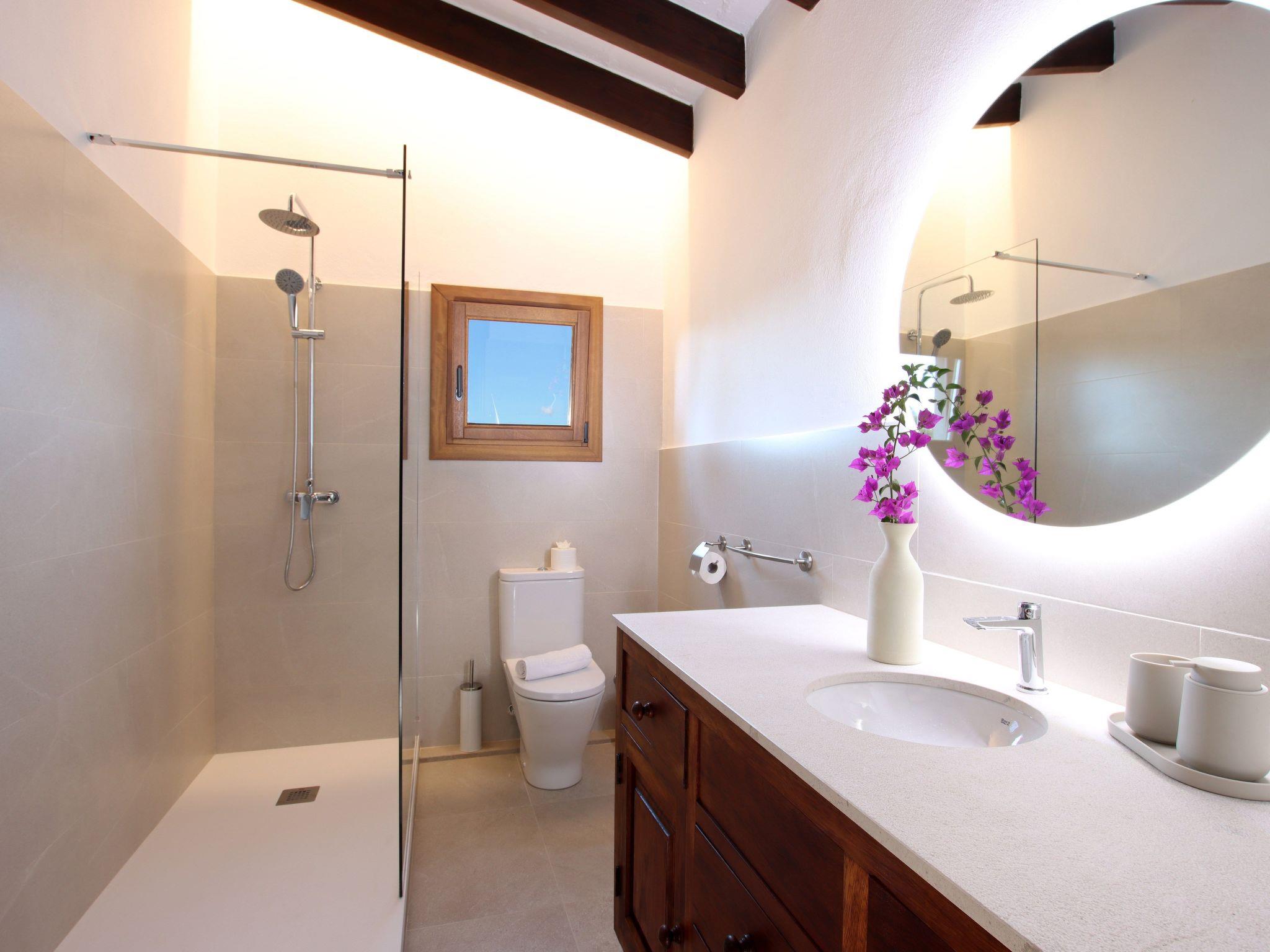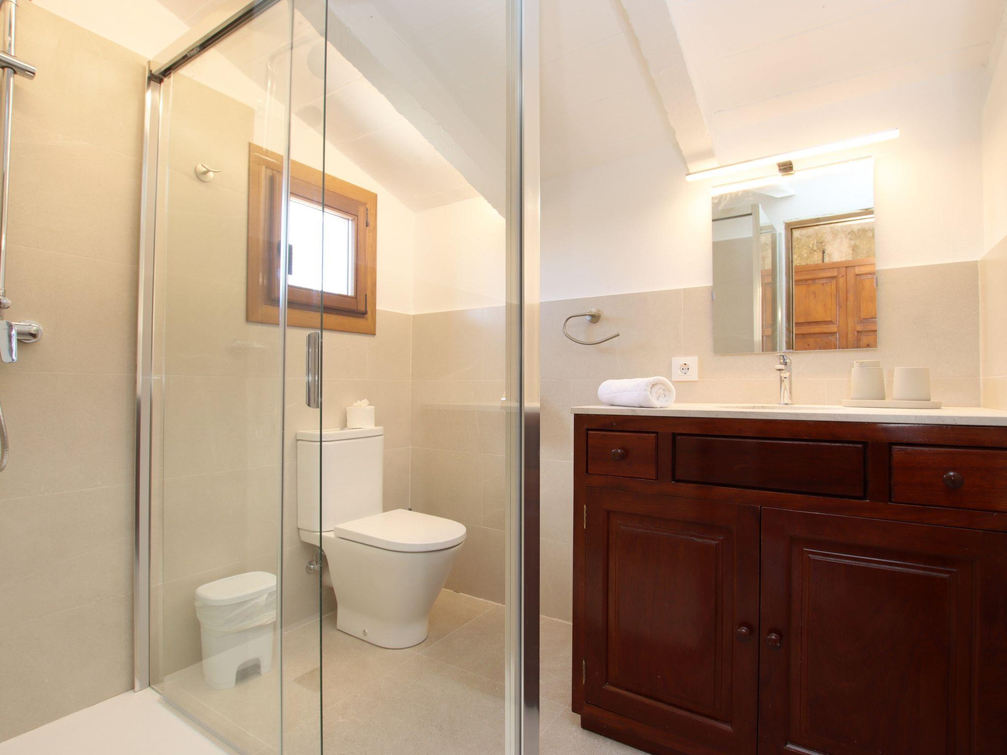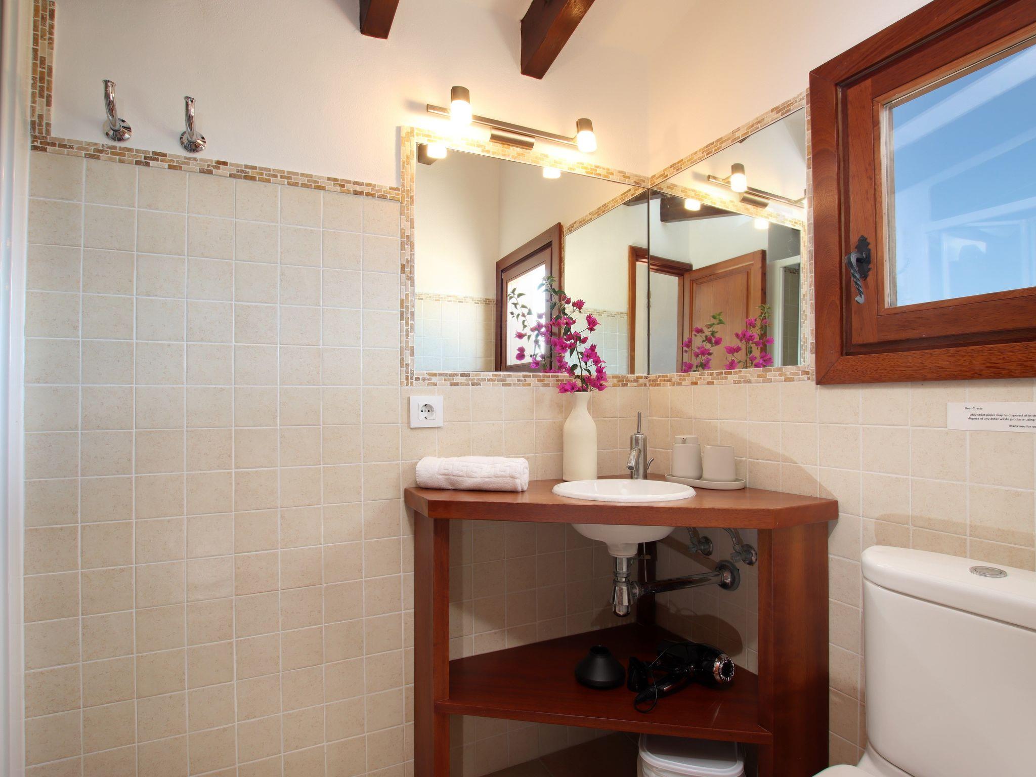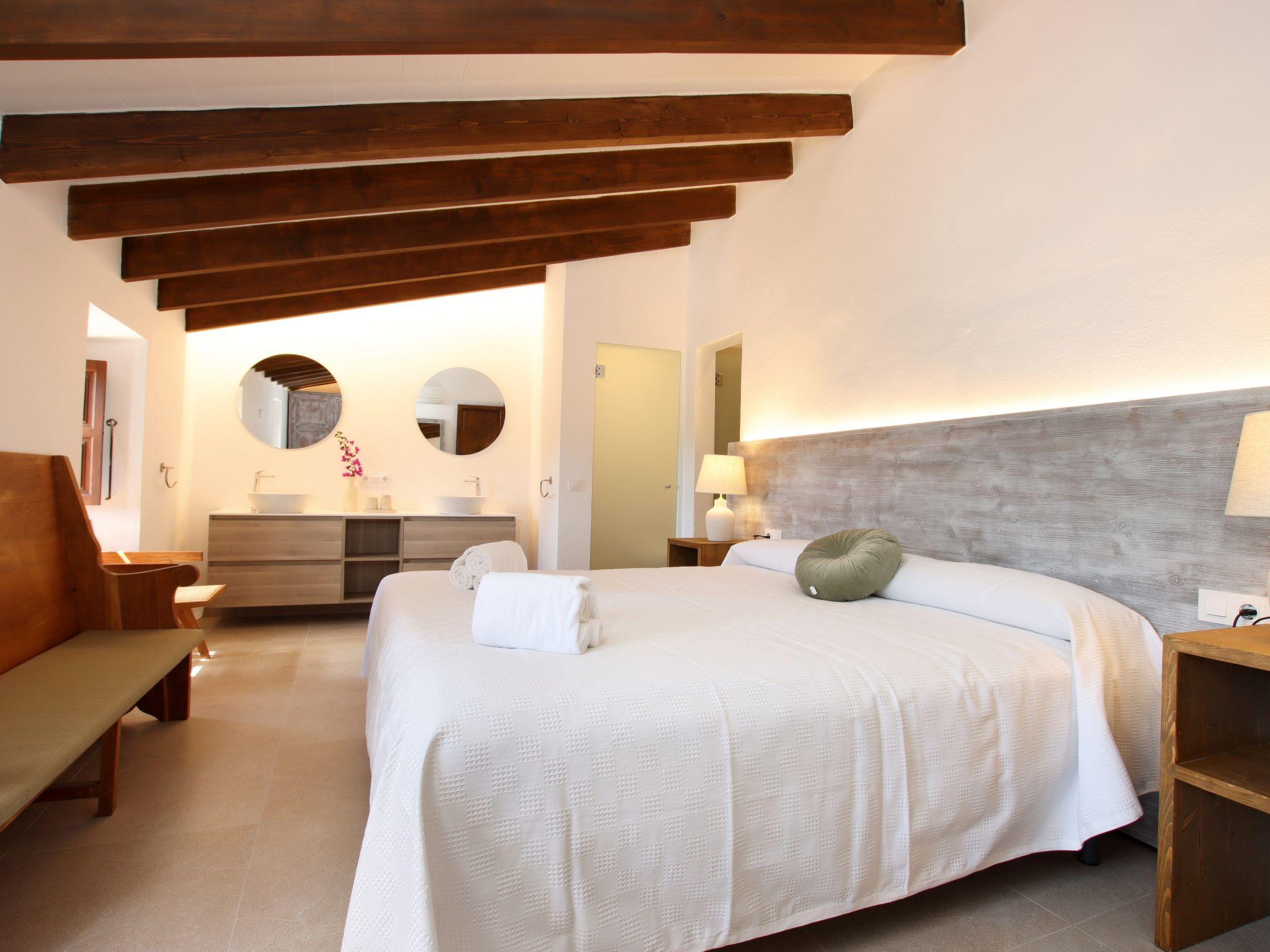The interior of the villa has a welcoming hall and stairs leading to the upper floor. The interior is well equipped and perfectly combines modern comforts with traditional Mallorcan charm. There is a spacious living room equipped with a large sofa and plasma TV and a separate cosy reading area for your peace and quiet. In this part of the house there is also a spacious traditional kitchen equipped with modern appliances and a charming fireplace. A dining table offers ample space for family meals.