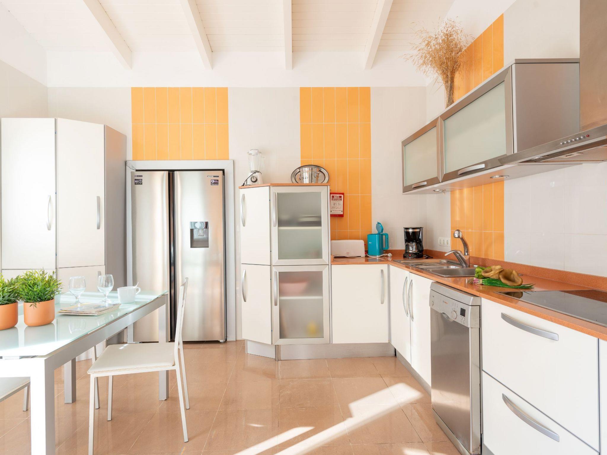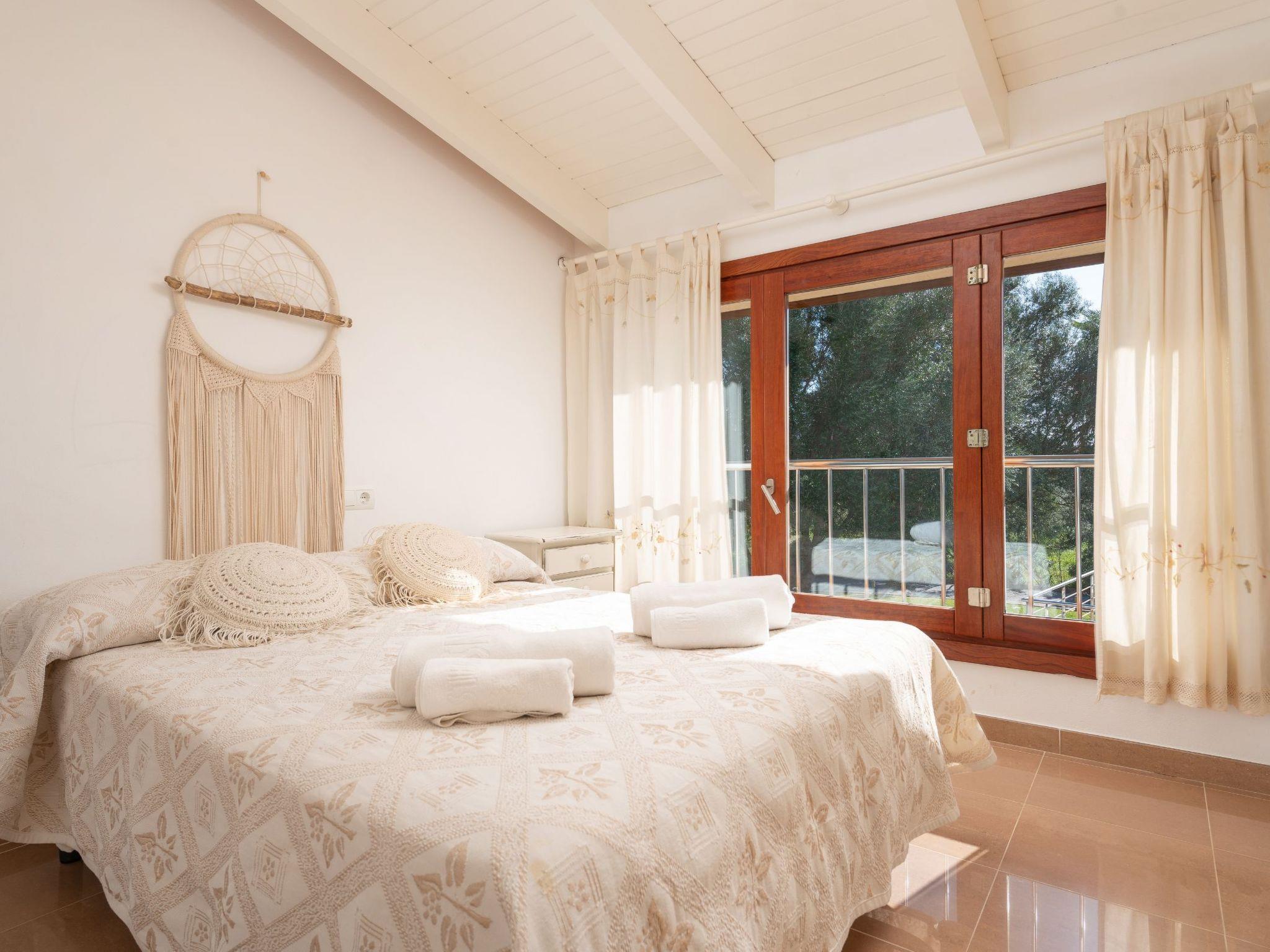 The interior of Villa Sa Cova exudes a calming organic-modern and bohemian flair, crafted with natural materials to create a welcoming atmosphere. The spacious living room, featuring air conditioning and a large comfortable sofa, serves as an ideal spot for unwinding. The kitchen and dining areas are equipped with all necessities for a delightful cooking experience, boasting two separate dining spaces to cater to your group's needs. Comfort extends to the bedrooms, where four double rooms offer peaceful havens with air conditioning in three of them. The villa also includes three stylishly tiled bathrooms, each stocked with essential amenities for your convenience.