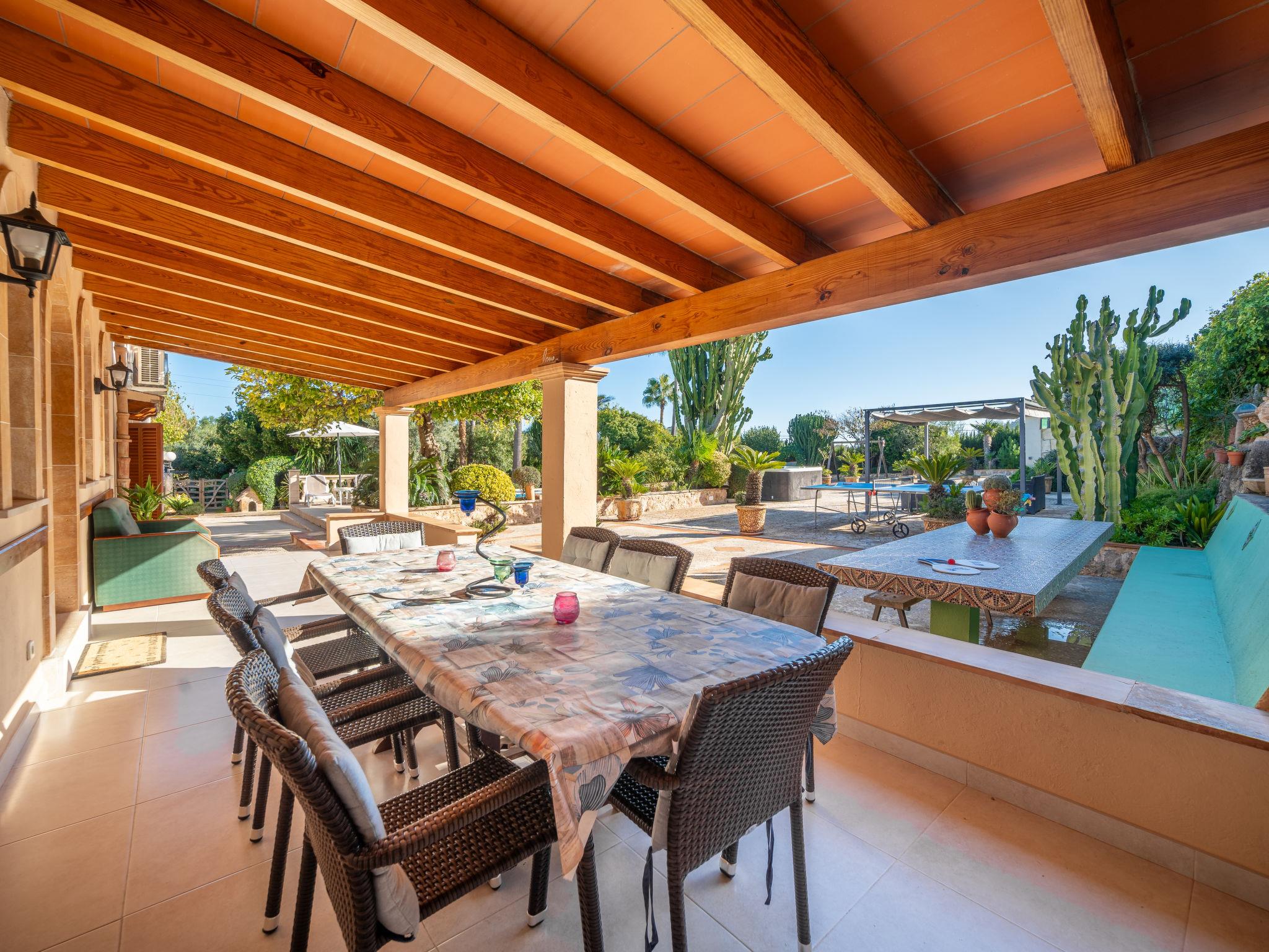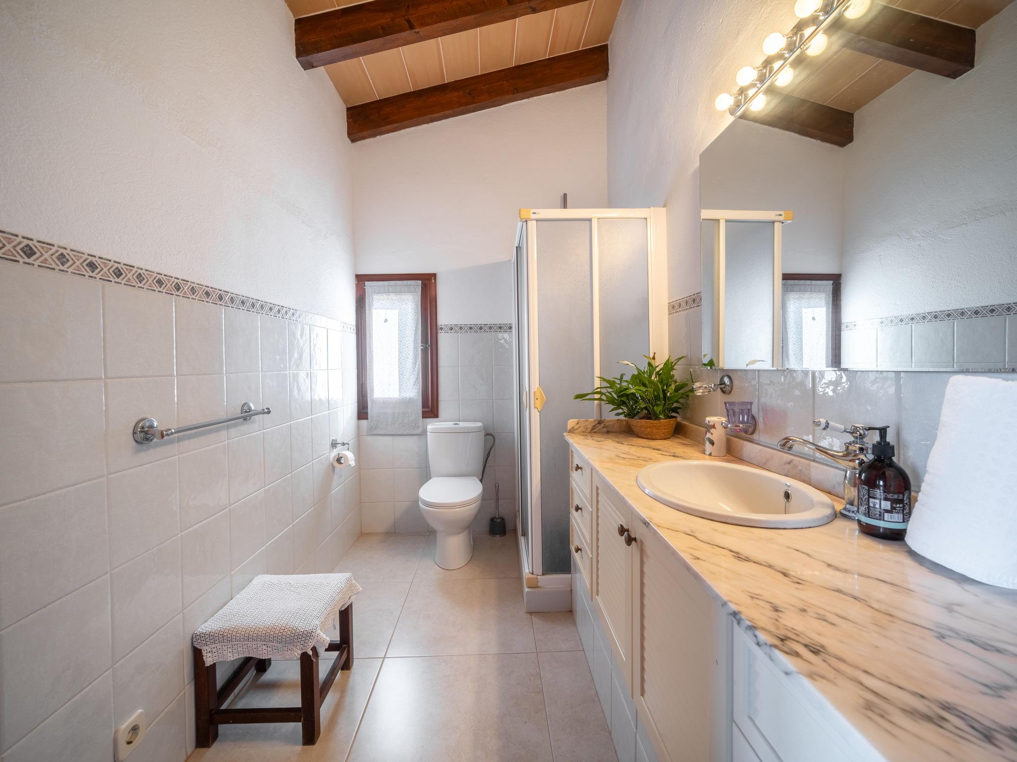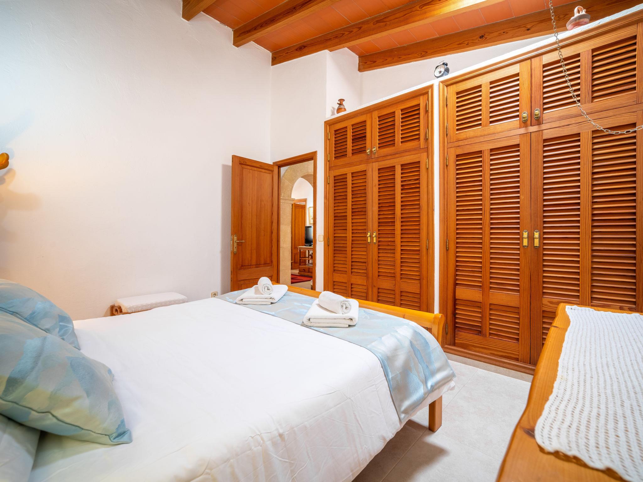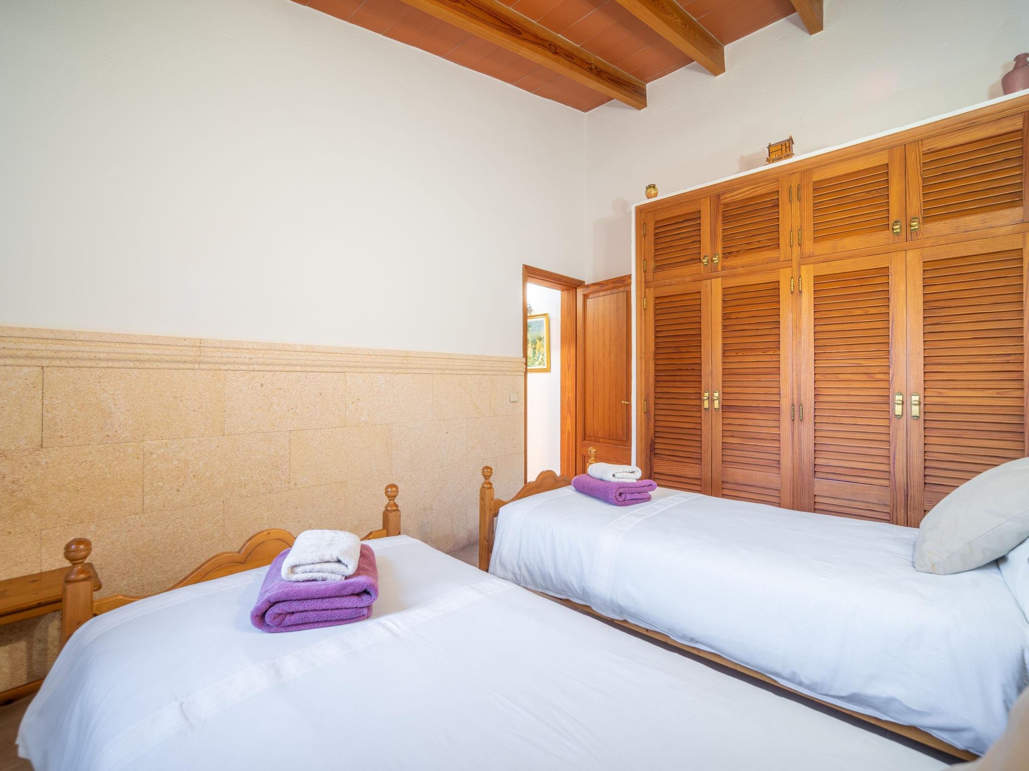 "Ca Na Guerrera", 6-room villa 180 m2 on 2 levels. Rustic and cosy furnishings: living room with open-hearth fireplace, satellite TV, flat screen, radio and DVD. Exit to the patio, to the swimming pool. 1 double bedroom with 2 beds (90 cm, length 190 cm), air conditioning and forced-air heating. 1 double bedroom with 1 french bed (150 cm, length 200 cm), air conditioning and forced-air heating. 1 room with 1 pull-out bed, air conditioning and forced-air heating. Kitchen (oven, dishwasher, 4 ceramic glass hob hotplates, microwave, freezer, electric coffee machine) with dining table. Exit to the patio, to the swimming pool. Shower/bidet/WC. Upper floor: 1 large double bedroom with 1 french bed (150 cm, length 200 cm), shower/WC, air conditioning and forced-air heating. Exit to the balcony. Natural stone floors. Comfortable furnishings in the country house style. Terrace, patio, lawn. Terrace furniture, balcony furniture, barbecue, deck chairs (8), covered balcony, sitting area. View of the mountains. Facilities: washing machine, safe, iron, children's high chair, baby cot for up to 2 year olds, hair dryer. Internet (WiFi, free). At the house. Suitable for families. ETV/553 // Reg. Nr.: ESFCTU000007043000034869000000000000000000000ETV/5537