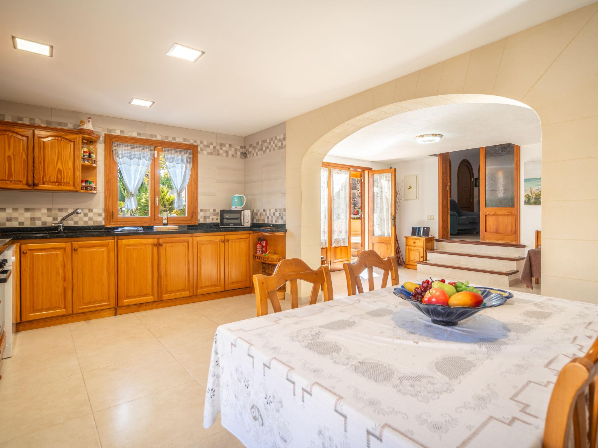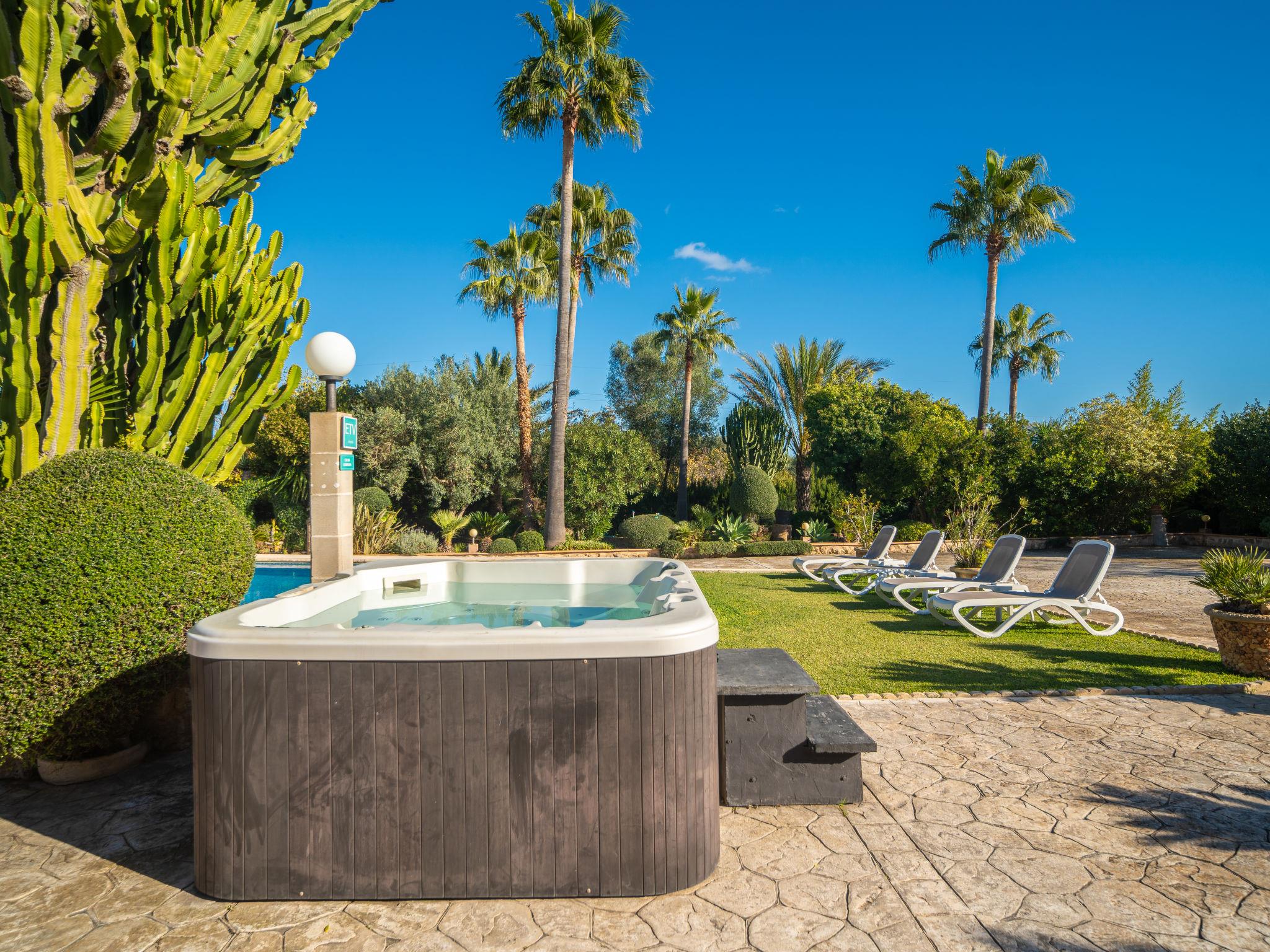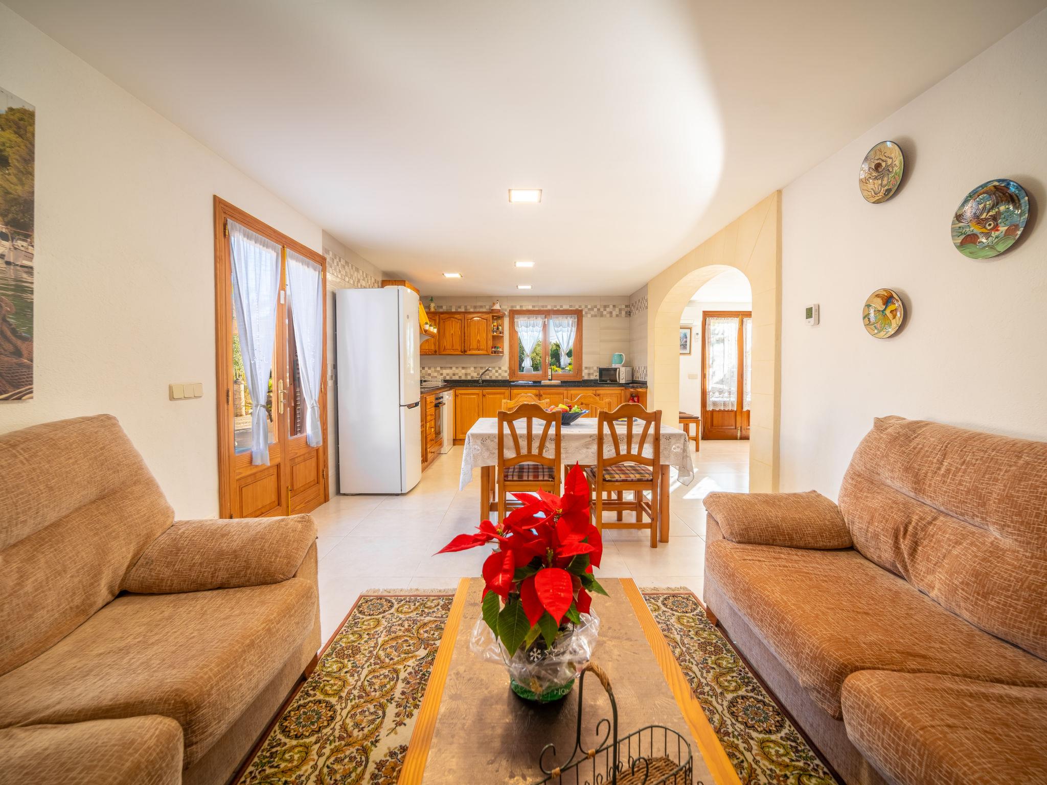 "Ca Na Guerrera", 6-room villa 180 m2 on 2 levels. Rustic and cosy furnishings: living room with open-hearth fireplace, satellite TV, flat screen, radio and DVD. Exit to the patio, to the swimming pool. 1 double bedroom with 2 beds (90 cm, length 190 cm), air conditioning and forced-air heating. 1 double bedroom with 1 french bed (150 cm, length 200 cm), air conditioning and forced-air heating. 1 room with 1 pull-out bed, air conditioning and forced-air heating. Kitchen (oven, dishwasher, 4 ceramic glass hob hotplates, microwave, freezer, electric coffee machine) with dining table. Exit to the patio, to the swimming pool. Shower/bidet/WC. Upper floor: 1 large double bedroom with 1 french bed (150 cm, length 200 cm), shower/WC, air conditioning and forced-air heating. Exit to the balcony. Natural stone floors. Comfortable furnishings in the country house style. Terrace, patio, lawn. Terrace furniture, balcony furniture, barbecue, deck chairs (8), covered balcony, sitting area. View of the mountains. Facilities: washing machine, safe, iron, children's high chair, baby cot for up to 2 year olds, hair dryer. Internet (WiFi, free). At the house. Suitable for families. ETV/553 // Reg. Nr.: ESFCTU000007043000034869000000000000000000000ETV/5537