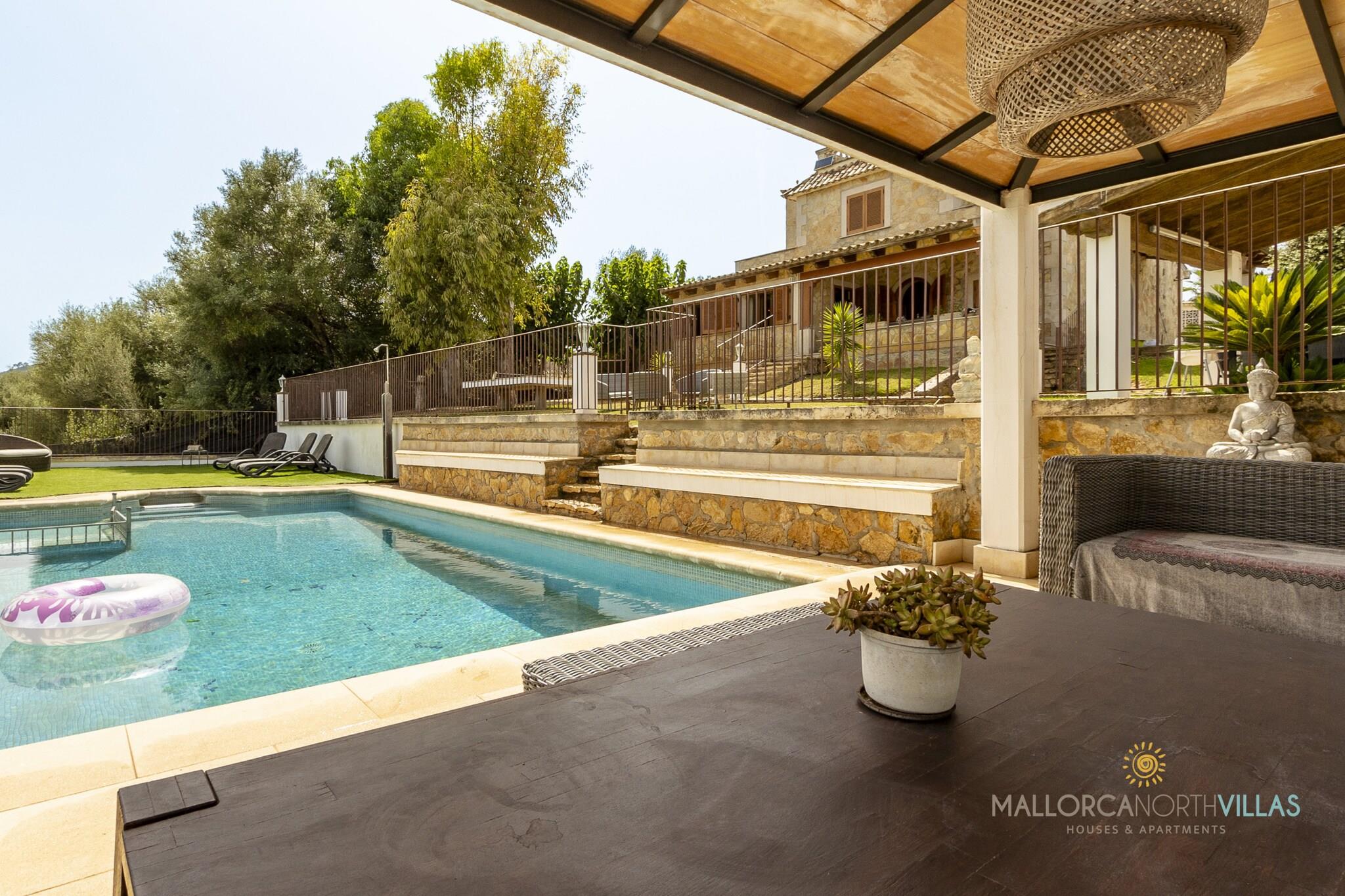 Denne lyse og hjemlige villa byder på 4 rummelige soveværelser og kan rumme op til 8 gæster inden for dens 208 m² gennemtænkte rum. Ejendommen er omgivet af en frodig have og har en privat swimmingpool, en indhegnet grund for ekstra privatliv og udendørsmøbler, der skaber et ideelt sted til afslapning. Udstyret med Wi-Fi, aircondition, vaskemaskine, tv, hårtørrer og strygejern sikrer villaen et behageligt ophold i et familievenligt og fredfyldt miljø nær havet. Villaen er bekvemt beliggende kun 2 km fra den historiske by Alcudia, tæt på en række attraktioner. Puerto Alcúdia-strandens sandstrande ligger kun 4 km derfra, mens den naturskønne klippestrand Aucanada og den berømte Club de Golf Aucanada ligger inden for 7 km. Golfentusiaster kan også besøge Pollensa Golf Club, kun 12 km væk. Til familieudflugter ligger den maleriske Playa de Puerto Pollensa 13 km fra villaen. Derudover er ejendommen godt forbundet, idet den ligger 32 km fra Aeropuerto Son San Joan og 55 km fra Palma, Mallorcas pulserende hovedstad. Køkkenet i åbent plan, udstyret med en glaskeramisk kogeplade, giver alt det nødvendige for nem tilberedning af måltider. Det inkluderer et køleskab, mikroovn, ovn, fryser og opvaskemaskine, samt vigtige ting som en kaffemaskine, brødrister, juicer, stegepande og køkkenredskaber. Uanset om du nyder en svømmetur, udforsker nærliggende attraktioner eller deler måltider på terrassen, tilbyder denne villa den perfekte blanding af komfort, stil og beliggenhed til en uforglemmelig ferie.