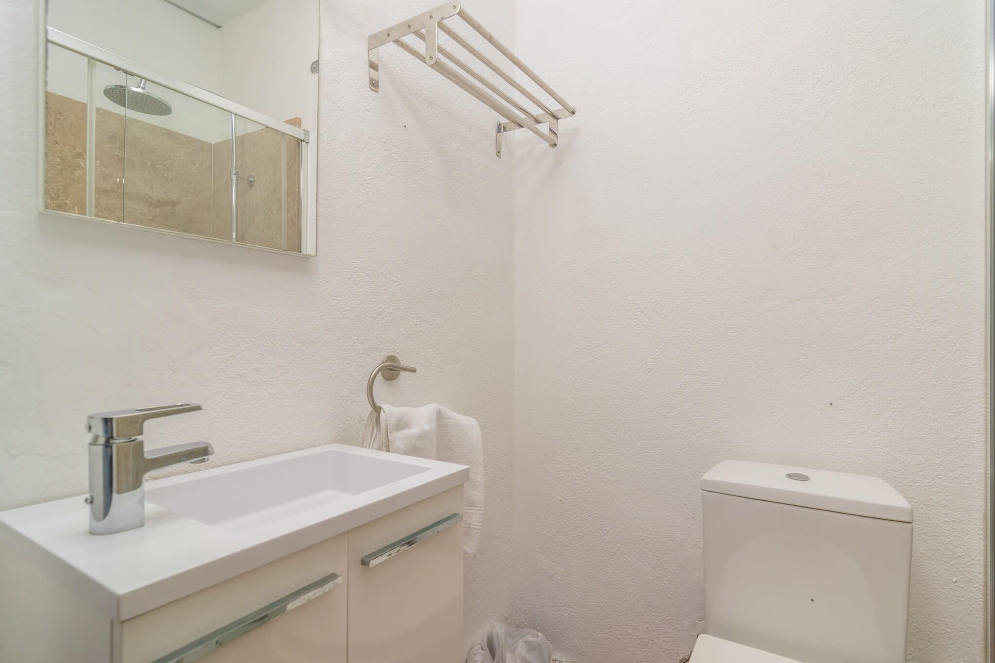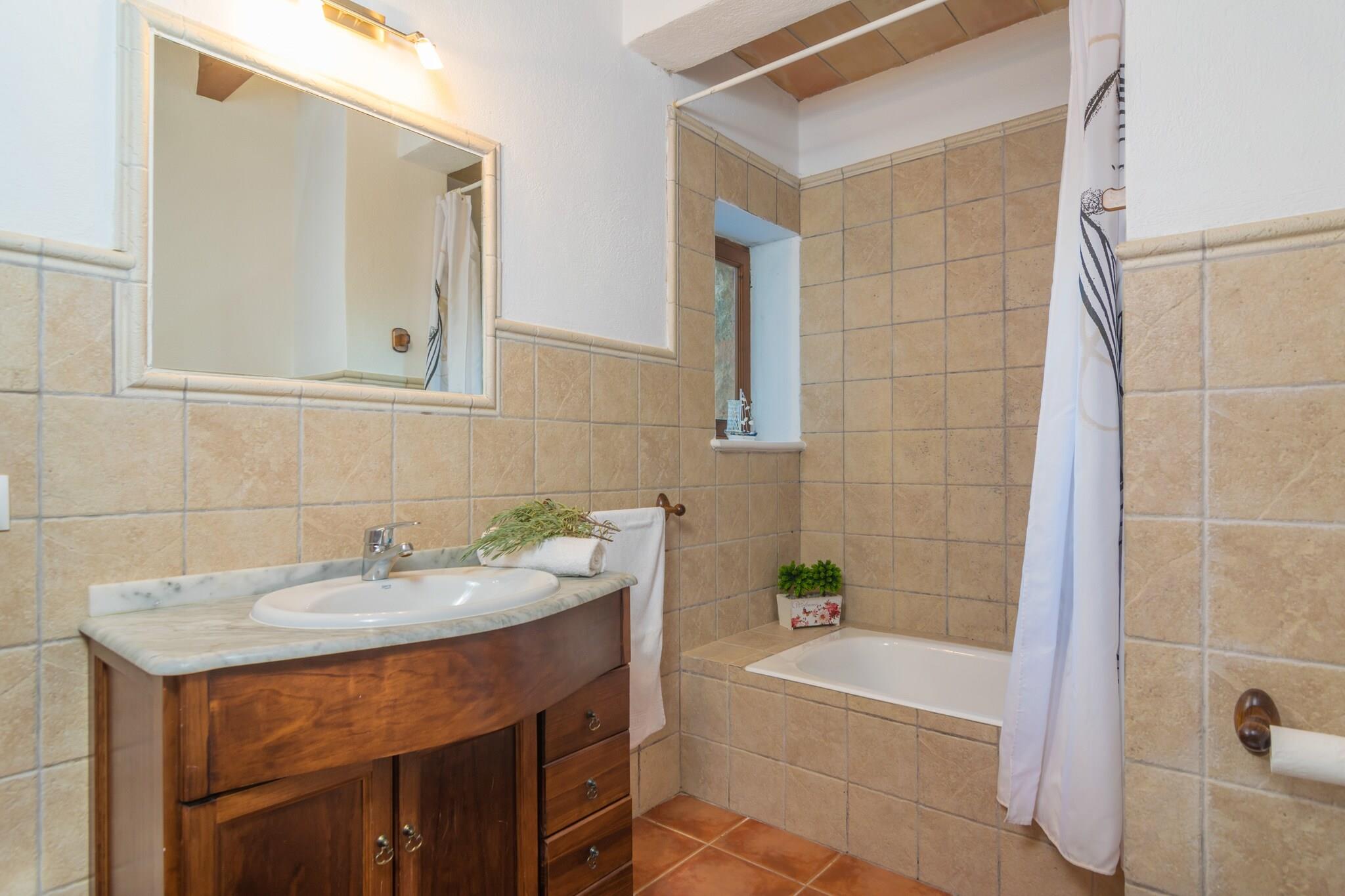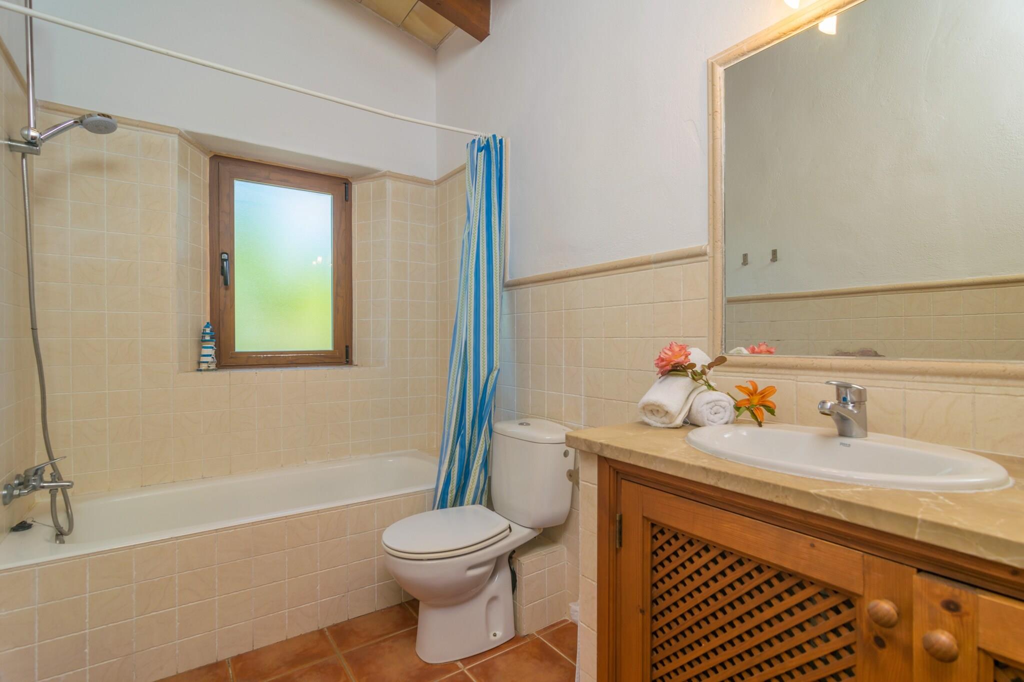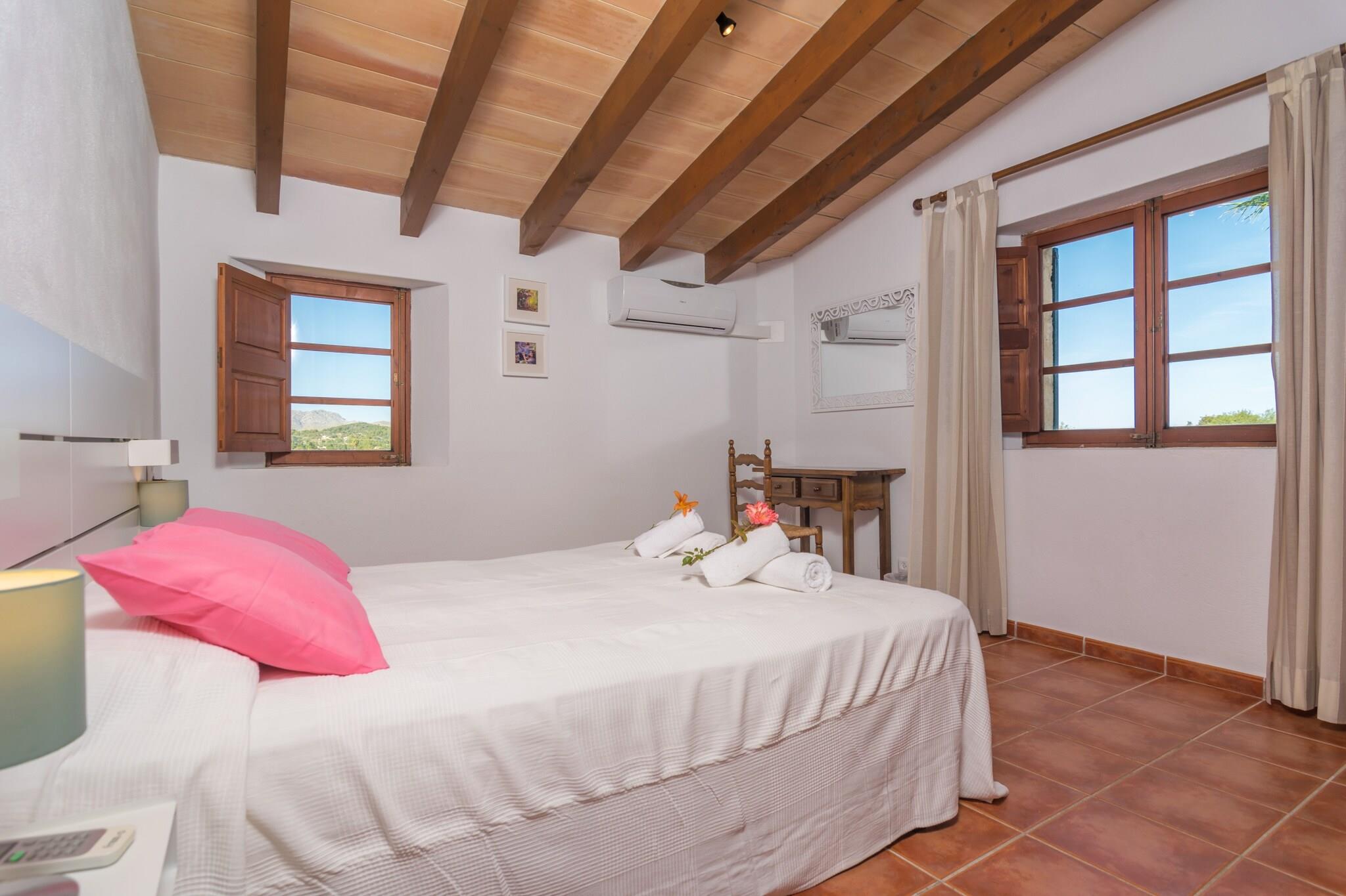 Udendørs afslapningsrum Træd ind i et privat tilflugtssted omgivet af frodige grønne områder. Villaens ydre inviterer dig til at slappe af med en forfriskende svømmetur i den 8 x 4 m store pool eller slikke solen på en af ??otte liggestole. Nyd alfresco-måltider på verandaen med grillen klar til en afslappet madlavning. En udendørs bruser og en indhegnet have sikrer både bekvemmelighed og privatliv, så du kan koble helt fra, mens du nyder middelhavsbrisen. Komfortabelt indendørs ophold Indenfor balancerer det to-etagers hjem rustik charme og moderne bekvemmelighed. Køkkenet er fuldt udstyret til at tilberede måltider, mens spiseområdet sætter scenen for afslappede familiesammenkomster. Stuen har et smart-tv med satellitkanaler til underholdning. Fire soveværelser, herunder et dobbeltværelse og tre med to enkeltsenge, plus tre badeværelser med badekar eller bruser, sikrer plads til alle. Hvert soveværelse har AC, skabe og tankevækkende detaljer som en barneseng, høj stol, ventilatorer og sikkerhedsbarrierer på trapperne til de små. Førsteklasses kystbeliggenhed Villaen ligger kun 6 km fra Alcúdia og Puerto de Alcúdia og tilbyder en blanding af fredeligt landskab og adgang til kysten. Udforsk lokale restauranter, barer og butikker, eller nyd en runde på Alcanada Golf, kun 10 km væk. Puerto de Alcúdias strande er i nærheden til solbadning, svømning eller vandsport.