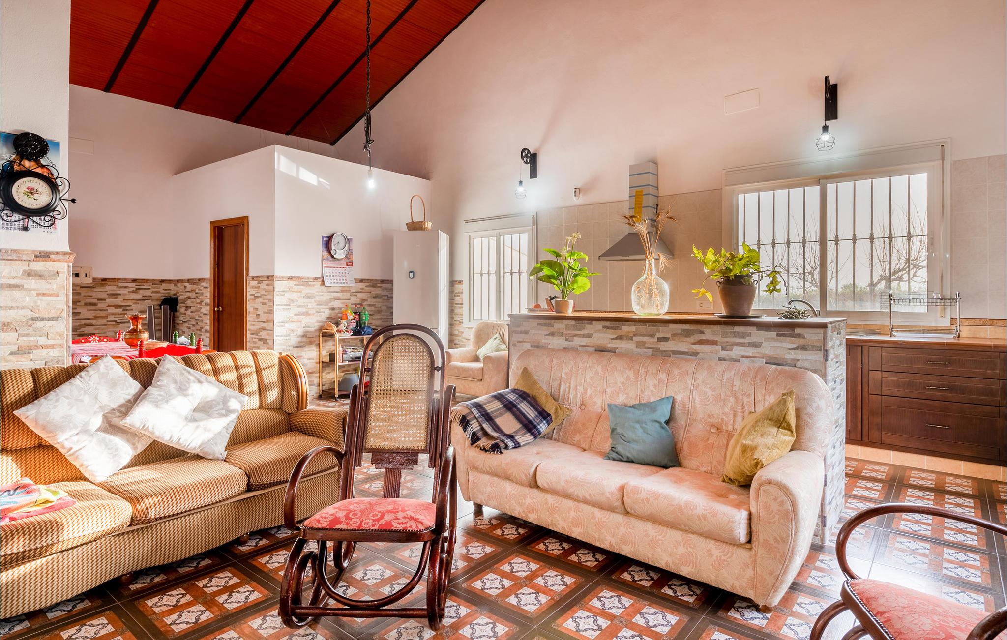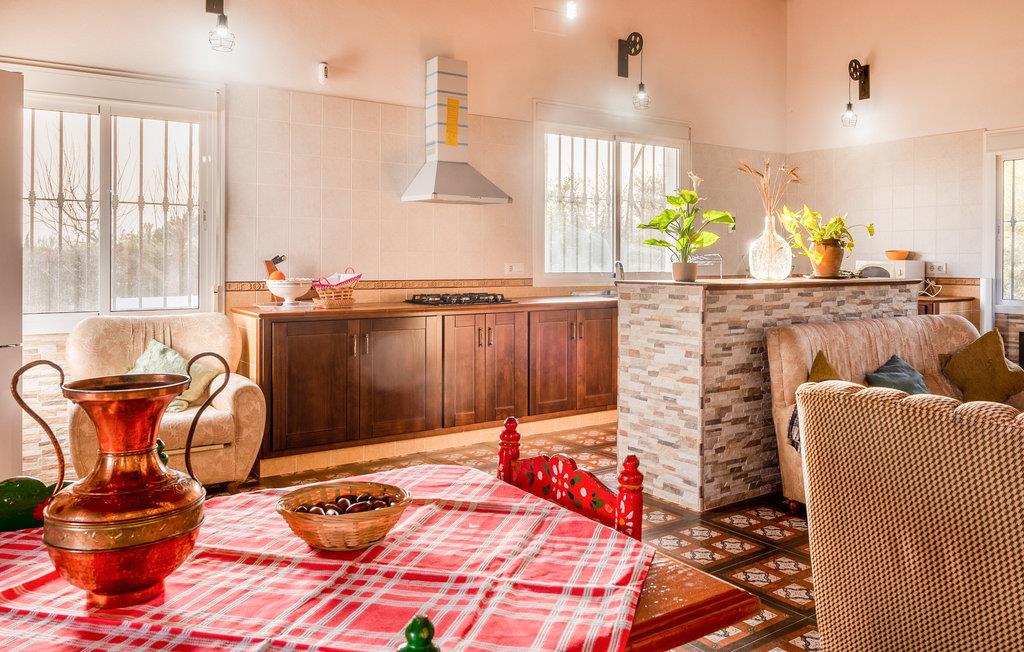 Velkommen indenfor i dette dejlige feriehus. Huset byder på et meget rummeligt opholdsrum med åben forbindelse mellem det veludstyrede køkken, stuen med komfortabelt møblement og spisekrogen. Kunstneriske fliser pryder hele gulvet i huset, og der er møbler i rustik og antikvarisk stil. Dette etplanshus har nok plads til, at du helt sikkert kan føle dig hjemme her.