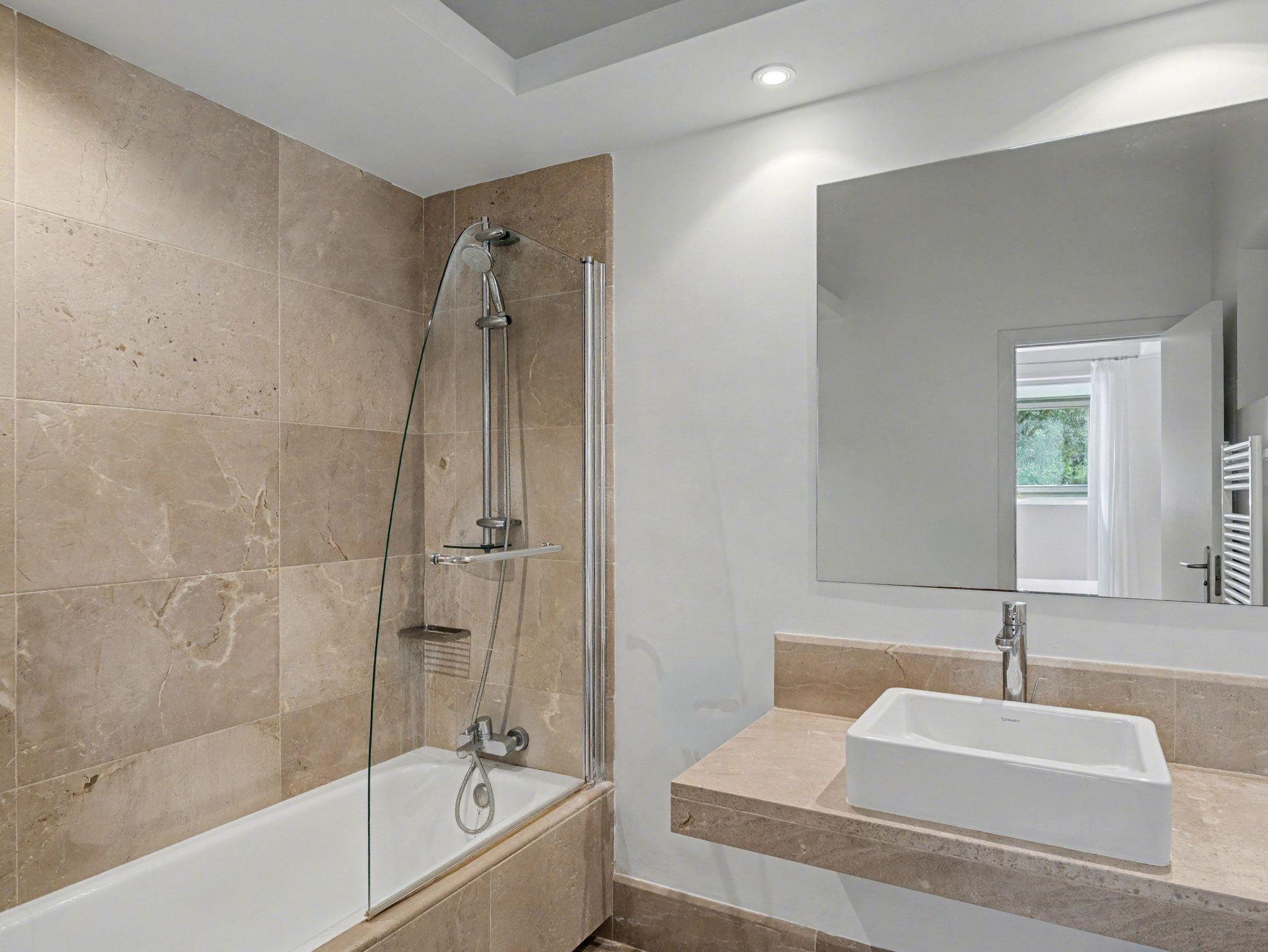 Es stehen 8 Schlafzimmer und 8 Badezimmer zur Verfügung, alle en-suite. Jedes Schlafzimmer verfügt über 2 Einzelmatratzen, die auf Wunsch des Eigentümers auch auseinander gezogen werden können. Drei der Badezimmer sind mit Dusche und Badewanne ausgestattet, die übrigen haben entweder Dusche oder Badewanne. Alle Schlafzimmer verfügen über SAT-TV und eine kleine Minibar.