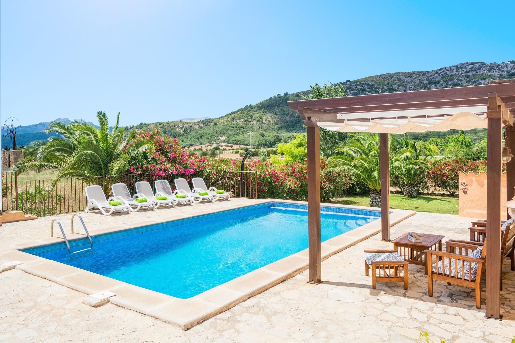 Hier begint de ochtend met een verfrissende duik in het chloorbad, met een afmeting van 8,5 x 4,5 meter en een diepte tussen de 1 en 1,9 meter. Rondom het zwembad ligt een terras met zes ligstoelen en tuinmeubilair waar u van een drankje kunt genieten terwijl u uitkijkt op de bergen. Een trap leidt vanaf het zwembad naar de grote tuin, waar voldoende ruimte is om uw handdoek uit te spreiden in de schaduw van een palmboom. De gemeubileerde veranda nodigt uit tot avonden met vrienden en familie, misschien wel een heerlijke barbecue? Binnen heeft het huis met twee verdiepingen een rustieke en comfortabele stijl. De woon-eetkamer met banken heeft een televisie met Astra (Duitse en Engelse zenders) en een dvd-speler. De eettafel nodigt 8 gasten uit om samen te eten en te genieten van gesprekken en gelach. De keuken is zeer authentiek en je kunt nog steeds de put zien die ooit de enige waterbron voor het huis was - tegenwoordig is het een decoratief element. De keuken is voorzien van een gaskookplaat, een oven, vaatwasser, Italiaans koffiezetapparaat en wat kookgerei; onder andere. De wasruimte beschikt over een wasmachine, strijkijzer en strijkplank. In totaal heeft het huis 4 tweepersoonsslaapkamers; Ze bevinden zich op de eerste verdieping, waarvan drie met twee eenpersoonsbedden en één met een tweepersoonsbed. Daarnaast zijn er boven twee badkamers met ligbad en wastafel. Een andere badkamer met douche bevindt zich op de begane grond. Alle slaapkamers hebben prachtig uitzicht op het landschap en zijn voorzien van airconditioning en een kledingkast en er is ruimte om een ??kinderbedje en kinderstoel klaar te zetten als u met uw baby reist. In een van de kamers bevindt zich een kleine kluis. De villa ligt in de bergen, maar tegelijkertijd slechts 4,5 km van Playa de Muro. Het is een lang strand met fijn wit zand dat de steden Can Picafort en Puerto de Alcúdia met elkaar verbindt. Er zijn gebieden waar niet bebouwd wordt en je kunt genieten van de natuur en een intact duinsysteem. In Puerto de Alcúdia vindt u een breed scala aan recreatieve activiteiten, vele restaurants, supermarkten, strandbars en speeltuinen. Het natuurpark S'Albufera is het hele jaar door geopend en herbergt een grote verscheidenheid aan dieren, vooral vogels. Voor eventuele extra kosten kunt u contact opnemen met de adverteerder. Wij accepteren geen huisdieren. Het vieren van evenementen is niet toegestaan. Er is buiten parkeergelegenheid voor 4 auto's. Afstanden Strand: 4,5 km - Playa de Muro Luchthaven: 58,5 km - Son Sant Joan Golfbaan: 14 km - Alcanada Stad: 11,7 km - Alcúdia Treinstation: 6,5 km - Sa Pobla Bushalte: 4,4 km - Carretera D'ArtÃ, Alcúdia Veerboot: 11,8 km - Puerto de Alcúdia Ziekenhuis: 5,4 km - Juaneda Muro Toeristenvergunning: ETV/642