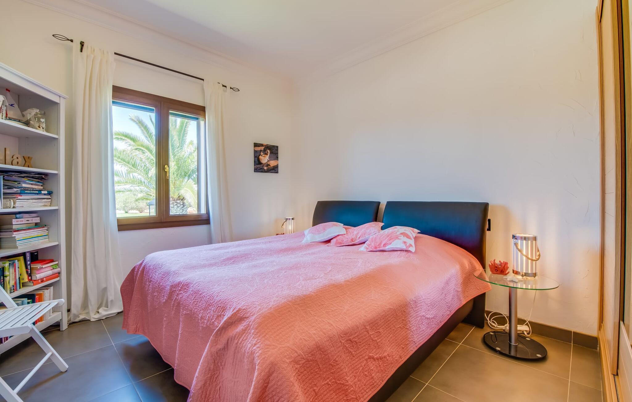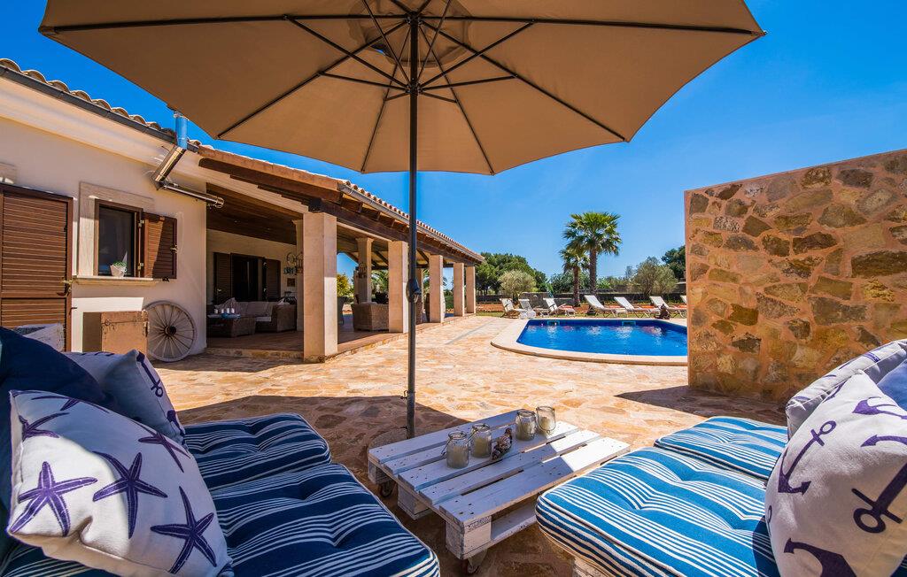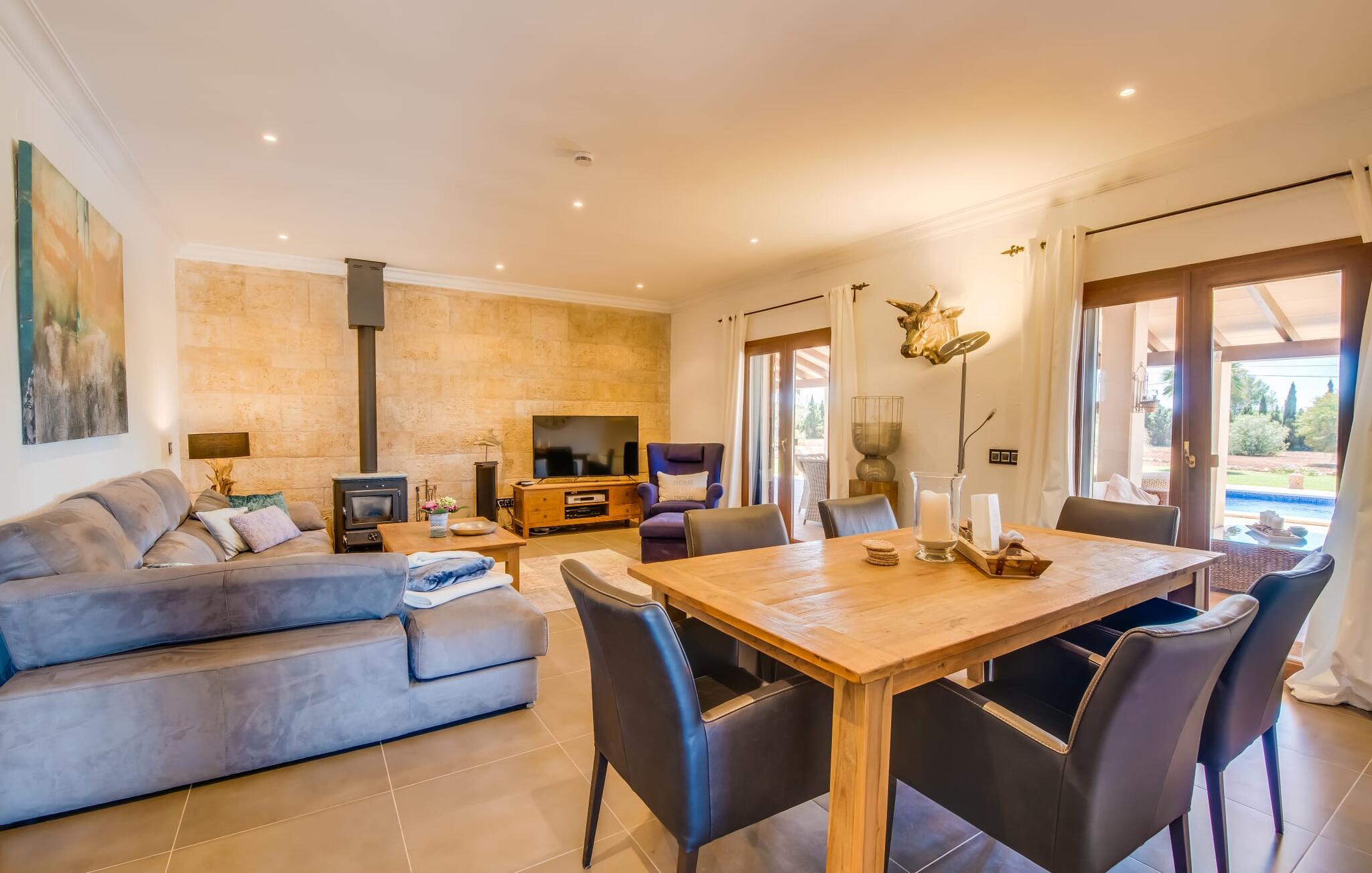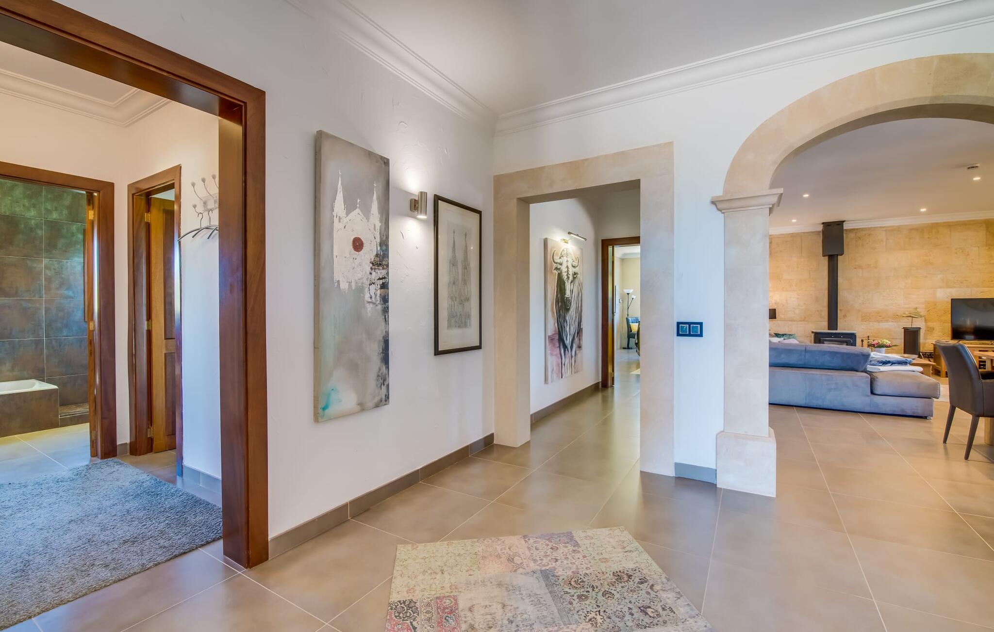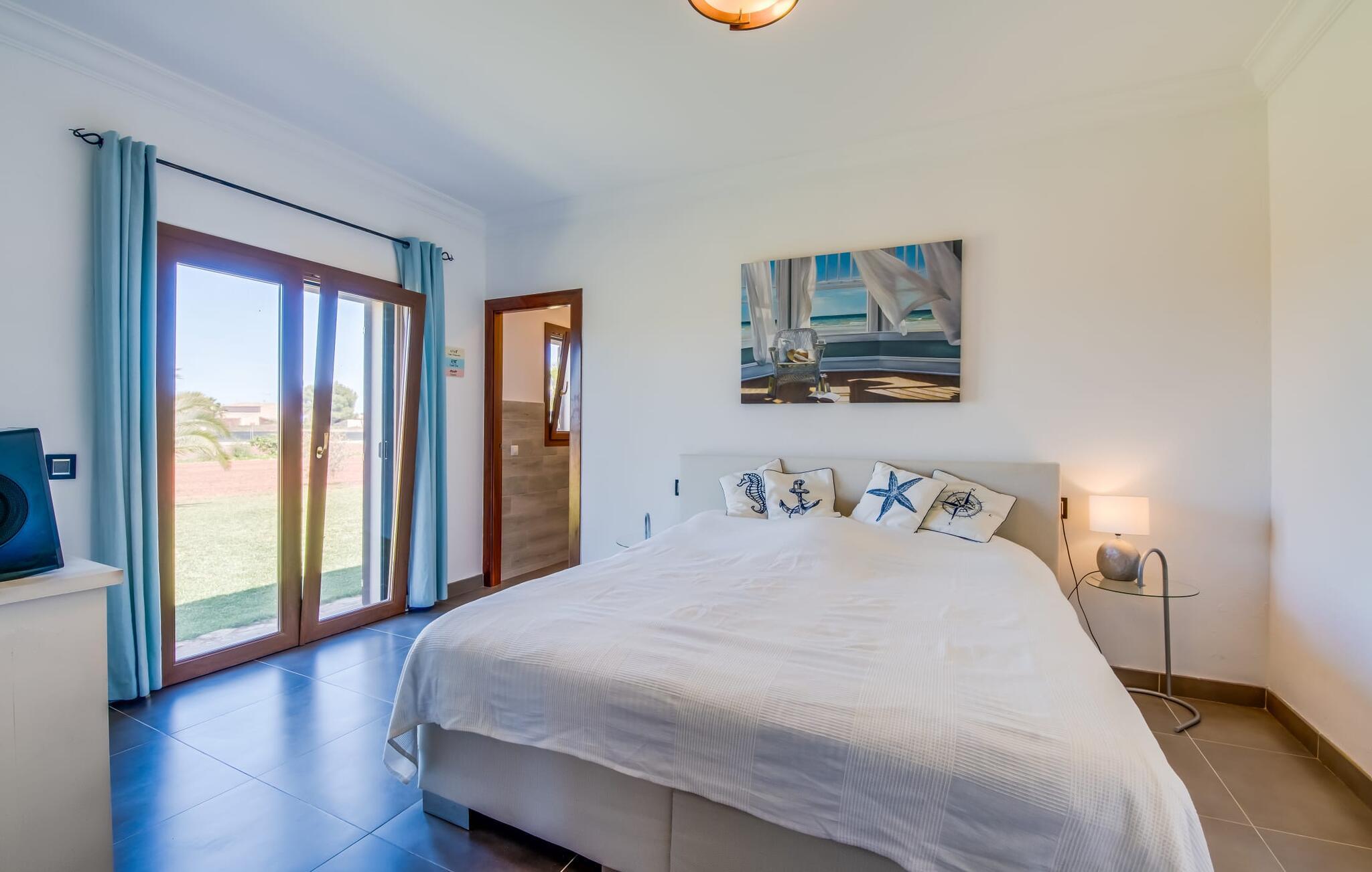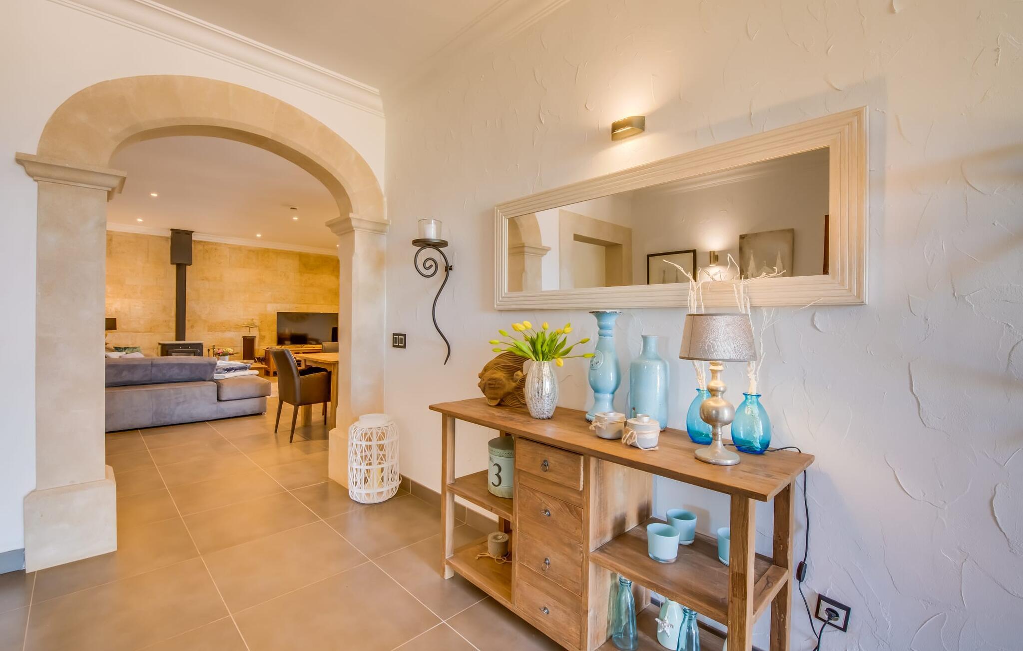 Efter en behagelig køretur på de fuldstændig asfalterede veje når I den gæstfri villa "Sa Rapita". Ejendommen blev udviklet i 2012 (renoveret i 2017!) og bygget i en lav bungalow-stil. Huset og haven, inklusive saltvandsbassinet, vender mod syd. En rummelig græsplæne omgiver den solrige bygning og giver plads nok til, at børn kan lege. Den forfriskende swimmingpool har en bred og behagelig trappe for enden. Unge træer og talrige palmer er spredt ud over det velholdte udendørsområde. Den rummelige L-formede terrasse med udsigt over swimmingpoolen og smukke haver er fuldt overdækket og byder på kølige kurvemøbler af høj kvalitet, der matcher spisepladserne designet i en lignende stil - et ideelt sted at nyde en drink eller selvfølgelig til en afslappet grill tilberedt sammen. Her kan I samtidig slappe af og holde øje med jeres børn, som frit kan færdes i haven. Om aftenen skaber den udendørs pejs en masse hygge. Den hyggelige veranda har adskillige indgange i stueplan til det indre af den trendy villa, hvilket sikrer et lysfyldt interiør. Dette giver jer mulighed for at få en problemfri overgang mellem indendørs og udendørs ophold. Lige bag den rummelige terrasse ligger den enorme opholds- og spisestue med en yderst indbydende sofa foran den gennemsigtige pejs, som skaber en særlig rustik stemning foran den rustikke stenmur. Derudover er de nænsomt strukturerede vægge holdt i lys hvid, og der er indbyggede spots i loftet, som danner en særlig æstetisk kontrast til de store grå gulvfliser. Spisepladsen med træbord og komfortable polstrede stole matcher den stilfulde indretning. Men den mallorcanske byggetradition er også hædret, for dørbuerne, der fører til de øvrige rum, er beklædt med sandsten. Det separate køkken er fuldt udstyret og behageligt stort, der er endda plads til endnu en attraktiv spiseplads. Da en ydervæg blev erstattet af et stort vindue, kommer der ekstra lys ind i rummet præcis dér, og rummet har også direkte adgang til det fri. Eksklusivt indrettet med hvide og vanilje monterede køkkenelementer sat op mod en elegant stenmur, køkkenet er imponerende og komfortabelt udstyret, hvilket er præcis, hvad I forestiller jer, når I vælger selvforplejning, og kvaliteten kunne næsten ikke være bedre. Tre rummelige, individuelt designede soveværelser, hver med en standard king-size seng til en afslappende nats søvn; En barneseng er tilgængelig til en baby. Der er tre absolut smarte badeværelser, designet med elegante fliser og armaturer. De har alle et brusekabine, og der er også et badeværelse med et stort badekar og et bidet. Den sydlige del af Mallorca er kendetegnet på den ene side af en behagelig og afslappende rustik atmosfære, og på den anden side af dens nærhed til kysten, hvilket gør klimaet i denne region særligt behageligt. Navnet på det charmerende landsted "Sa Rapita" er en hyldest til landsbyen af samme navn. På grund af nærheden til den hørbare vej, der fører fra Campos til SaRapita, er det muligt at nå kystbyen og dens fantastiske restauranter på få minutter. I kan også nå Campos lige så hurtigt, hvor shopping er fremragende. Den centrale beliggenhed giver mulighed for hurtige ture til de populære strande på sydkysten, herunder den 300 m lange Ses Covetes strand med dens upåklagelige infrastruktur. Den naturlige bugt "Es Trenc" med sine omfattende klitter, azurblå vand, store bølger og smukke, brede sandstrand kaldes med rette for den baleariske øs Caribien - i øvrigt er det også et ideelt rejsemål for nudistfans. Afslut dagen med en afslappet grillmad og et glas vin lagret under den mallorcanske sol i den charmerende villa "Sa Rapita" - personalet på Fincallorca ønsker jer og jeres familie og venner en afslappende tid i dette stærkt anbefalede feriehus. "Sa Rapita" er en ny og meget indbydende villa i det smukke landskab tæt på byen, som ligger kun en kort køretur væk. Der kan I handle på markedet eller i supermarkederne om onsdagen. For længere shoppingture er den berømte lædermetropol Campos kun 10 minutter væk. De smukke naturlige strande i syd som Ses Covetes eller Es Trenc er kun ca. 1.400 meter væk fra fincaen. Bemærk venligst, at denne ejendom ikke accepterer ungdomsgrupper eller polterabender. En ungdomsgruppe på denne ejendom består af personer på 25 år eller derunder. Book ikke denne ejendom, hvis I er en ungdomsgruppe eller en polterabendgruppe, da jeres reservation vil blive afvist, når den er booket, hvilket også kan være tilfældet ved ankomst til ejendommen eller under jeres ophold, og I vil ikke modtage en refusion.