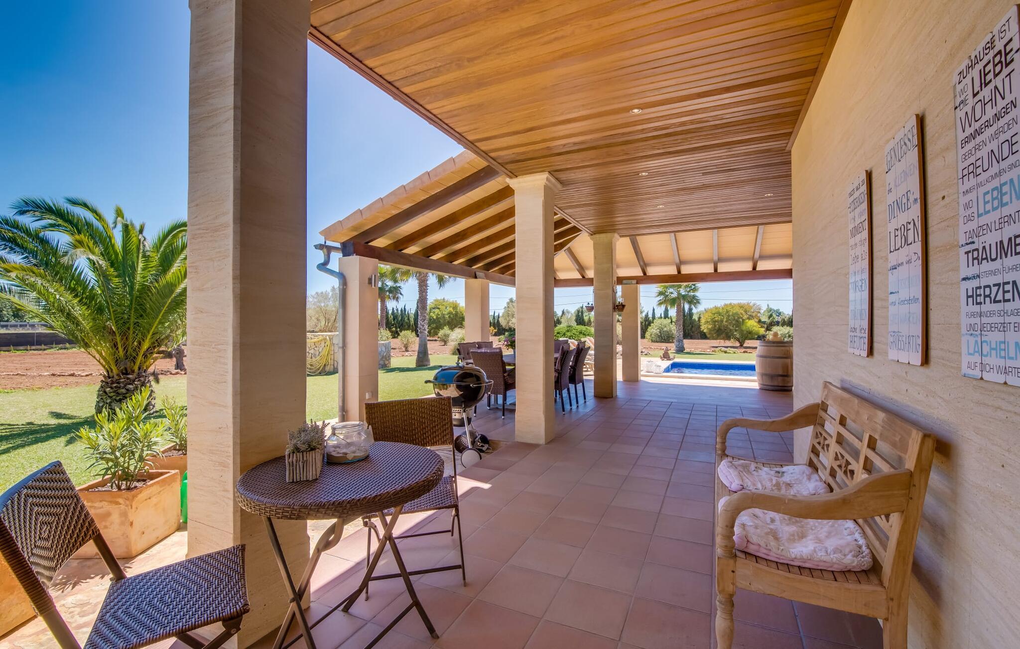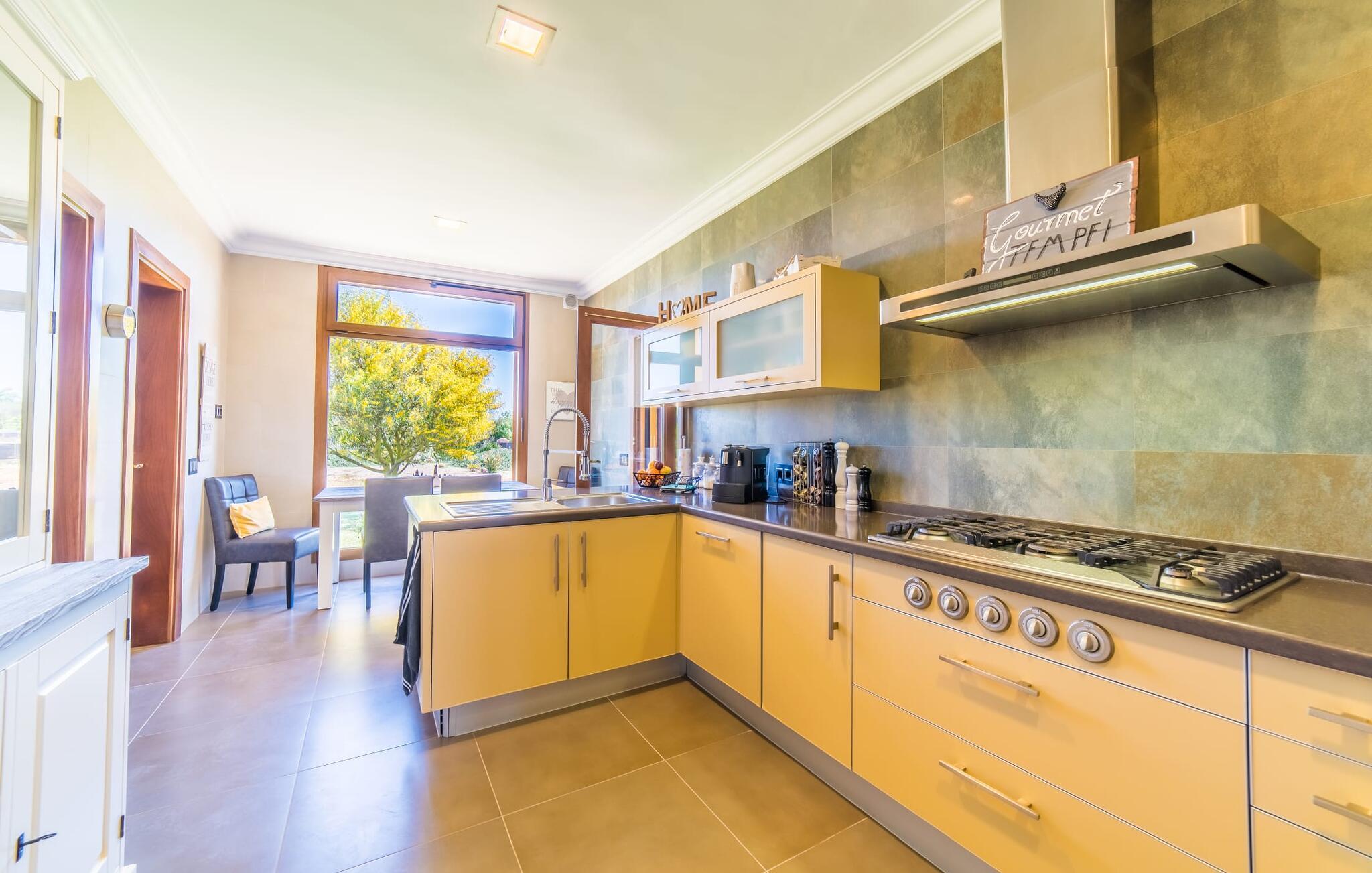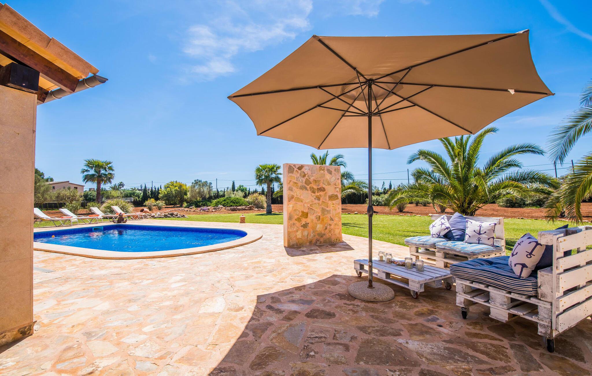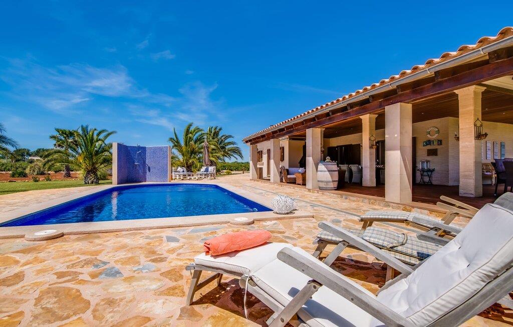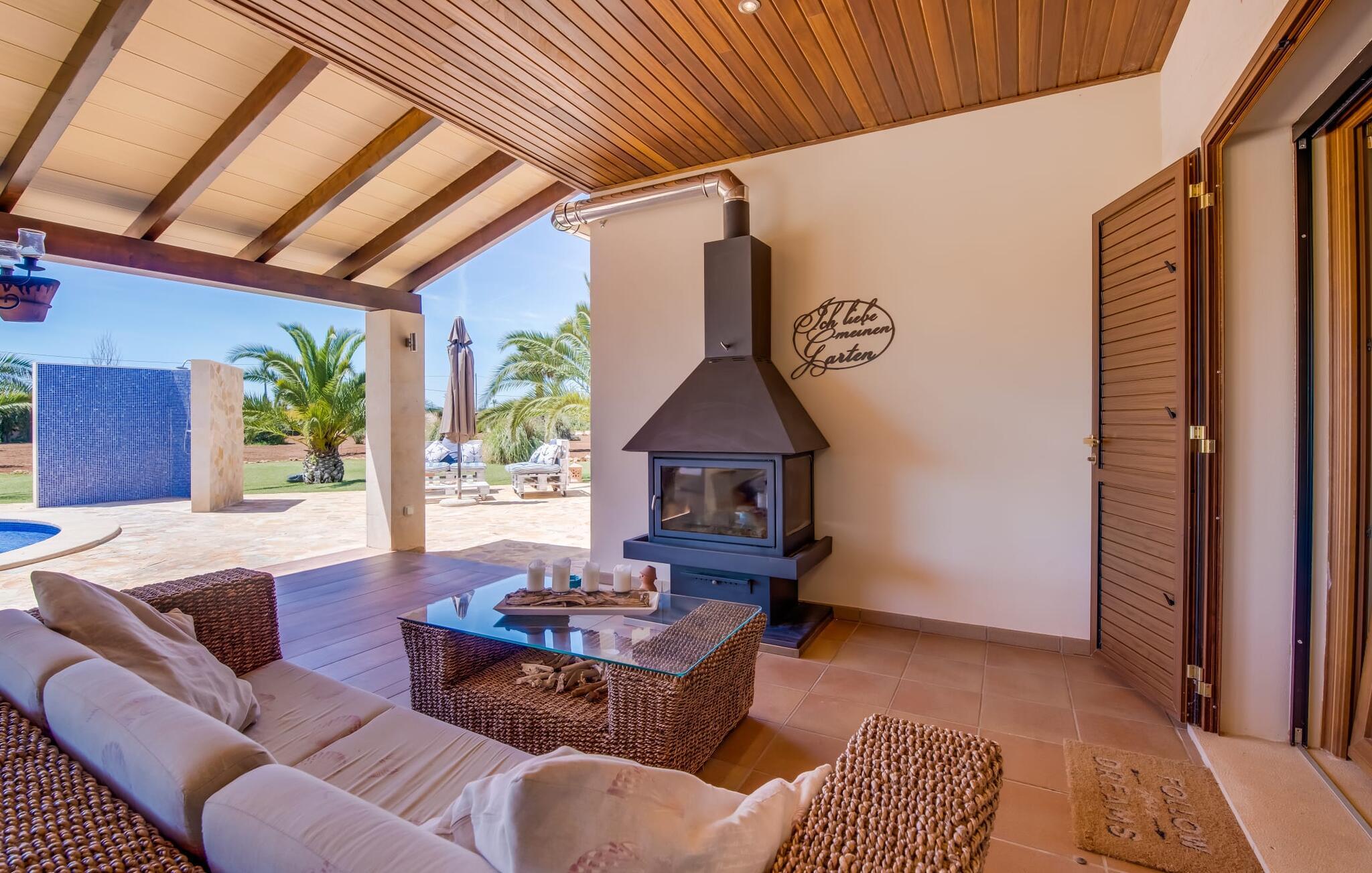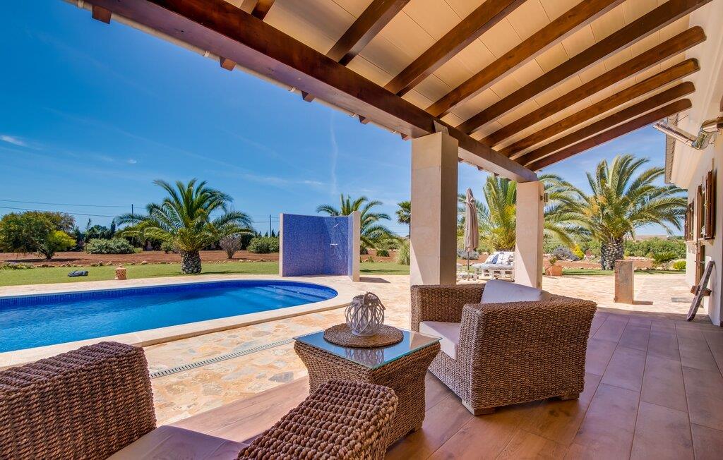 Efter en behagelig køretur på de fuldstændig asfalterede veje når I den gæstfri villa "Sa Rapita". Ejendommen blev udviklet i 2012 (renoveret i 2017!) og bygget i en lav bungalow-stil. Huset og haven, inklusive saltvandsbassinet, vender mod syd. En rummelig græsplæne omgiver den solrige bygning og giver plads nok til, at børn kan lege. Den forfriskende swimmingpool har en bred og behagelig trappe for enden. Unge træer og talrige palmer er spredt ud over det velholdte udendørsområde. Den rummelige L-formede terrasse med udsigt over swimmingpoolen og smukke haver er fuldt overdækket og byder på kølige kurvemøbler af høj kvalitet, der matcher spisepladserne designet i en lignende stil - et ideelt sted at nyde en drink eller selvfølgelig til en afslappet grill tilberedt sammen. Her kan I samtidig slappe af og holde øje med jeres børn, som frit kan færdes i haven. Om aftenen skaber den udendørs pejs en masse hygge. Den hyggelige veranda har adskillige indgange i stueplan til det indre af den trendy villa, hvilket sikrer et lysfyldt interiør. Dette giver jer mulighed for at få en problemfri overgang mellem indendørs og udendørs ophold. Lige bag den rummelige terrasse ligger den enorme opholds- og spisestue med en yderst indbydende sofa foran den gennemsigtige pejs, som skaber en særlig rustik stemning foran den rustikke stenmur. Derudover er de nænsomt strukturerede vægge holdt i lys hvid, og der er indbyggede spots i loftet, som danner en særlig æstetisk kontrast til de store grå gulvfliser. Spisepladsen med træbord og komfortable polstrede stole matcher den stilfulde indretning. Men den mallorcanske byggetradition er også hædret, for dørbuerne, der fører til de øvrige rum, er beklædt med sandsten. Det separate køkken er fuldt udstyret og behageligt stort, der er endda plads til endnu en attraktiv spiseplads. Da en ydervæg blev erstattet af et stort vindue, kommer der ekstra lys ind i rummet præcis dér, og rummet har også direkte adgang til det fri. Eksklusivt indrettet med hvide og vanilje monterede køkkenelementer sat op mod en elegant stenmur, køkkenet er imponerende og komfortabelt udstyret, hvilket er præcis, hvad I forestiller jer, når I vælger selvforplejning, og kvaliteten kunne næsten ikke være bedre. Tre rummelige, individuelt designede soveværelser, hver med en standard king-size seng til en afslappende nats søvn; En barneseng er tilgængelig til en baby. Der er tre absolut smarte badeværelser, designet med elegante fliser og armaturer. De har alle et brusekabine, og der er også et badeværelse med et stort badekar og et bidet. Den sydlige del af Mallorca er kendetegnet på den ene side af en behagelig og afslappende rustik atmosfære, og på den anden side af dens nærhed til kysten, hvilket gør klimaet i denne region særligt behageligt. Navnet på det charmerende landsted "Sa Rapita" er en hyldest til landsbyen af samme navn. På grund af nærheden til den hørbare vej, der fører fra Campos til SaRapita, er det muligt at nå kystbyen og dens fantastiske restauranter på få minutter. I kan også nå Campos lige så hurtigt, hvor shopping er fremragende. Den centrale beliggenhed giver mulighed for hurtige ture til de populære strande på sydkysten, herunder den 300 m lange Ses Covetes strand med dens upåklagelige infrastruktur. Den naturlige bugt "Es Trenc" med sine omfattende klitter, azurblå vand, store bølger og smukke, brede sandstrand kaldes med rette for den baleariske øs Caribien - i øvrigt er det også et ideelt rejsemål for nudistfans. Afslut dagen med en afslappet grillmad og et glas vin lagret under den mallorcanske sol i den charmerende villa "Sa Rapita" - personalet på Fincallorca ønsker jer og jeres familie og venner en afslappende tid i dette stærkt anbefalede feriehus. "Sa Rapita" er en ny og meget indbydende villa i det smukke landskab tæt på byen, som ligger kun en kort køretur væk. Der kan I handle på markedet eller i supermarkederne om onsdagen. For længere shoppingture er den berømte lædermetropol Campos kun 10 minutter væk. De smukke naturlige strande i syd som Ses Covetes eller Es Trenc er kun ca. 1.400 meter væk fra fincaen. Bemærk venligst, at denne ejendom ikke accepterer ungdomsgrupper eller polterabender. En ungdomsgruppe på denne ejendom består af personer på 25 år eller derunder. Book ikke denne ejendom, hvis I er en ungdomsgruppe eller en polterabendgruppe, da jeres reservation vil blive afvist, når den er booket, hvilket også kan være tilfældet ved ankomst til ejendommen eller under jeres ophold, og I vil ikke modtage en refusion.