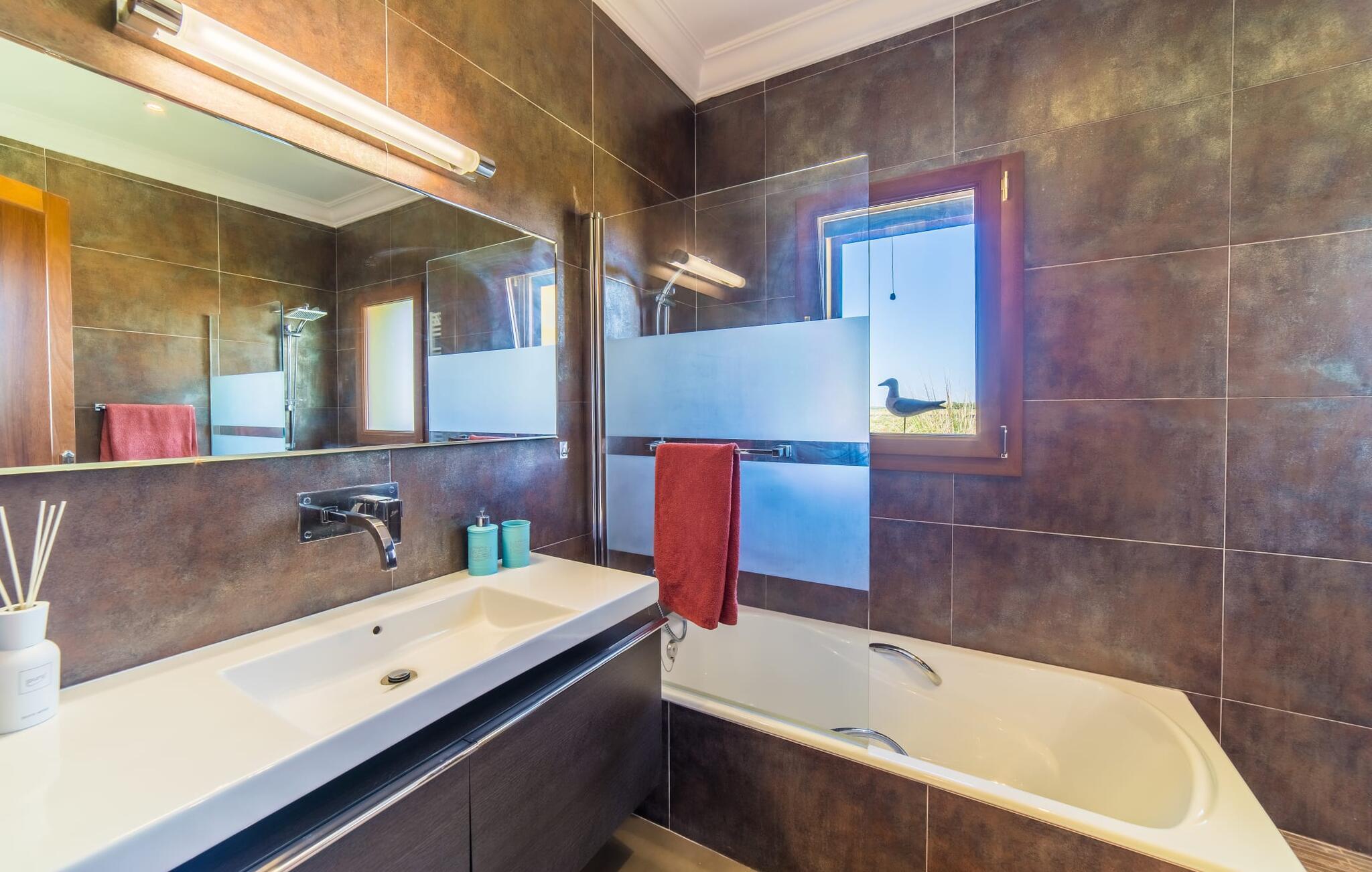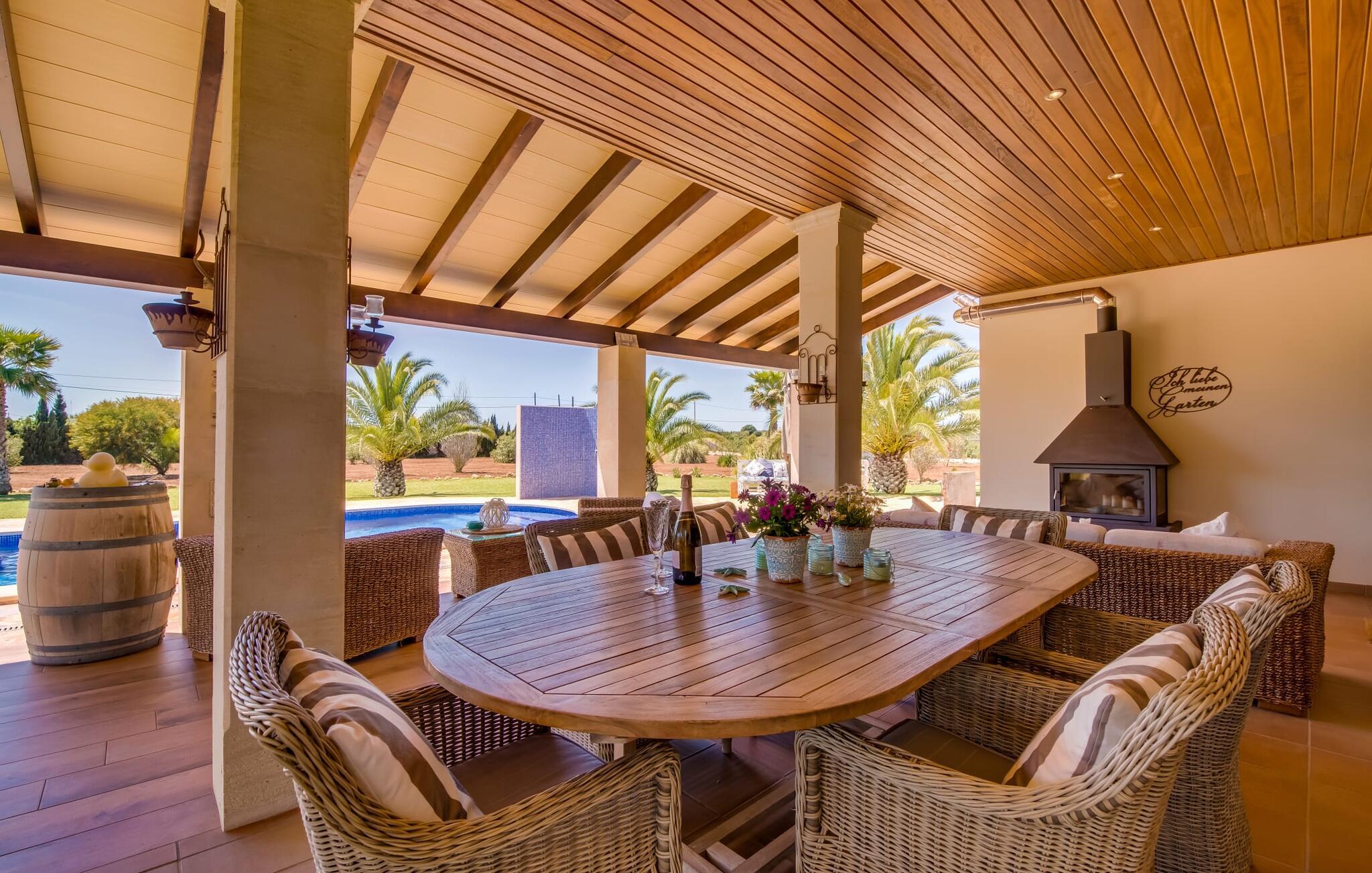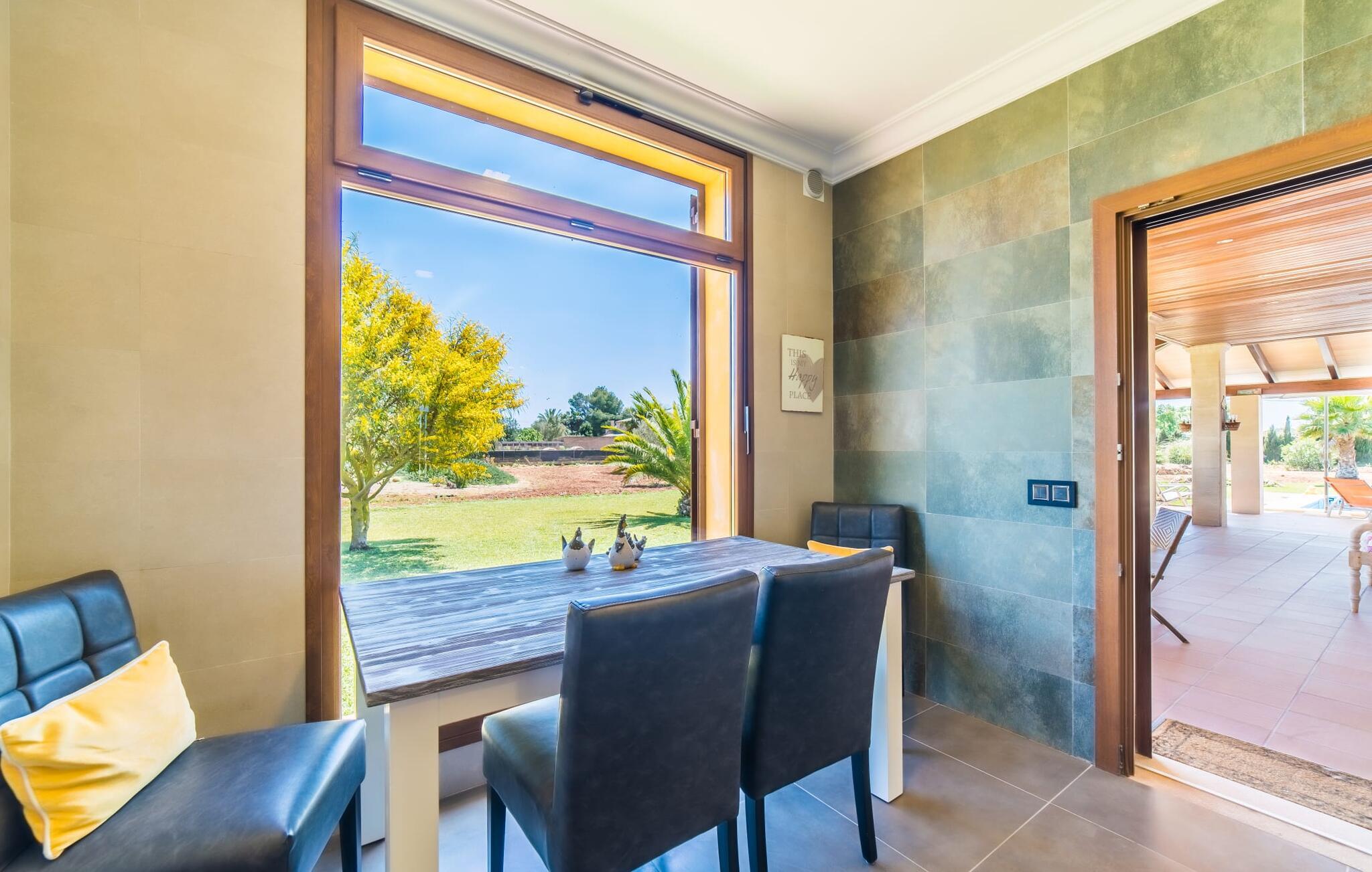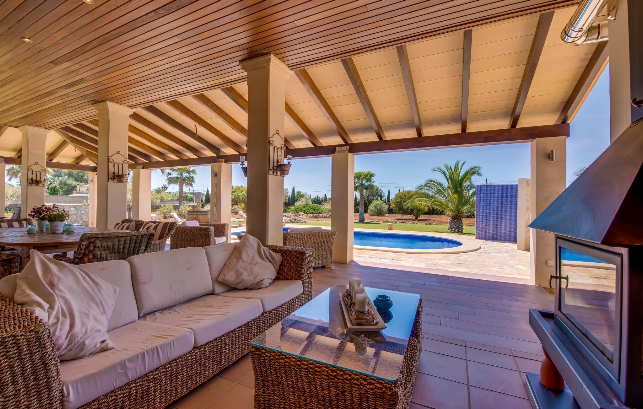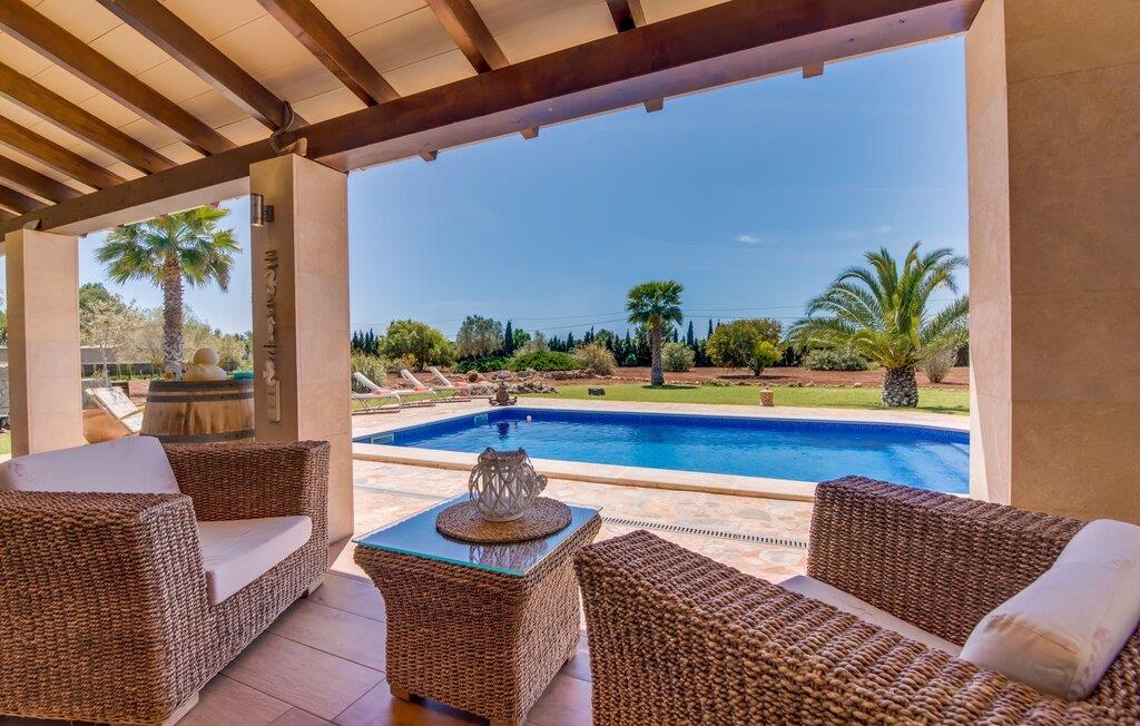 Efter en behagelig køretur på de fuldstændig asfalterede veje når I den gæstfri villa "Sa Rapita". Ejendommen blev udviklet i 2012 (renoveret i 2017!) og bygget i en lav bungalow-stil. Huset og haven, inklusive saltvandsbassinet, vender mod syd. En rummelig græsplæne omgiver den solrige bygning og giver plads nok til, at børn kan lege. Den forfriskende swimmingpool har en bred og behagelig trappe for enden. Unge træer og talrige palmer er spredt ud over det velholdte udendørsområde. Den rummelige L-formede terrasse med udsigt over swimmingpoolen og smukke haver er fuldt overdækket og byder på kølige kurvemøbler af høj kvalitet, der matcher spisepladserne designet i en lignende stil - et ideelt sted at nyde en drink eller selvfølgelig til en afslappet grill tilberedt sammen. Her kan I samtidig slappe af og holde øje med jeres børn, som frit kan færdes i haven. Om aftenen skaber den udendørs pejs en masse hygge. Den hyggelige veranda har adskillige indgange i stueplan til det indre af den trendy villa, hvilket sikrer et lysfyldt interiør. Dette giver jer mulighed for at få en problemfri overgang mellem indendørs og udendørs ophold. Lige bag den rummelige terrasse ligger den enorme opholds- og spisestue med en yderst indbydende sofa foran den gennemsigtige pejs, som skaber en særlig rustik stemning foran den rustikke stenmur. Derudover er de nænsomt strukturerede vægge holdt i lys hvid, og der er indbyggede spots i loftet, som danner en særlig æstetisk kontrast til de store grå gulvfliser. Spisepladsen med træbord og komfortable polstrede stole matcher den stilfulde indretning. Men den mallorcanske byggetradition er også hædret, for dørbuerne, der fører til de øvrige rum, er beklædt med sandsten. Det separate køkken er fuldt udstyret og behageligt stort, der er endda plads til endnu en attraktiv spiseplads. Da en ydervæg blev erstattet af et stort vindue, kommer der ekstra lys ind i rummet præcis dér, og rummet har også direkte adgang til det fri. Eksklusivt indrettet med hvide og vanilje monterede køkkenelementer sat op mod en elegant stenmur, køkkenet er imponerende og komfortabelt udstyret, hvilket er præcis, hvad I forestiller jer, når I vælger selvforplejning, og kvaliteten kunne næsten ikke være bedre. Tre rummelige, individuelt designede soveværelser, hver med en standard king-size seng til en afslappende nats søvn; En barneseng er tilgængelig til en baby. Der er tre absolut smarte badeværelser, designet med elegante fliser og armaturer. De har alle et brusekabine, og der er også et badeværelse med et stort badekar og et bidet. Den sydlige del af Mallorca er kendetegnet på den ene side af en behagelig og afslappende rustik atmosfære, og på den anden side af dens nærhed til kysten, hvilket gør klimaet i denne region særligt behageligt. Navnet på det charmerende landsted "Sa Rapita" er en hyldest til landsbyen af samme navn. På grund af nærheden til den hørbare vej, der fører fra Campos til SaRapita, er det muligt at nå kystbyen og dens fantastiske restauranter på få minutter. I kan også nå Campos lige så hurtigt, hvor shopping er fremragende. Den centrale beliggenhed giver mulighed for hurtige ture til de populære strande på sydkysten, herunder den 300 m lange Ses Covetes strand med dens upåklagelige infrastruktur. Den naturlige bugt "Es Trenc" med sine omfattende klitter, azurblå vand, store bølger og smukke, brede sandstrand kaldes med rette for den baleariske øs Caribien - i øvrigt er det også et ideelt rejsemål for nudistfans. Afslut dagen med en afslappet grillmad og et glas vin lagret under den mallorcanske sol i den charmerende villa "Sa Rapita" - personalet på Fincallorca ønsker jer og jeres familie og venner en afslappende tid i dette stærkt anbefalede feriehus. "Sa Rapita" er en ny og meget indbydende villa i det smukke landskab tæt på byen, som ligger kun en kort køretur væk. Der kan I handle på markedet eller i supermarkederne om onsdagen. For længere shoppingture er den berømte lædermetropol Campos kun 10 minutter væk. De smukke naturlige strande i syd som Ses Covetes eller Es Trenc er kun ca. 1.400 meter væk fra fincaen. Bemærk venligst, at denne ejendom ikke accepterer ungdomsgrupper eller polterabender. En ungdomsgruppe på denne ejendom består af personer på 25 år eller derunder. Book ikke denne ejendom, hvis I er en ungdomsgruppe eller en polterabendgruppe, da jeres reservation vil blive afvist, når den er booket, hvilket også kan være tilfældet ved ankomst til ejendommen eller under jeres ophold, og I vil ikke modtage en refusion.