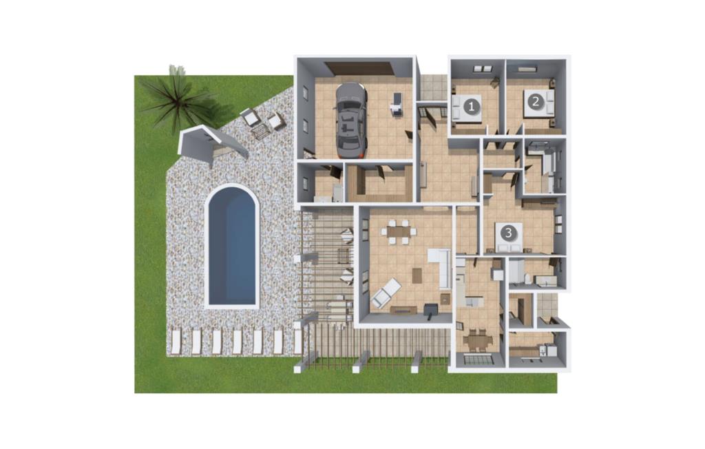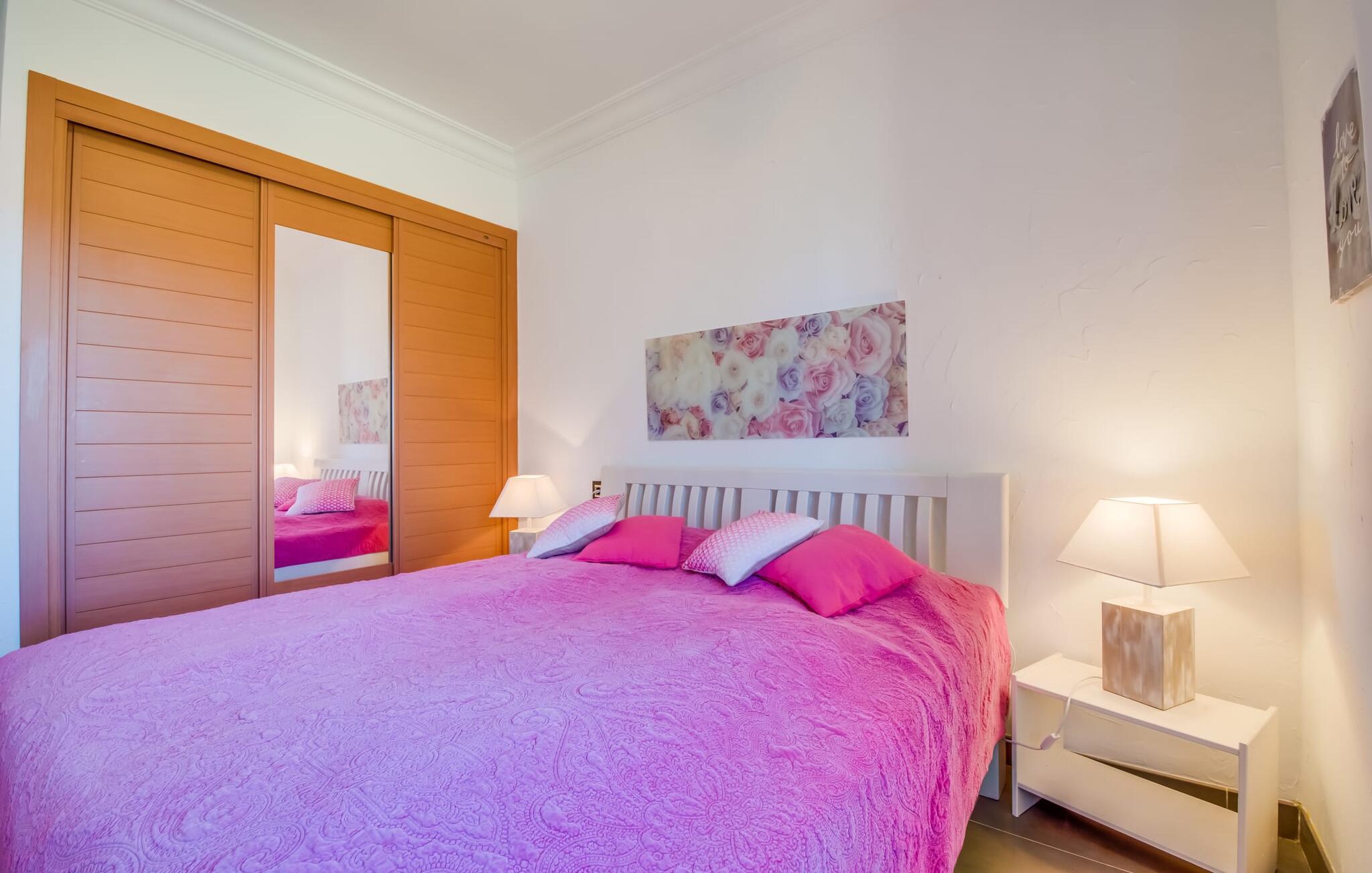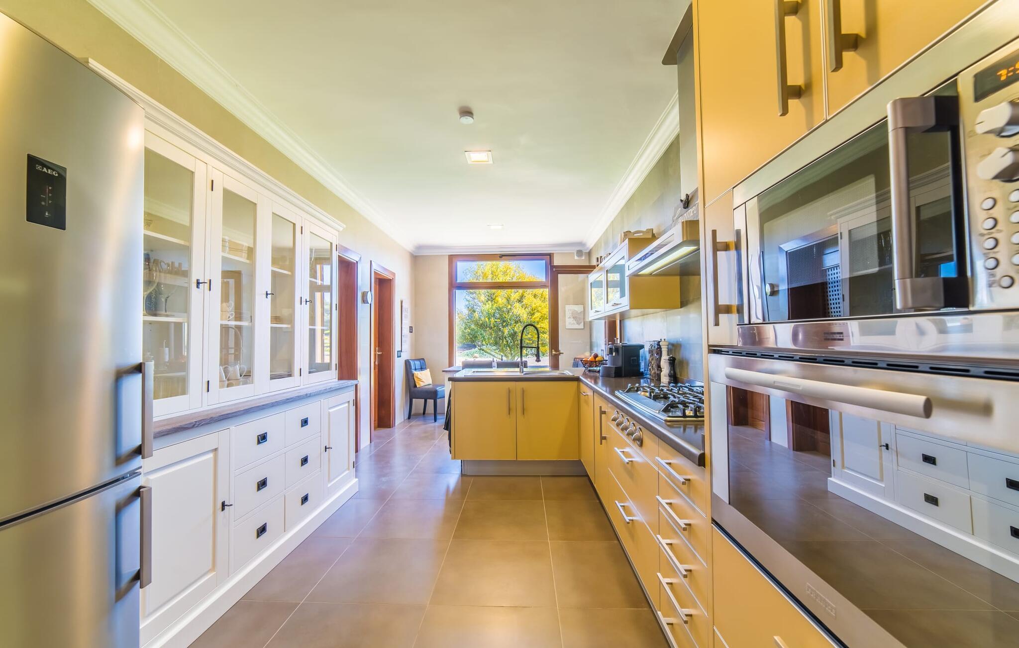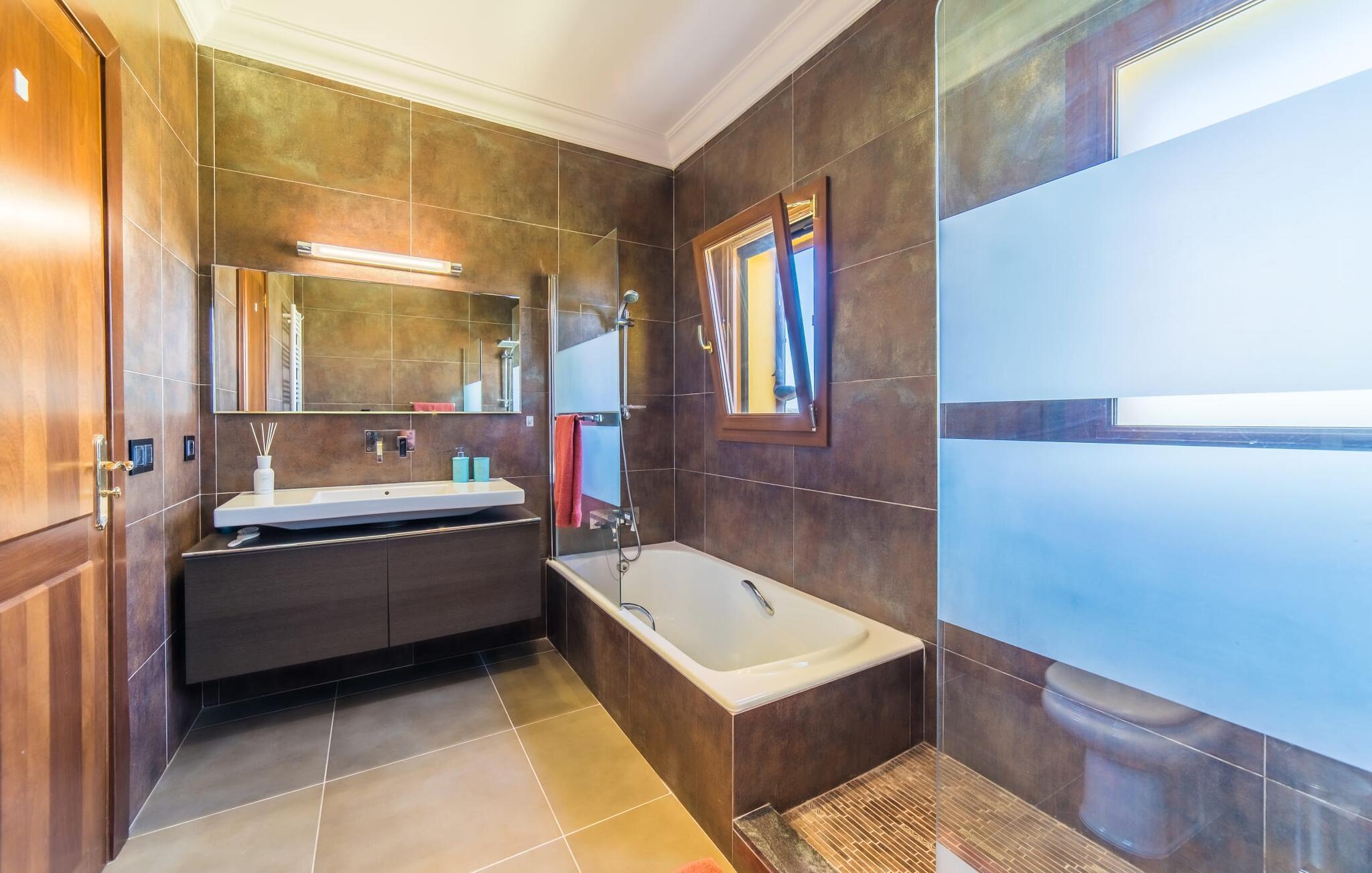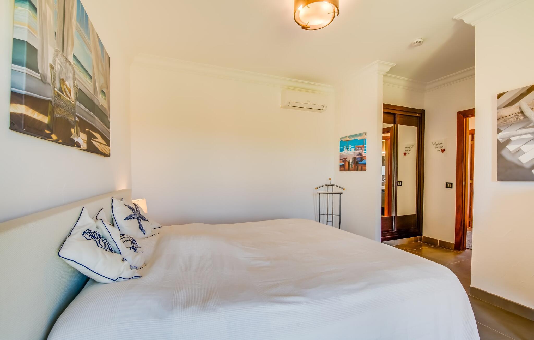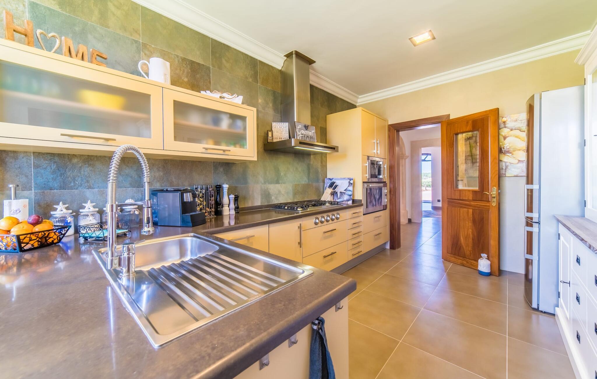 Efter en behagelig køretur på de fuldstændig asfalterede veje når I den gæstfri villa "Sa Rapita". Ejendommen blev udviklet i 2012 (renoveret i 2017!) og bygget i en lav bungalow-stil. Huset og haven, inklusive saltvandsbassinet, vender mod syd. En rummelig græsplæne omgiver den solrige bygning og giver plads nok til, at børn kan lege. Den forfriskende swimmingpool har en bred og behagelig trappe for enden. Unge træer og talrige palmer er spredt ud over det velholdte udendørsområde. Den rummelige L-formede terrasse med udsigt over swimmingpoolen og smukke haver er fuldt overdækket og byder på kølige kurvemøbler af høj kvalitet, der matcher spisepladserne designet i en lignende stil - et ideelt sted at nyde en drink eller selvfølgelig til en afslappet grill tilberedt sammen. Her kan I samtidig slappe af og holde øje med jeres børn, som frit kan færdes i haven. Om aftenen skaber den udendørs pejs en masse hygge. Den hyggelige veranda har adskillige indgange i stueplan til det indre af den trendy villa, hvilket sikrer et lysfyldt interiør. Dette giver jer mulighed for at få en problemfri overgang mellem indendørs og udendørs ophold. Lige bag den rummelige terrasse ligger den enorme opholds- og spisestue med en yderst indbydende sofa foran den gennemsigtige pejs, som skaber en særlig rustik stemning foran den rustikke stenmur. Derudover er de nænsomt strukturerede vægge holdt i lys hvid, og der er indbyggede spots i loftet, som danner en særlig æstetisk kontrast til de store grå gulvfliser. Spisepladsen med træbord og komfortable polstrede stole matcher den stilfulde indretning. Men den mallorcanske byggetradition er også hædret, for dørbuerne, der fører til de øvrige rum, er beklædt med sandsten. Det separate køkken er fuldt udstyret og behageligt stort, der er endda plads til endnu en attraktiv spiseplads. Da en ydervæg blev erstattet af et stort vindue, kommer der ekstra lys ind i rummet præcis dér, og rummet har også direkte adgang til det fri. Eksklusivt indrettet med hvide og vanilje monterede køkkenelementer sat op mod en elegant stenmur, køkkenet er imponerende og komfortabelt udstyret, hvilket er præcis, hvad I forestiller jer, når I vælger selvforplejning, og kvaliteten kunne næsten ikke være bedre. Tre rummelige, individuelt designede soveværelser, hver med en standard king-size seng til en afslappende nats søvn; En barneseng er tilgængelig til en baby. Der er tre absolut smarte badeværelser, designet med elegante fliser og armaturer. De har alle et brusekabine, og der er også et badeværelse med et stort badekar og et bidet. Den sydlige del af Mallorca er kendetegnet på den ene side af en behagelig og afslappende rustik atmosfære, og på den anden side af dens nærhed til kysten, hvilket gør klimaet i denne region særligt behageligt. Navnet på det charmerende landsted "Sa Rapita" er en hyldest til landsbyen af samme navn. På grund af nærheden til den hørbare vej, der fører fra Campos til SaRapita, er det muligt at nå kystbyen og dens fantastiske restauranter på få minutter. I kan også nå Campos lige så hurtigt, hvor shopping er fremragende. Den centrale beliggenhed giver mulighed for hurtige ture til de populære strande på sydkysten, herunder den 300 m lange Ses Covetes strand med dens upåklagelige infrastruktur. Den naturlige bugt "Es Trenc" med sine omfattende klitter, azurblå vand, store bølger og smukke, brede sandstrand kaldes med rette for den baleariske øs Caribien - i øvrigt er det også et ideelt rejsemål for nudistfans. Afslut dagen med en afslappet grillmad og et glas vin lagret under den mallorcanske sol i den charmerende villa "Sa Rapita" - personalet på Fincallorca ønsker jer og jeres familie og venner en afslappende tid i dette stærkt anbefalede feriehus. "Sa Rapita" er en ny og meget indbydende villa i det smukke landskab tæt på byen, som ligger kun en kort køretur væk. Der kan I handle på markedet eller i supermarkederne om onsdagen. For længere shoppingture er den berømte lædermetropol Campos kun 10 minutter væk. De smukke naturlige strande i syd som Ses Covetes eller Es Trenc er kun ca. 1.400 meter væk fra fincaen. Bemærk venligst, at denne ejendom ikke accepterer ungdomsgrupper eller polterabender. En ungdomsgruppe på denne ejendom består af personer på 25 år eller derunder. Book ikke denne ejendom, hvis I er en ungdomsgruppe eller en polterabendgruppe, da jeres reservation vil blive afvist, når den er booket, hvilket også kan være tilfældet ved ankomst til ejendommen eller under jeres ophold, og I vil ikke modtage en refusion.