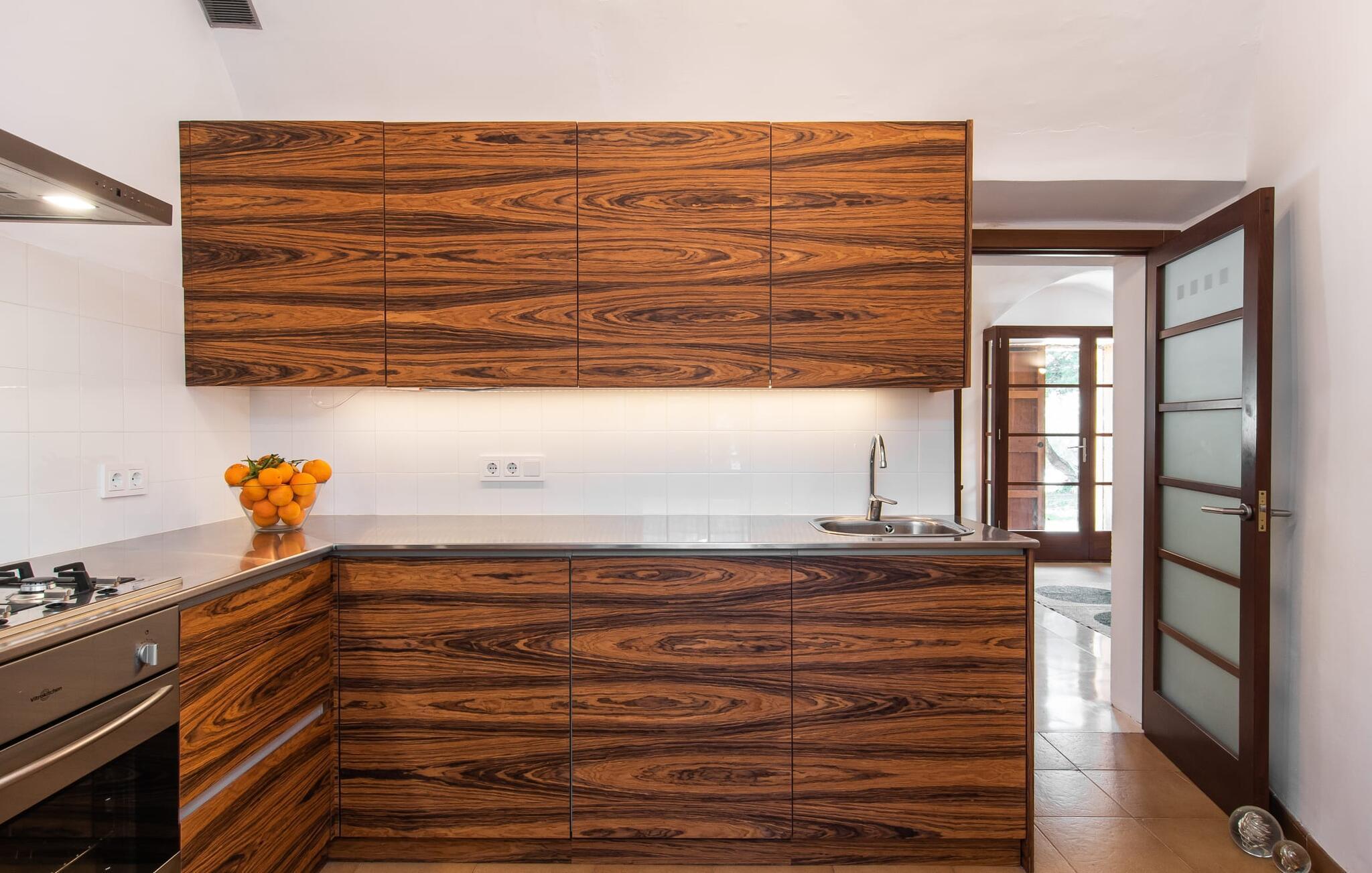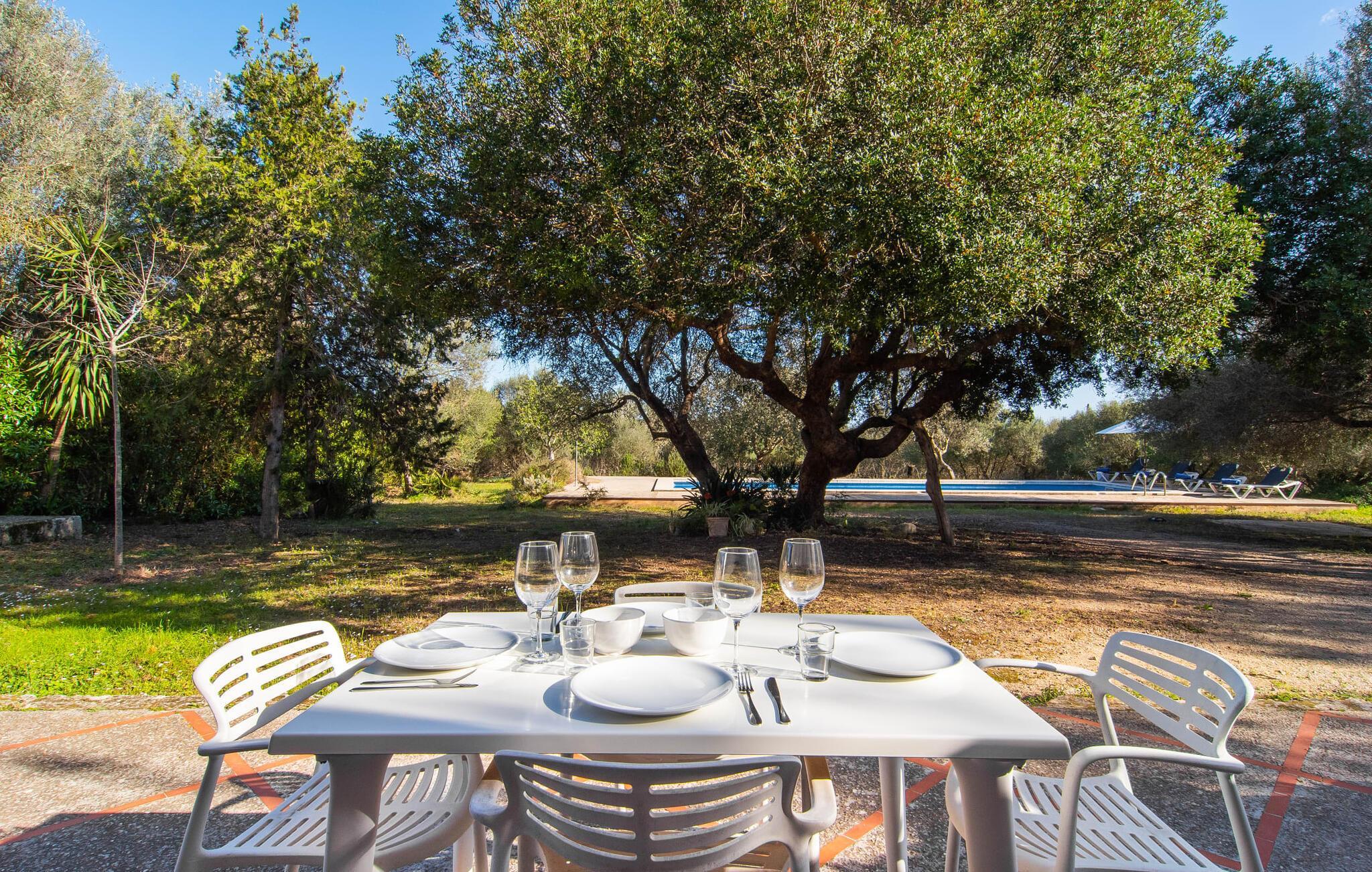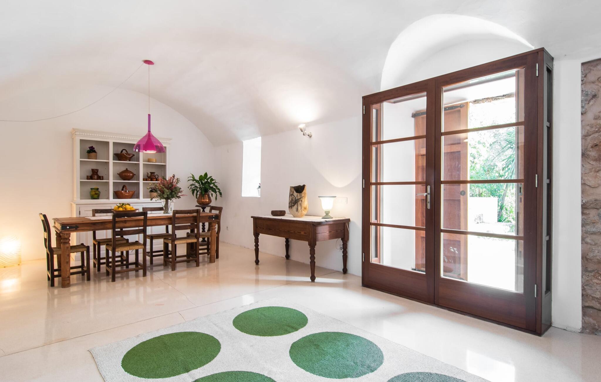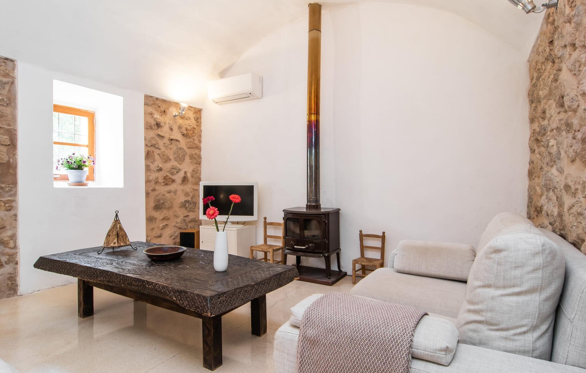 Hvordan forestiller I jer jeres ideelle ferie? Fred og ro? Natur og behageligt klima? Maksimal frihed og individuel rejse? Sport og kultur? Ingen masseturisme, men typisk autenticitet? Romantisk idyl og alligevel tæt på byen? Hvis ja, så vil vi med glæde byde jer og jeres familie velkommen til den ideelle villa "Alfaber". Den gamle, rustikke bygning blev omhyggeligt renoveret af ejerne, med ydermure lavet af stenbrud nænsomt bevaret. Her bor I i et dobbelthus, bevarer jeres privatliv og nyder jeres egen have og pool. Beskyttet af talrige værdige oliventræer og palmer snor sig frodige blomstrende planter rundt om muren. I dette smukke landskab finder I mange attraktive siddepladser med delikate jernborde og stole i træernes naturlige skygge. Følg solen, når den bevæger sig hen over himlen, og find et solrigt eller skyggefuldt sted, der passer bedst til tidspunktet på dagen. Mens I allerede forvarmer grillen, kan børnene stadig svømme i jeres ret store 14 meter store swimmingpool. Når maden er klar, hopper børnene hurtigt ud i udendørsbruseren, og aftensmaden kan serveres. Når I er færdig, er det måske det rigtige tidspunkt for en fodboldturnering sammen. Når de yngre gæster allerede er i seng, kan I nyde den dyrebare tid for to i landlig fred og ro med et glas god mallorcansk rødvin. Og når jeres aften langsomt slutter, så træd ind i det overraskende moderne interiør i den smukke villa. Et smukt åbent område med hvælvet loft og det fritlagte murværk afslører alderen på det totalrenoverede hus. Hvælvingen er malet lys hvid, og det funktionelle område forbinder opholds- og spiseafdelingen. Opholdsstuen har pejs, moderne fladskærms-tv og lyse sofaer. På den anden side af rummet er en spisestue med møbler i vintage-stil. En typisk spansk gyngestol og en topmoderne designerlampe understreger det overordnede vellykkede samspil mellem modernitet og tradition, som kan mærkes i hvert hjørne af huset. For eksempel i det fuldt udstyrede køkken, som samtidig er reduceret til det væsentlige. Dette hjem kræver ikke et køkken af høj kvalitet for at give jer den funktionalitet, I har brug for til en afslappende ferie. Det enkelt indrettede køkken byder på opvaskemaskine, stort køle-fryseskab, gaskomfur, kaffemaskine og meget mere. En lille passage fører til det store soveværelse i maisonette-stil. I det uformelle nederste område er der to enkeltsenge til børn. En metaltrappe med trætrin fører til galleriet, hvor der er et mastersoveområde med en king-size seng og et smukt skriveområde. Også her vil I blive overrasket over den spændende kombination af moderne og antikke elementer med et lidt alternativt præg. Takket være den åbne sovefløj er huset ideelt til en familie på fire, men også attraktivt for et par, der ikke ønsker at blive begrænset af pladsen. Apropos tiltrækningskraft: Det er essensen af denne region omkring den charmerende lille by Sant Llorenc - idylliske landskaber og meget god infrastruktur er karakteristiske træk ved den nordøstlige del af øen. I en by kun 1 km væk kan I gøre jeres daglige indkøb i supermarkederne, købe friskbagt varer fra bageriet og afslutte denne morgenudflugt med en "hurtig" Café Cortado i en af de caféer, der er populære blandt de lokale. Denne lille by ligger cirka halvvejs mellem Manacor og Artà - begge landsbyer er omkring 10 km væk. I den maleriske by Artà er der et smukt marked om tirsdagen, hvor I kan købe mallorcanske specialiteter og friske produkter til jeres grillaften eller bare nyde senere i det hyggelige opholdsområde efter jeres individuelle valg i denne smukke villa. Udover familievenlige bademuligheder byder de smukke lokale strande også på talrige vandsportsaktiviteter, som udover muligheden for cykel- og vandreture også kunne appellere til jer som sportsentusiast eller par. Valget er op til jer - og I træffer et godt valg, fordi I har booket villaen "Alfaber". Den fortryllende villa "Alfaber" er den perfekte destination for en familie med to børn, der drømmer om en afslappende ferie i et typisk mallorcansk landsted med en meget stor pool og en uberørt have. Denne moderne villa har en rolig beliggenhed nær boligområdet Sant Llorenc, hvor I finder forskellige indkøbsmuligheder samt caféer og restauranter. Der er smukke sandstrande, herunder Cala Bona eller Costa de los Pinos, omkring 10 km væk.