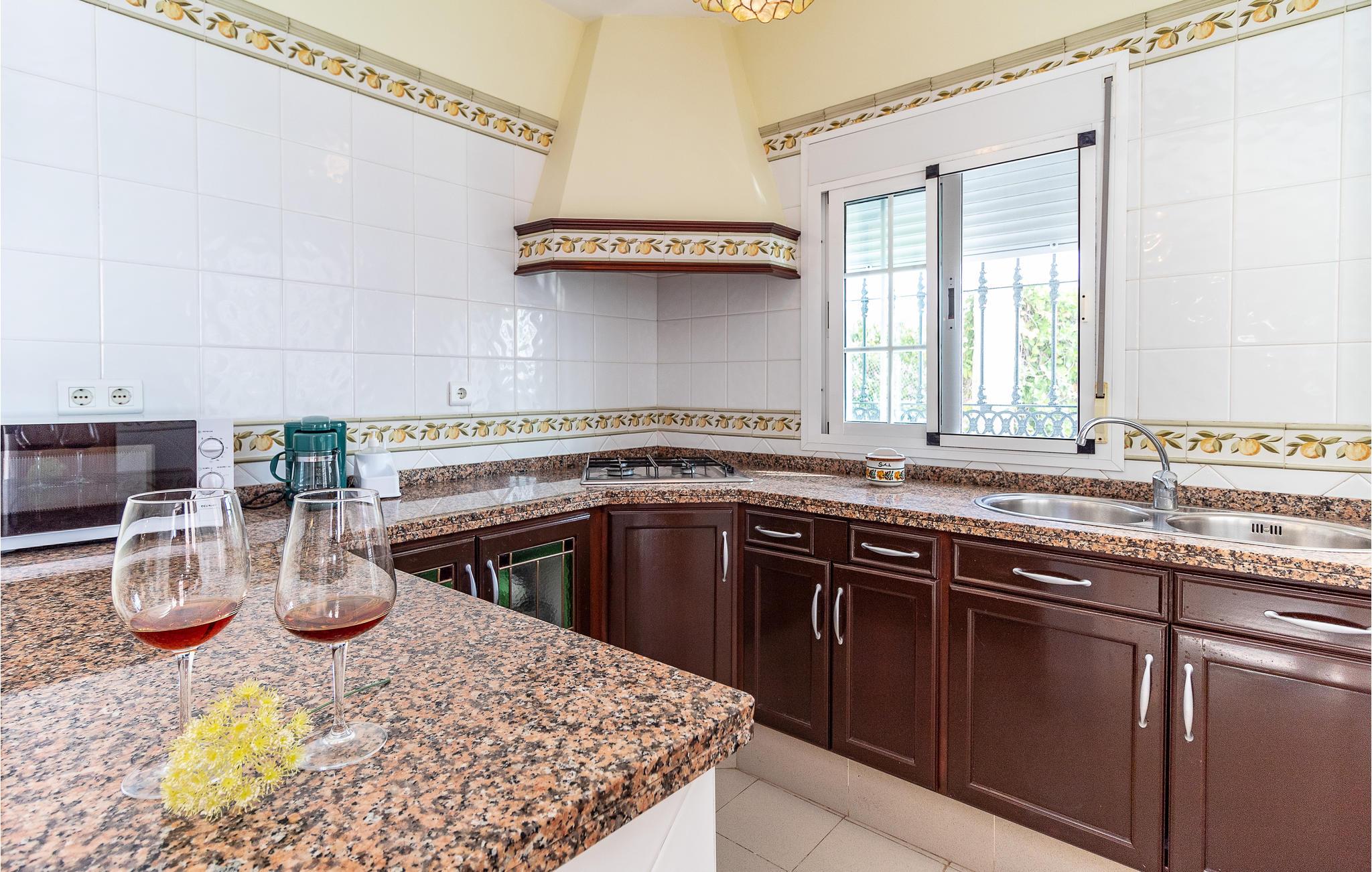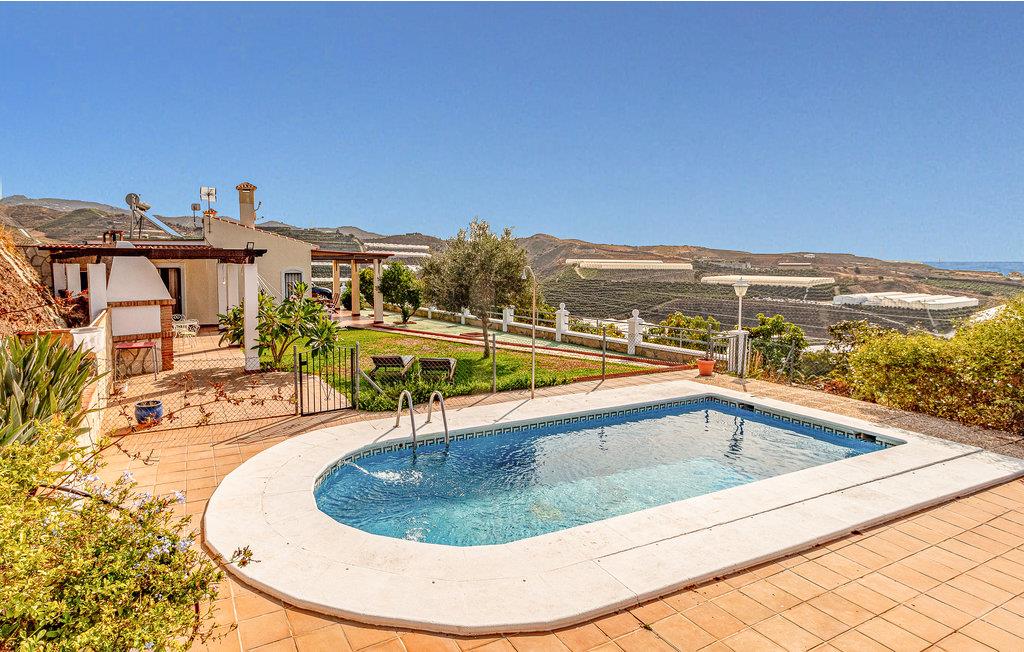 Komfortabelt og skønt feriehus ikke langt fra Algarrobo Costa, Vélez-Málaga. Huset rummer en stue med kamin, stuen er i åben forbindelse med køkkenet, badeværelse med whirlpool og to soveværelser – her er plads til op til fire feriegæster. Fra den smukke terrasse og fra jeres lækre udendørs private pool, er der en spektakulær udsigt ud over kysten og den blinkende blågrønne Middelhav. Dette feriehus ligger ca. en km fra stranden i Lagos, med mange bondegårde og fiskere som har en rolig og familiær atmosfære. En region, der hører under Vélez-Málaga og ligger lige i nærheden af Algarrobo Costa ved det østlige Costa del Sol. Ca. 1,2 km fra huset er vejen ikke asfaltereret og forløbet parallelt med flodsengen med Lagosfloden. De sidste 75 m er op ad bakke, men kan nemt befærdes i bil. Tag gerne et husdyr med.