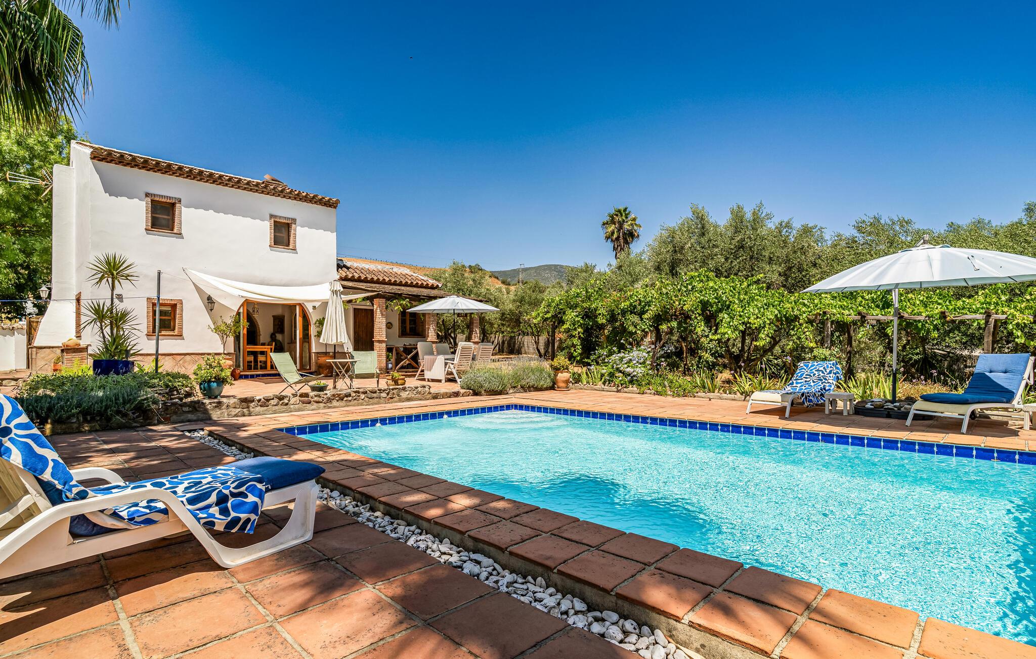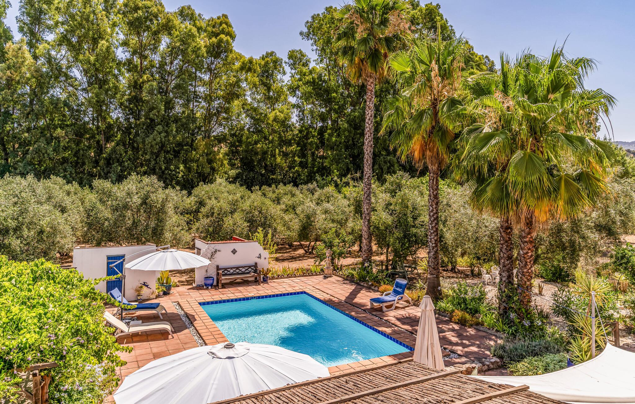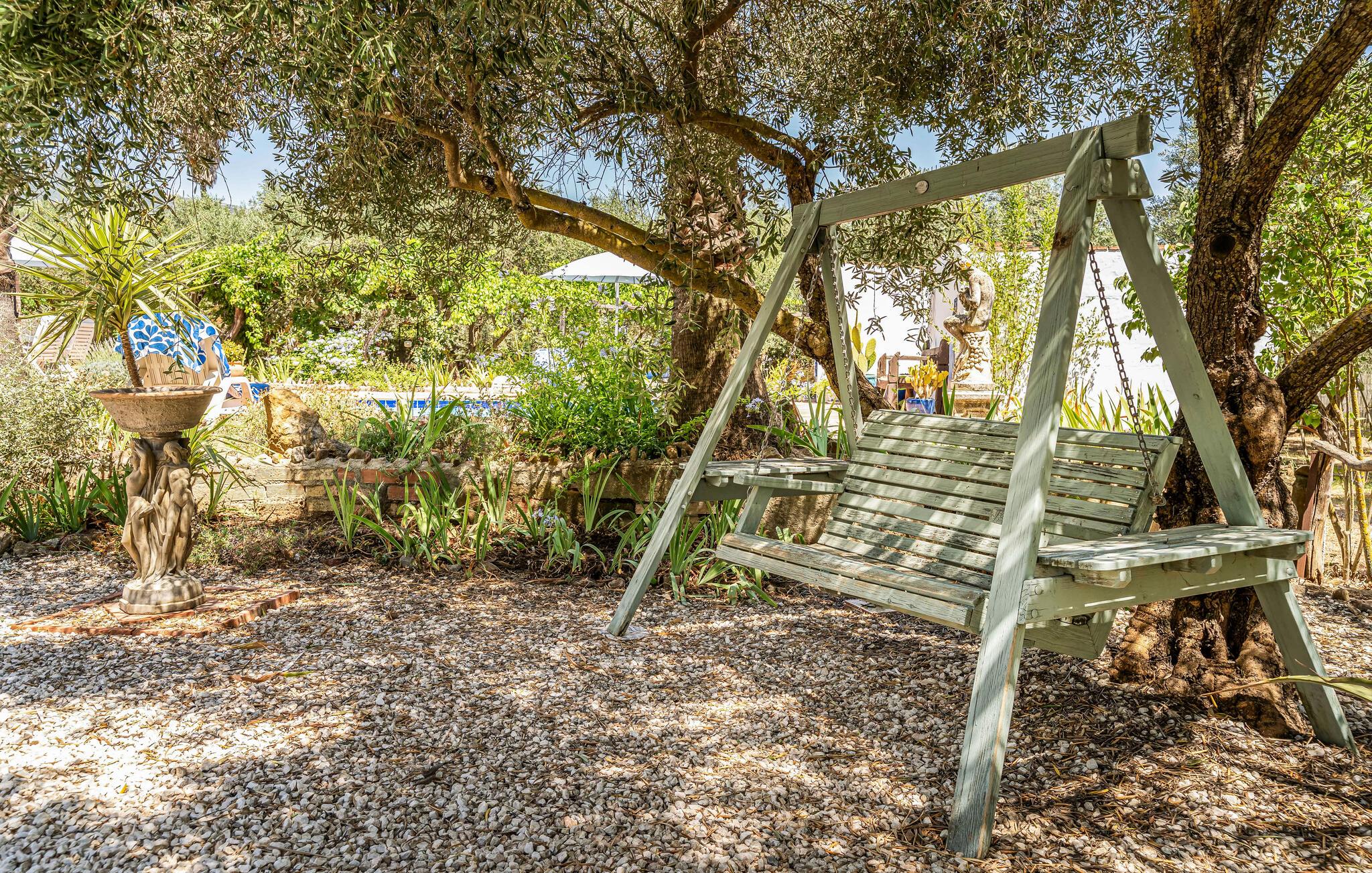 Nyd en betagende udsigt fra dette komfortable feriehus med pool. Dette indbydende hus byder jer velkommen til en fantastisk beliggenhed midt i malerisk landskab. I værelserne, med smukke klinkegulve og synlige loftsbjælker, og møbleret i moderne landlig stil, kan I virkelig nyde jeres tid sammen. Vågn op til udsigt over landskabet og glæd jer til hyggelige aftener ved pejsen. Tilbring dejlige timer på terrassen, solbad, læs i skyggen og forfrisk jer i poolen. Nyd lune sommeraftener med kolde drikke udendørs mod en magisk baggrund. Tag en slentretur gennem den hvide landsby, nyd duften af appelsinblomster, og nyd friskbagt kage på en af de traditionelle caféer. Bestig de omkringliggende bjerge på en guidet vandretur eller udforsk området på cykel; den panoramaudsigt over olivenlunde og kalkstensklipper vil forbløffe jer.
