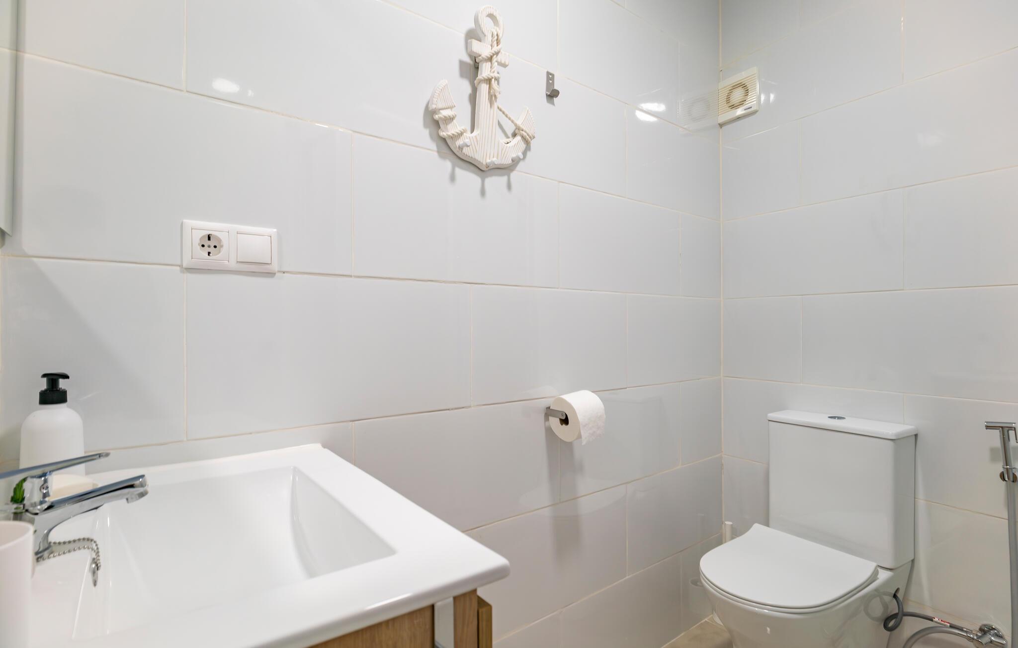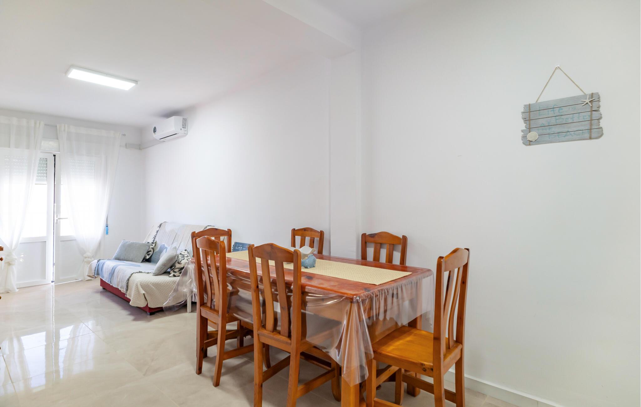 Jeres komfortable lejlighed tilbyder jer en fantastisk ramme for en ferie, hvor I kan nyde både strandfornøjelser lige uden for døren samt opleve kultur og gode spisesteder. Den lyse indretning gør lejligheden til jeres rolige oase efter nogle oplevelsesrige feriedage. Planlæg jeres dagsprogram ved morgenbordet, og nyd frisk frugt og grønt, som I har købt i de omkringliggende butikker eller på et spændende marked.