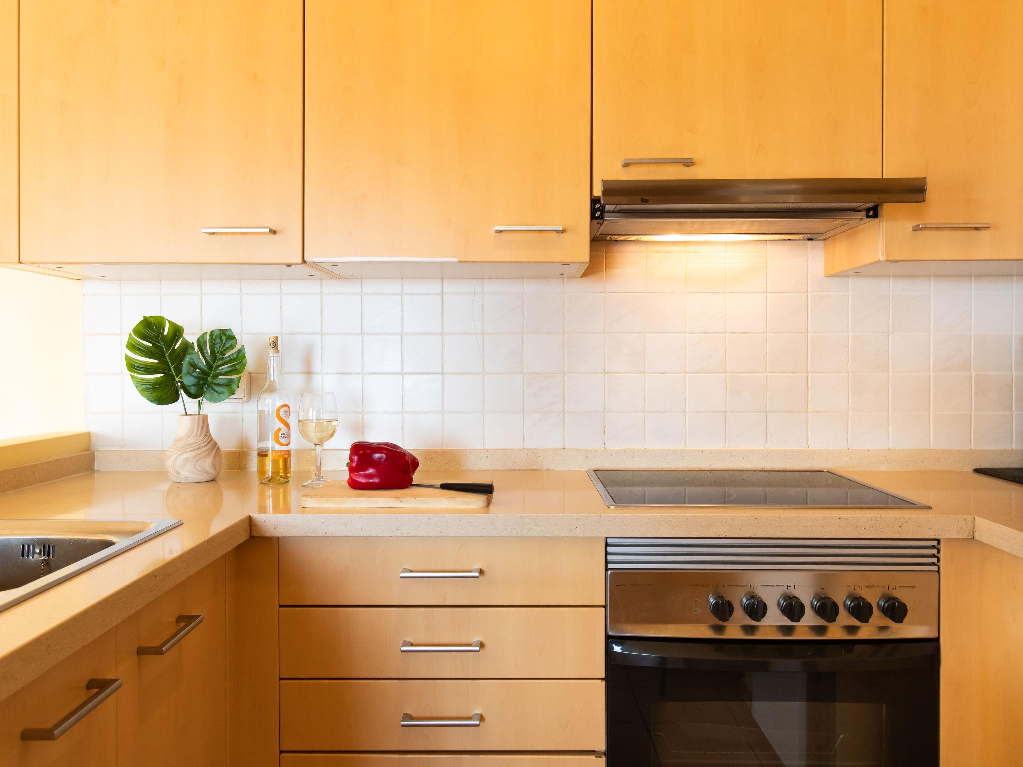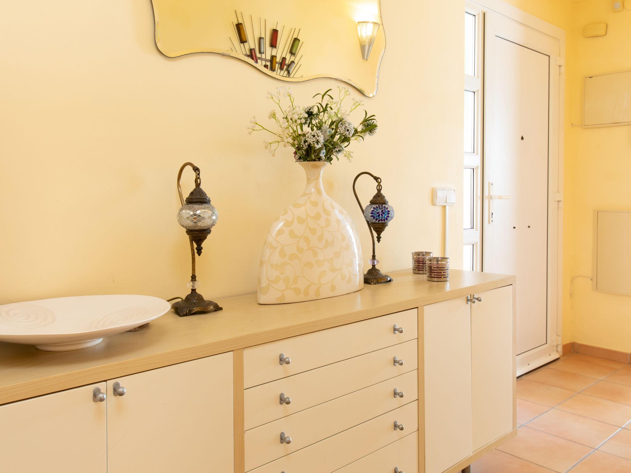 "Belle Vue", 3-room apartment 113 m2 on 1st floor, south facing position. Spacious, practical and comfortable furnishings: living/dining room with digital TV, international TV channels, air conditioning and forced-air heating. Exit to the terrace. 1 room with 2 beds (90 cm, length 200 cm), air conditioning and forced-air heating. 1 room with 1 french bed (160 cm, length 200 cm), air conditioning and forced-air heating. Open kitchen (oven, dishwasher, 4 ceramic glass hob hotplates, toaster, kettle, microwave, freezer). Exit to the terrace. Bath/shower/WC. Large terrace 50 m2. Terrace furniture, barbecue, deck chairs. Panoramic view of the sea and the resort. Facilities: washing machine, iron, children's high chair, baby cot, hair dryer. Internet (WiFi, free). Please note: non-smoking house. VUT/GR/06901 // Reg. Nr.: ESFCTU0000180160005521270000000000000000VUT/GR/069018