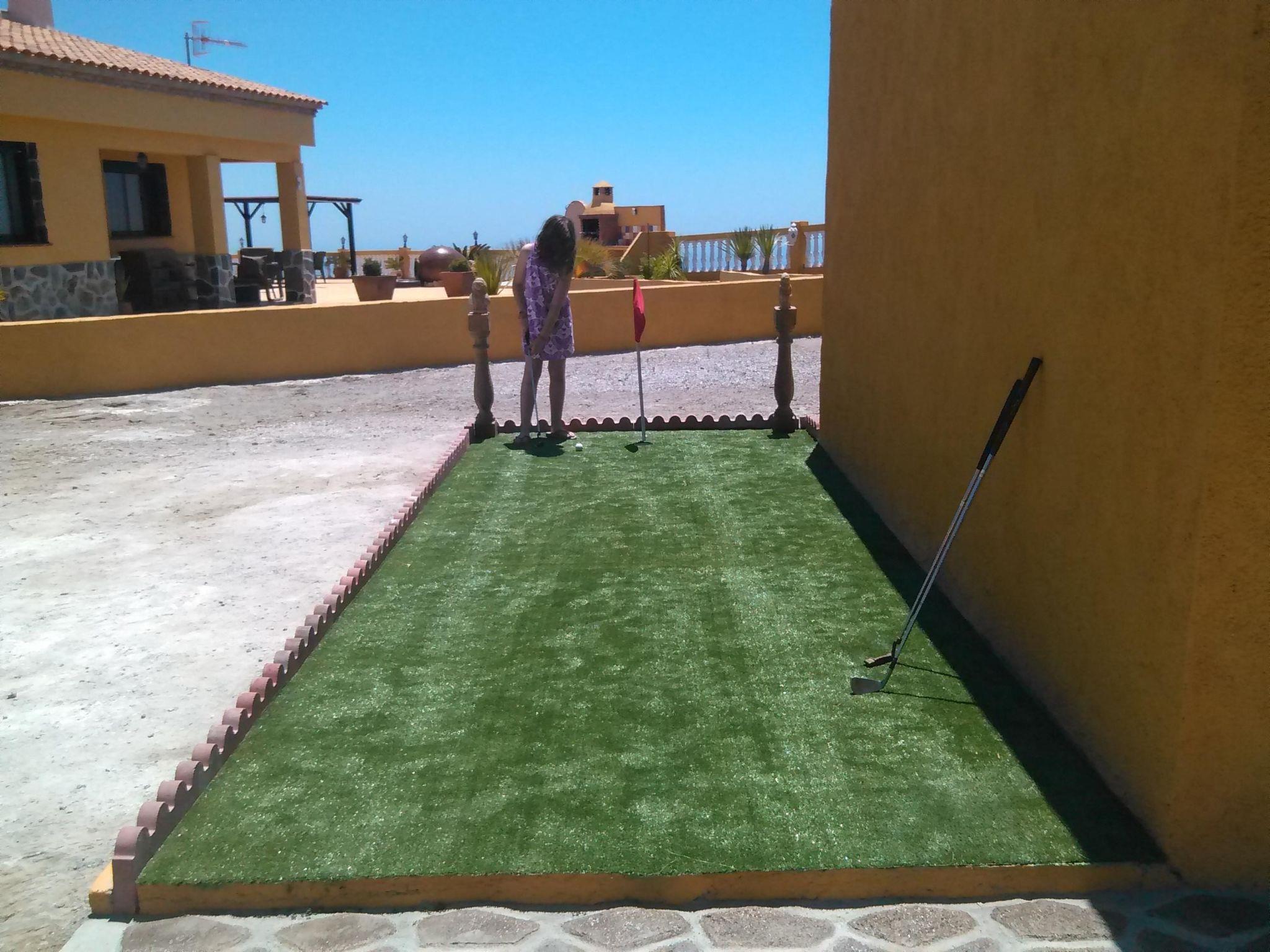 Right next to the house is the terrace (270 m²) with the swimming pool of eight by four metres. The entire property has a surface of approximately 2000 m² and is flat. The property even has a mini golf course (10m²) and parking for up to ten vehicles. There are four sun loungers, two parasols, an outdoor shower and a barbecue by the pool. Tables and seating under the covered area of the pool terrace invite you to relax.
