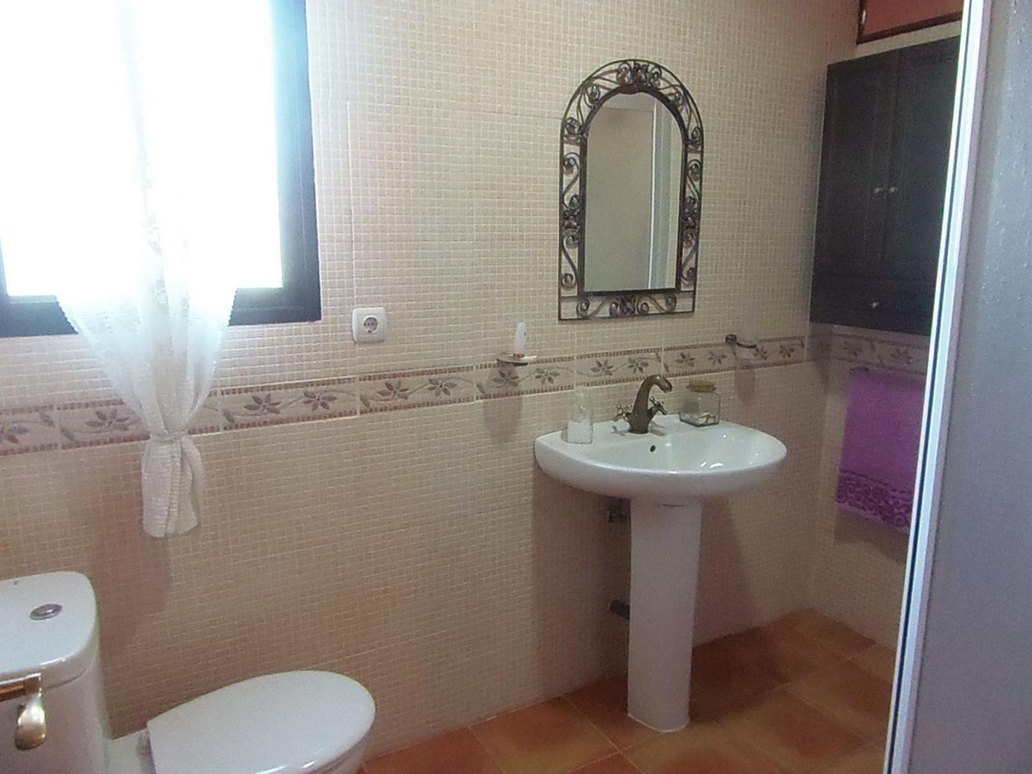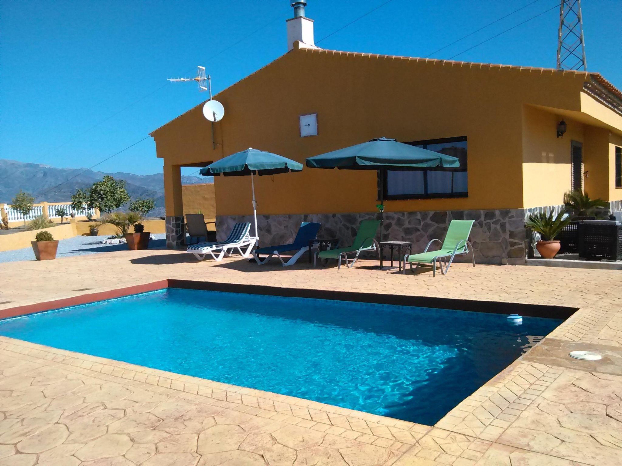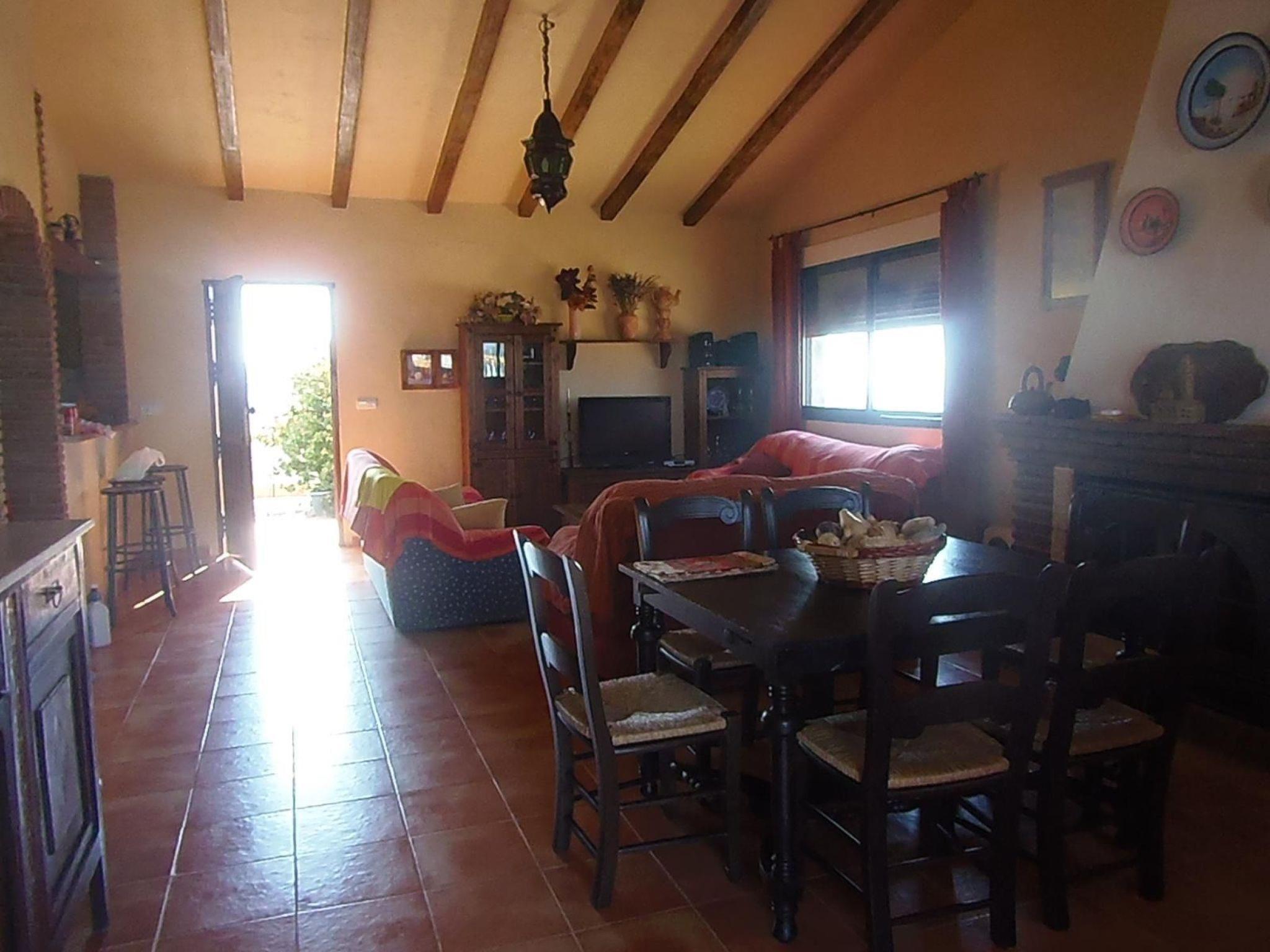 The cosy house, partly in rustic Andalusian style, offers enough space for up to six people on 130m². It is distributed over one floor and has three bedrooms, one with two single beds (105cm and 90cm wide) and the other two with double beds (135cm wide). The bedrooms have a surface area of 13m² each. The house also offers two bathrooms with shower. One of the bathrooms is en suite with the double bedroom. The heart of the house is the shared living and dining room with sofas, fireplace, satellite TV, stereo, dining table and chairs. The spacious kitchen offers basic equipment including induction hob, dishwasher, washing machine, kettle and microwave.