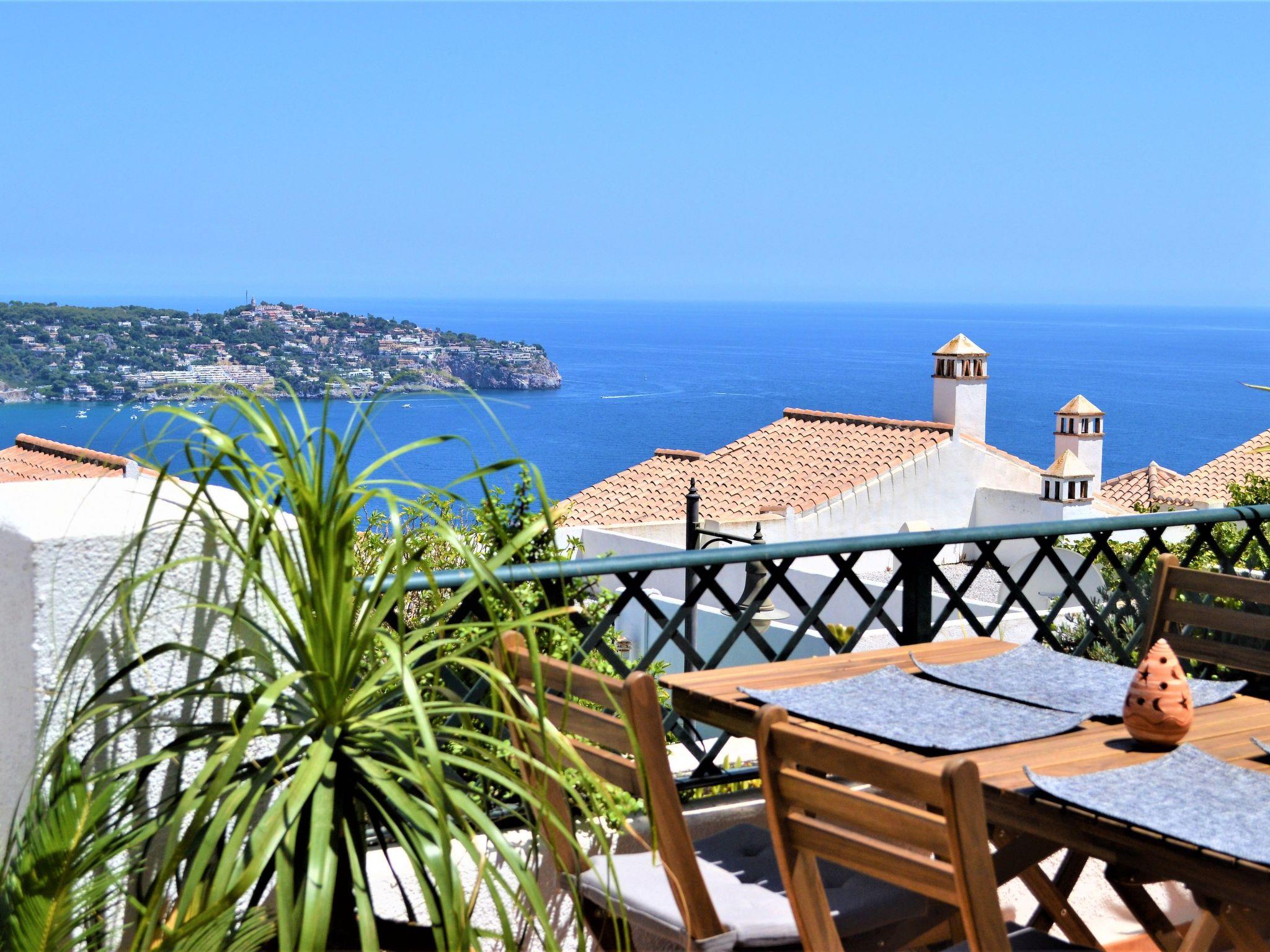 On the first floor of the holiday home are the three bedrooms for up to 6 people, one of which is the master bedroom with en-suite bathroom. The other two bedrooms share the second bathroom. All rooms are furnished with comfortable double beds and wardrobes and are south-facing. A staircase leads upstairs to the living/dining area, the fully equipped kitchen with wonderful views of the Mediterranean, the guest toilet and the sun terrace. The kitchen is equipped with a ceramic hob, oven, extractor bonnet, fridge-freezer, dishwasher, washing machine, microwave, espresso machine, toaster and kettle.