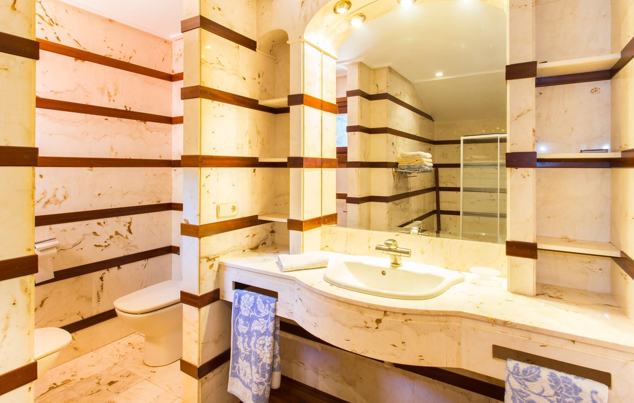Colonia de Sant Pere er en del af kommunen Artà og ligger i den nordøstlige del af øen, ved den lange bugt Alcúdia. Den overdådige villa “Altavista” ligger over den lille badeby og byder på en fantastisk udsigt over kystområdet foran sig. Den lille lystbådehavn og byens sandstrand ligger i gåafstand. I Colonia de Sant Pere finder I en smuk promenade med indbydende restauranter, caféer, isbarer og små butikker. Dette er det ideelle udgangspunkt for vandrere, der kan vandre mange kilometer i én retning langs sandstranden. I den anden retning kan I følge de gamle smugleres spor. Der er gode vandrestier til forsvarstårnene og ind i de tilstødende bjerge. Villaen er omgivet af et kæmpestort, dels vildt, dels kærligt anlagt område. Kombinationen af det røde hus, grønne omgivelser og lyseblå himmel er simpelthen vidunderlig. Her finder I naturlige enge samt store, delvist overdækkede terrassearealer, som er perfekte til afslapning på alle tidspunkter af dagen. Et mangfoldigt udvalg af udendørs siddepladser omkring villaen giver jer mulighed for at nyde hinandens selskab og nyde kulinariske måltider. Om aftenen kan I forberede og nyde friske, regionale delikatesser her, mens I nyder den fantastiske udsigt over poolområdet og videre. Den bemærkelsesværdigt formede pool er flisebelagt med små dekorative mosaikfliser, der giver en "uendelighedseffekt" på et tidspunkt, hvilket giver jer en sømløs udsigt over horisonten fra vandoverfladen. I kan slappe af i solen af hjertens lyst på de komfortable liggestole og nyde panoramaudsigten. Den overdækkede del af terrassen byder på behagelig, luftig skygge. Villaens indre byder sine gæster velkommen med en rustik, hyggelig atmosfære. De til dels farverige møbler og de mønstrede stoffer bidrager meget til stemningen og giver huset en helt særlig charme. Dekorative gulvfliser, original belysning og en række billeder på væggen skaber en smuk scene. Interiørets individualitet fremvises centralt ved det store spisebord, så et selskab på op til otte personer kan nyde middagen smagfuldt. Den rummelige stue, der ligger to trin ned i åbent hus, er ikke mindre smagfuld. Her kan I slappe af på komfortable lænestole og en sofa. En moderne pejs skaber en fin kontrast til indretningen, ligesom det store fladskærms-tv. Vi tilbyder jer muligheden for at tilbringe en stille aften ved pejsen eller se en underholdende film. Et kæmpe køkken byder på alt hvad I har brug for i løbet af dagen, inklusiv en filterkaffemaskine og elkedel samt masser af opbevaringsplads. Det hyggelige hjørne ved vinduet giver endnu en mulighed for at nyde aftensmaden. Komfortable soveværelser inviterer jer til en afslappende søvn. De er individuelt designet og udstråler hver især en helt speciel flair på sin egen måde – for slet ikke at tale om den fantastiske udsigt, som nogle vinduer byder på. Sengene måler 1,60 x 2,00 m, den tredje seng måler 1,90 x 2,00 m. Badeværelserne, hvoraf nogle er udstyret med marmor, er lige så funktionelle som de er stilfulde. Der er også et lille gæstebadeværelse. Et strygejern og en hårtørrer er også tilgængelige i huset. Placeringen af villaen "Altavista" nær bjergene, havet og den lille by Colonia de Sant Pere er, udover det eksklusive hus, endnu en grund til, at denne ejendom har en så udsøgt karisma. Vi hos Fincallorca ønsker jer en god ferie! Den smukke villa "Altavista" med havudsigt ligger let forhøjet og kun 100 m i luftlinje fra vandet. Husets meget rummelige indvendige og udvendige områder imponerer med en hyggelig og rustik atmosfære. Marinaen i Colonia de Sant Pere ligger 15 minutters gang derfra. Bemærk venligst, at denne ejendom ikke accepterer ungdomsgrupper eller polterabender. En ungdomsgruppe på denne ejendom består af personer på 22 år eller derunder. Book ikke denne ejendom, hvis I er en ungdomsgruppe eller en polterabendgruppe, da jeres reservation vil blive afvist, når den er booket, hvilket også kan være tilfældet ved ankomst til ejendommen eller under jeres ophold, og I vil ikke modtage en refusion.