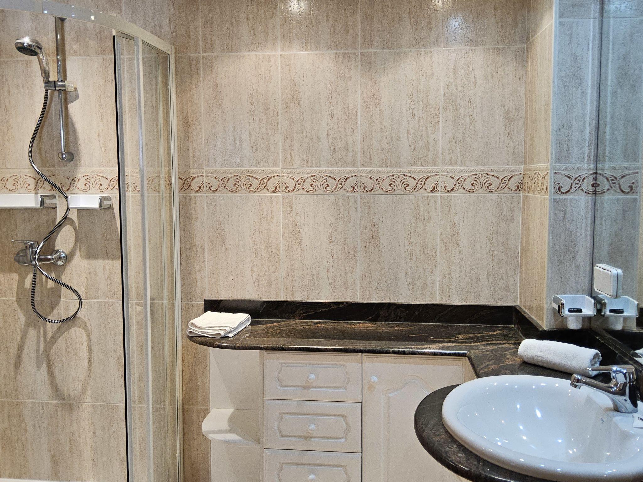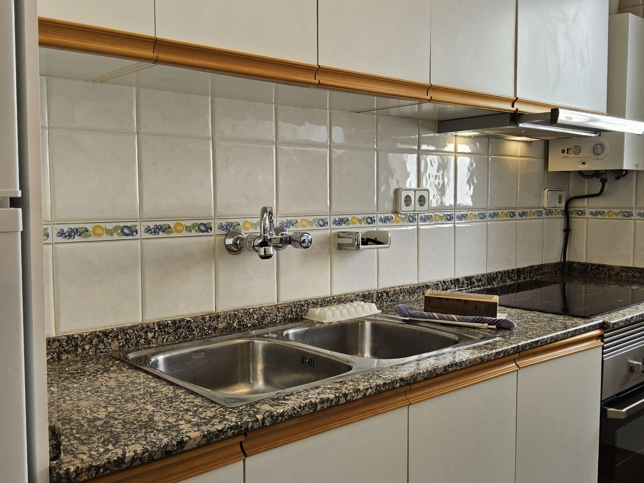 "Marysol", 3-room apartment 97 m2 on 2nd floor. Spacious and bright, comfortable and tasteful furnishings: living/dining room 42 m2 with digital TV, air conditioning and forced-air heating. Exit to the terrace. 1 room 10 m2 with 2 beds (90 cm, length 190 cm), air conditioning and fan. 1 room 10 m2 with 1 french bed (135 cm, length 190 cm), air conditioning, fan and forced-air heating. Kitchen (oven, 3 ceramic glass hob hotplates, toaster, kettle, microwave, electric coffee machine). Shower/WC. Air-conditioning. Large terrace 17 m2, east facing position. Terrace furniture. Panoramic view of the sea and the countryside. Facilities: washing machine, iron, hair dryer. Internet (WiFi, free). Parking space n 8 (roofed), height 170 cm, width 480 cm. Please note: parking space for small car only. The garage measures 220cm long and 480cm wide. VT-440434-A // Reg. Nr.: ESFCTU00000305300009316600000000000000000VT-440434-A6