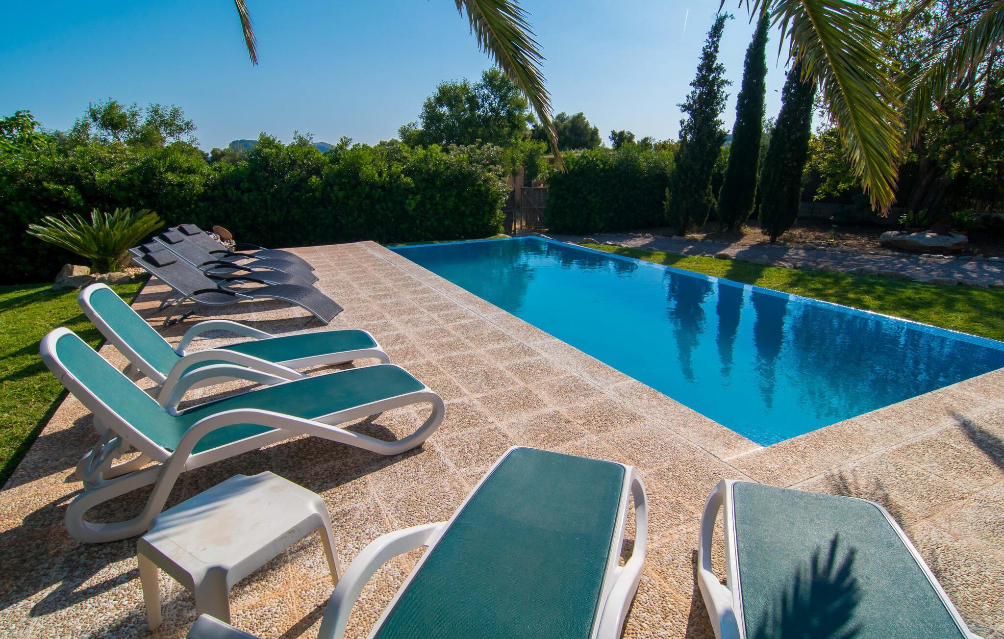 Efter en køretur gennem idyllisk natur når vi Villa "Angela" på en solskinsdag. Efter den venlige velkomst fra ejeren går vi sammen gennem det indbydende, velholdte udendørsområde. Middelhavsplanter af enhver art indrammer de smukke terrasser, hvor du kan slappe af på forskellige måder. Udvalget af vidunderlige grønne områder er afrundet af frodige palmer, der flankerer poolen. Denne er placeret på siden af huset: Fra den overdækkede terrasse går du blot hen over et lille grusareal, tager de tre naturstenstrin og du er der. Den lyseblå flisebelagte pool varierer i dybden mellem behagelige 1,20 og 1,70 m og ser særdeles original ud takket være infinity-effekten på to sider. Når man svømmer i det kølige vand, får man indtryk af, at vandet og dets omgivelser går over i hinanden. Omkring poolen er der græsplæne og terrasseområder, der er perfekte til at slappe af under den klare middelhavshimmel. Snup en god bog og en lækker drink – og indstil dit indre program til at "slappe af". Nu er det tid til at vælge det bedst egnede sted til liggestolen. Mens nogle lader batterierne op på denne eng, foretrækker andre måske den overdækkede terrasse ved huset og nyder idyllen herfra. I kan sidde behageligt ved det smagfulde bord og læse, nyde en drink eller spille spil sammen. Herfra har du en perfekt udsigt til poolen og eventuelle børn, der rejser med dig. Om aftenen vil nogen måske tænde for grillen og forberede en perfekt BBQ for at afslutte dagen med kulinariske lækkerier. For en endnu bedre friluftsfølelse kan du sidde ved det smukke træbord på sidestensfladen. Herfra kommer vi ind i husets stue. Dette åbne rum med spiseplads og integreret køkken vil helt sikkert være det vigtigste sted for dit ophold indendørs. Og der er mange ting, du også kan gøre her. Hvis du vil, kan du slappe af i de behagelige sofaer og måske underholde dig selv med en god film. Du kan også surfe på internettet med gratis internet eller dele et glimt af din ferie med dine venner derhjemme. Det typiske mallorcanske køkken er fuldt udstyret og tilbyder dig alle muligheder for helt uafhængig selvforplejning. Måske har du lyst til at prøve en spansk ret og derefter servere den - enten ved det enorme spisebord indendørs eller udenfor? Individuelt indrettede værelser er tilpasset forskellige smag og er sikker på at tilbyde den rigtige atmosfære for alle. Inden du skal tegne sugerør til det bedste rum, kan du måske træffe et valg på forhånd ud fra billederne. Der er 3 dobbeltsenge og et værelse hvor man kan trække den anden madras ud. Dette værelse er perfekt til alle børn. Alle gæster har plads nok i de to iøjnefaldende badeværelser samt naturligt lys. En hårtørrer er tilgængelig og behøver ikke at medbringes. Brugen af masser af træ og matchende gulvfliser skaber en meget hyggelig atmosfære, det samme gør brugen af natursten og muntre farver. Typisk indretning giver dette hus et personligt og venligt præg. Kan du lide det mindre, vil du helt sikkert bedst lide det her. Den populære strandby Cala Ratjada ligger kun 10 minutters kørsel derfra og har en malerisk havn og et udvalg af barer og restauranter. De små byer Artà (7 km) og Capdepera har bevaret deres oprindelige middelalderlige charme og skiller sig derfor tydeligt ud fra de nyere turistattraktioner langs kysten. Selv om vinteren byder begge steder på adskillige spise- og indkøbsmuligheder. Når det kommer til strande, kan du prøve en anden hver dag - i denne del af Mallorca vil du altid finde nye strandsteder, hvor du kan lytte til lyden af brændingen væk fra larmende menneskemængder. Den komfortabelt indrettede villa "Angela" ligger på en idyllisk ejendom ca. 2,5 km vest for Capdepera. Oplev en afslappende tid her, væk fra stress og jag. Samtidig er du kun et stenkast væk i bil fra alt, hvad denne del af øen har at byde på, især flere smukke strande. Om aftenen byder havnebyen Cala Ratjada (ca. 6 km) på en indbydende strandpromenade, gode barer og restauranter samt indkøbsmuligheder. Dette er et Fincallorca feriehus.