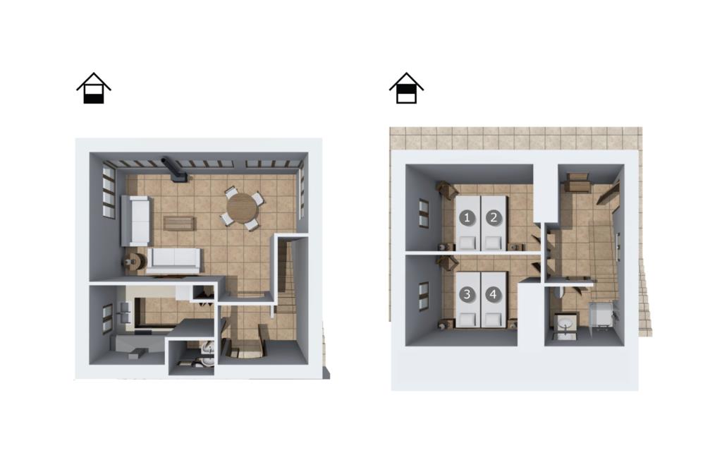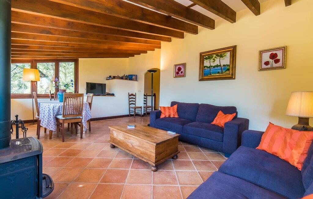 Indenfor kan villaen prale af et hyggelig design med lyse farver, terrakottafliser og trædetaljer, hvilket skaber en varm og indbydende atmosfære. Den rummelige stue tilbyder en betagende havudsigt, et komfortabelt siddeområde og en pejs for ekstra komfort på kølige aftener. Trådløst internet er tilgængeligt for at holde jer forbundet. Øverste etage inkluderer et rundt spisebord, et fuldt udstyret køkken og et gæstetoilet. I stueetagen tilbyder to soveværelser med to enkeltsenge et afslappende tilflugtssted, suppleret med et badeværelse. På dette niveau er der en solterrasse, og en stille sti fører direkte til badebugten, hvilket gør den ideel til en familieferie med fokus på at være tæt på stranden.