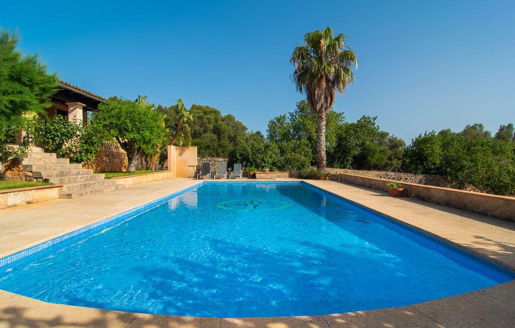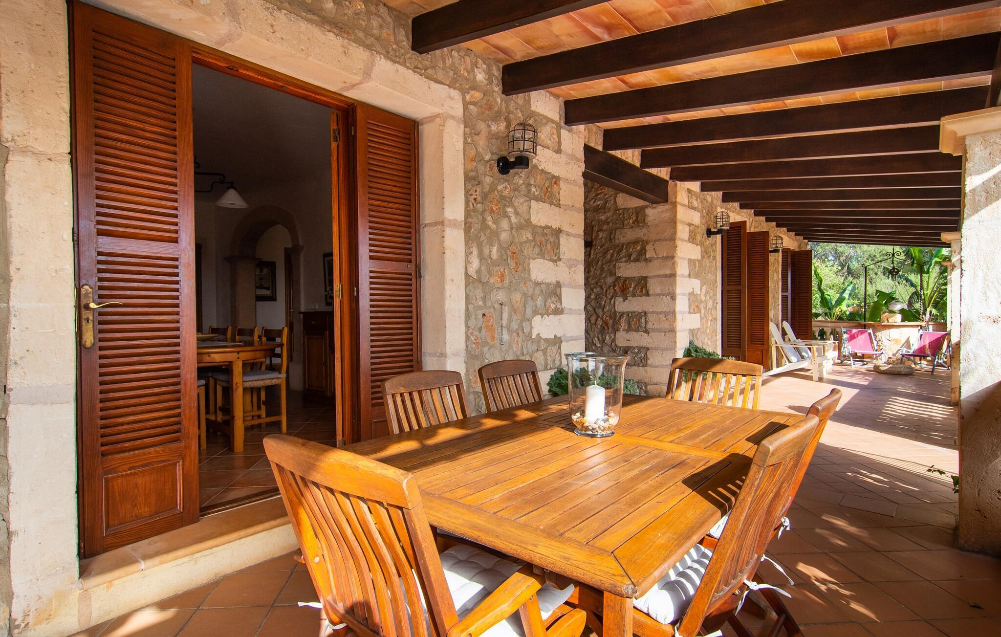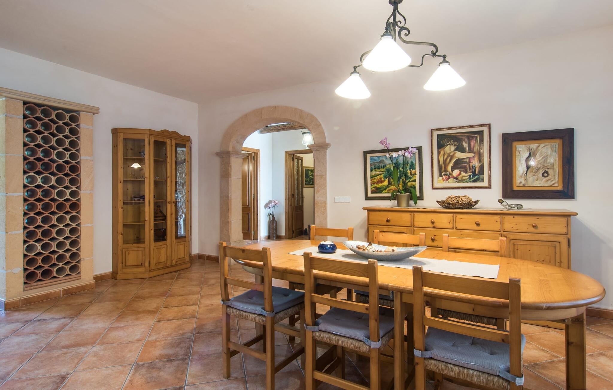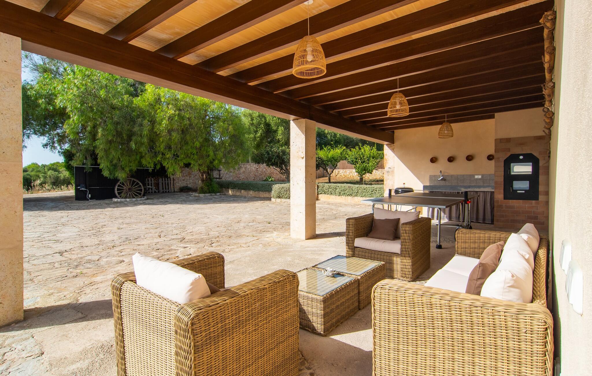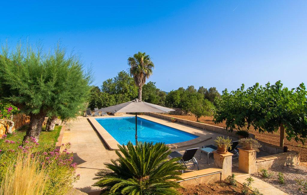 Den smukke ejendom Villa "Arbor", som byder sine gæster velkommen i en naturlig og velholdt atmosfære, kan nås via en rustik landevej. Middelhavsvegetation og omfattende terrassearealer former i væsentlig grad billedet af udendørsområdet og formidler umiddelbart en følelse af komfort og afslapning. Indbydende møbler er tilgængelige til afslapning eller spisning på de åbne og overdækkede terrasseområder. Når vejret er godt, kan I nemt spise udendørs når som helst på dagen og nyde den fantastiske udsigt i det fjerne over morgenmaden. Den enorme, 11 m lange pool varierer i dybden mellem 0,3 og 1,8 m. Her kan I nyde solen hele dagen lang på de moderne liggestole. Dette udendørs område tilbyder også en fantastisk udsigt over det indre af øen. På græsplænen ved siden af poolen er der træer, der giver skygge og inviterer jer til at slappe af, mens I nyder en behagelig brise. Carporten er unikt indrettet til udekøkken med kulovn. Her kan I fejre aftengrill og nyde lækre egnsprodukter i godt selskab. Den næste gade er lige Villanweg, som fører til en anden nabo. Når nogen går ned ad denne gade, kan der høres en lyd. Bortset fra det er der dog en fuldstændig følelse af fred og ro her. Det indre af huset i stueetagen præsenterer sig i en munter og elegant stil. Lyse vægge og terracottafarvede fliser danner en harmonisk ramme om den hyggelige indretning, belysning og dekoration. I højre halvdel af huset er de fire soveværelser og badeværelserne, til venstre for indgangen er der en rummelig stue/spisestue og et separat køkken med spisebord. På forsiden af huset er den overdækkede terrasse med udsigt over poolen. Sofaområdet har to yderst behagelige sofaer, der inviterer jer til at slappe af. På kølige aftener kan I sørge for yderligere hygge ved hjælp af åben ild. Fjernsynet med satellitmodtagelse giver underholdning, når det kræves. De runde murstensbuer skaber en rustik, individuel atmosfære. I kan spise sammen indendørs ved spisebordet ved siden af. Køkkenet er bekvemt placeret lige ved siden af, så I ikke skal rejse lange strækninger med jeres mad. Køkkenet er udstyret med alt hvad I behøver til daglige behov, herunder en kedel, en espressomaskine og en filterkaffemaskine. De fire soveværelser er komfortabelt designet. Unødvendige dekorationer blev bevidst undgået, så disse rum udstråler en afslappende effekt. I vil finde afslappende søvn i komfortable senge, hvoraf to er 1,50x1,90m og de to andre er 2,00x2,00m. Myggenet er tilgængelige og kan bruges om nødvendigt. De to badeværelser med naturligt lys er rummelige og hver udstyret med bruser eller badekar. Strygefaciliteter og hårtørrer er tilgængelige på stedet. Manacors centrum ligger kun 5 minutter væk i bil. Det ugentlige marked finder sted der hver mandag, hvor I kan købe friske regionale produkter. Nogle strande i nærheden er rigtige insidertips og fri for udvikling. Porto Cristo ligger cirka 14 km væk. Der finder I en smuk strand med lavvandet adgang til havet. Her er også en attraktiv promenade. Efter en begivenhedsrig dag fuld af aktiviteter, kan I vende tilbage til den vidunderlige idyl i jeres "Arbor"-villa og afslutte dagen, lige som I ønsker det. Den meget idylliske villa "Arbor" ligger i den smukke østlige del af øen, kun 3 km nord for Manacor. I finder gode indkøbsmuligheder både der og i Sant Lllorenc (9 km væk). En meget velholdt og rustik atmosfære præger denne ejendom, samt den vidunderlige fjerne udsigt, som I kan nyde her. En af de nærmeste smukke strande er Cala Varques, som ligger omkring 15 km væk.