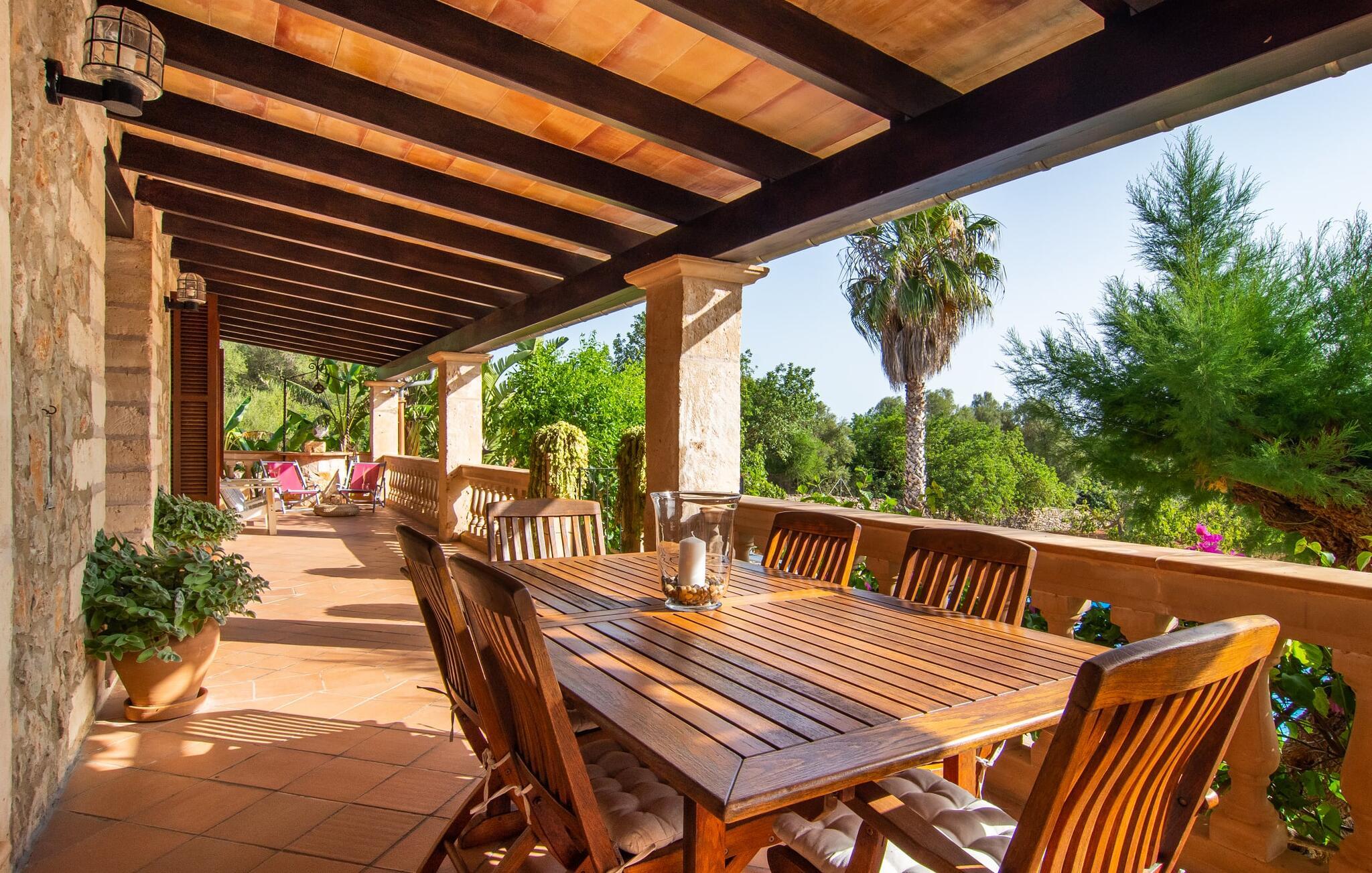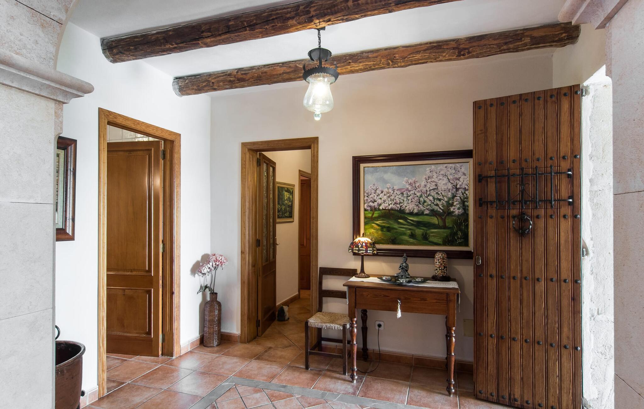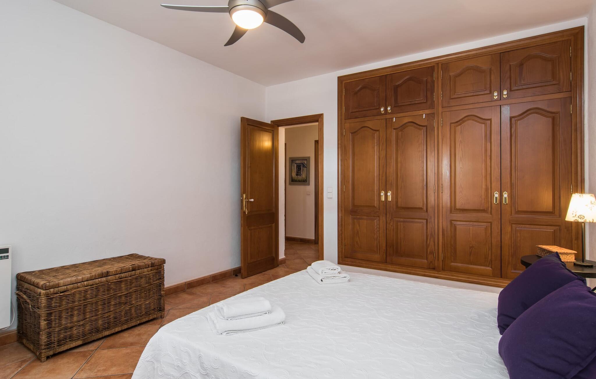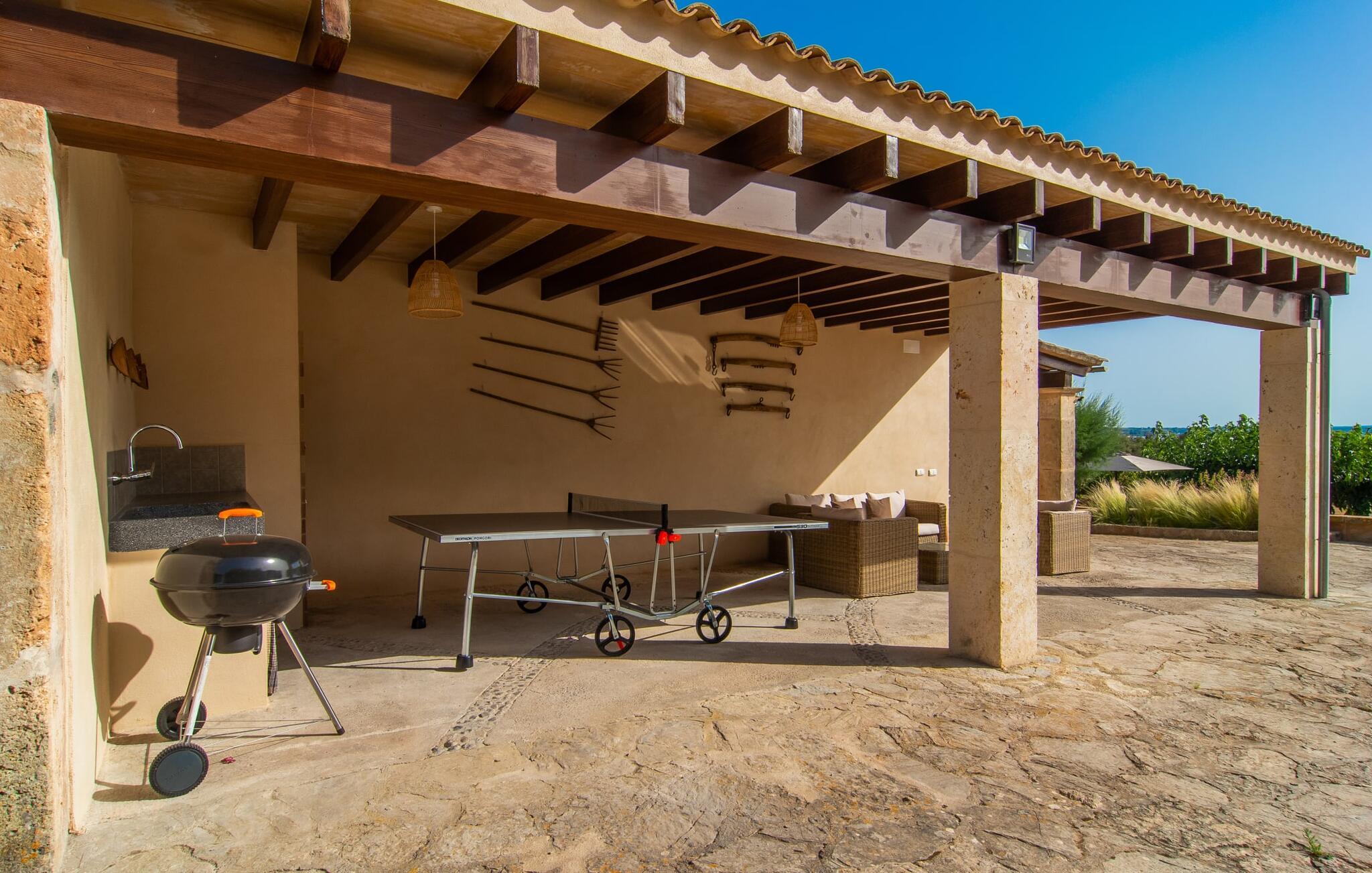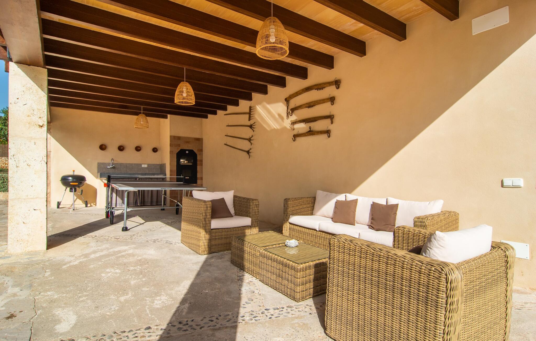 Den smukke ejendom Villa "Arbor", som byder sine gæster velkommen i en naturlig og velholdt atmosfære, kan nås via en rustik landevej. Middelhavsvegetation og omfattende terrassearealer former i væsentlig grad billedet af udendørsområdet og formidler umiddelbart en følelse af komfort og afslapning. Indbydende møbler er tilgængelige til afslapning eller spisning på de åbne og overdækkede terrasseområder. Når vejret er godt, kan I nemt spise udendørs når som helst på dagen og nyde den fantastiske udsigt i det fjerne over morgenmaden. Den enorme, 11 m lange pool varierer i dybden mellem 0,3 og 1,8 m. Her kan I nyde solen hele dagen lang på de moderne liggestole. Dette udendørs område tilbyder også en fantastisk udsigt over det indre af øen. På græsplænen ved siden af poolen er der træer, der giver skygge og inviterer jer til at slappe af, mens I nyder en behagelig brise. Carporten er unikt indrettet til udekøkken med kulovn. Her kan I fejre aftengrill og nyde lækre egnsprodukter i godt selskab. Den næste gade er lige Villanweg, som fører til en anden nabo. Når nogen går ned ad denne gade, kan der høres en lyd. Bortset fra det er der dog en fuldstændig følelse af fred og ro her. Det indre af huset i stueetagen præsenterer sig i en munter og elegant stil. Lyse vægge og terracottafarvede fliser danner en harmonisk ramme om den hyggelige indretning, belysning og dekoration. I højre halvdel af huset er de fire soveværelser og badeværelserne, til venstre for indgangen er der en rummelig stue/spisestue og et separat køkken med spisebord. På forsiden af huset er den overdækkede terrasse med udsigt over poolen. Sofaområdet har to yderst behagelige sofaer, der inviterer jer til at slappe af. På kølige aftener kan I sørge for yderligere hygge ved hjælp af åben ild. Fjernsynet med satellitmodtagelse giver underholdning, når det kræves. De runde murstensbuer skaber en rustik, individuel atmosfære. I kan spise sammen indendørs ved spisebordet ved siden af. Køkkenet er bekvemt placeret lige ved siden af, så I ikke skal rejse lange strækninger med jeres mad. Køkkenet er udstyret med alt hvad I behøver til daglige behov, herunder en kedel, en espressomaskine og en filterkaffemaskine. De fire soveværelser er komfortabelt designet. Unødvendige dekorationer blev bevidst undgået, så disse rum udstråler en afslappende effekt. I vil finde afslappende søvn i komfortable senge, hvoraf to er 1,50x1,90m og de to andre er 2,00x2,00m. Myggenet er tilgængelige og kan bruges om nødvendigt. De to badeværelser med naturligt lys er rummelige og hver udstyret med bruser eller badekar. Strygefaciliteter og hårtørrer er tilgængelige på stedet. Manacors centrum ligger kun 5 minutter væk i bil. Det ugentlige marked finder sted der hver mandag, hvor I kan købe friske regionale produkter. Nogle strande i nærheden er rigtige insidertips og fri for udvikling. Porto Cristo ligger cirka 14 km væk. Der finder I en smuk strand med lavvandet adgang til havet. Her er også en attraktiv promenade. Efter en begivenhedsrig dag fuld af aktiviteter, kan I vende tilbage til den vidunderlige idyl i jeres "Arbor"-villa og afslutte dagen, lige som I ønsker det. Den meget idylliske villa "Arbor" ligger i den smukke østlige del af øen, kun 3 km nord for Manacor. I finder gode indkøbsmuligheder både der og i Sant Lllorenc (9 km væk). En meget velholdt og rustik atmosfære præger denne ejendom, samt den vidunderlige fjerne udsigt, som I kan nyde her. En af de nærmeste smukke strande er Cala Varques, som ligger omkring 15 km væk.