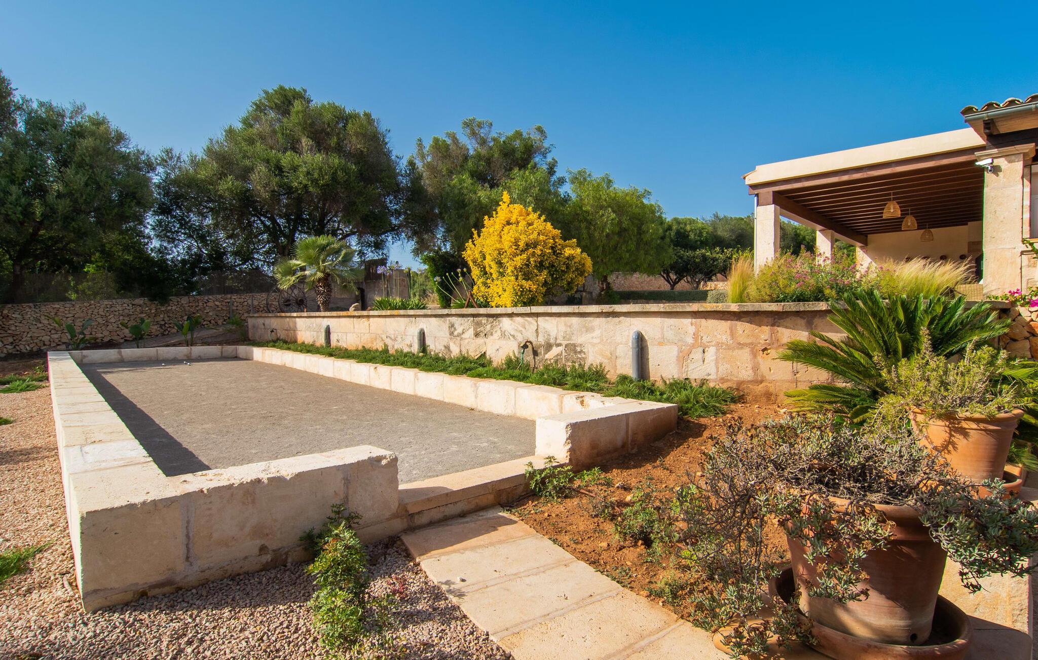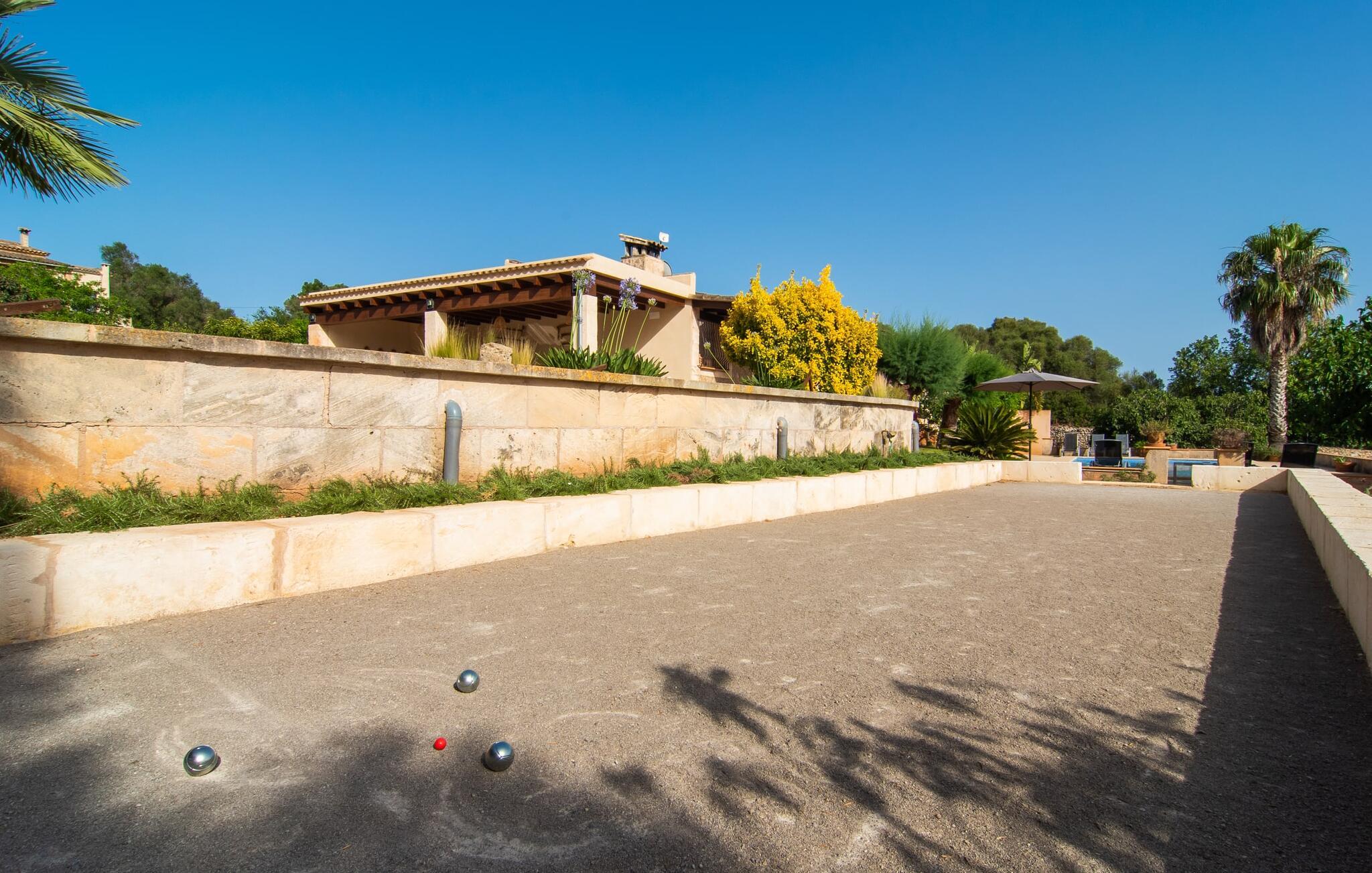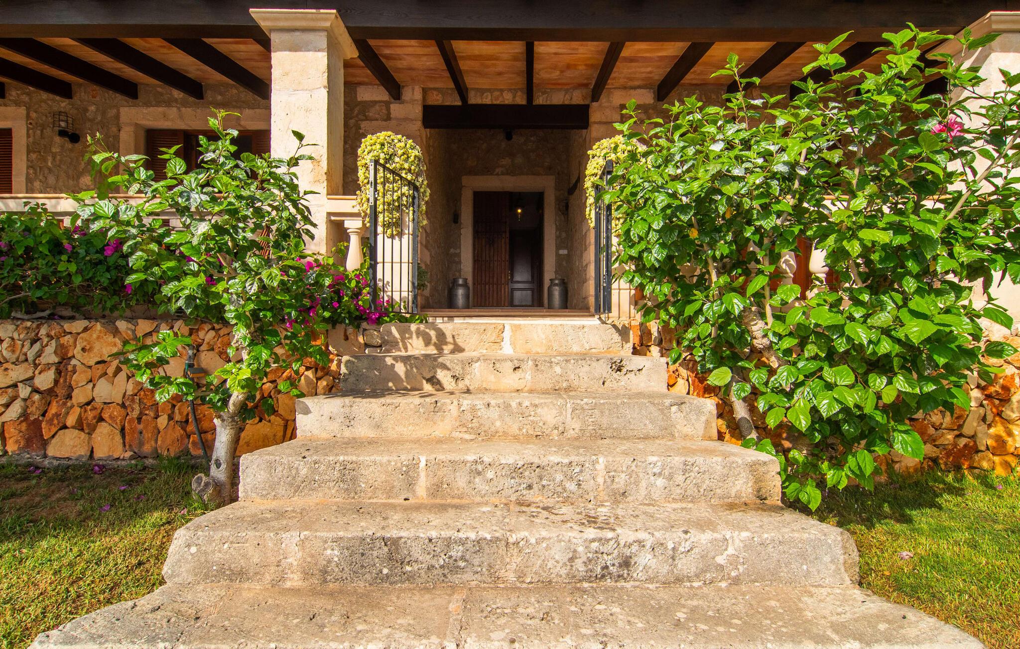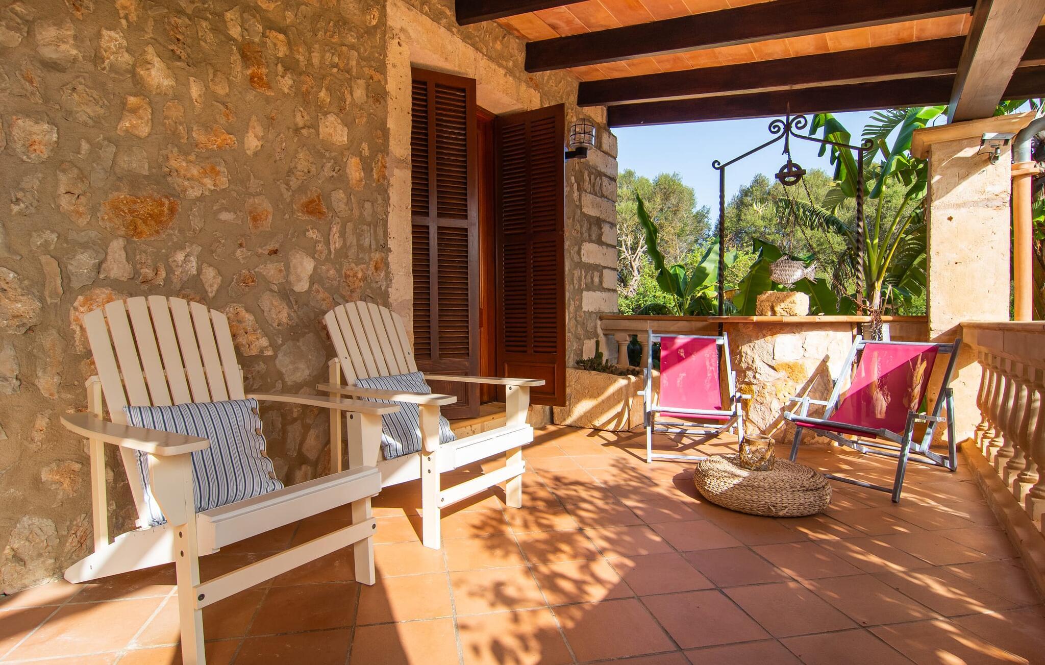 Den smukke ejendom Villa "Arbor", som byder sine gæster velkommen i en naturlig og velholdt atmosfære, kan nås via en rustik landevej. Middelhavsvegetation og omfattende terrassearealer former i væsentlig grad billedet af udendørsområdet og formidler umiddelbart en følelse af komfort og afslapning. Indbydende møbler er tilgængelige til afslapning eller spisning på de åbne og overdækkede terrasseområder. Når vejret er godt, kan I nemt spise udendørs når som helst på dagen og nyde den fantastiske udsigt i det fjerne over morgenmaden. Den enorme, 11 m lange pool varierer i dybden mellem 0,3 og 1,8 m. Her kan I nyde solen hele dagen lang på de moderne liggestole. Dette udendørs område tilbyder også en fantastisk udsigt over det indre af øen. På græsplænen ved siden af poolen er der træer, der giver skygge og inviterer jer til at slappe af, mens I nyder en behagelig brise. Carporten er unikt indrettet til udekøkken med kulovn. Her kan I fejre aftengrill og nyde lækre egnsprodukter i godt selskab. Den næste gade er lige Villanweg, som fører til en anden nabo. Når nogen går ned ad denne gade, kan der høres en lyd. Bortset fra det er der dog en fuldstændig følelse af fred og ro her. Det indre af huset i stueetagen præsenterer sig i en munter og elegant stil. Lyse vægge og terracottafarvede fliser danner en harmonisk ramme om den hyggelige indretning, belysning og dekoration. I højre halvdel af huset er de fire soveværelser og badeværelserne, til venstre for indgangen er der en rummelig stue/spisestue og et separat køkken med spisebord. På forsiden af huset er den overdækkede terrasse med udsigt over poolen. Sofaområdet har to yderst behagelige sofaer, der inviterer jer til at slappe af. På kølige aftener kan I sørge for yderligere hygge ved hjælp af åben ild. Fjernsynet med satellitmodtagelse giver underholdning, når det kræves. De runde murstensbuer skaber en rustik, individuel atmosfære. I kan spise sammen indendørs ved spisebordet ved siden af. Køkkenet er bekvemt placeret lige ved siden af, så I ikke skal rejse lange strækninger med jeres mad. Køkkenet er udstyret med alt hvad I behøver til daglige behov, herunder en kedel, en espressomaskine og en filterkaffemaskine. De fire soveværelser er komfortabelt designet. Unødvendige dekorationer blev bevidst undgået, så disse rum udstråler en afslappende effekt. I vil finde afslappende søvn i komfortable senge, hvoraf to er 1,50x1,90m og de to andre er 2,00x2,00m. Myggenet er tilgængelige og kan bruges om nødvendigt. De to badeværelser med naturligt lys er rummelige og hver udstyret med bruser eller badekar. Strygefaciliteter og hårtørrer er tilgængelige på stedet. Manacors centrum ligger kun 5 minutter væk i bil. Det ugentlige marked finder sted der hver mandag, hvor I kan købe friske regionale produkter. Nogle strande i nærheden er rigtige insidertips og fri for udvikling. Porto Cristo ligger cirka 14 km væk. Der finder I en smuk strand med lavvandet adgang til havet. Her er også en attraktiv promenade. Efter en begivenhedsrig dag fuld af aktiviteter, kan I vende tilbage til den vidunderlige idyl i jeres "Arbor"-villa og afslutte dagen, lige som I ønsker det. Den meget idylliske villa "Arbor" ligger i den smukke østlige del af øen, kun 3 km nord for Manacor. I finder gode indkøbsmuligheder både der og i Sant Lllorenc (9 km væk). En meget velholdt og rustik atmosfære præger denne ejendom, samt den vidunderlige fjerne udsigt, som I kan nyde her. En af de nærmeste smukke strande er Cala Varques, som ligger omkring 15 km væk.