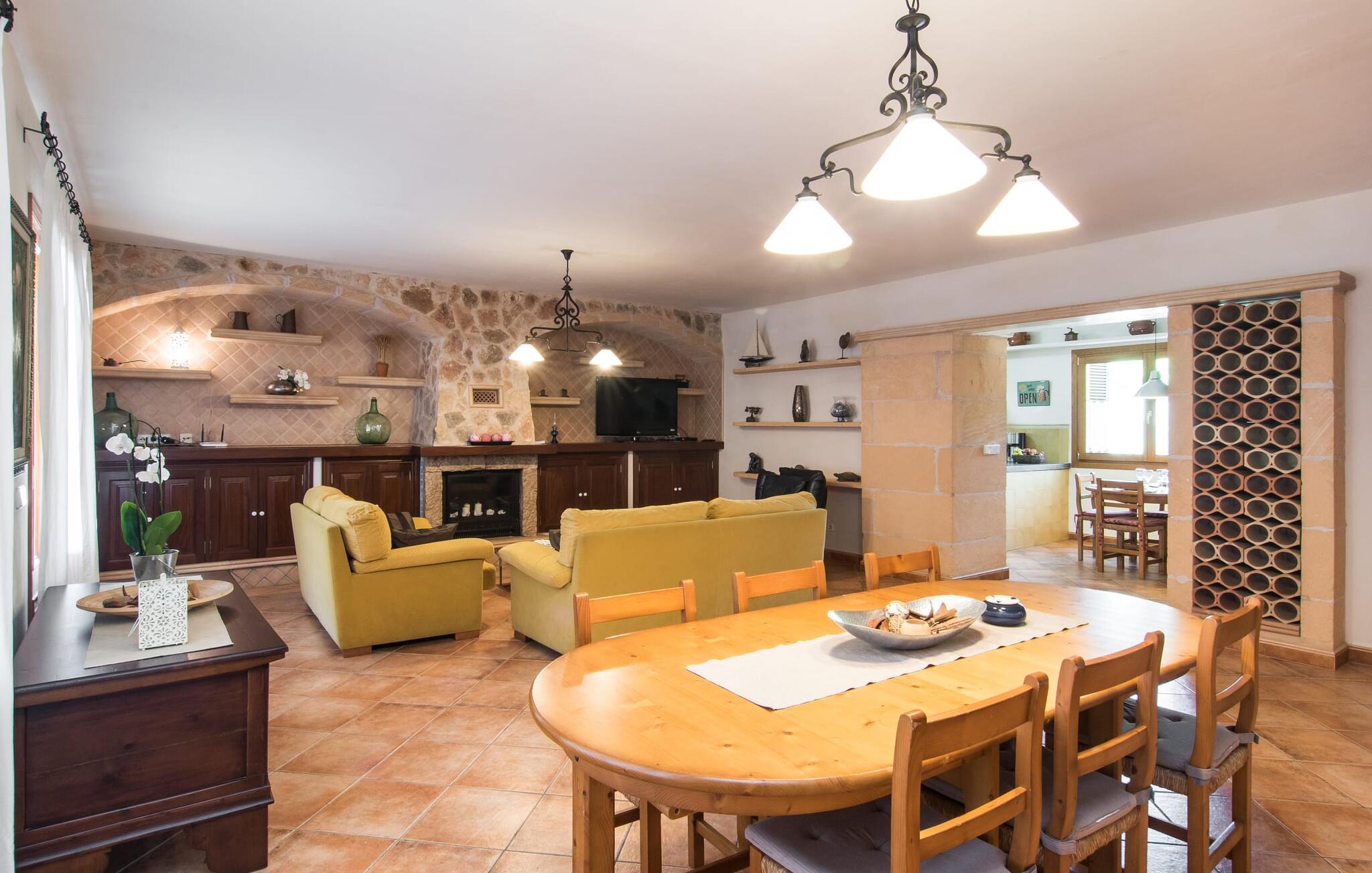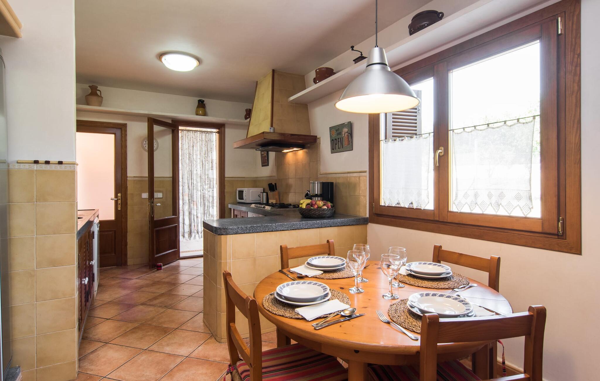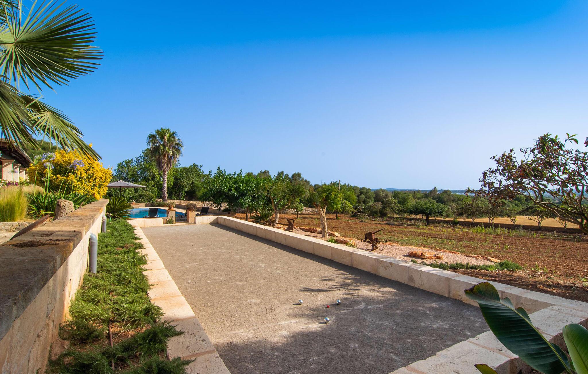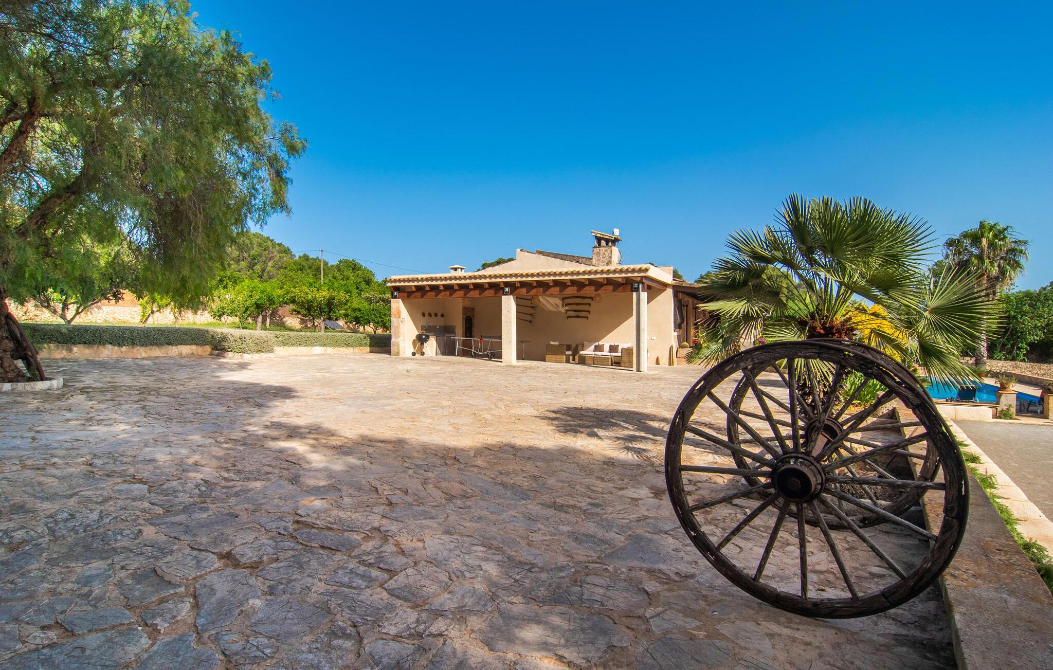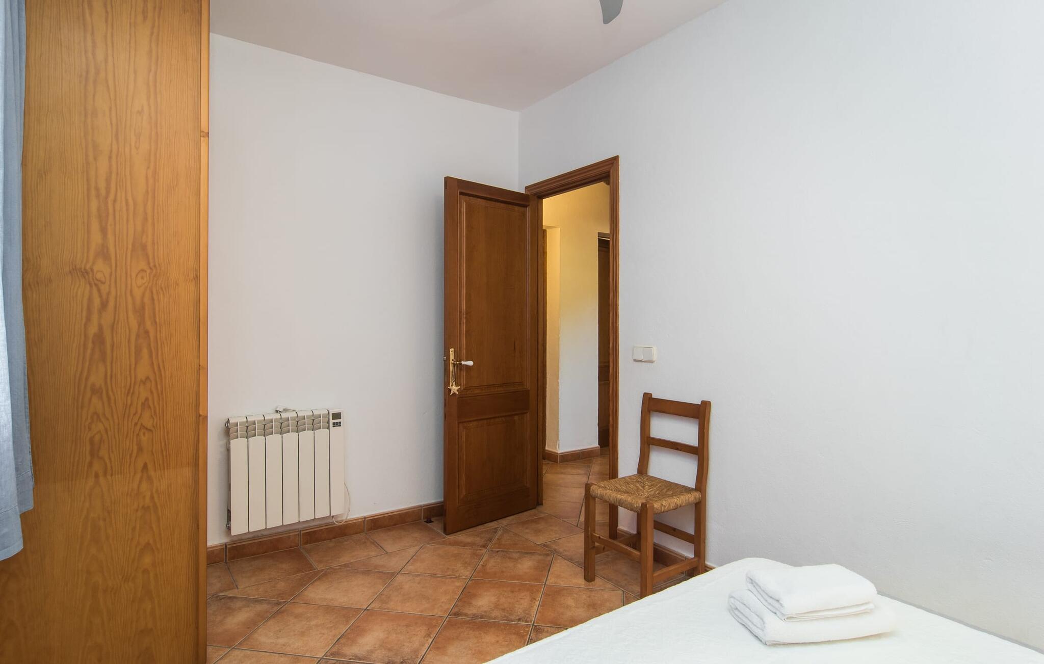 Den smukke ejendom Villa "Arbor", som byder sine gæster velkommen i en naturlig og velholdt atmosfære, kan nås via en rustik landevej. Middelhavsvegetation og omfattende terrassearealer former i væsentlig grad billedet af udendørsområdet og formidler umiddelbart en følelse af komfort og afslapning. Indbydende møbler er tilgængelige til afslapning eller spisning på de åbne og overdækkede terrasseområder. Når vejret er godt, kan I nemt spise udendørs når som helst på dagen og nyde den fantastiske udsigt i det fjerne over morgenmaden. Den enorme, 11 m lange pool varierer i dybden mellem 0,3 og 1,8 m. Her kan I nyde solen hele dagen lang på de moderne liggestole. Dette udendørs område tilbyder også en fantastisk udsigt over det indre af øen. På græsplænen ved siden af poolen er der træer, der giver skygge og inviterer jer til at slappe af, mens I nyder en behagelig brise. Carporten er unikt indrettet til udekøkken med kulovn. Her kan I fejre aftengrill og nyde lækre egnsprodukter i godt selskab. Den næste gade er lige Villanweg, som fører til en anden nabo. Når nogen går ned ad denne gade, kan der høres en lyd. Bortset fra det er der dog en fuldstændig følelse af fred og ro her. Det indre af huset i stueetagen præsenterer sig i en munter og elegant stil. Lyse vægge og terracottafarvede fliser danner en harmonisk ramme om den hyggelige indretning, belysning og dekoration. I højre halvdel af huset er de fire soveværelser og badeværelserne, til venstre for indgangen er der en rummelig stue/spisestue og et separat køkken med spisebord. På forsiden af huset er den overdækkede terrasse med udsigt over poolen. Sofaområdet har to yderst behagelige sofaer, der inviterer jer til at slappe af. På kølige aftener kan I sørge for yderligere hygge ved hjælp af åben ild. Fjernsynet med satellitmodtagelse giver underholdning, når det kræves. De runde murstensbuer skaber en rustik, individuel atmosfære. I kan spise sammen indendørs ved spisebordet ved siden af. Køkkenet er bekvemt placeret lige ved siden af, så I ikke skal rejse lange strækninger med jeres mad. Køkkenet er udstyret med alt hvad I behøver til daglige behov, herunder en kedel, en espressomaskine og en filterkaffemaskine. De fire soveværelser er komfortabelt designet. Unødvendige dekorationer blev bevidst undgået, så disse rum udstråler en afslappende effekt. I vil finde afslappende søvn i komfortable senge, hvoraf to er 1,50x1,90m og de to andre er 2,00x2,00m. Myggenet er tilgængelige og kan bruges om nødvendigt. De to badeværelser med naturligt lys er rummelige og hver udstyret med bruser eller badekar. Strygefaciliteter og hårtørrer er tilgængelige på stedet. Manacors centrum ligger kun 5 minutter væk i bil. Det ugentlige marked finder sted der hver mandag, hvor I kan købe friske regionale produkter. Nogle strande i nærheden er rigtige insidertips og fri for udvikling. Porto Cristo ligger cirka 14 km væk. Der finder I en smuk strand med lavvandet adgang til havet. Her er også en attraktiv promenade. Efter en begivenhedsrig dag fuld af aktiviteter, kan I vende tilbage til den vidunderlige idyl i jeres "Arbor"-villa og afslutte dagen, lige som I ønsker det. Den meget idylliske villa "Arbor" ligger i den smukke østlige del af øen, kun 3 km nord for Manacor. I finder gode indkøbsmuligheder både der og i Sant Lllorenc (9 km væk). En meget velholdt og rustik atmosfære præger denne ejendom, samt den vidunderlige fjerne udsigt, som I kan nyde her. En af de nærmeste smukke strande er Cala Varques, som ligger omkring 15 km væk.