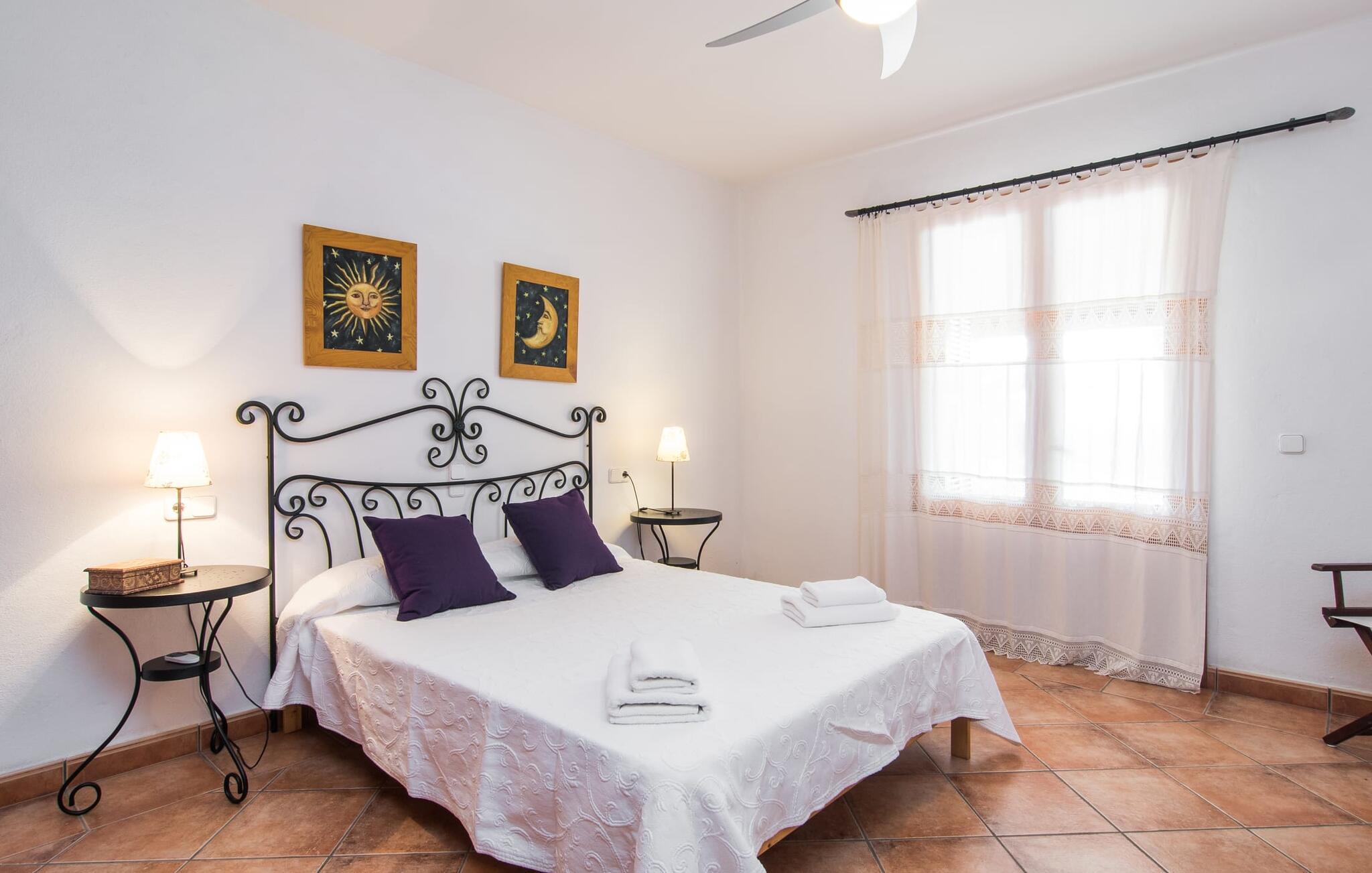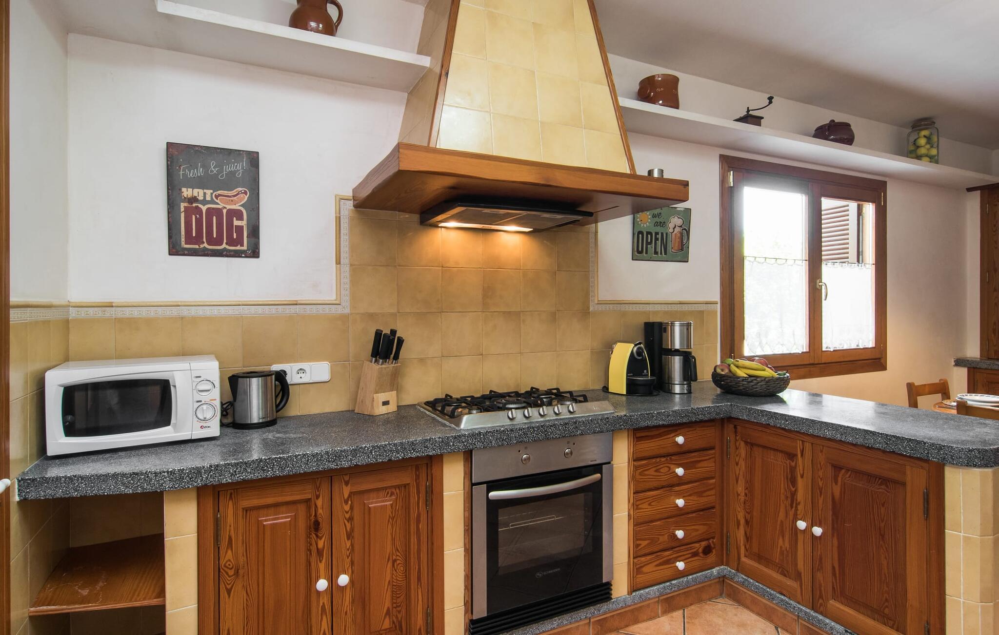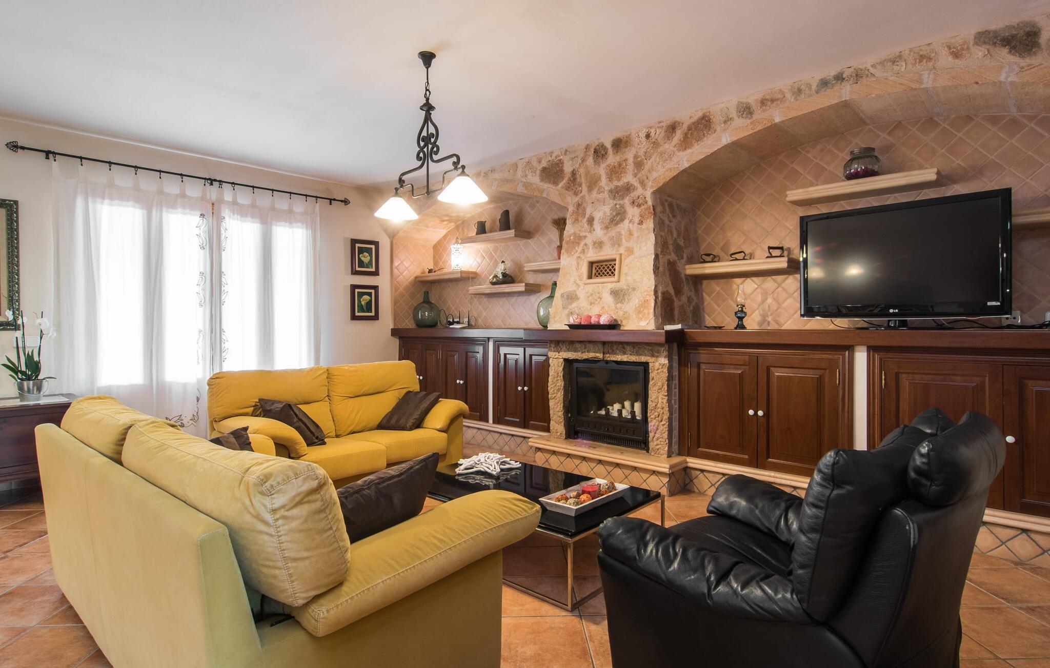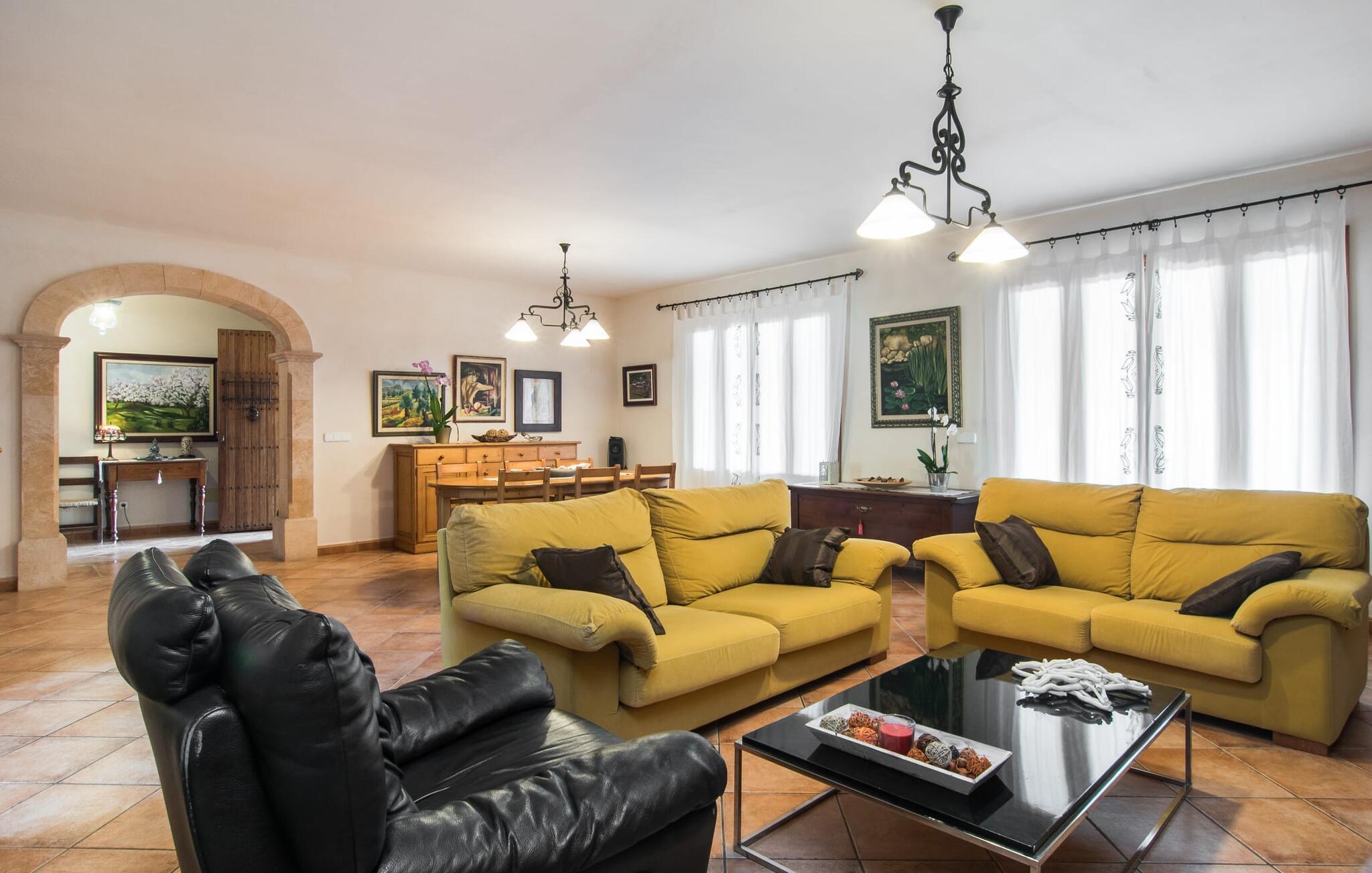 Den smukke ejendom Villa "Arbor", som byder sine gæster velkommen i en naturlig og velholdt atmosfære, kan nås via en rustik landevej. Middelhavsvegetation og omfattende terrassearealer former i væsentlig grad billedet af udendørsområdet og formidler umiddelbart en følelse af komfort og afslapning. Indbydende møbler er tilgængelige til afslapning eller spisning på de åbne og overdækkede terrasseområder. Når vejret er godt, kan I nemt spise udendørs når som helst på dagen og nyde den fantastiske udsigt i det fjerne over morgenmaden. Den enorme, 11 m lange pool varierer i dybden mellem 0,3 og 1,8 m. Her kan I nyde solen hele dagen lang på de moderne liggestole. Dette udendørs område tilbyder også en fantastisk udsigt over det indre af øen. På græsplænen ved siden af poolen er der træer, der giver skygge og inviterer jer til at slappe af, mens I nyder en behagelig brise. Carporten er unikt indrettet til udekøkken med kulovn. Her kan I fejre aftengrill og nyde lækre egnsprodukter i godt selskab. Den næste gade er lige Villanweg, som fører til en anden nabo. Når nogen går ned ad denne gade, kan der høres en lyd. Bortset fra det er der dog en fuldstændig følelse af fred og ro her. Det indre af huset i stueetagen præsenterer sig i en munter og elegant stil. Lyse vægge og terracottafarvede fliser danner en harmonisk ramme om den hyggelige indretning, belysning og dekoration. I højre halvdel af huset er de fire soveværelser og badeværelserne, til venstre for indgangen er der en rummelig stue/spisestue og et separat køkken med spisebord. På forsiden af huset er den overdækkede terrasse med udsigt over poolen. Sofaområdet har to yderst behagelige sofaer, der inviterer jer til at slappe af. På kølige aftener kan I sørge for yderligere hygge ved hjælp af åben ild. Fjernsynet med satellitmodtagelse giver underholdning, når det kræves. De runde murstensbuer skaber en rustik, individuel atmosfære. I kan spise sammen indendørs ved spisebordet ved siden af. Køkkenet er bekvemt placeret lige ved siden af, så I ikke skal rejse lange strækninger med jeres mad. Køkkenet er udstyret med alt hvad I behøver til daglige behov, herunder en kedel, en espressomaskine og en filterkaffemaskine. De fire soveværelser er komfortabelt designet. Unødvendige dekorationer blev bevidst undgået, så disse rum udstråler en afslappende effekt. I vil finde afslappende søvn i komfortable senge, hvoraf to er 1,50x1,90m og de to andre er 2,00x2,00m. Myggenet er tilgængelige og kan bruges om nødvendigt. De to badeværelser med naturligt lys er rummelige og hver udstyret med bruser eller badekar. Strygefaciliteter og hårtørrer er tilgængelige på stedet. Manacors centrum ligger kun 5 minutter væk i bil. Det ugentlige marked finder sted der hver mandag, hvor I kan købe friske regionale produkter. Nogle strande i nærheden er rigtige insidertips og fri for udvikling. Porto Cristo ligger cirka 14 km væk. Der finder I en smuk strand med lavvandet adgang til havet. Her er også en attraktiv promenade. Efter en begivenhedsrig dag fuld af aktiviteter, kan I vende tilbage til den vidunderlige idyl i jeres "Arbor"-villa og afslutte dagen, lige som I ønsker det. Den meget idylliske villa "Arbor" ligger i den smukke østlige del af øen, kun 3 km nord for Manacor. I finder gode indkøbsmuligheder både der og i Sant Lllorenc (9 km væk). En meget velholdt og rustik atmosfære præger denne ejendom, samt den vidunderlige fjerne udsigt, som I kan nyde her. En af de nærmeste smukke strande er Cala Varques, som ligger omkring 15 km væk.