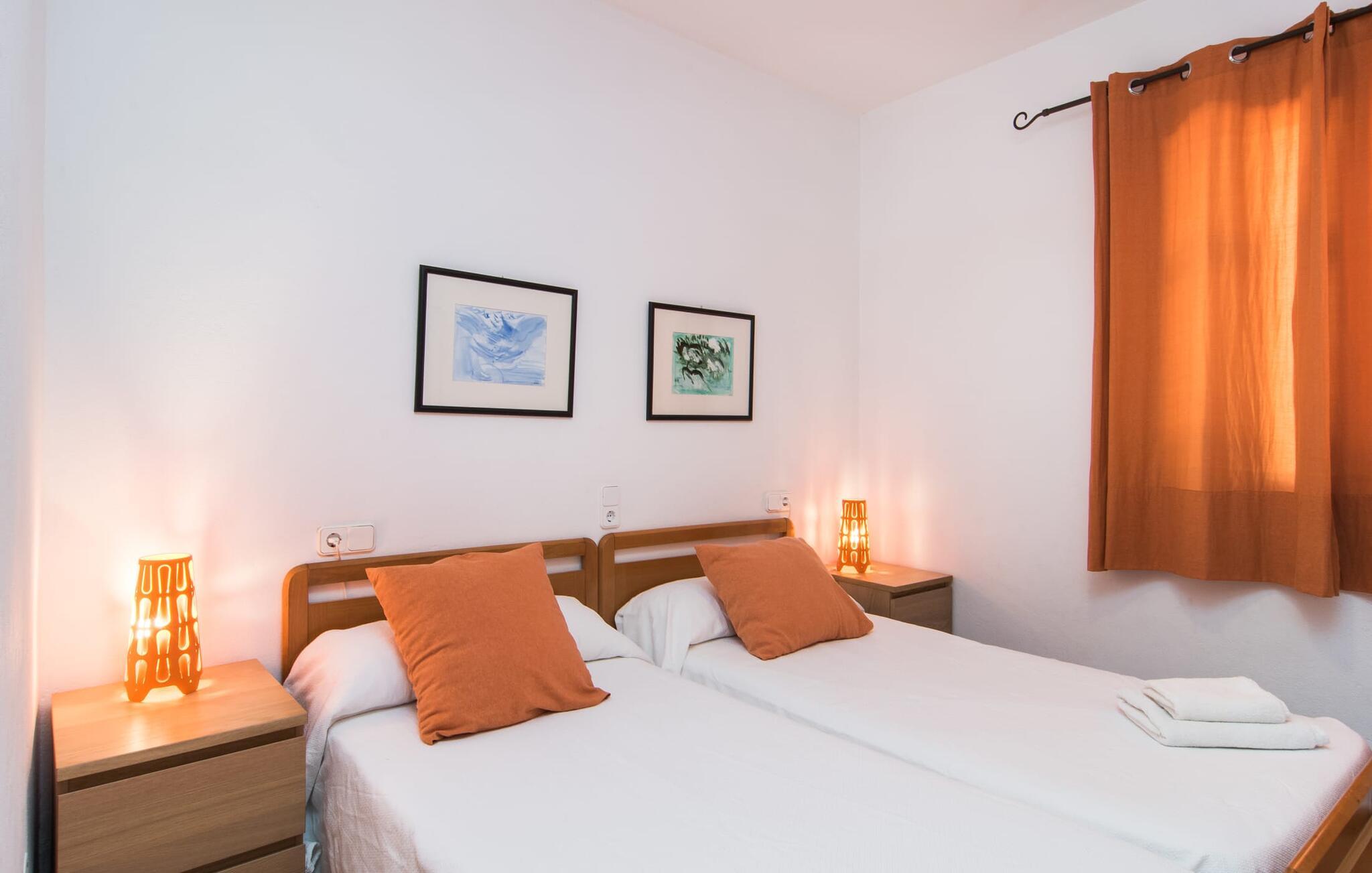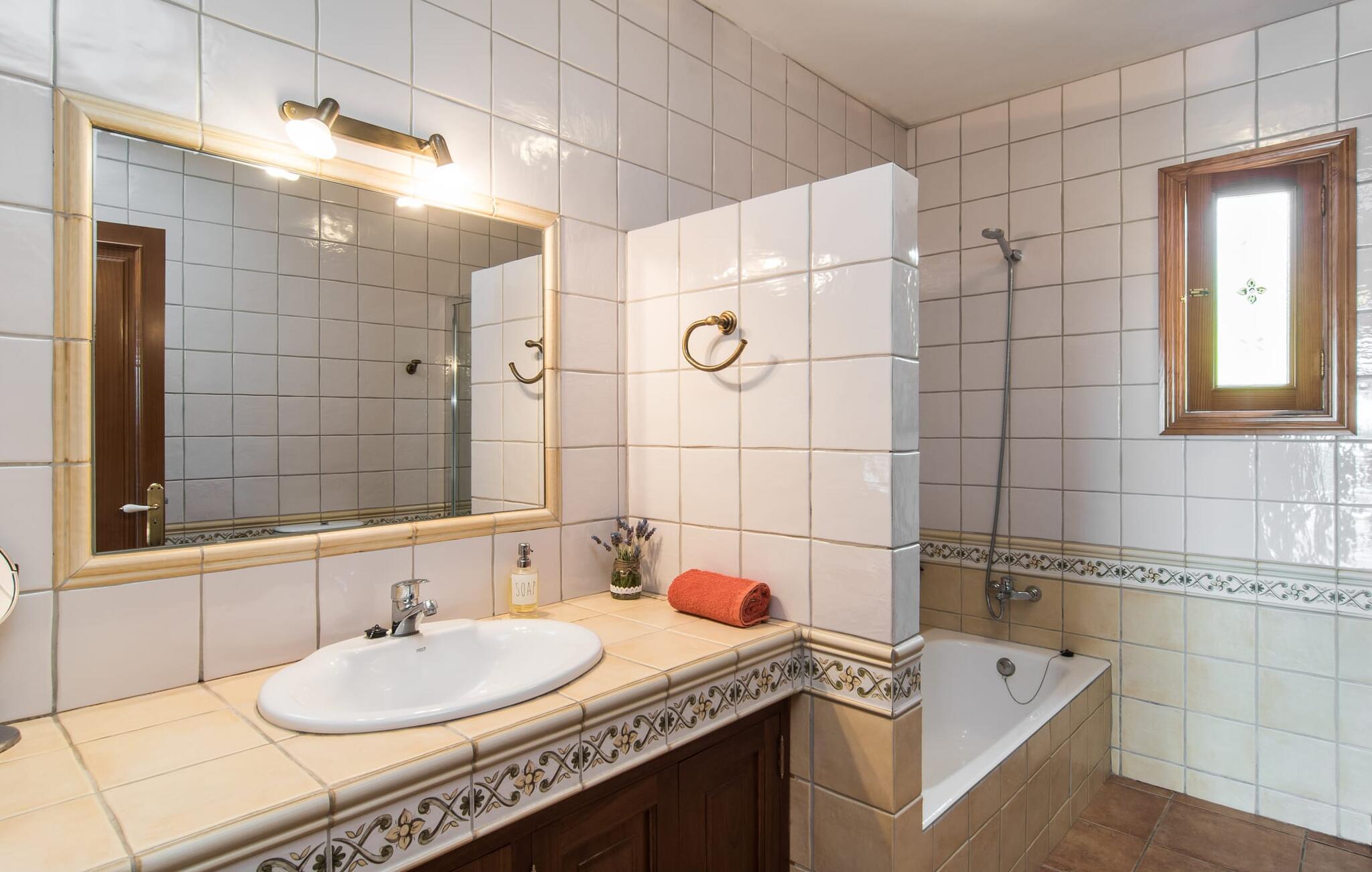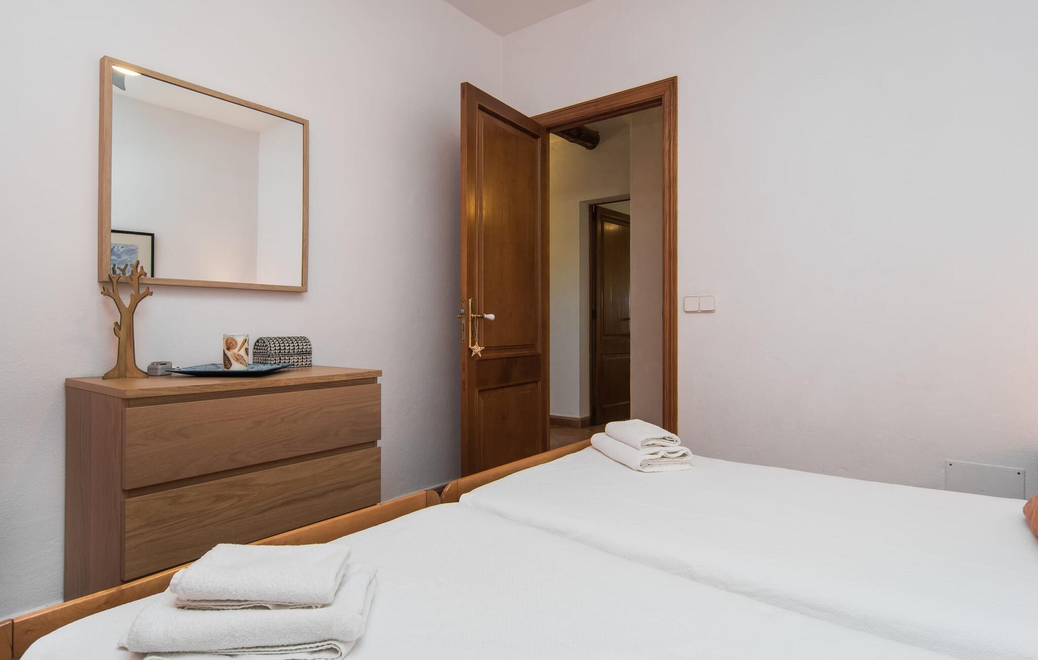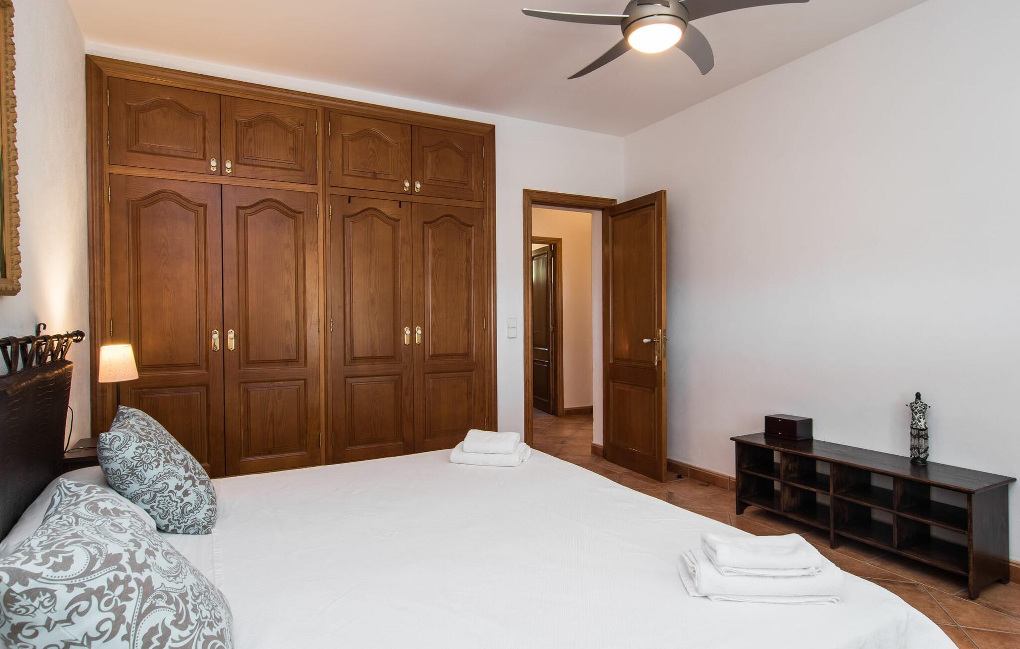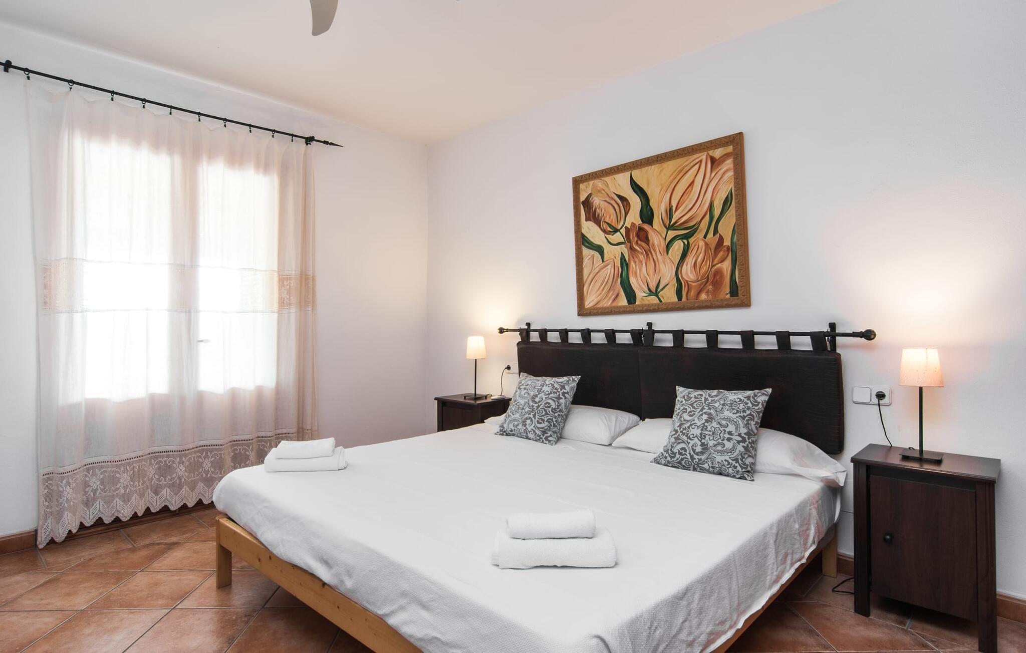 Den smukke ejendom Villa "Arbor", som byder sine gæster velkommen i en naturlig og velholdt atmosfære, kan nås via en rustik landevej. Middelhavsvegetation og omfattende terrassearealer former i væsentlig grad billedet af udendørsområdet og formidler umiddelbart en følelse af komfort og afslapning. Indbydende møbler er tilgængelige til afslapning eller spisning på de åbne og overdækkede terrasseområder. Når vejret er godt, kan I nemt spise udendørs når som helst på dagen og nyde den fantastiske udsigt i det fjerne over morgenmaden. Den enorme, 11 m lange pool varierer i dybden mellem 0,3 og 1,8 m. Her kan I nyde solen hele dagen lang på de moderne liggestole. Dette udendørs område tilbyder også en fantastisk udsigt over det indre af øen. På græsplænen ved siden af poolen er der træer, der giver skygge og inviterer jer til at slappe af, mens I nyder en behagelig brise. Carporten er unikt indrettet til udekøkken med kulovn. Her kan I fejre aftengrill og nyde lækre egnsprodukter i godt selskab. Den næste gade er lige Villanweg, som fører til en anden nabo. Når nogen går ned ad denne gade, kan der høres en lyd. Bortset fra det er der dog en fuldstændig følelse af fred og ro her. Det indre af huset i stueetagen præsenterer sig i en munter og elegant stil. Lyse vægge og terracottafarvede fliser danner en harmonisk ramme om den hyggelige indretning, belysning og dekoration. I højre halvdel af huset er de fire soveværelser og badeværelserne, til venstre for indgangen er der en rummelig stue/spisestue og et separat køkken med spisebord. På forsiden af huset er den overdækkede terrasse med udsigt over poolen. Sofaområdet har to yderst behagelige sofaer, der inviterer jer til at slappe af. På kølige aftener kan I sørge for yderligere hygge ved hjælp af åben ild. Fjernsynet med satellitmodtagelse giver underholdning, når det kræves. De runde murstensbuer skaber en rustik, individuel atmosfære. I kan spise sammen indendørs ved spisebordet ved siden af. Køkkenet er bekvemt placeret lige ved siden af, så I ikke skal rejse lange strækninger med jeres mad. Køkkenet er udstyret med alt hvad I behøver til daglige behov, herunder en kedel, en espressomaskine og en filterkaffemaskine. De fire soveværelser er komfortabelt designet. Unødvendige dekorationer blev bevidst undgået, så disse rum udstråler en afslappende effekt. I vil finde afslappende søvn i komfortable senge, hvoraf to er 1,50x1,90m og de to andre er 2,00x2,00m. Myggenet er tilgængelige og kan bruges om nødvendigt. De to badeværelser med naturligt lys er rummelige og hver udstyret med bruser eller badekar. Strygefaciliteter og hårtørrer er tilgængelige på stedet. Manacors centrum ligger kun 5 minutter væk i bil. Det ugentlige marked finder sted der hver mandag, hvor I kan købe friske regionale produkter. Nogle strande i nærheden er rigtige insidertips og fri for udvikling. Porto Cristo ligger cirka 14 km væk. Der finder I en smuk strand med lavvandet adgang til havet. Her er også en attraktiv promenade. Efter en begivenhedsrig dag fuld af aktiviteter, kan I vende tilbage til den vidunderlige idyl i jeres "Arbor"-villa og afslutte dagen, lige som I ønsker det. Den meget idylliske villa "Arbor" ligger i den smukke østlige del af øen, kun 3 km nord for Manacor. I finder gode indkøbsmuligheder både der og i Sant Lllorenc (9 km væk). En meget velholdt og rustik atmosfære præger denne ejendom, samt den vidunderlige fjerne udsigt, som I kan nyde her. En af de nærmeste smukke strande er Cala Varques, som ligger omkring 15 km væk.
