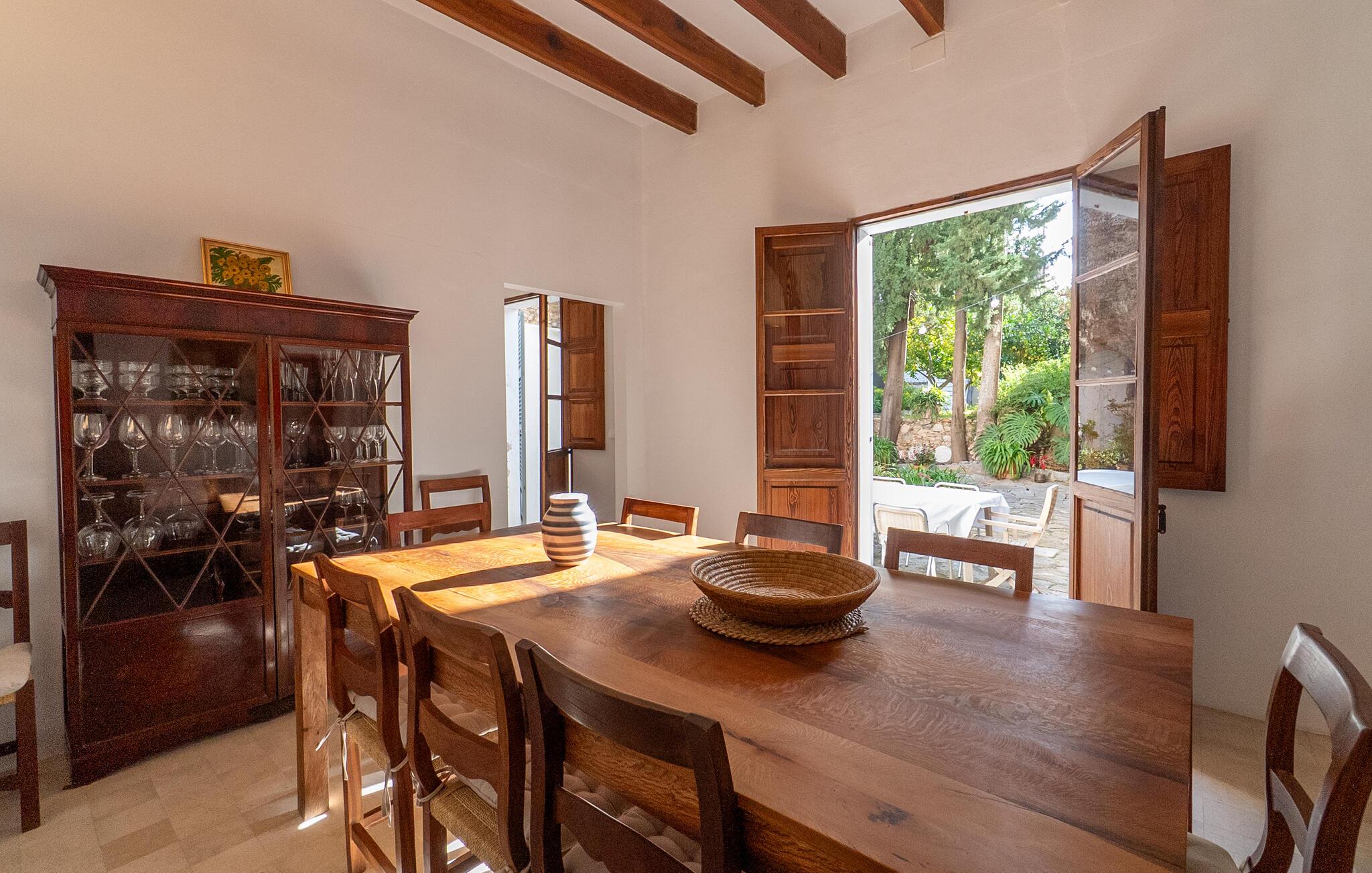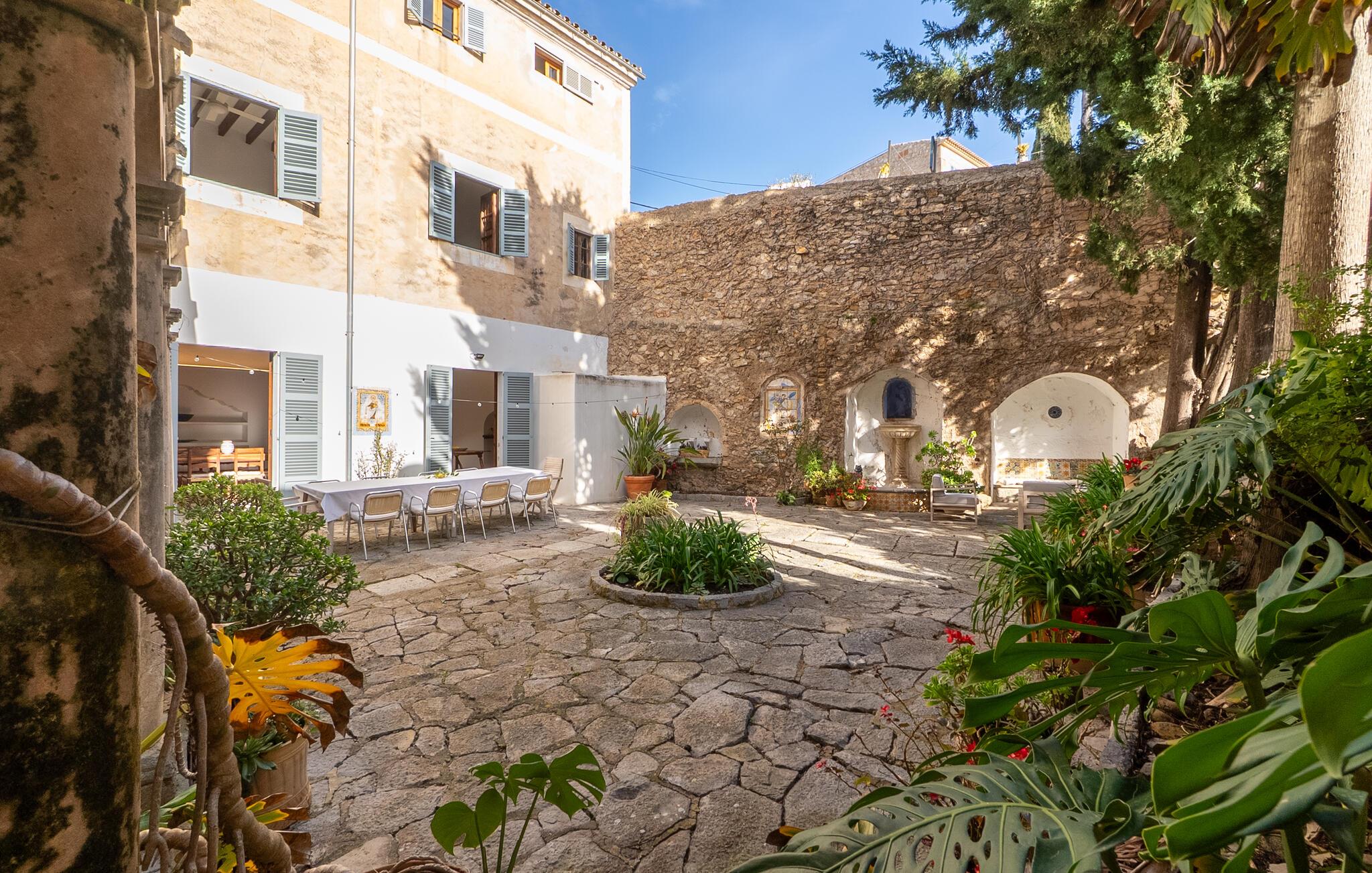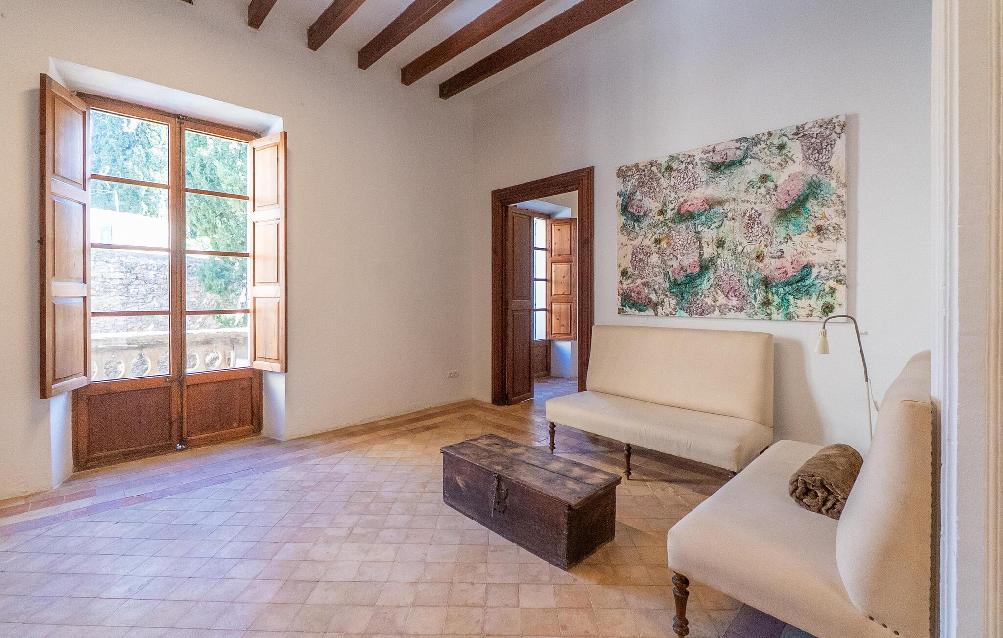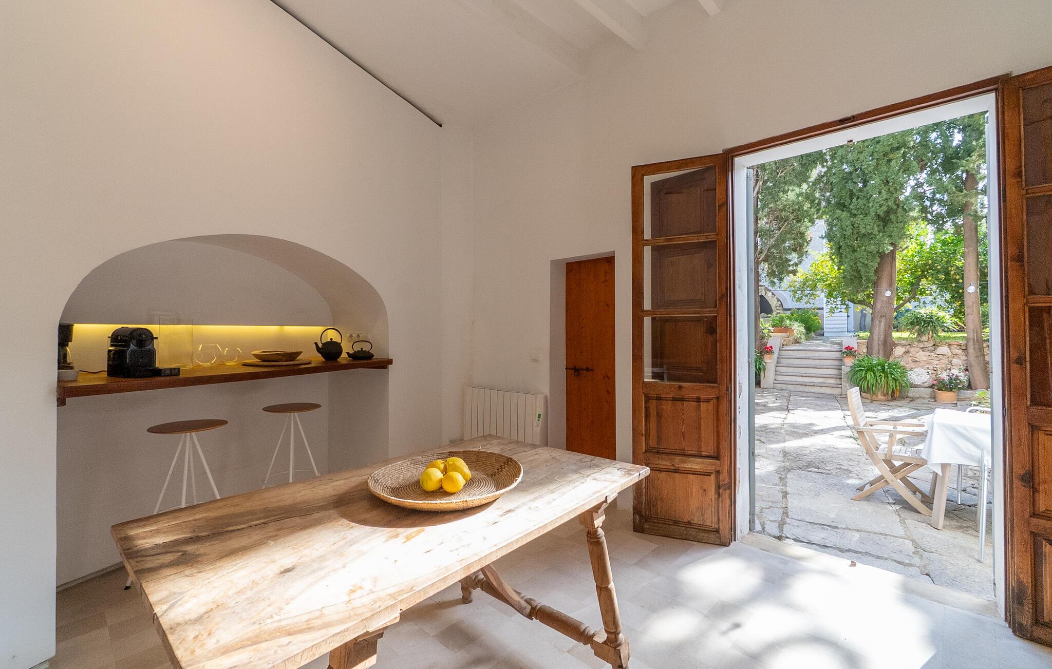 Nyd et uforglemmeligt ophold i dette stilfulde feriehus på Mallorca. Dette hus er omgivet af en smuk have og tilbyder jer historisk stemning og moderne komfort. Træd ind i det elegante interiør med højt til loftet, synlige træbjælker og stilfulde møbler. Find jer godt til rette i de rummelige opholdsområder og slap af i den store sofa. Det rummelige køkken lægger op til at tilberede regionale specialiteter sammen. Brug de mange store områder i huset til jeres morgenyogaøvelser.