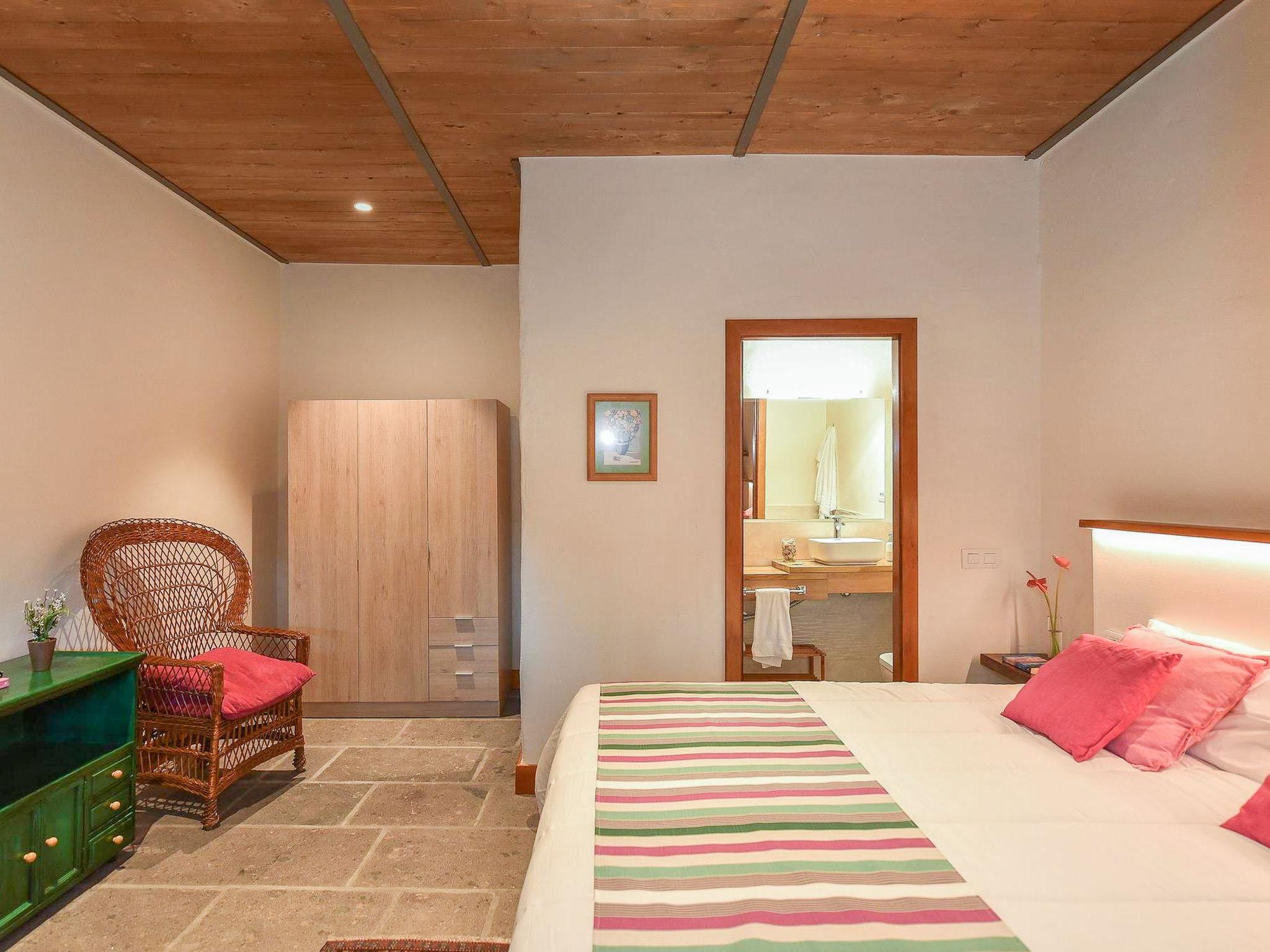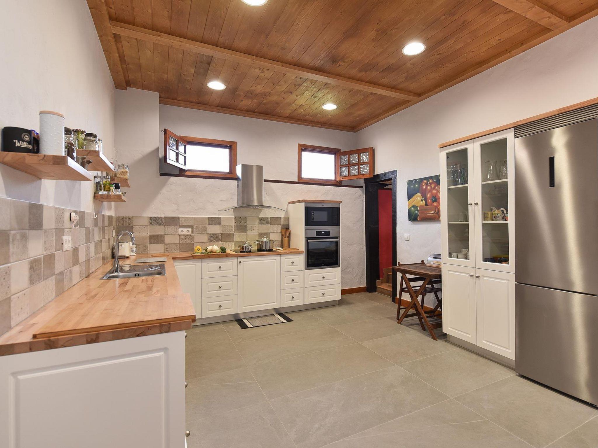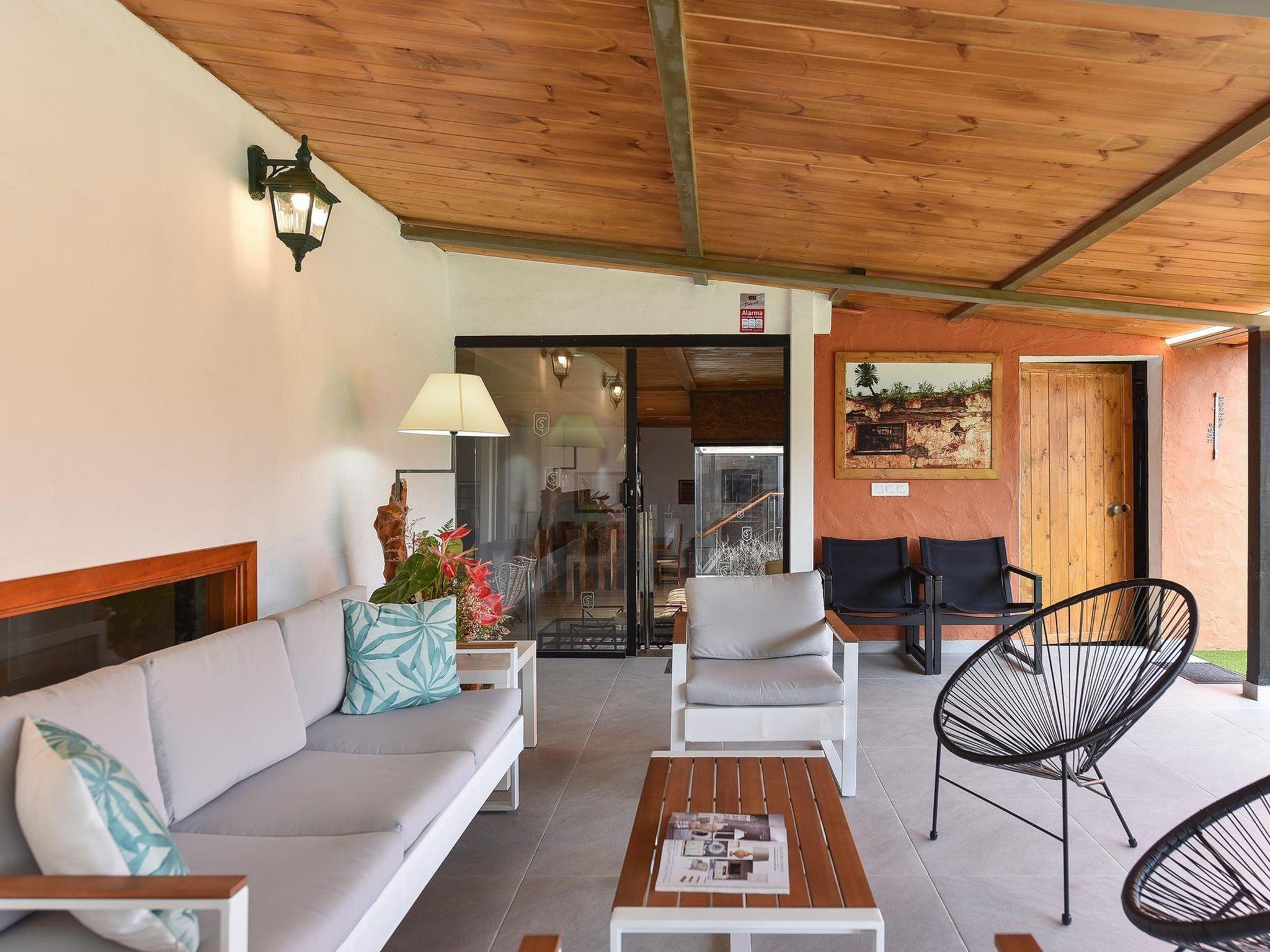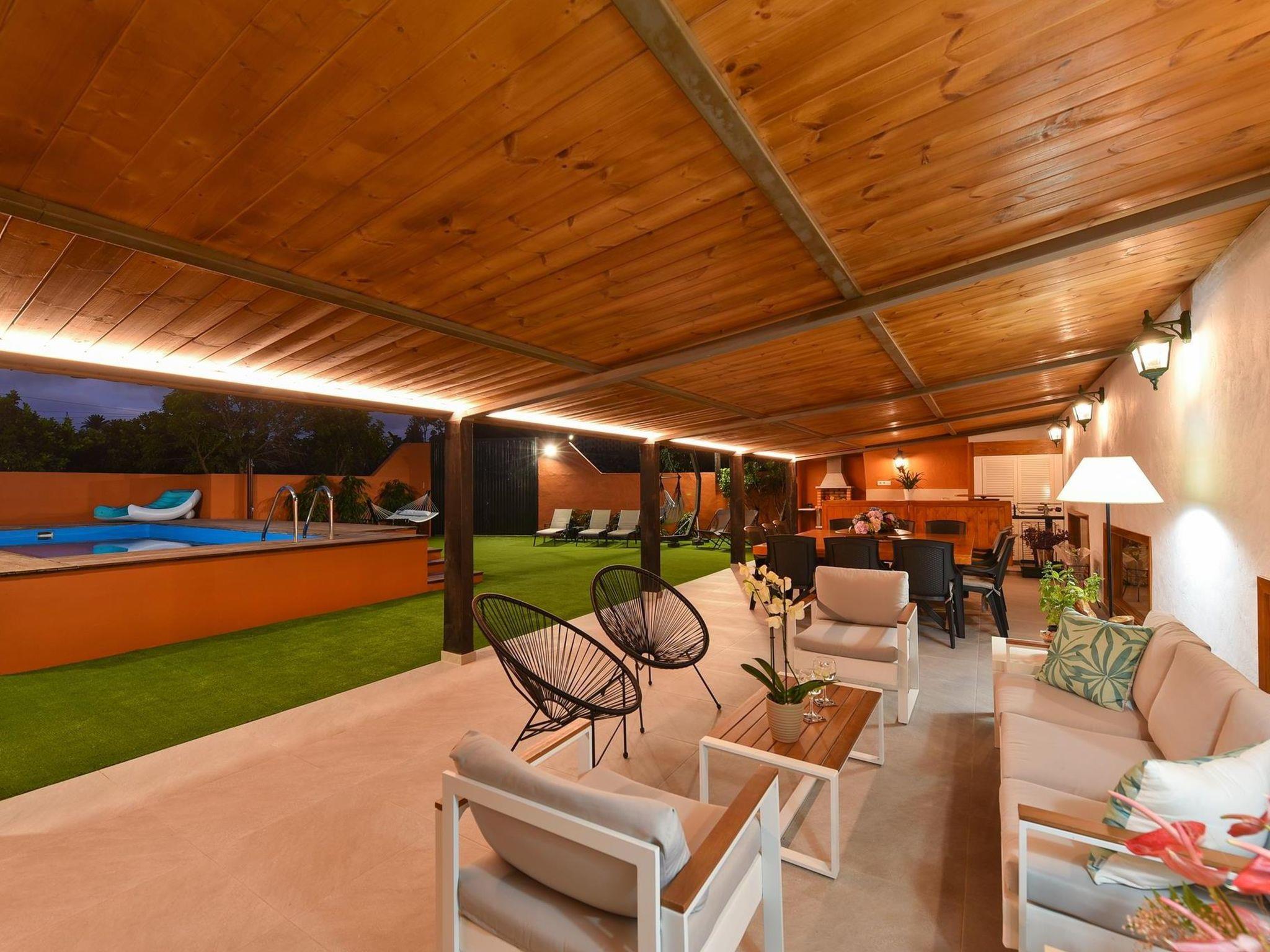 "Finca La Casona de Abajo Arucas", 6-room house 280 m2. Comfortable and rustic furnishings: living/dining room with dining table and digital TV. Exit to the patio. 4 rooms, each room with 1 french bed and shower/WC. 1 room with 1 french bed. Kitchen (oven, dishwasher, 4 ceramic glass hob hotplates, toaster, kettle, microwave, freezer, electric coffee machine) with dining table. Shower/WC. Patio. Terrace furniture, barbecue, deck chairs. View of the swimming pool and the garden. Facilities: washing machine, safe, iron, children's high chair, baby cot for up to 2 year olds, hair dryer. Internet (WiFi, free). Please note: non-smoking house. 2022-T16283 // Reg. Nr.: ESFCTU0000350100001504340000000000000VV-35-1-00187819