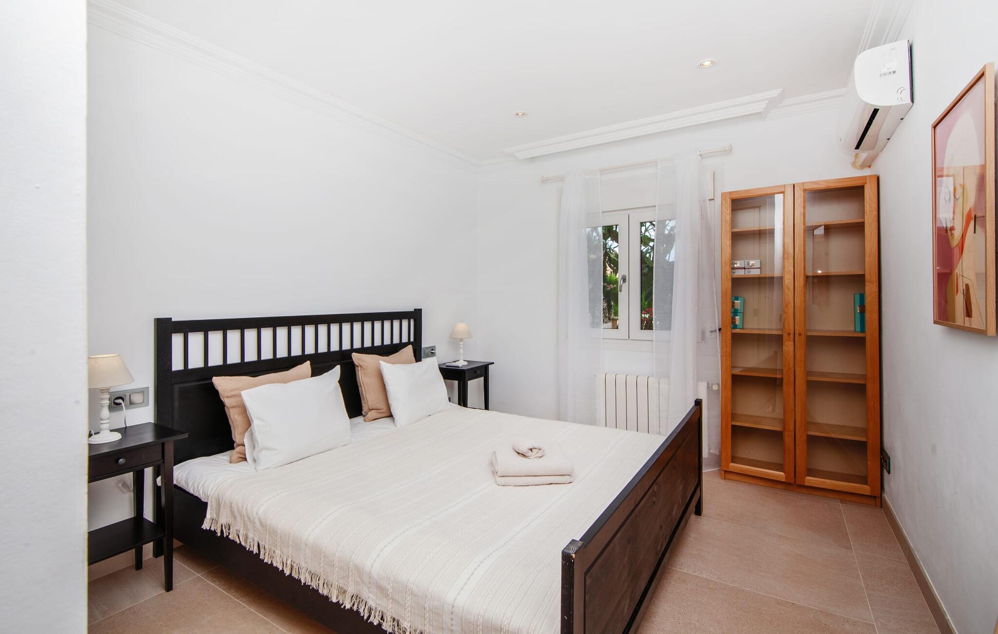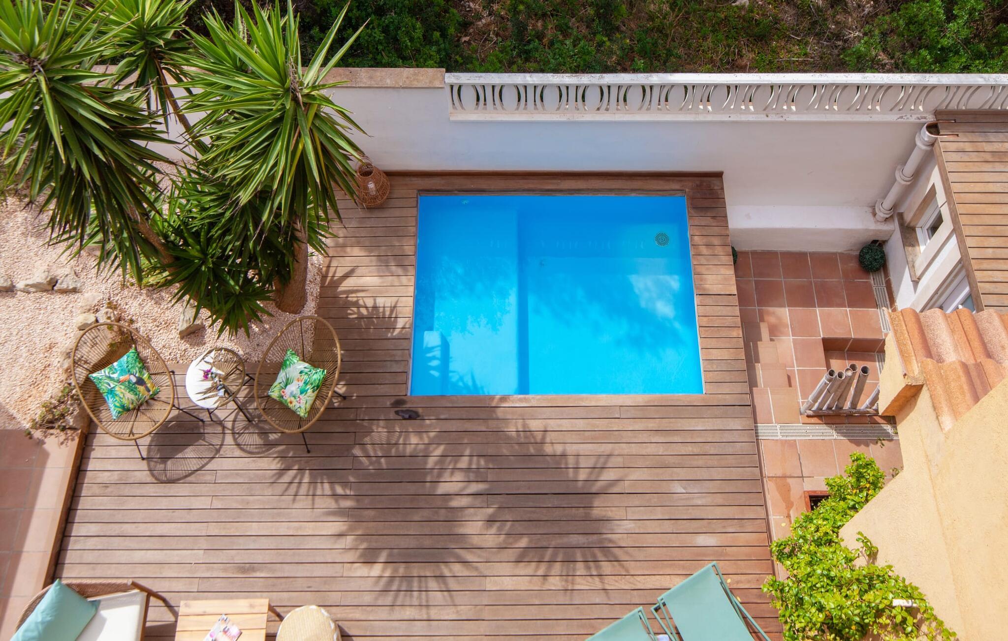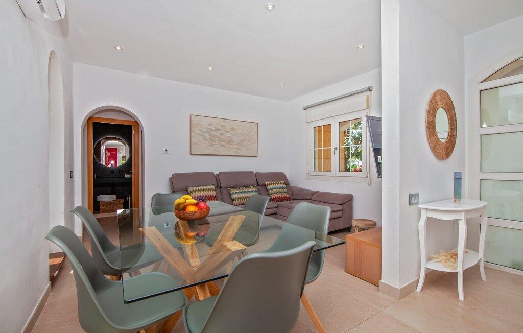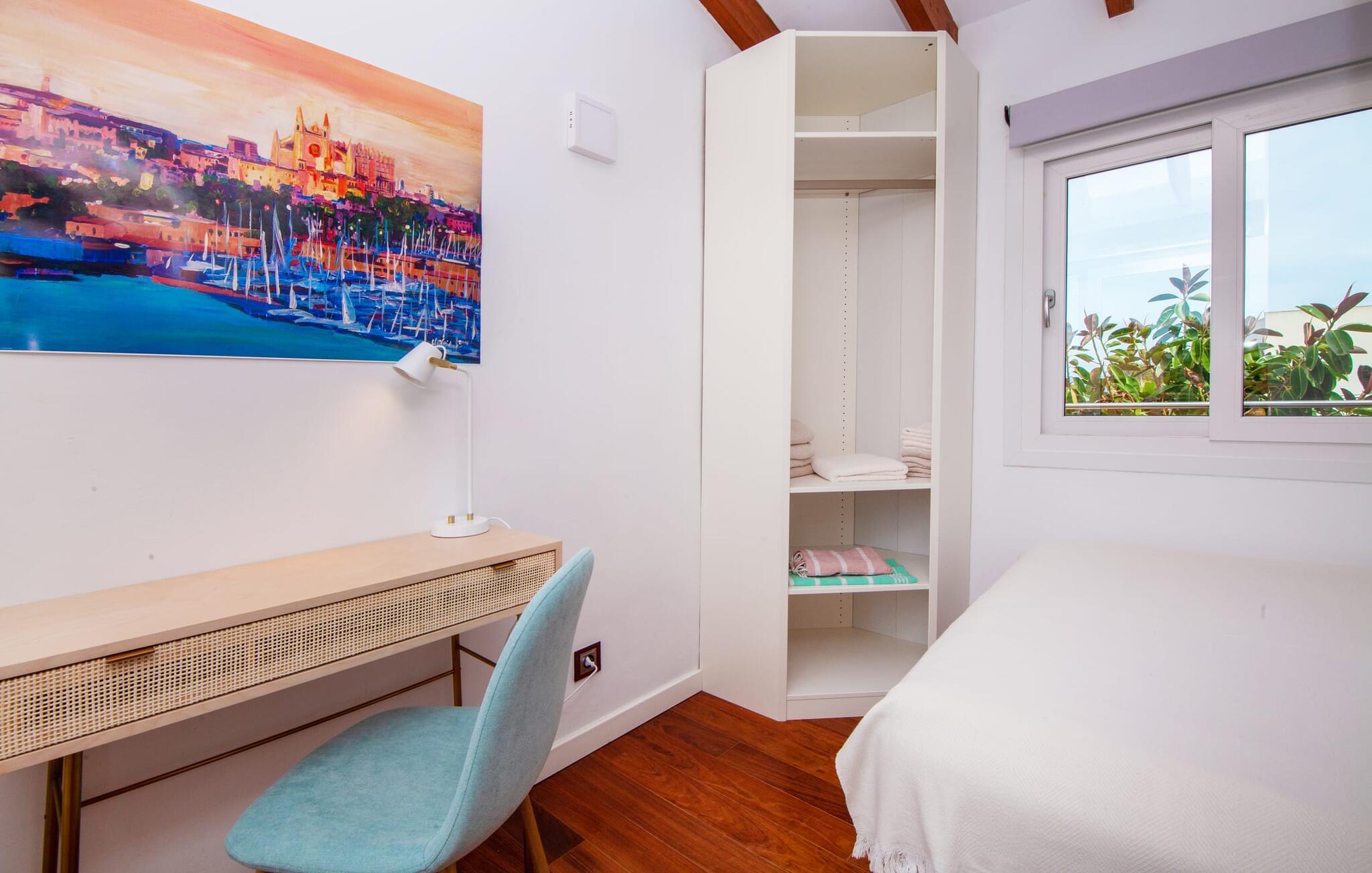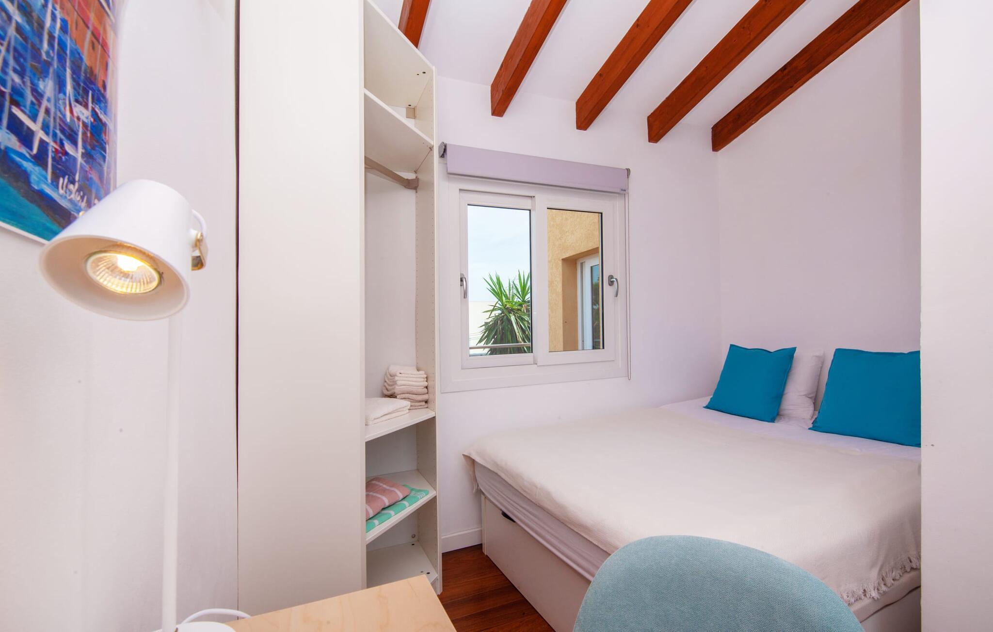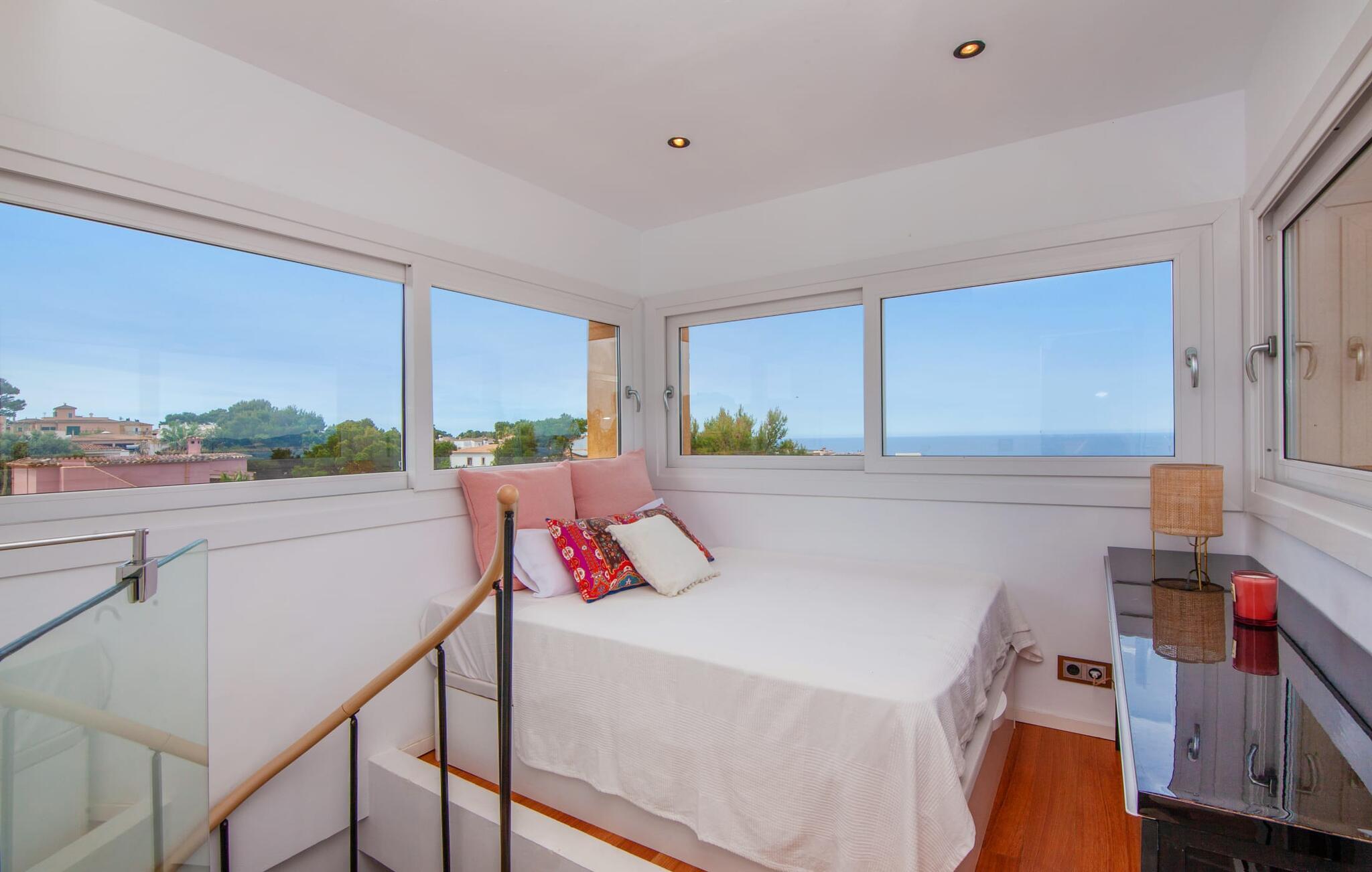 Villaen "Bahia Azul" lover afslappet ferie i en rigtig sommer-oasevilla med nogle unikke højdepunkter i alle boligområder. Den vellykkede kombination af en kreativ indretningsstil af høj kvalitet og et smagfuldt farvevalg er allestedsnærværende i hele huset og formidler glæde og optimisme. Den eksklusive have byder på et smukt afslapningsområde med en lille pool, en Bali seng og komfortable teakgulve. Der er også en indbydende udendørs spiseplads udstyret med en gasgrill. Stuen med spiseplads og et veludstyret amerikansk køkken giver direkte adgang til poolterrassen. Endvidere er der i stueetagen et soveværelse med dobbeltseng og et elegant badeværelse med bruser. En stilfuld iroko-trappe fører op til første sal. På dette niveau er der endnu et soveværelse og et rummeligt master bedroom med en-suite badeværelse, hydromassage badekar og en smuk terrasse med havudsigt. En lille vindeltrappe fører jer til endnu et charmerende soveværelse med en panoramaudsigt, der minder om et fyrtårn. Lige ved siden af kan I få adgang til en smuk tagterrasse med en behagelig liggestol og en fantastisk udsigt over Palma-bugten til Tramuntana-bjergene. Villaen "Bahia Azul" ligger i et velholdt boligområde på Bahía Grans klippekyst, cirka 30 minutter i bil fra Palmas centrum. Der er flere små klippefyldte bugter i gåafstand fra villaen. De nærmeste sandstrande er Cala Pi (ca. 20 km) og de smukke naturstrande Sa Rápita (ca. 30 km) og Es Trenc (ca. 35 km). Bemærk venligst, at denne ejendom ikke accepterer ungdomsgrupper eller polterabender. En ungdomsgruppe på denne ejendom består af personer på 28 år eller derunder. Book ikke denne ejendom, hvis I er en ungdomsgruppe eller polterabend, da jeres reservation vil blive afvist, når den er booket, hvilket også kan være tilfældet ved ankomst til ejendommen eller under jeres ophold, og I vil ikke modtage en refusion