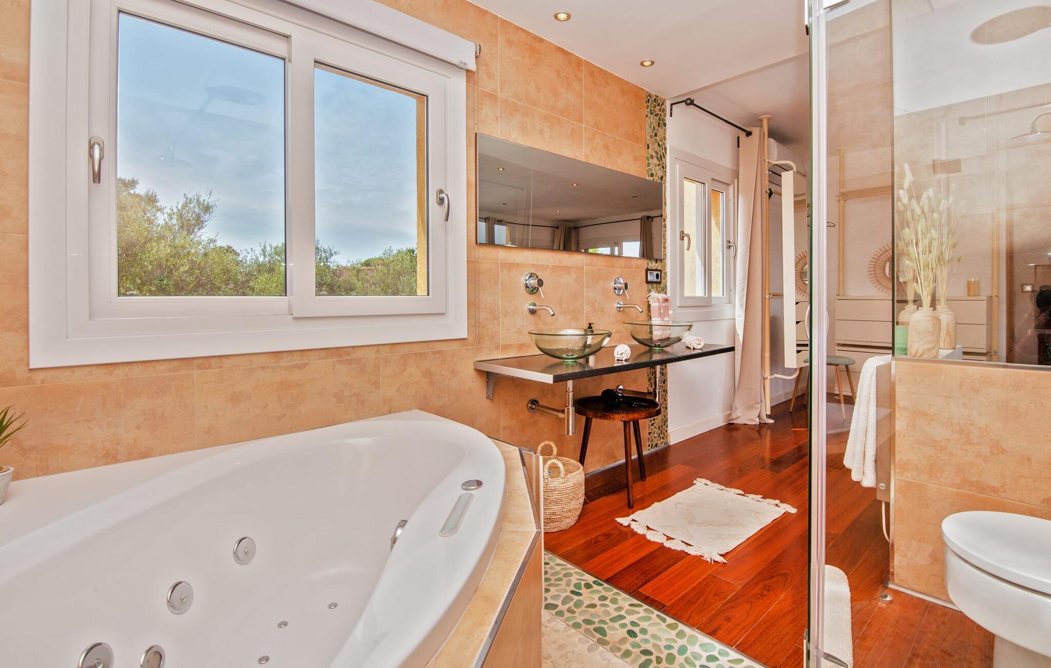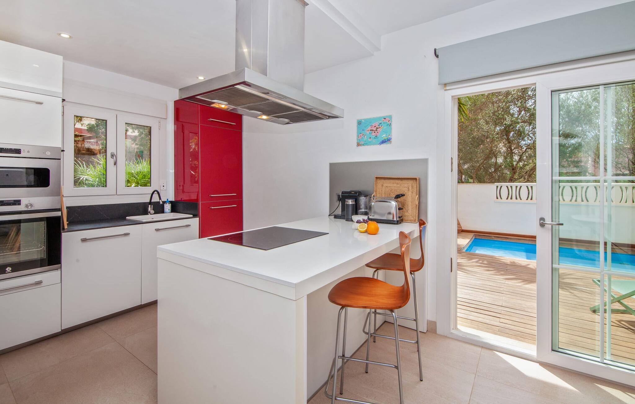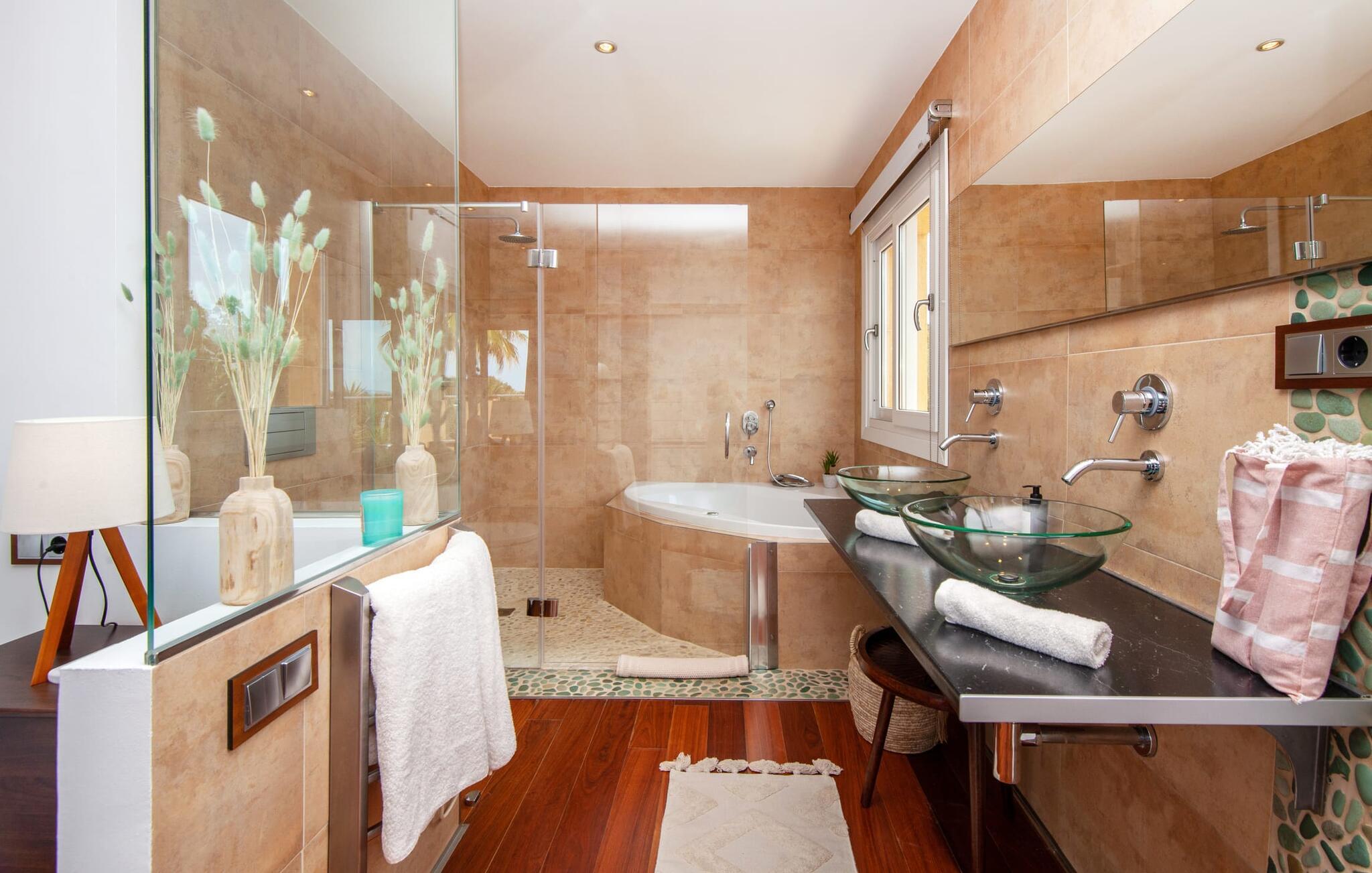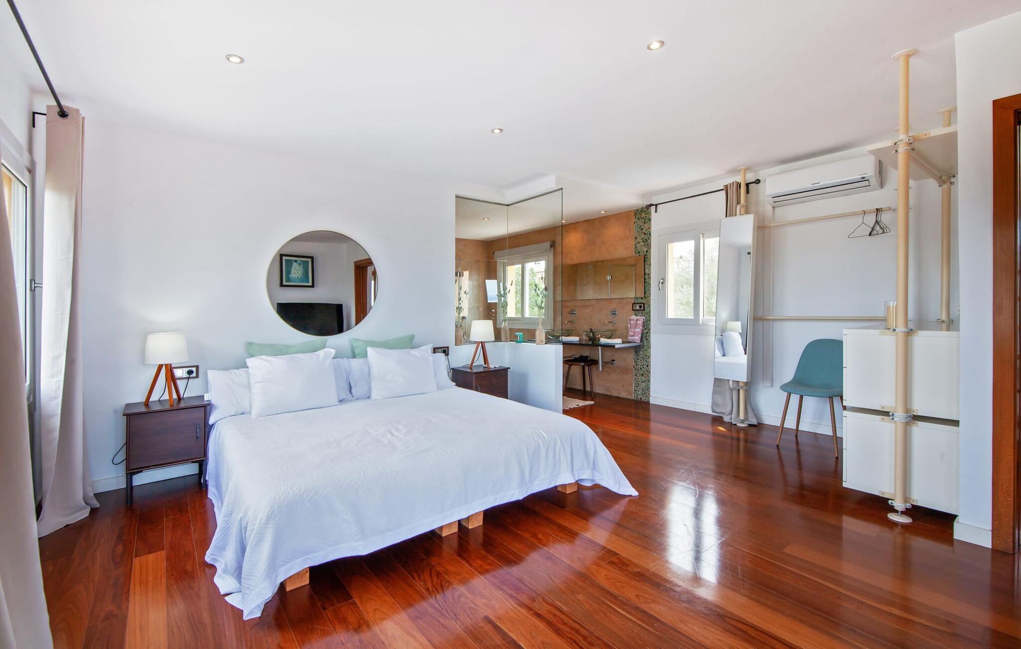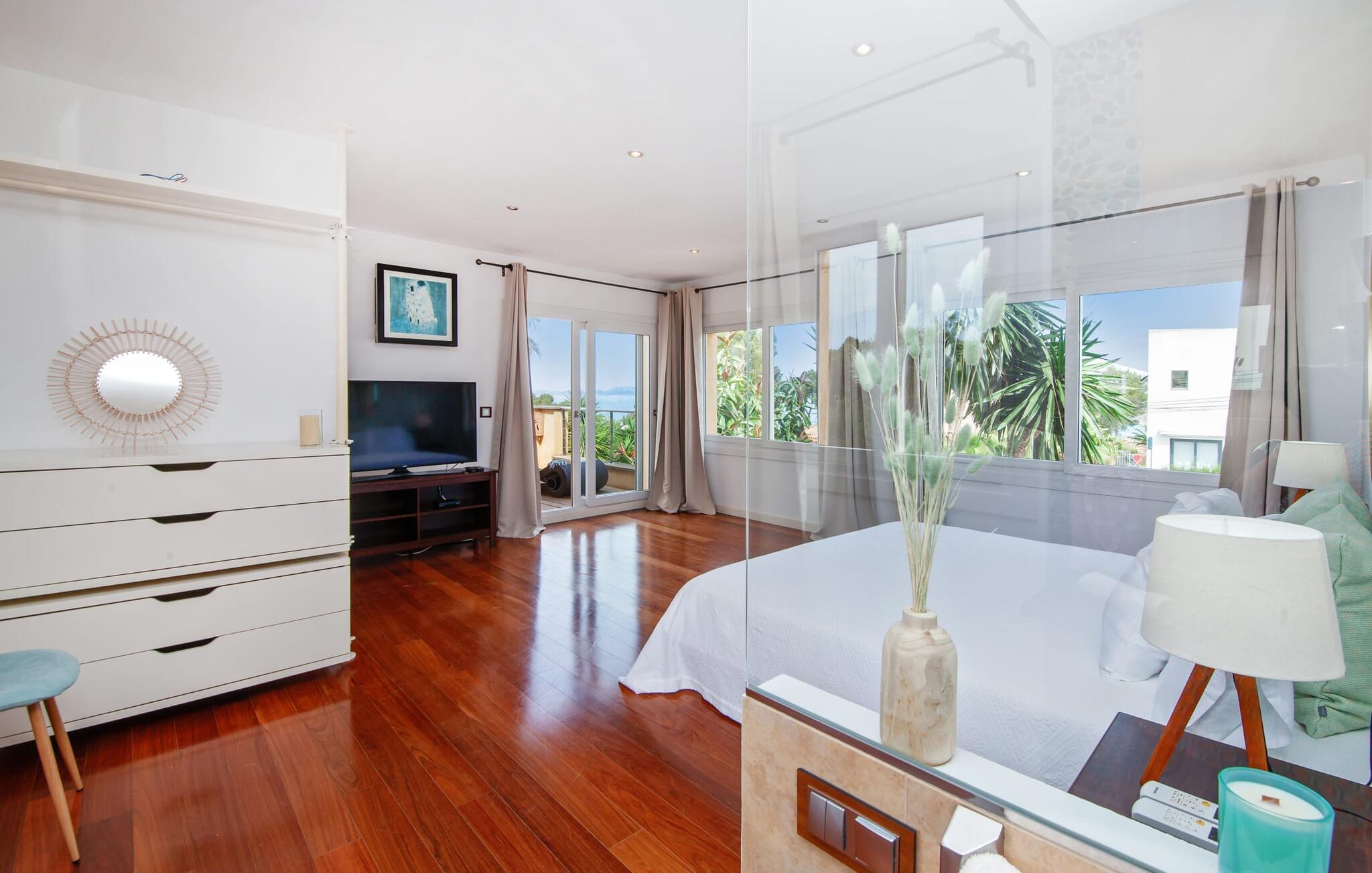 Villaen "Bahia Azul" lover afslappet ferie i en rigtig sommer-oasevilla med nogle unikke højdepunkter i alle boligområder. Den vellykkede kombination af en kreativ indretningsstil af høj kvalitet og et smagfuldt farvevalg er allestedsnærværende i hele huset og formidler glæde og optimisme. Den eksklusive have byder på et smukt afslapningsområde med en lille pool, en Bali seng og komfortable teakgulve. Der er også en indbydende udendørs spiseplads udstyret med en gasgrill. Stuen med spiseplads og et veludstyret amerikansk køkken giver direkte adgang til poolterrassen. Endvidere er der i stueetagen et soveværelse med dobbeltseng og et elegant badeværelse med bruser. En stilfuld iroko-trappe fører op til første sal. På dette niveau er der endnu et soveværelse og et rummeligt master bedroom med en-suite badeværelse, hydromassage badekar og en smuk terrasse med havudsigt. En lille vindeltrappe fører jer til endnu et charmerende soveværelse med en panoramaudsigt, der minder om et fyrtårn. Lige ved siden af kan I få adgang til en smuk tagterrasse med en behagelig liggestol og en fantastisk udsigt over Palma-bugten til Tramuntana-bjergene. Villaen "Bahia Azul" ligger i et velholdt boligområde på Bahía Grans klippekyst, cirka 30 minutter i bil fra Palmas centrum. Der er flere små klippefyldte bugter i gåafstand fra villaen. De nærmeste sandstrande er Cala Pi (ca. 20 km) og de smukke naturstrande Sa Rápita (ca. 30 km) og Es Trenc (ca. 35 km). Bemærk venligst, at denne ejendom ikke accepterer ungdomsgrupper eller polterabender. En ungdomsgruppe på denne ejendom består af personer på 28 år eller derunder. Book ikke denne ejendom, hvis I er en ungdomsgruppe eller polterabend, da jeres reservation vil blive afvist, når den er booket, hvilket også kan være tilfældet ved ankomst til ejendommen eller under jeres ophold, og I vil ikke modtage en refusion