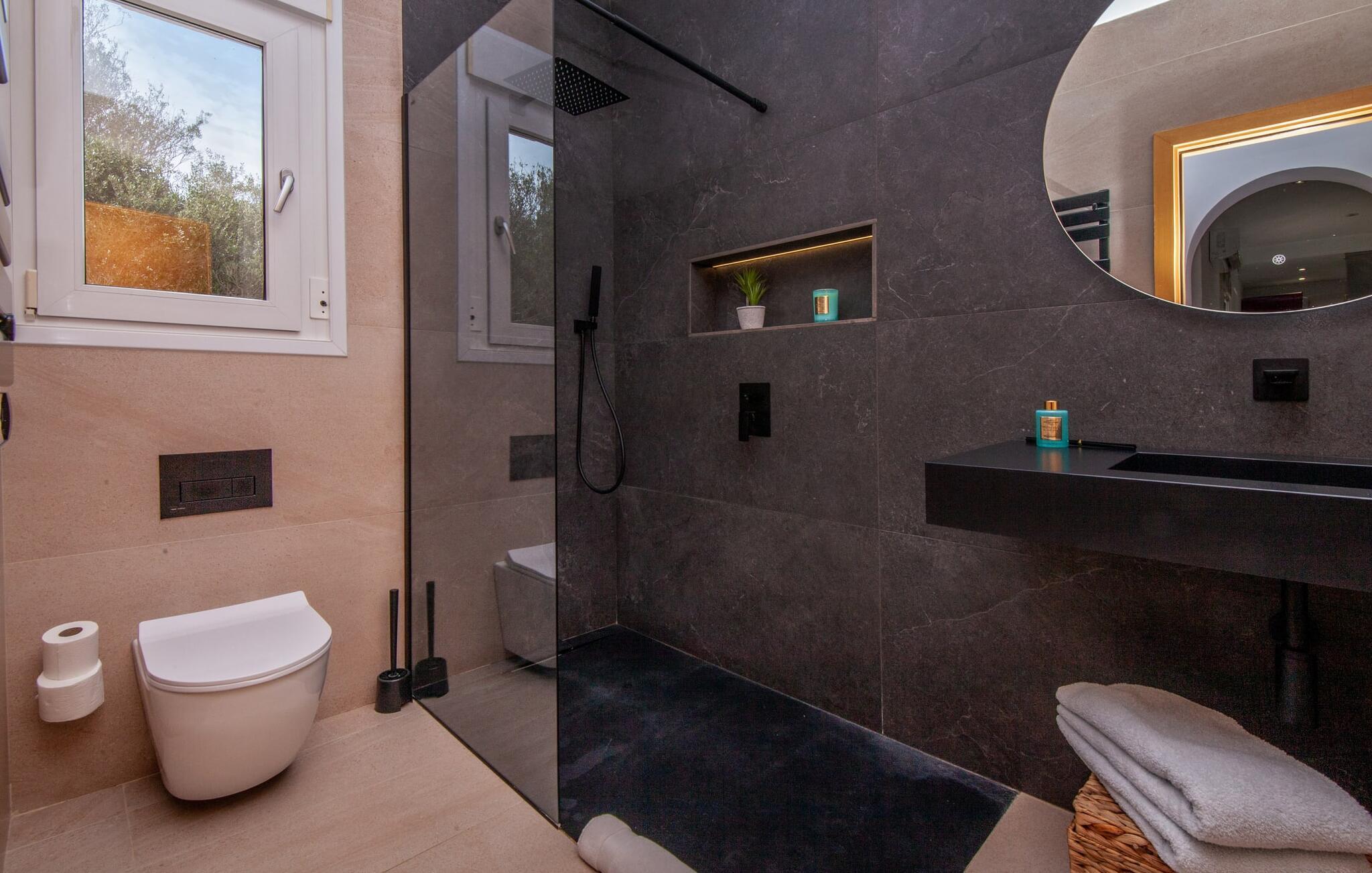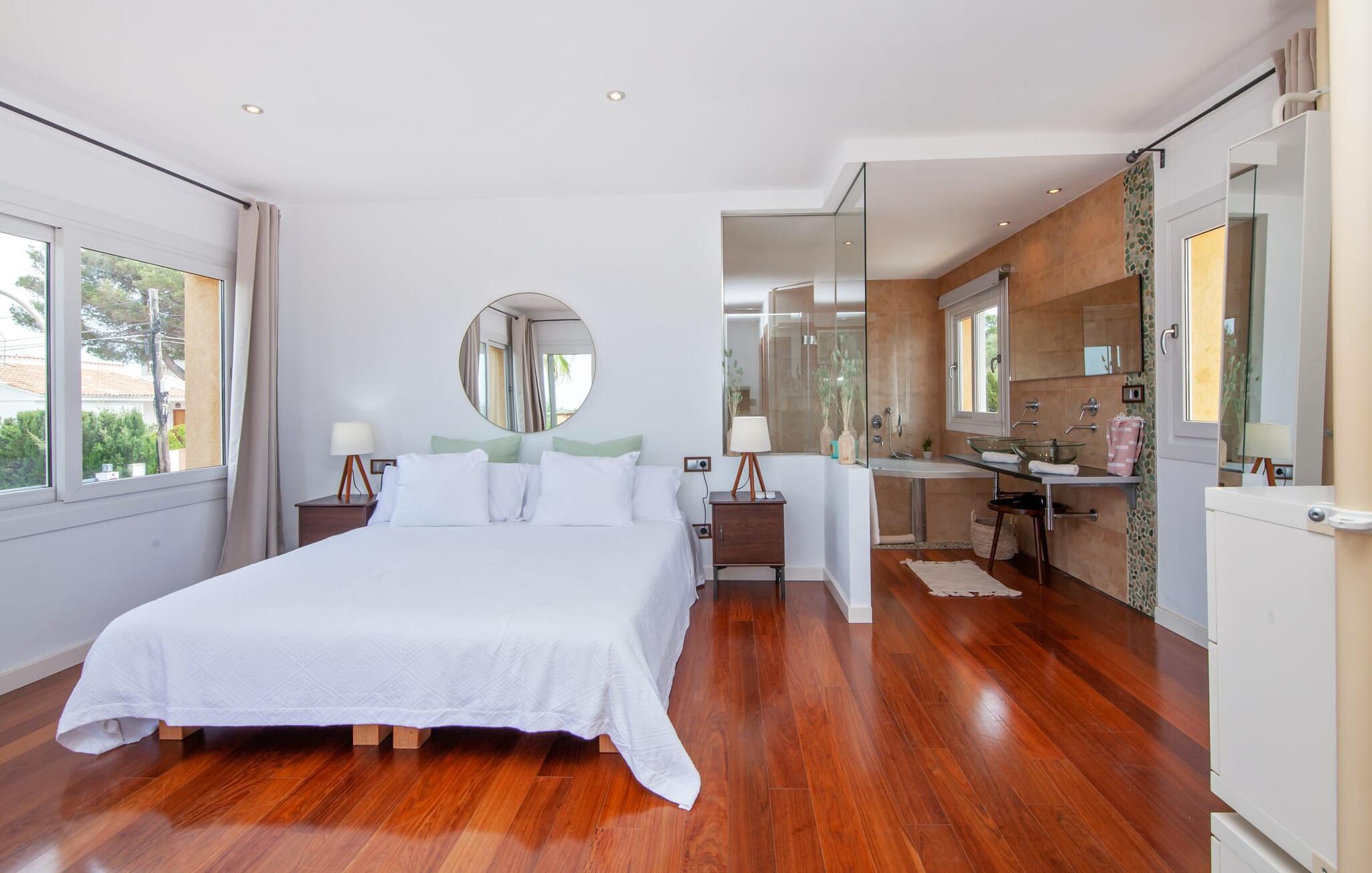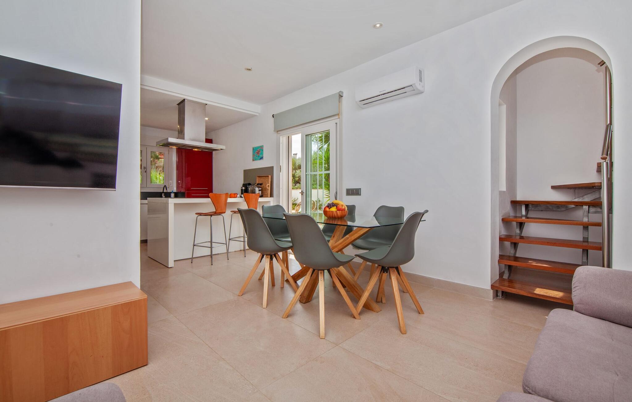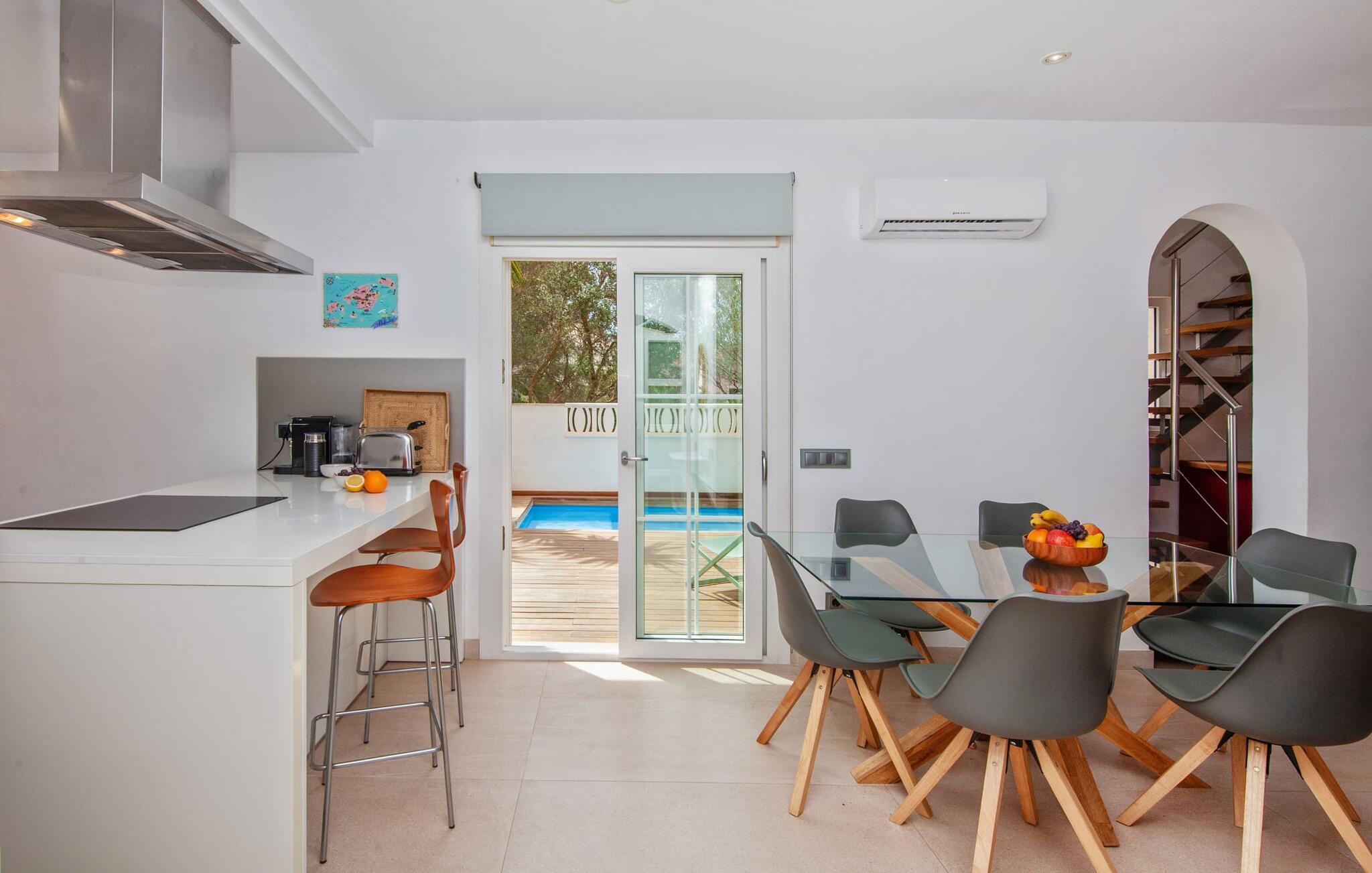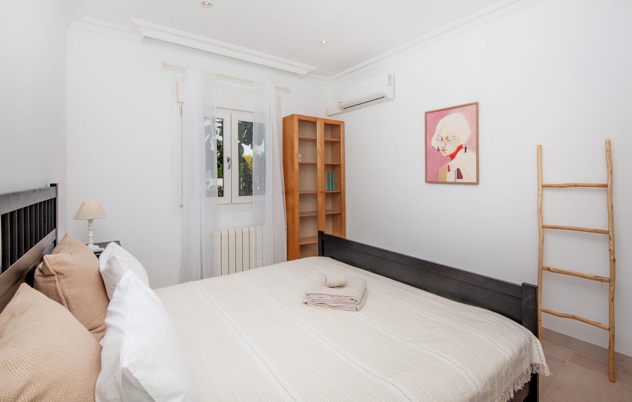 Villaen "Bahia Azul" lover afslappet ferie i en rigtig sommer-oasevilla med nogle unikke højdepunkter i alle boligområder. Den vellykkede kombination af en kreativ indretningsstil af høj kvalitet og et smagfuldt farvevalg er allestedsnærværende i hele huset og formidler glæde og optimisme. Den eksklusive have byder på et smukt afslapningsområde med en lille pool, en Bali seng og komfortable teakgulve. Der er også en indbydende udendørs spiseplads udstyret med en gasgrill. Stuen med spiseplads og et veludstyret amerikansk køkken giver direkte adgang til poolterrassen. Endvidere er der i stueetagen et soveværelse med dobbeltseng og et elegant badeværelse med bruser. En stilfuld iroko-trappe fører op til første sal. På dette niveau er der endnu et soveværelse og et rummeligt master bedroom med en-suite badeværelse, hydromassage badekar og en smuk terrasse med havudsigt. En lille vindeltrappe fører jer til endnu et charmerende soveværelse med en panoramaudsigt, der minder om et fyrtårn. Lige ved siden af kan I få adgang til en smuk tagterrasse med en behagelig liggestol og en fantastisk udsigt over Palma-bugten til Tramuntana-bjergene. Villaen "Bahia Azul" ligger i et velholdt boligområde på Bahía Grans klippekyst, cirka 30 minutter i bil fra Palmas centrum. Der er flere små klippefyldte bugter i gåafstand fra villaen. De nærmeste sandstrande er Cala Pi (ca. 20 km) og de smukke naturstrande Sa Rápita (ca. 30 km) og Es Trenc (ca. 35 km). Bemærk venligst, at denne ejendom ikke accepterer ungdomsgrupper eller polterabender. En ungdomsgruppe på denne ejendom består af personer på 28 år eller derunder. Book ikke denne ejendom, hvis I er en ungdomsgruppe eller polterabend, da jeres reservation vil blive afvist, når den er booket, hvilket også kan være tilfældet ved ankomst til ejendommen eller under jeres ophold, og I vil ikke modtage en refusion
