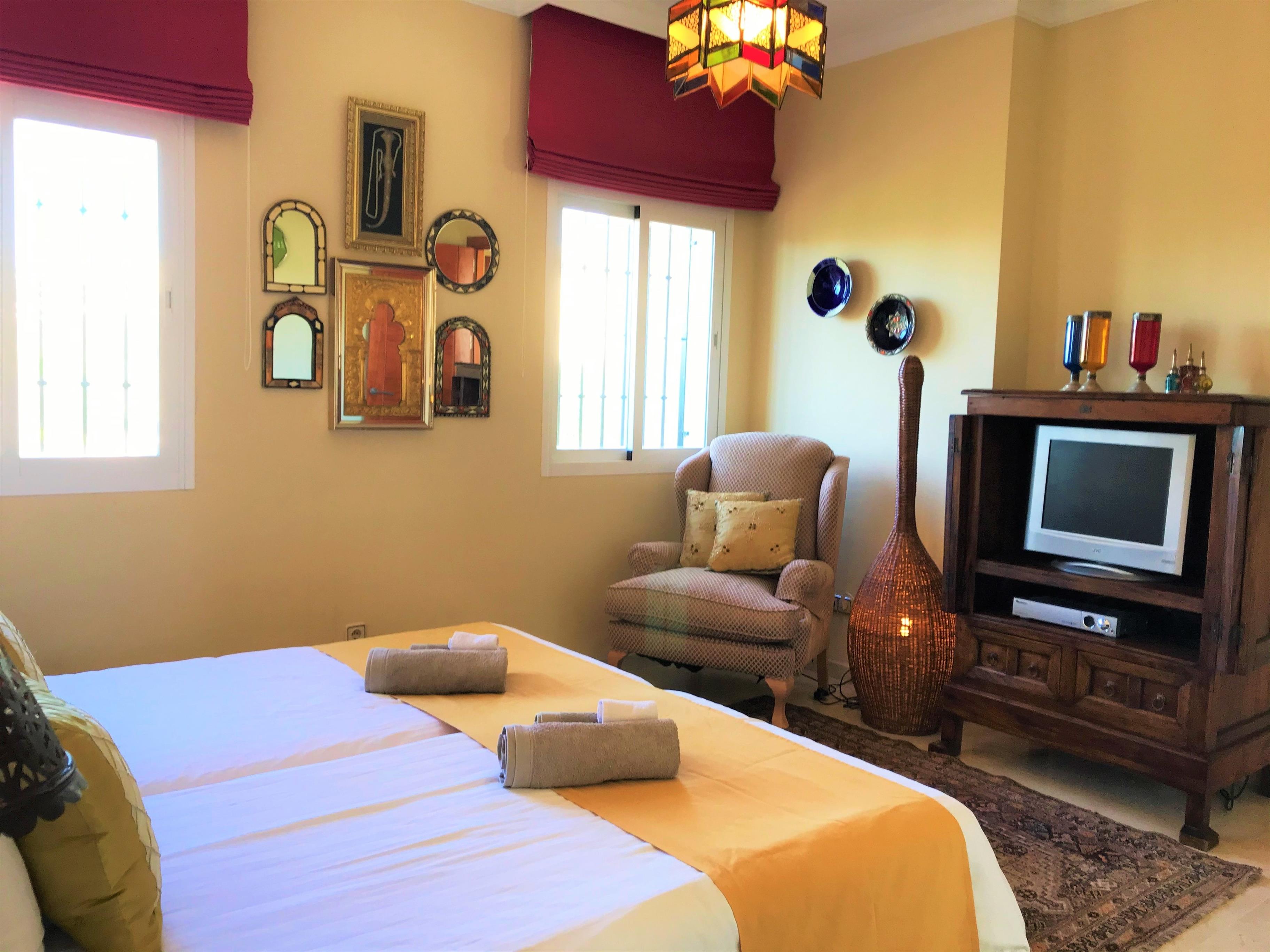 Die geräumige Villa bietet Platz für bis zu 8 Personen verteilt auf 4 Schlafzimmern, jedes mit begehbaren Kleiderschrank/ grossem Schrank, eigenem en-suite Vollbad, Gäste-WC, grosse Küche mit Essbereich, sehr grossem Wohnzimmer mit Kamin und 3 Terrassen. Im Erdgeschoss befindet sich der Eingangsbereich, Gäste WC, Wohnzimmer, Küche, Waschküche, 2 Schlafzimmer mit 2 Badezimmern und die grosse überdachte Terrasse. Im Obergeschoss sind 2 weitere Schlafzimmer mit 2 Badezimmern und 2 Terrassen.