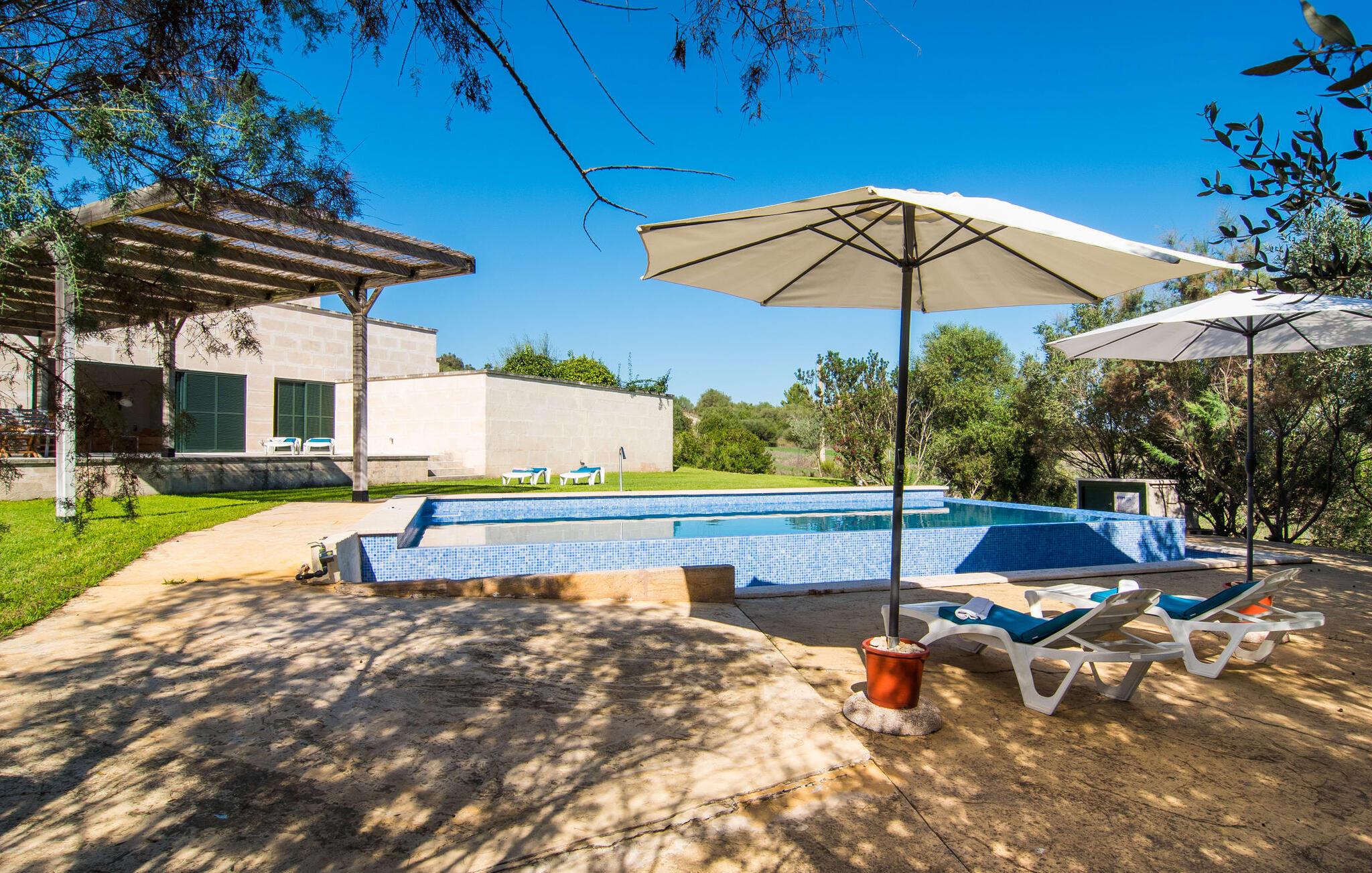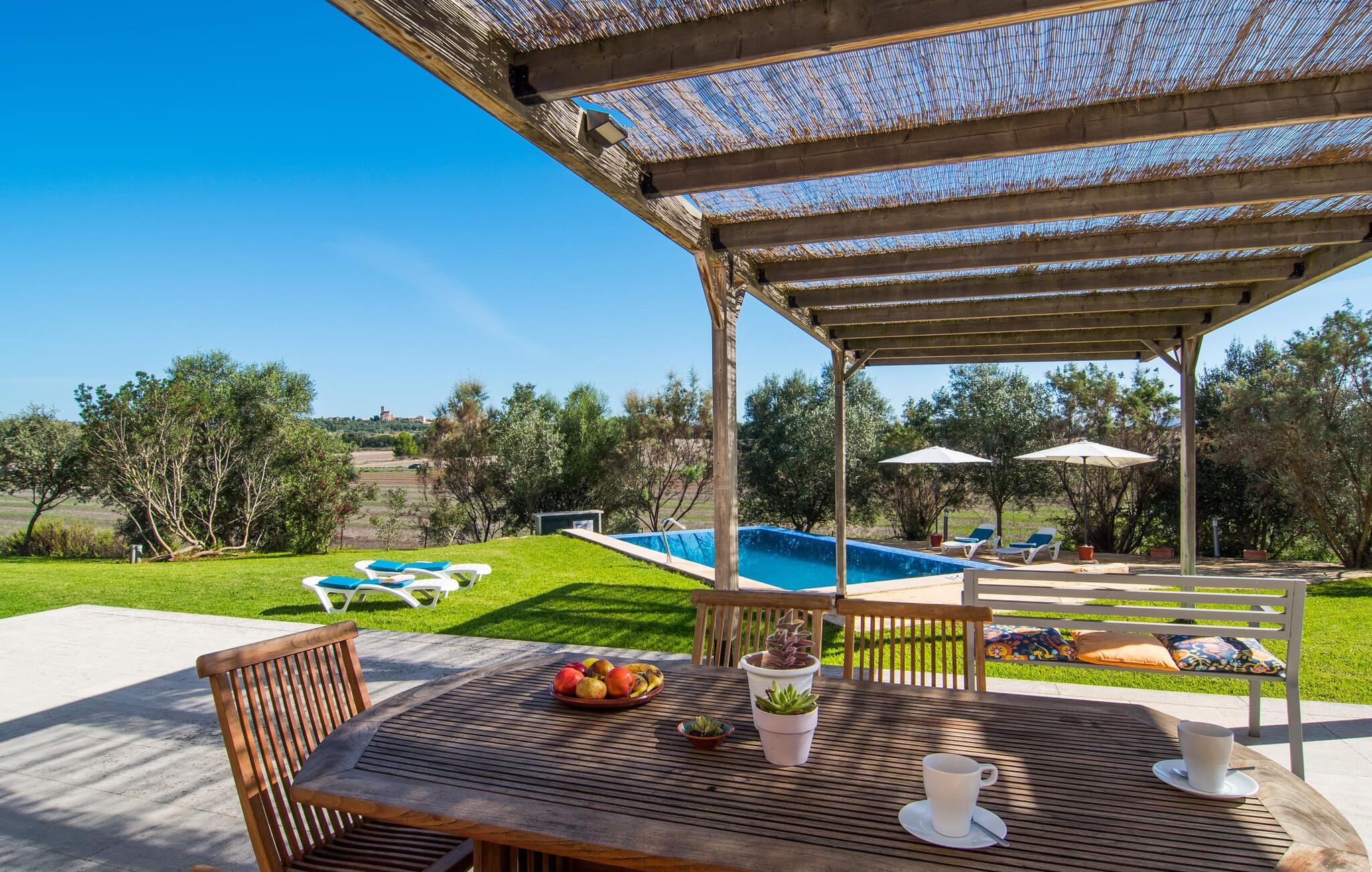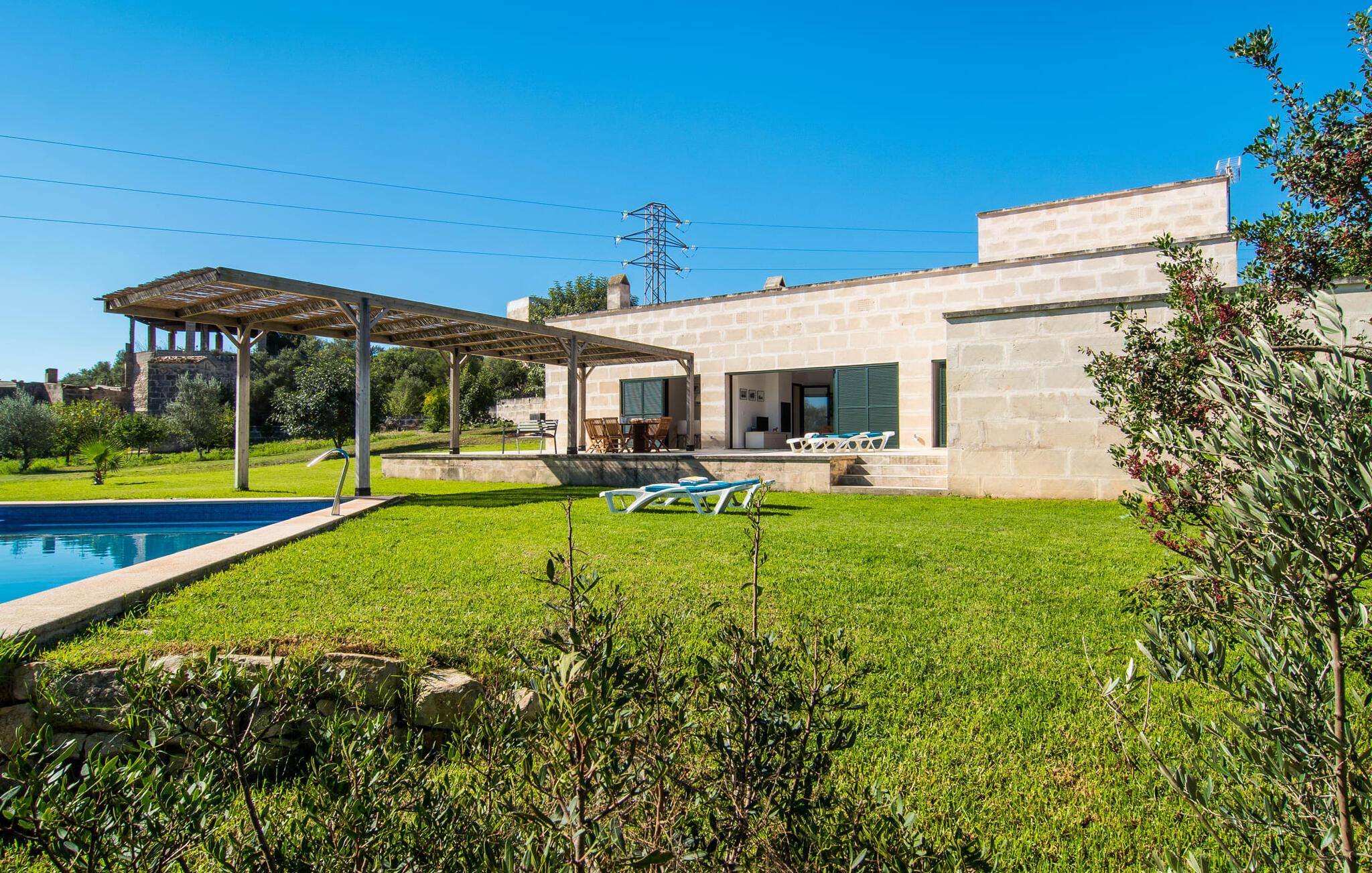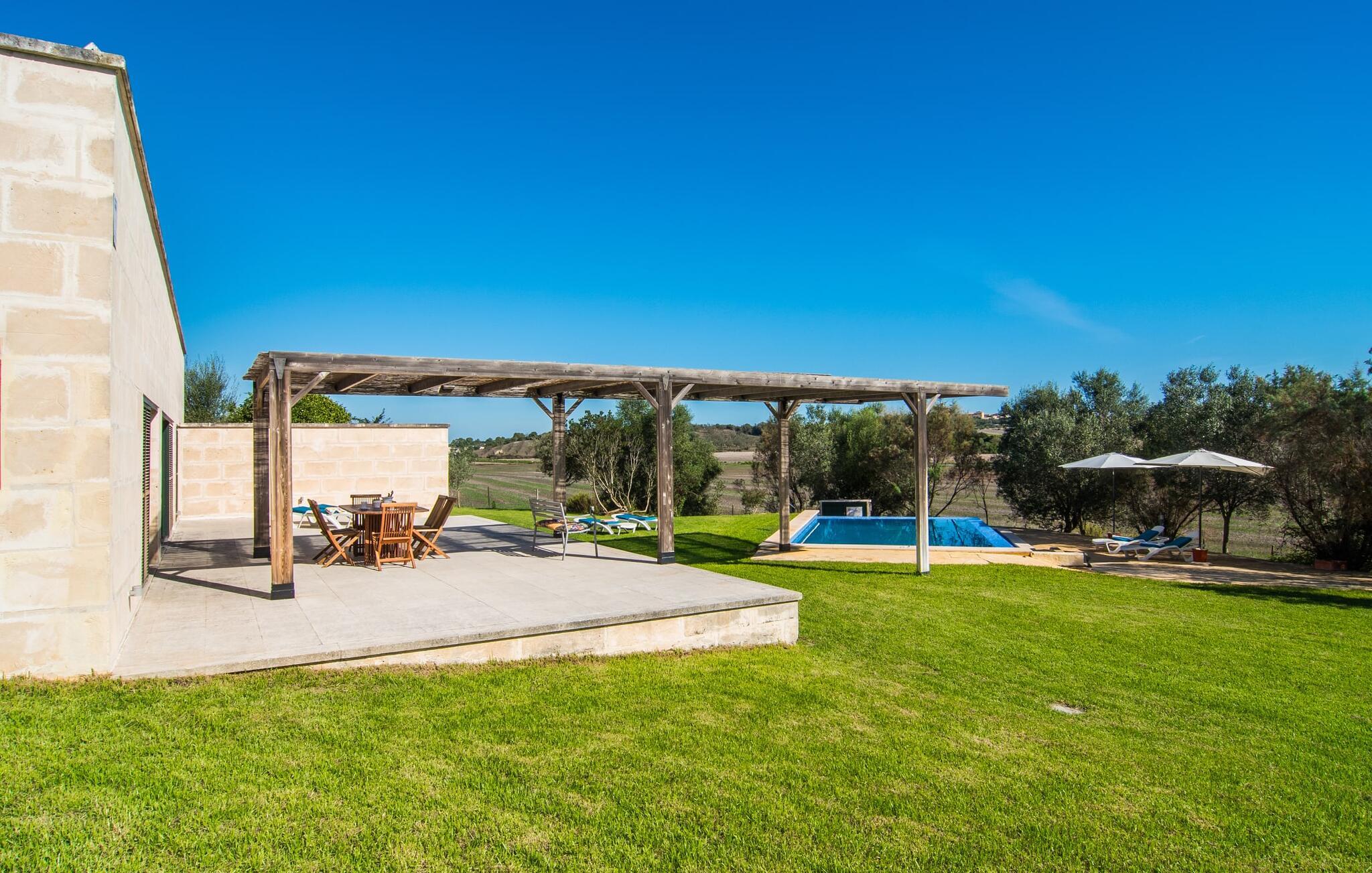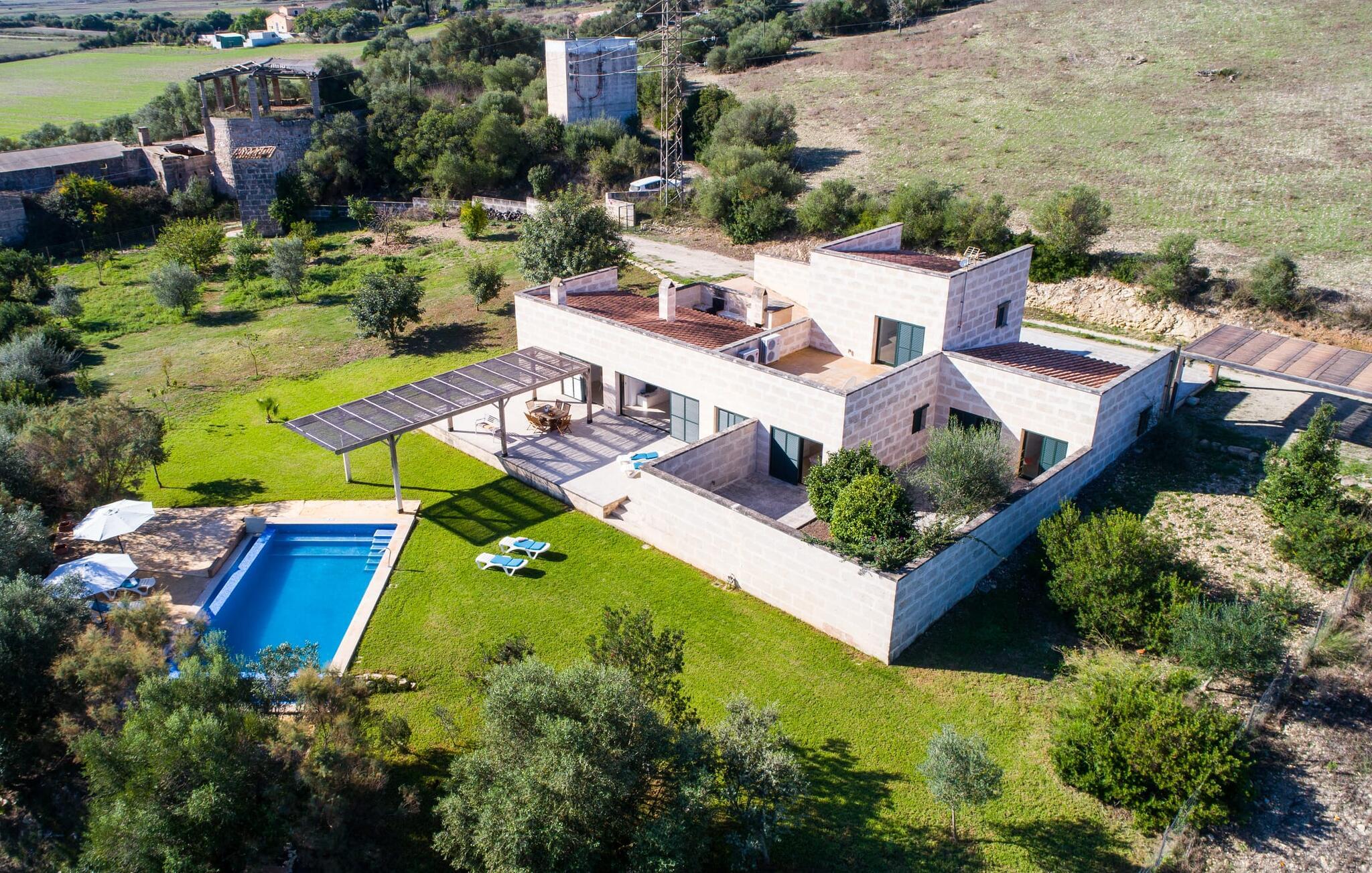 Den moderne villa "Baix des Pujol" har en attraktiv udvendig facade af synligt murværk og er omgivet af store græsplæner, der tilbyder et afslappende miljø under middelhavssolen. poolen og en skyggefuld terrasse på bagsiden. Poolen dekoreret med blå mosaikfliser og trappeindgangen inviterer jer til at slappe af i det unikke middelhavslys. En muret grill inviterer jer til at tage på kulinariske opdagelsesture med lokale markedsingredienser. Der er skyggefulde parkeringspladser i nærheden af huset stue med udgang til terrasse og to komfortable sofaer og en stilfuld pejs til køligere aftener I tilknytning til spisepladsen ligger det fuldt udstyrede køkken, som komfortabelt kan rumme seks voksne og to børn. På dette niveau er der tre soveværelser og tre badeværelser, ovenpå er der et fjerde imponerende soveværelse og et ensuite badeværelse. Hvert soveværelse er individuelt indrettet, og villaen er udstyret med aircondition og varme for at give komfort hele året rundt. Den moderne villa "Baix des Pujol" ligger midt på øen mellem de to landlige byer Petra og Ariany og byder på en vidunderlig udsigt over det omkringliggende landskab og mod Ariany. Det er et glimrende udgangspunkt for ture mod nord, øst eller vestkysten samt til Manacor, Alcúdia-bugten og adskillige strande som San Baulo og Can Picafort. Elforbruget i denne bolig er inkluderet i prisen i det sjældne tilfælde af overskridelse I vil blive opkrævet gebyret kontant på stedet.