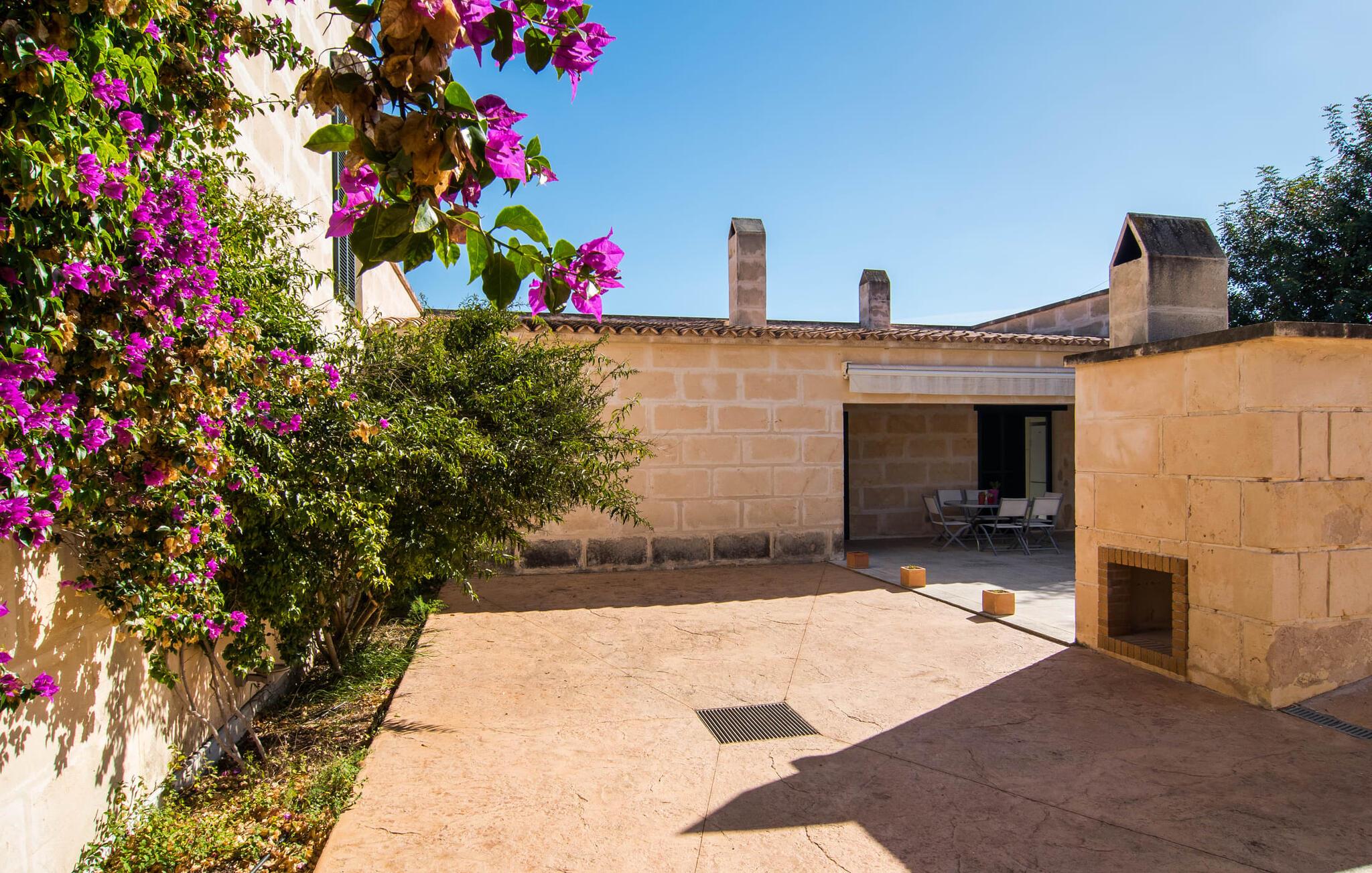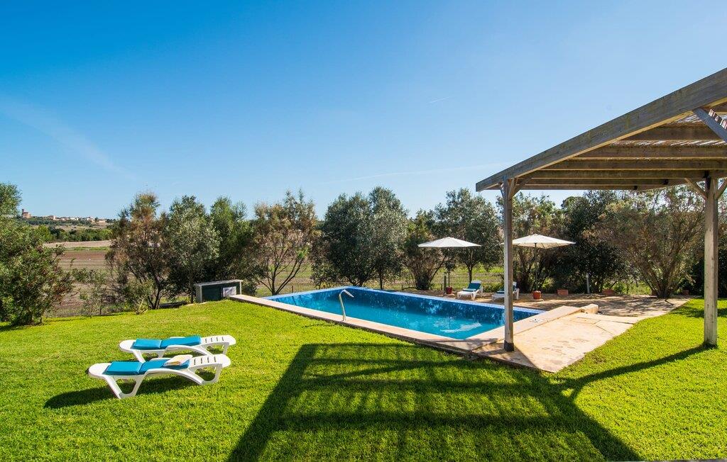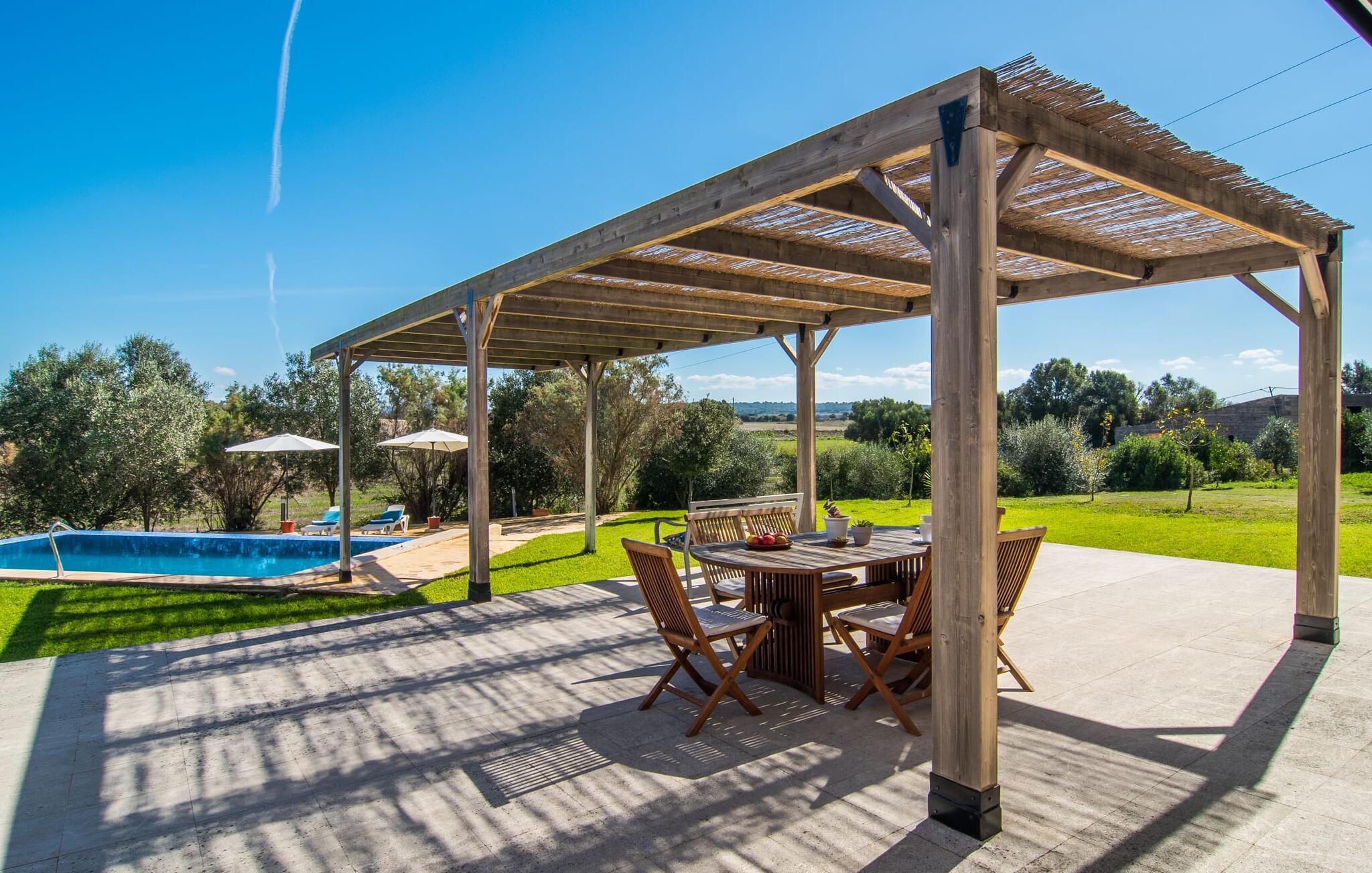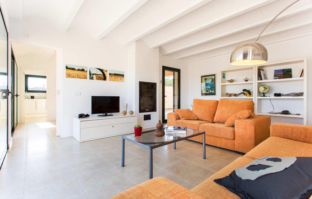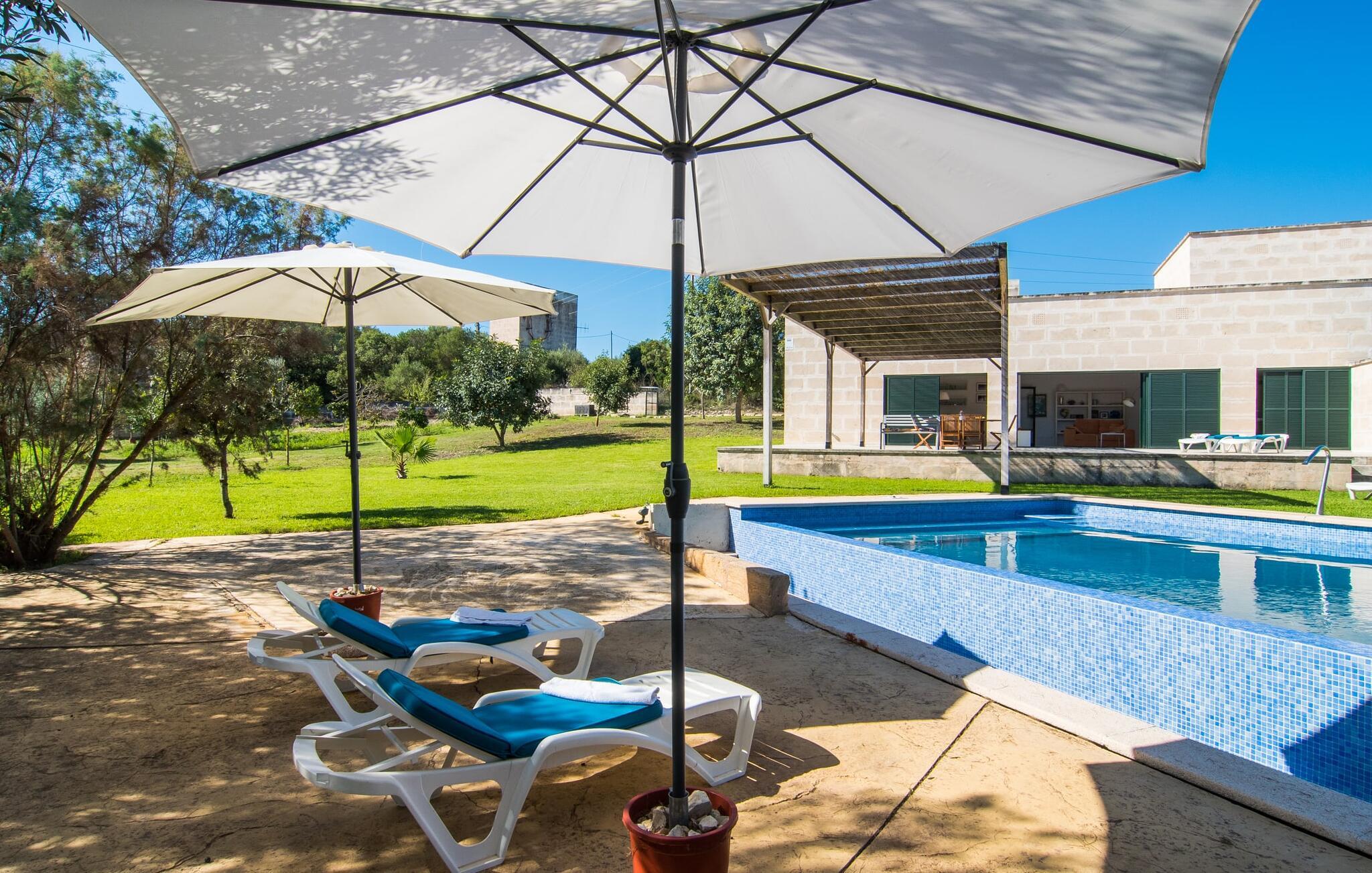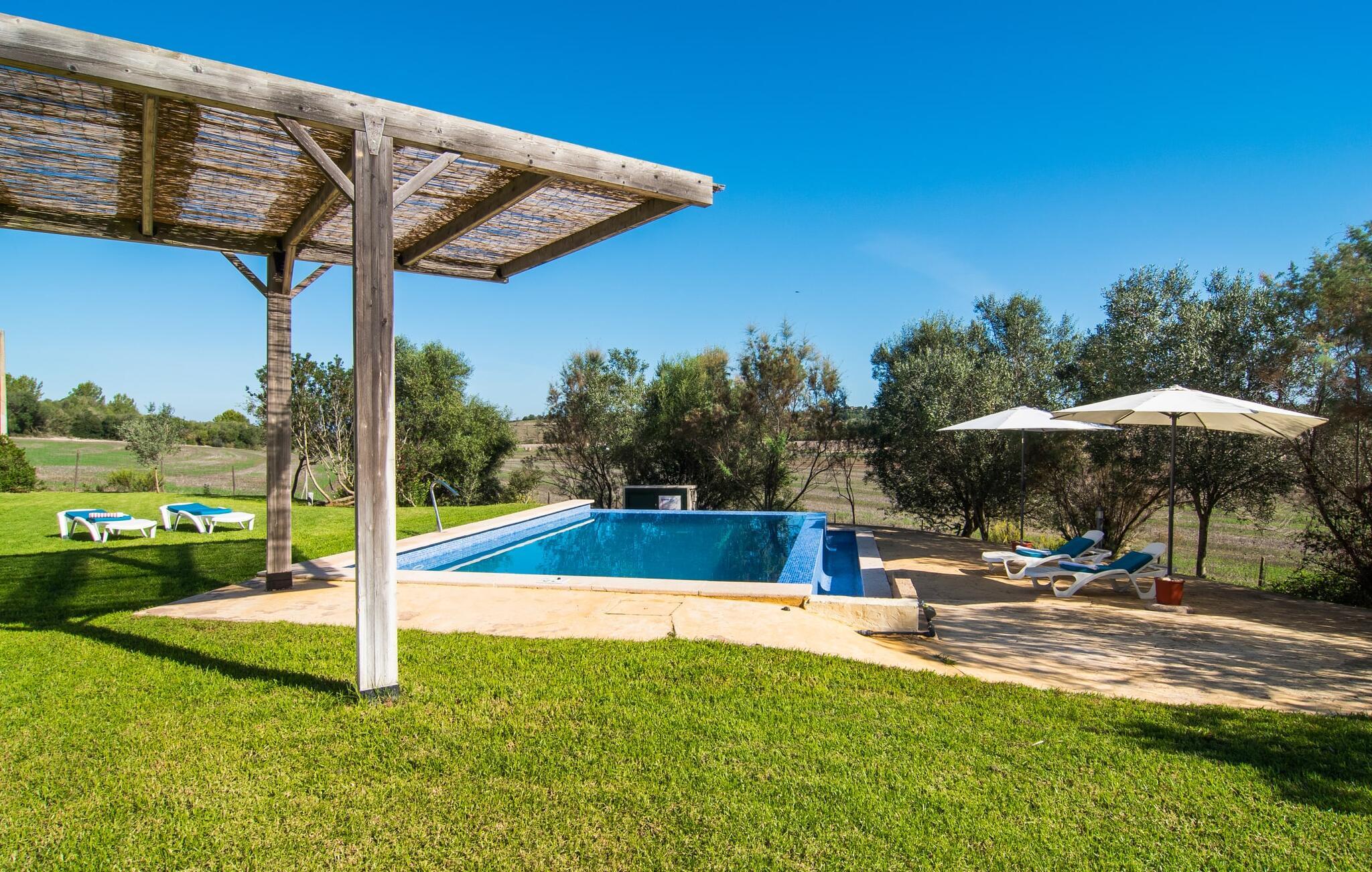 Den moderne villa "Baix des Pujol" har en attraktiv udvendig facade af synligt murværk og er omgivet af store græsplæner, der tilbyder et afslappende miljø under middelhavssolen. poolen og en skyggefuld terrasse på bagsiden. Poolen dekoreret med blå mosaikfliser og trappeindgangen inviterer jer til at slappe af i det unikke middelhavslys. En muret grill inviterer jer til at tage på kulinariske opdagelsesture med lokale markedsingredienser. Der er skyggefulde parkeringspladser i nærheden af huset stue med udgang til terrasse og to komfortable sofaer og en stilfuld pejs til køligere aftener I tilknytning til spisepladsen ligger det fuldt udstyrede køkken, som komfortabelt kan rumme seks voksne og to børn. På dette niveau er der tre soveværelser og tre badeværelser, ovenpå er der et fjerde imponerende soveværelse og et ensuite badeværelse. Hvert soveværelse er individuelt indrettet, og villaen er udstyret med aircondition og varme for at give komfort hele året rundt. Den moderne villa "Baix des Pujol" ligger midt på øen mellem de to landlige byer Petra og Ariany og byder på en vidunderlig udsigt over det omkringliggende landskab og mod Ariany. Det er et glimrende udgangspunkt for ture mod nord, øst eller vestkysten samt til Manacor, Alcúdia-bugten og adskillige strande som San Baulo og Can Picafort. Elforbruget i denne bolig er inkluderet i prisen i det sjældne tilfælde af overskridelse I vil blive opkrævet gebyret kontant på stedet.
