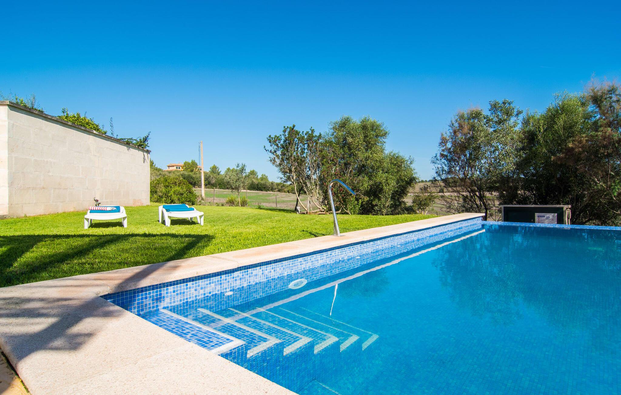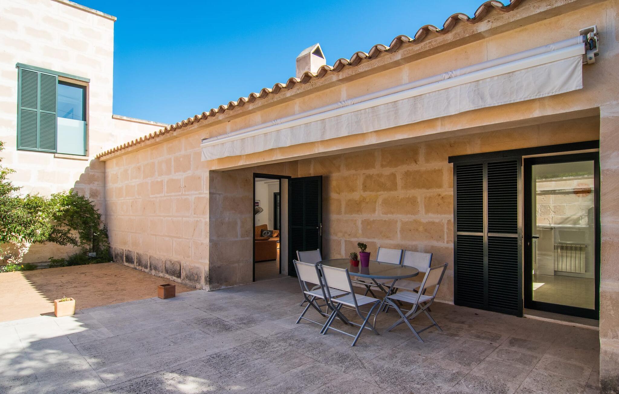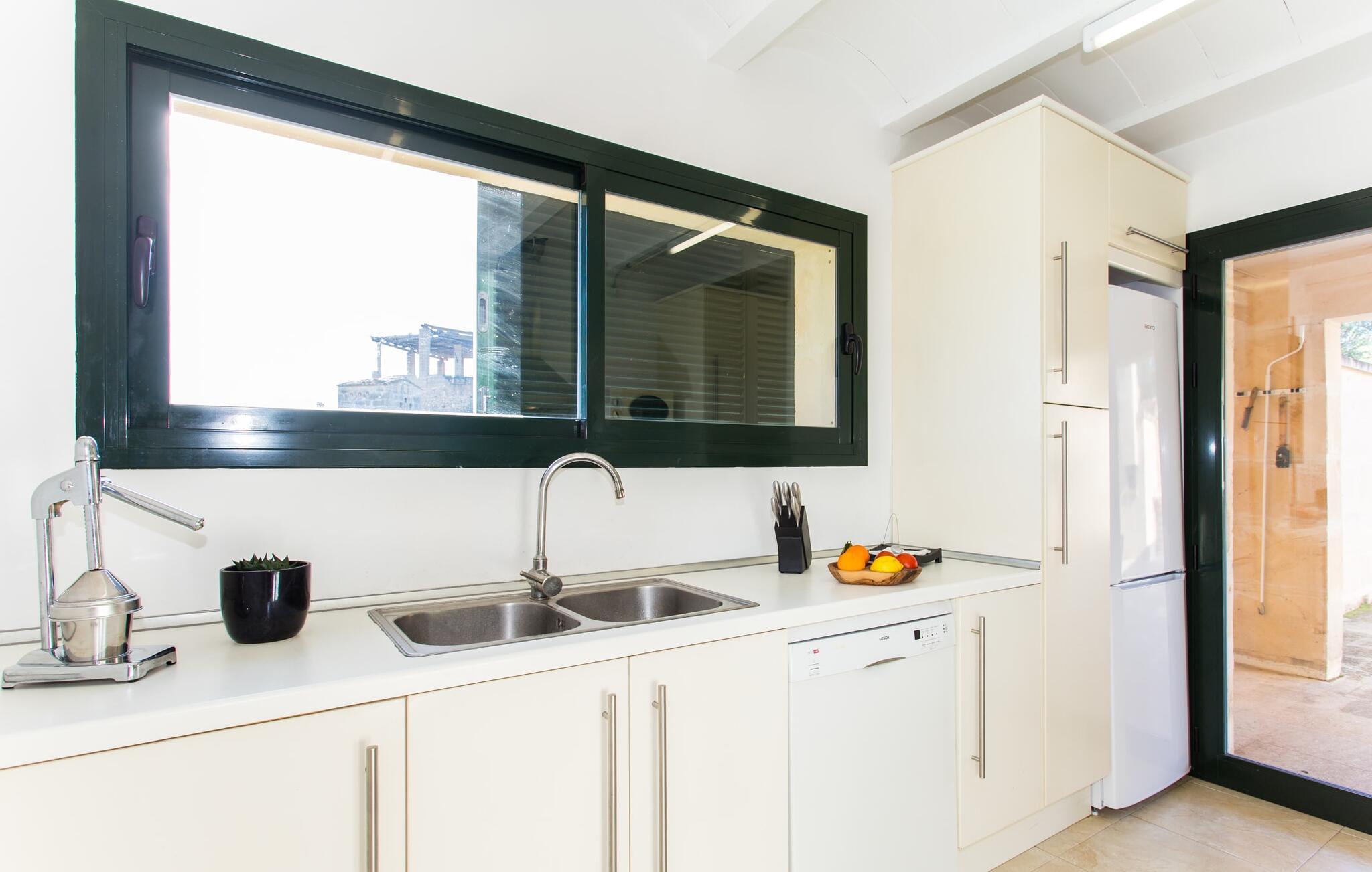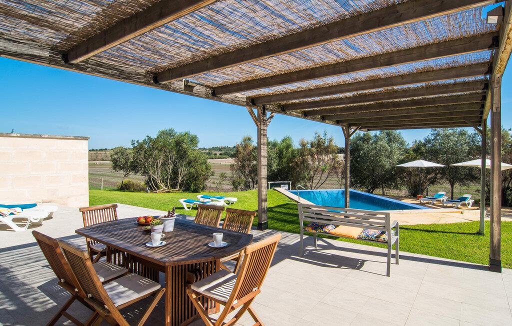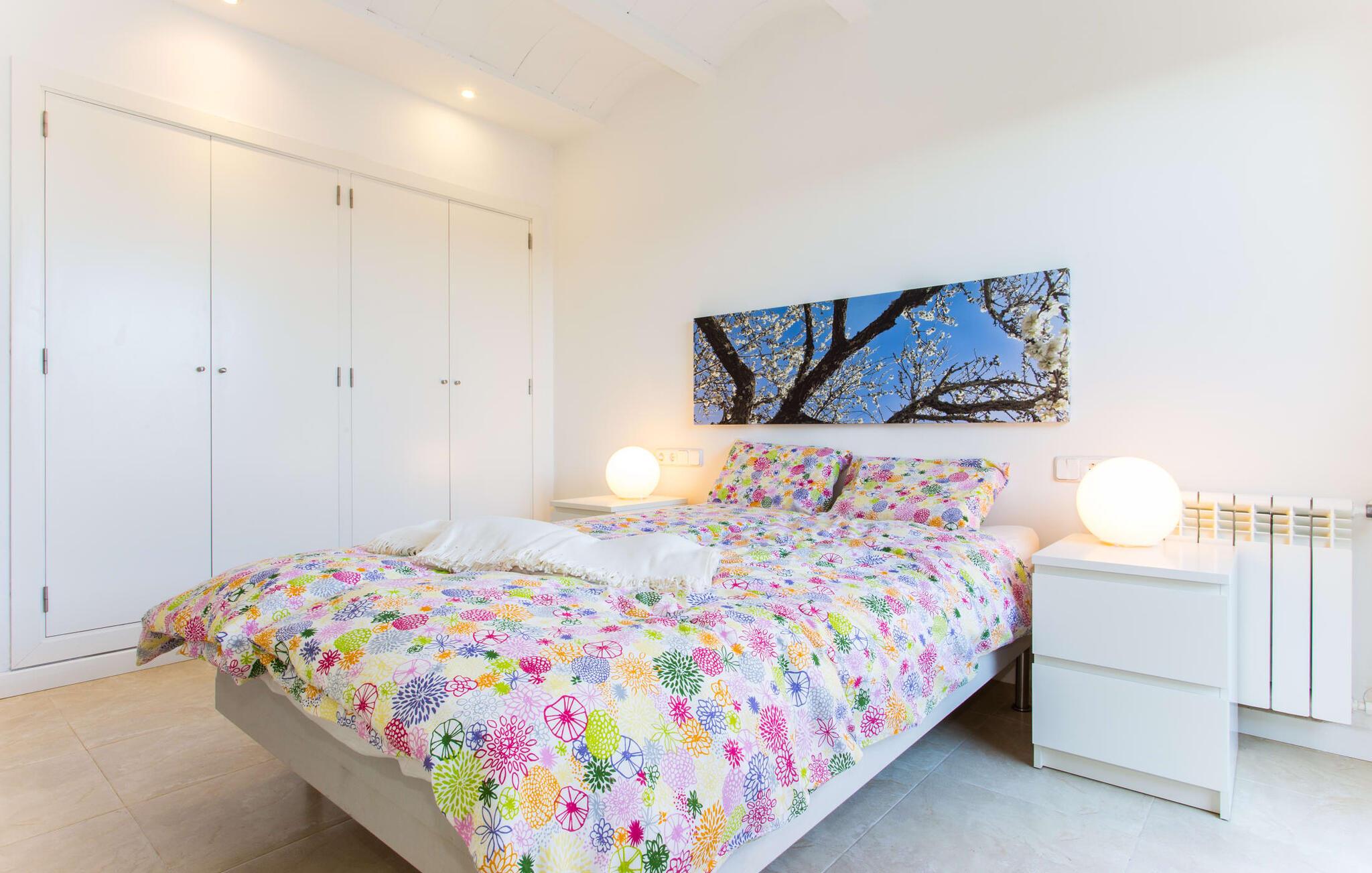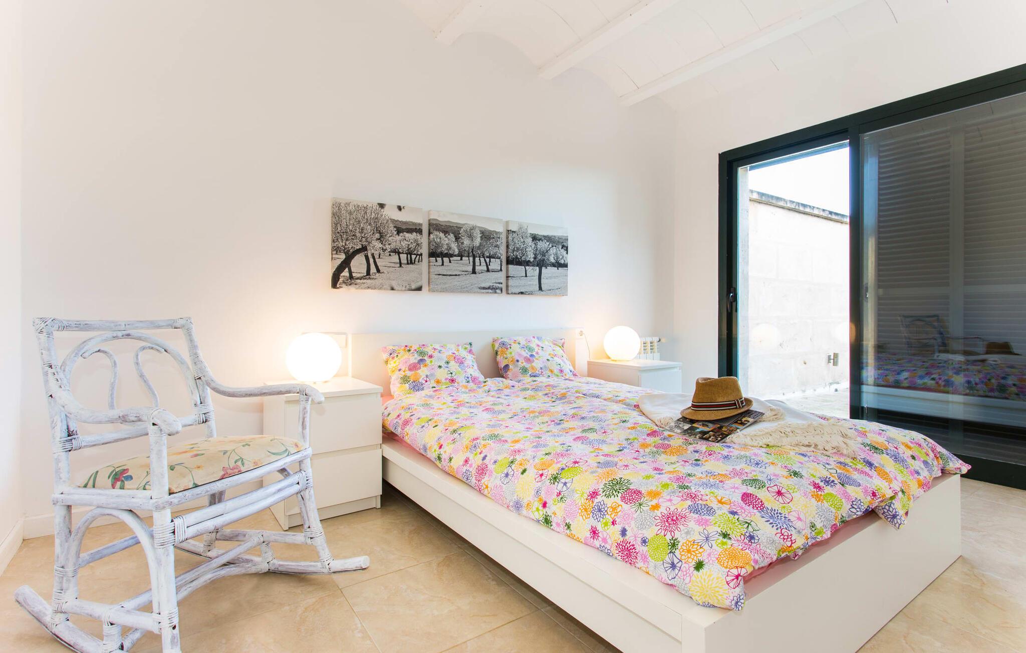 Den moderne villa "Baix des Pujol" har en attraktiv udvendig facade af synligt murværk og er omgivet af store græsplæner, der tilbyder et afslappende miljø under middelhavssolen. poolen og en skyggefuld terrasse på bagsiden. Poolen dekoreret med blå mosaikfliser og trappeindgangen inviterer jer til at slappe af i det unikke middelhavslys. En muret grill inviterer jer til at tage på kulinariske opdagelsesture med lokale markedsingredienser. Der er skyggefulde parkeringspladser i nærheden af huset stue med udgang til terrasse og to komfortable sofaer og en stilfuld pejs til køligere aftener I tilknytning til spisepladsen ligger det fuldt udstyrede køkken, som komfortabelt kan rumme seks voksne og to børn. På dette niveau er der tre soveværelser og tre badeværelser, ovenpå er der et fjerde imponerende soveværelse og et ensuite badeværelse. Hvert soveværelse er individuelt indrettet, og villaen er udstyret med aircondition og varme for at give komfort hele året rundt. Den moderne villa "Baix des Pujol" ligger midt på øen mellem de to landlige byer Petra og Ariany og byder på en vidunderlig udsigt over det omkringliggende landskab og mod Ariany. Det er et glimrende udgangspunkt for ture mod nord, øst eller vestkysten samt til Manacor, Alcúdia-bugten og adskillige strande som San Baulo og Can Picafort. Elforbruget i denne bolig er inkluderet i prisen i det sjældne tilfælde af overskridelse I vil blive opkrævet gebyret kontant på stedet.