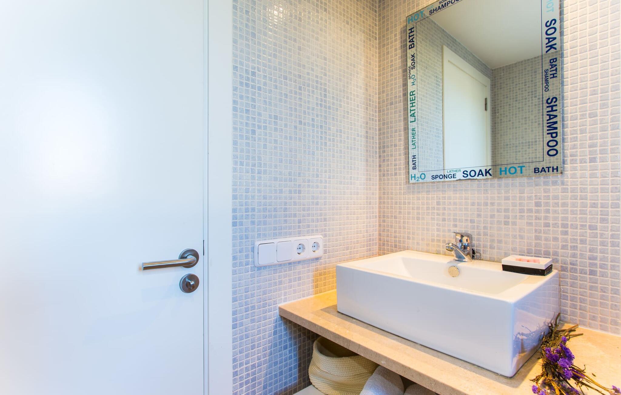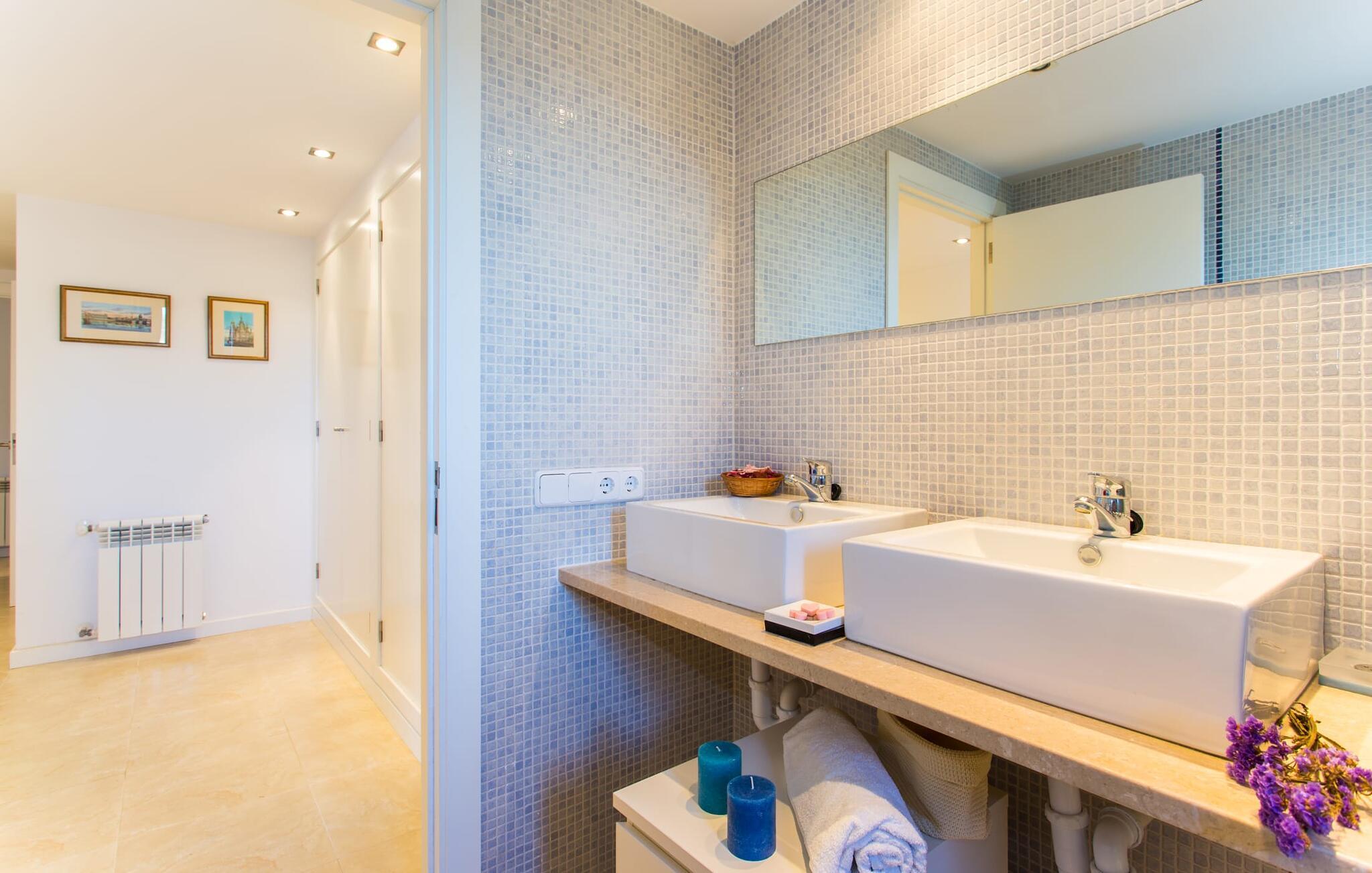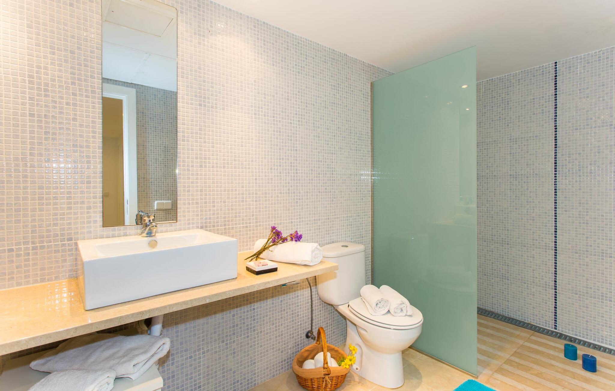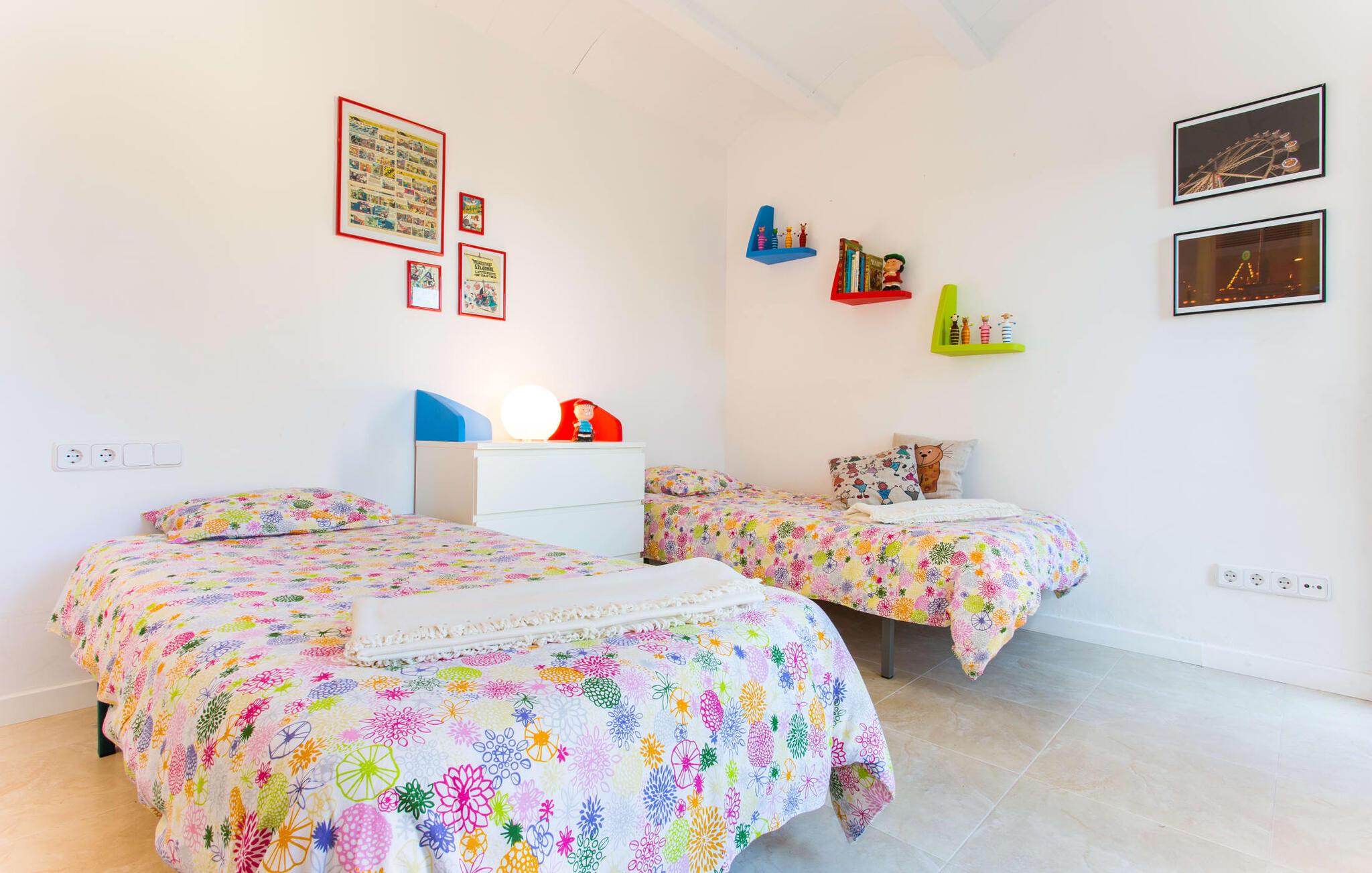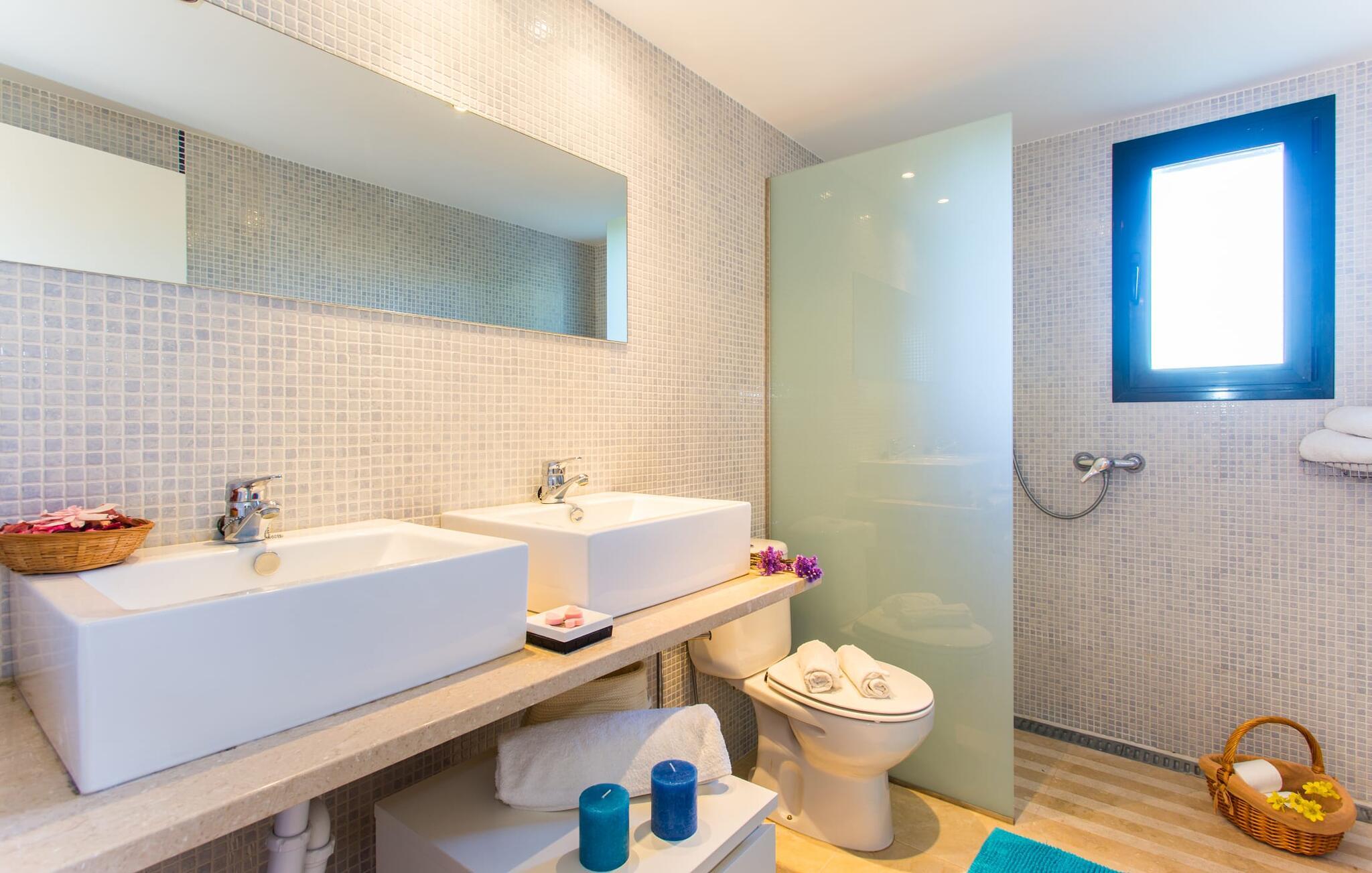 Den moderne villa "Baix des Pujol" har en attraktiv udvendig facade af synligt murværk og er omgivet af store græsplæner, der tilbyder et afslappende miljø under middelhavssolen. poolen og en skyggefuld terrasse på bagsiden. Poolen dekoreret med blå mosaikfliser og trappeindgangen inviterer jer til at slappe af i det unikke middelhavslys. En muret grill inviterer jer til at tage på kulinariske opdagelsesture med lokale markedsingredienser. Der er skyggefulde parkeringspladser i nærheden af huset stue med udgang til terrasse og to komfortable sofaer og en stilfuld pejs til køligere aftener I tilknytning til spisepladsen ligger det fuldt udstyrede køkken, som komfortabelt kan rumme seks voksne og to børn. På dette niveau er der tre soveværelser og tre badeværelser, ovenpå er der et fjerde imponerende soveværelse og et ensuite badeværelse. Hvert soveværelse er individuelt indrettet, og villaen er udstyret med aircondition og varme for at give komfort hele året rundt. Den moderne villa "Baix des Pujol" ligger midt på øen mellem de to landlige byer Petra og Ariany og byder på en vidunderlig udsigt over det omkringliggende landskab og mod Ariany. Det er et glimrende udgangspunkt for ture mod nord, øst eller vestkysten samt til Manacor, Alcúdia-bugten og adskillige strande som San Baulo og Can Picafort. Elforbruget i denne bolig er inkluderet i prisen i det sjældne tilfælde af overskridelse I vil blive opkrævet gebyret kontant på stedet.